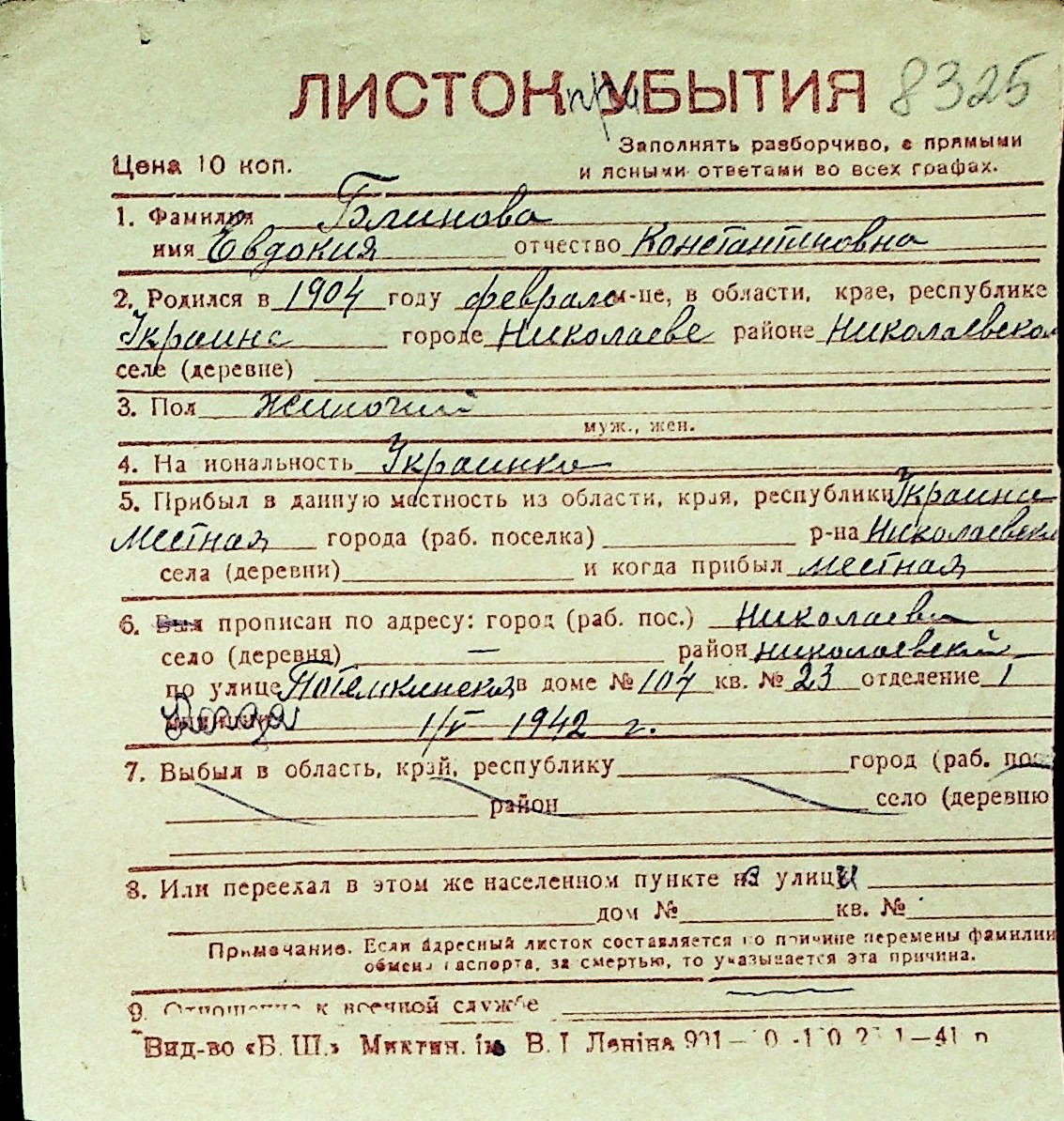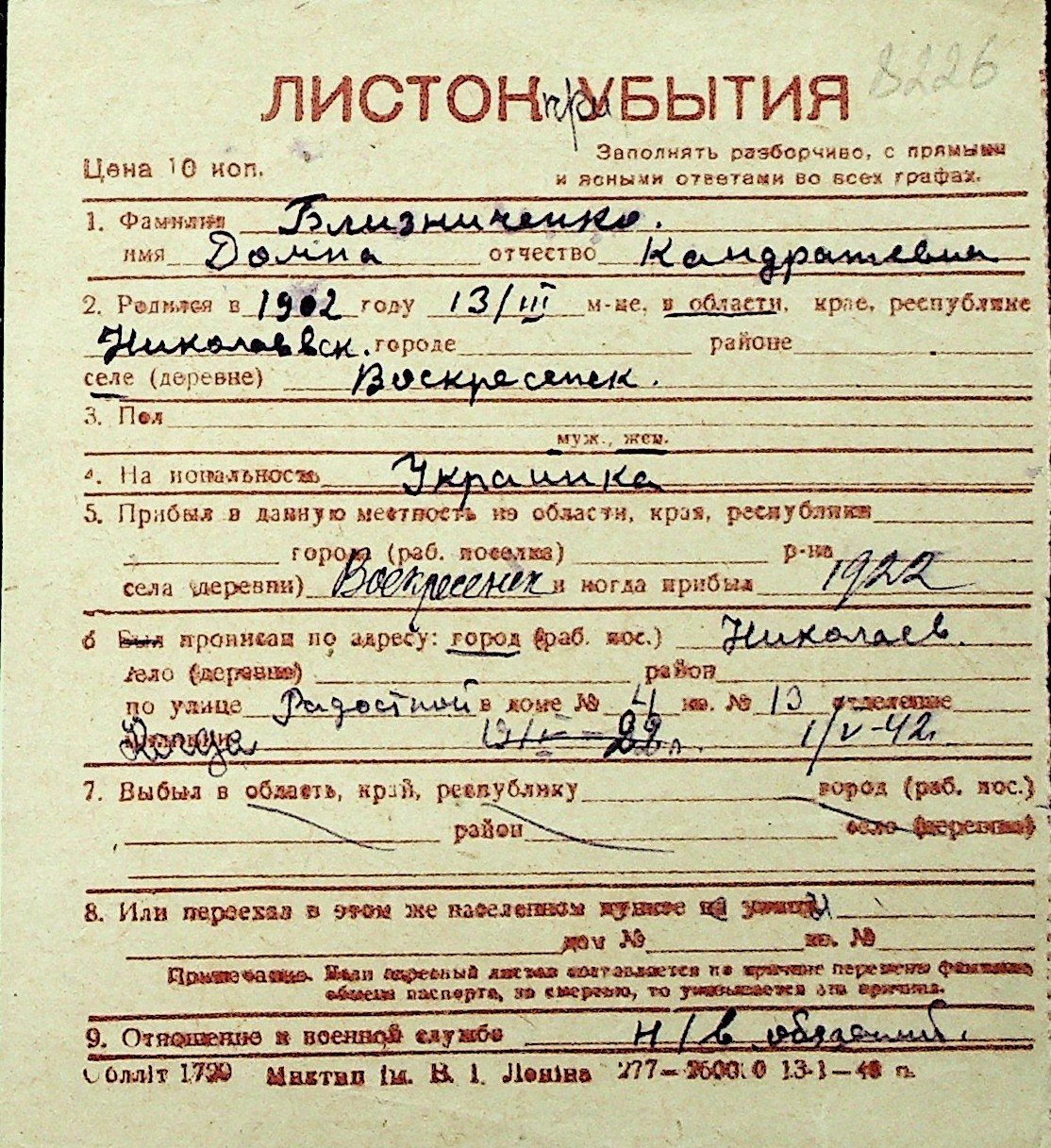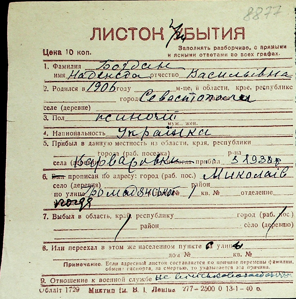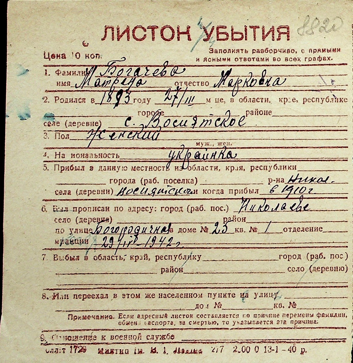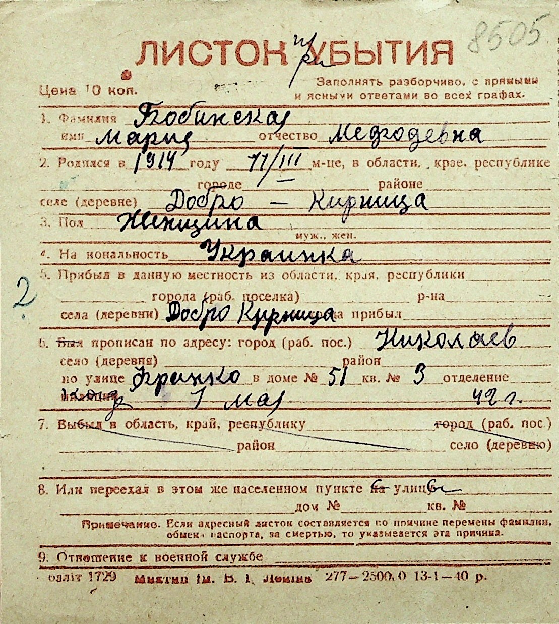 ◦ ◦ Перелік карток на осіб, які мешкали у м. Миколаїв у період окупації 1941–1944 років