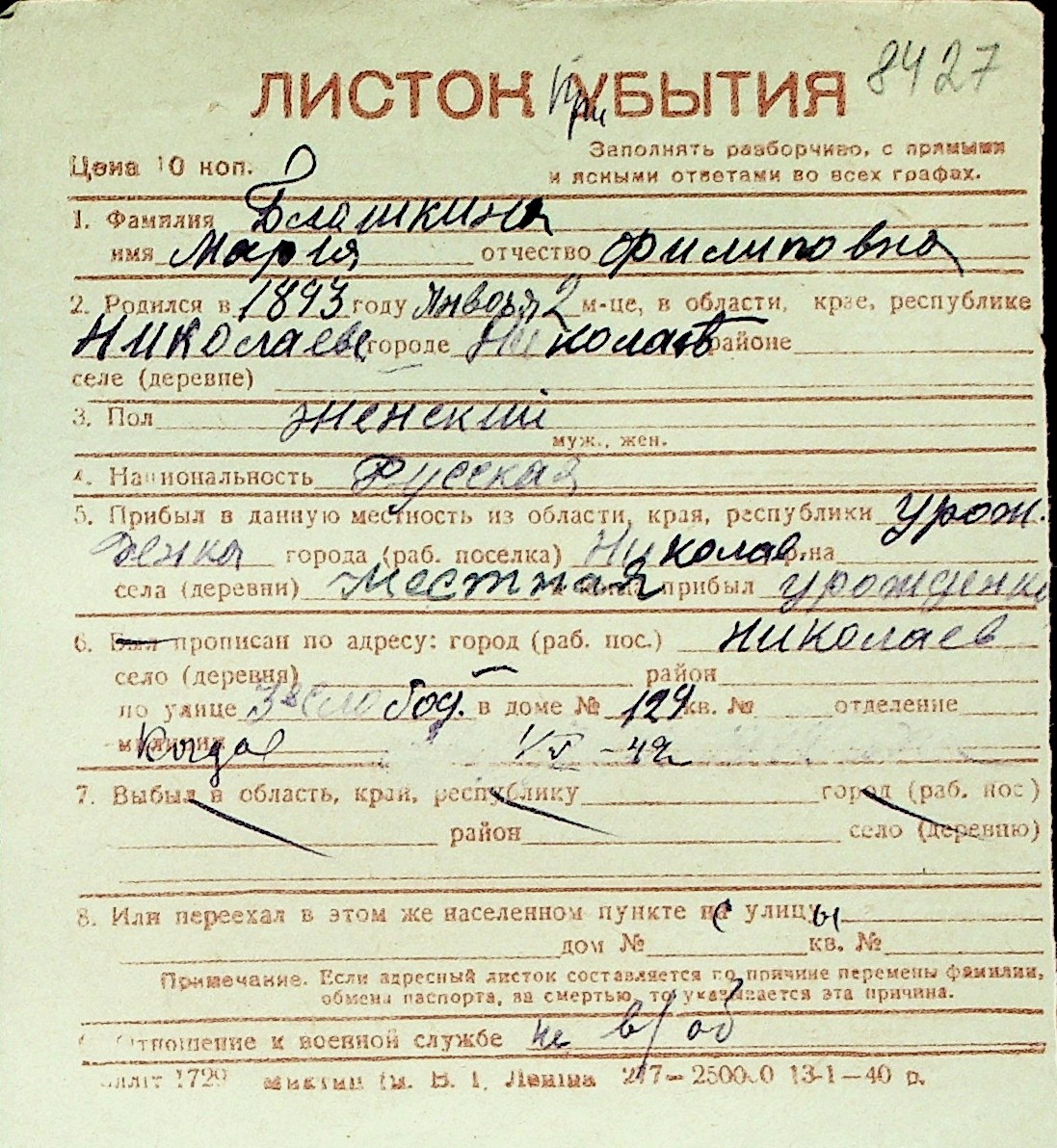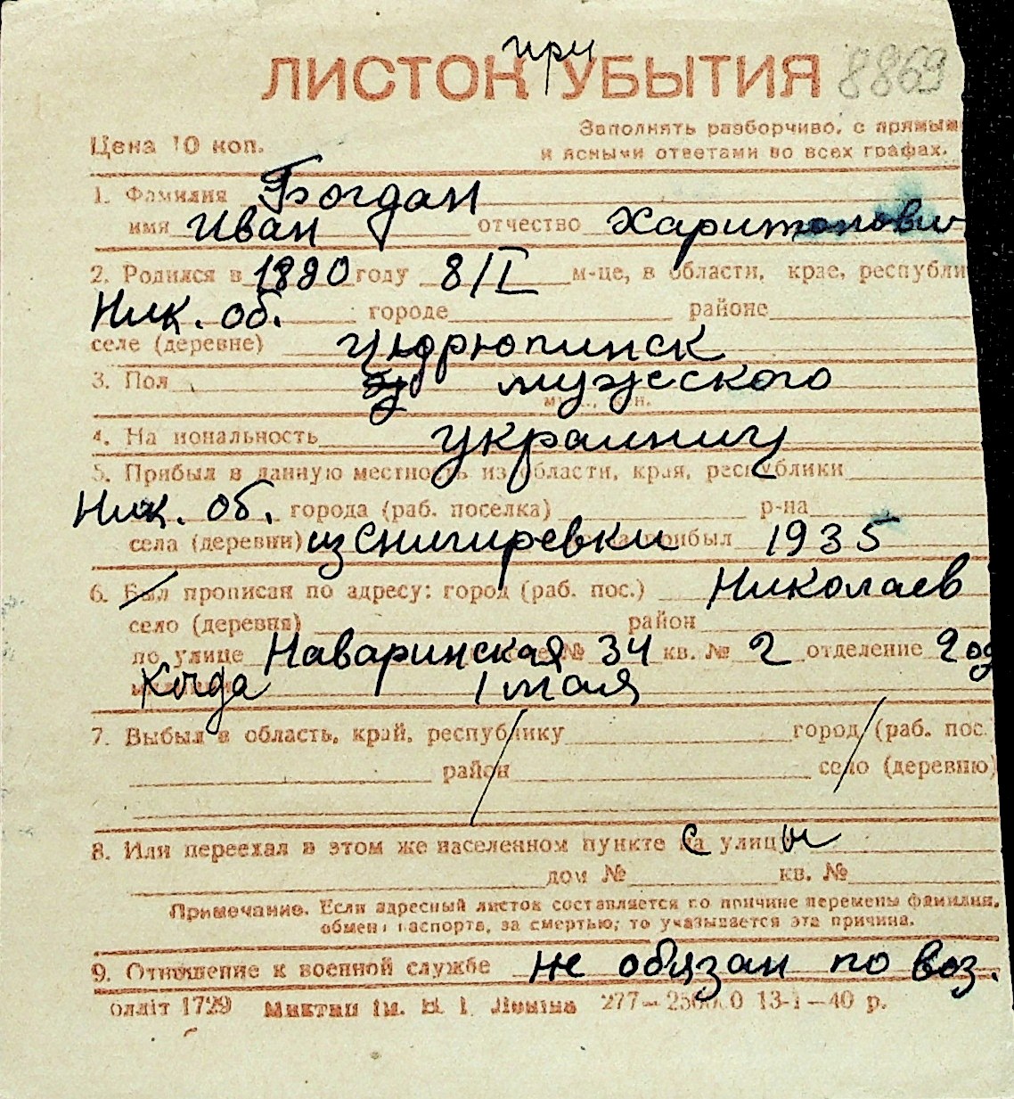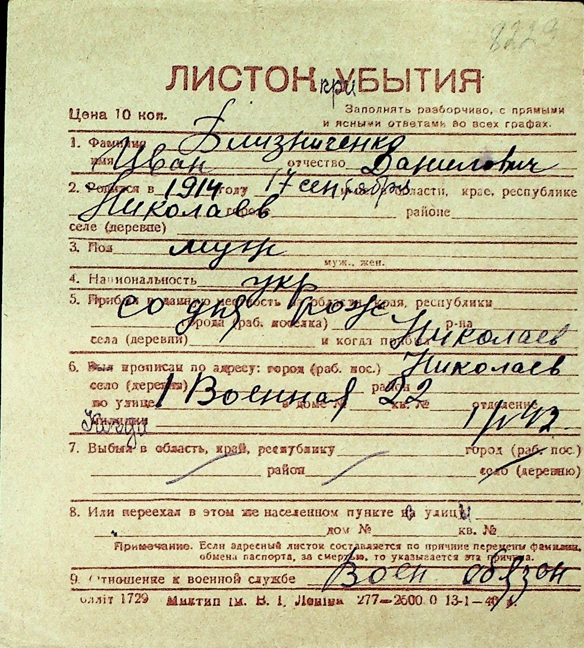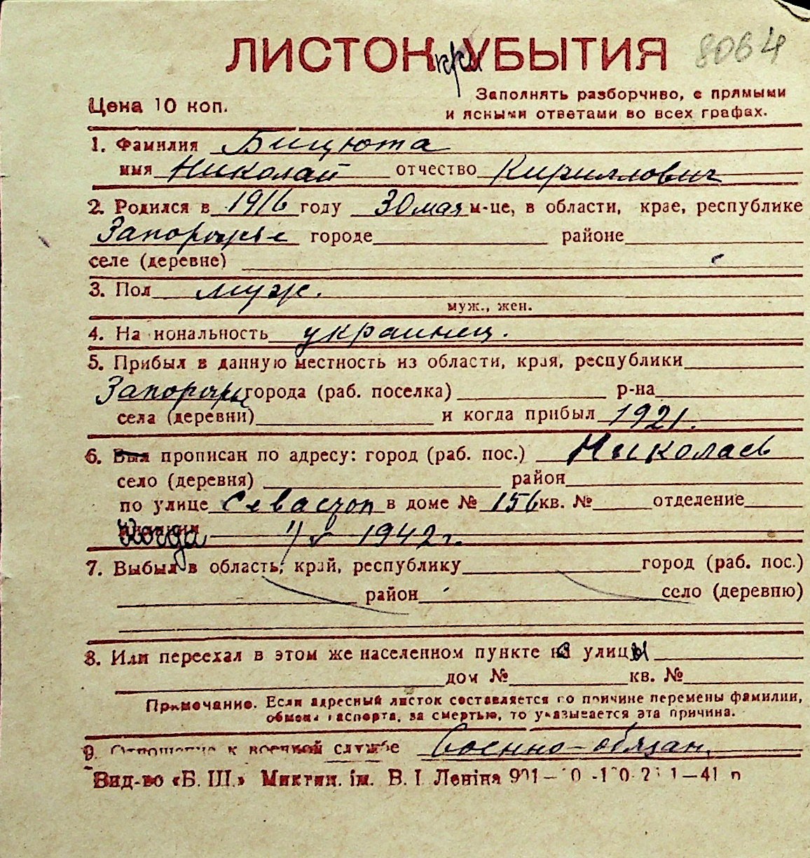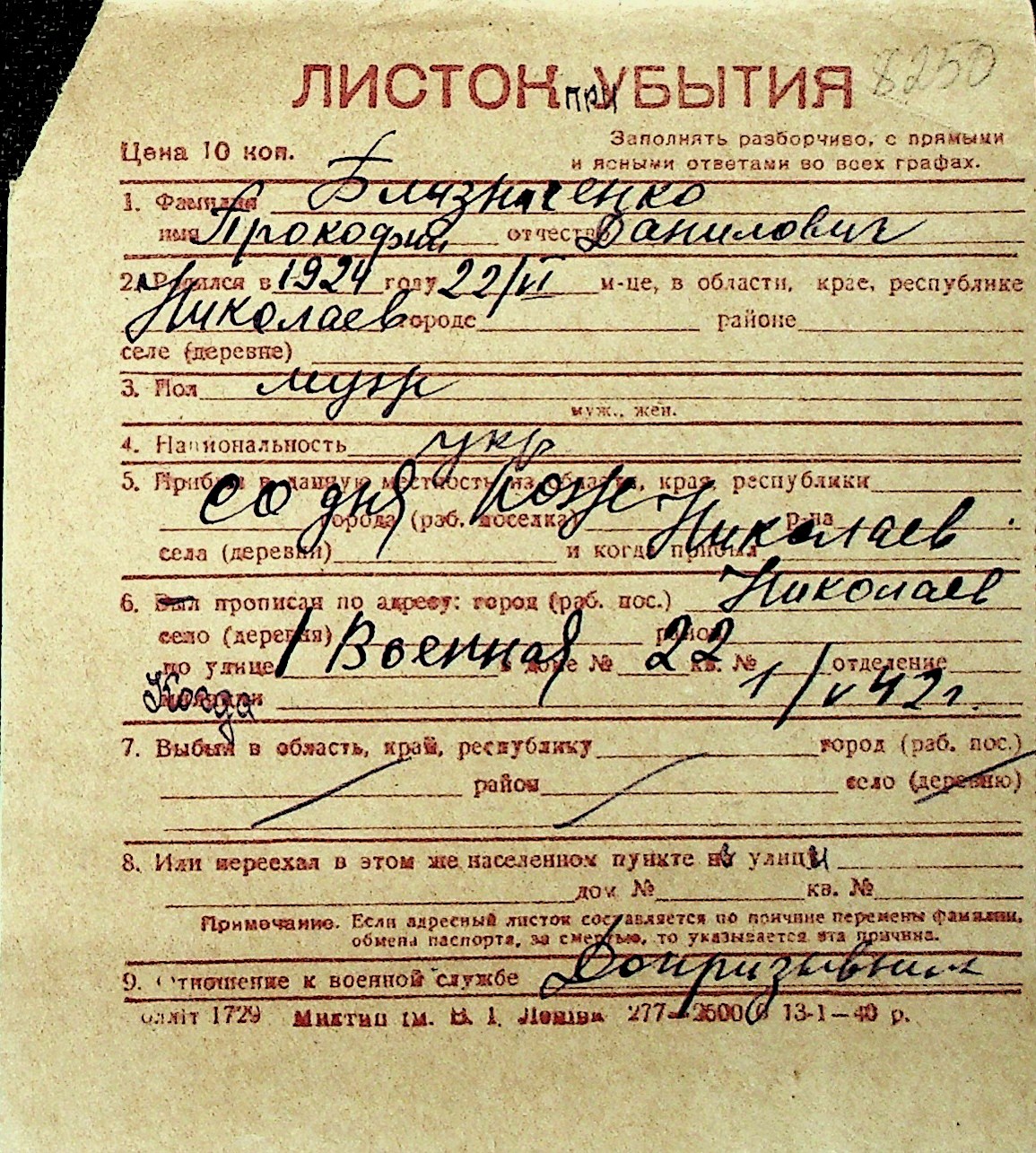 ◦ ◦ Перелік карток на осіб, які мешкали у м. Миколаїв у період окупації 1941–1944 років