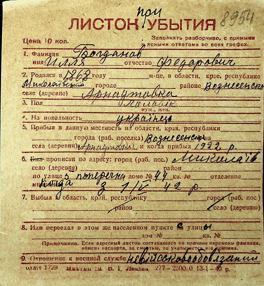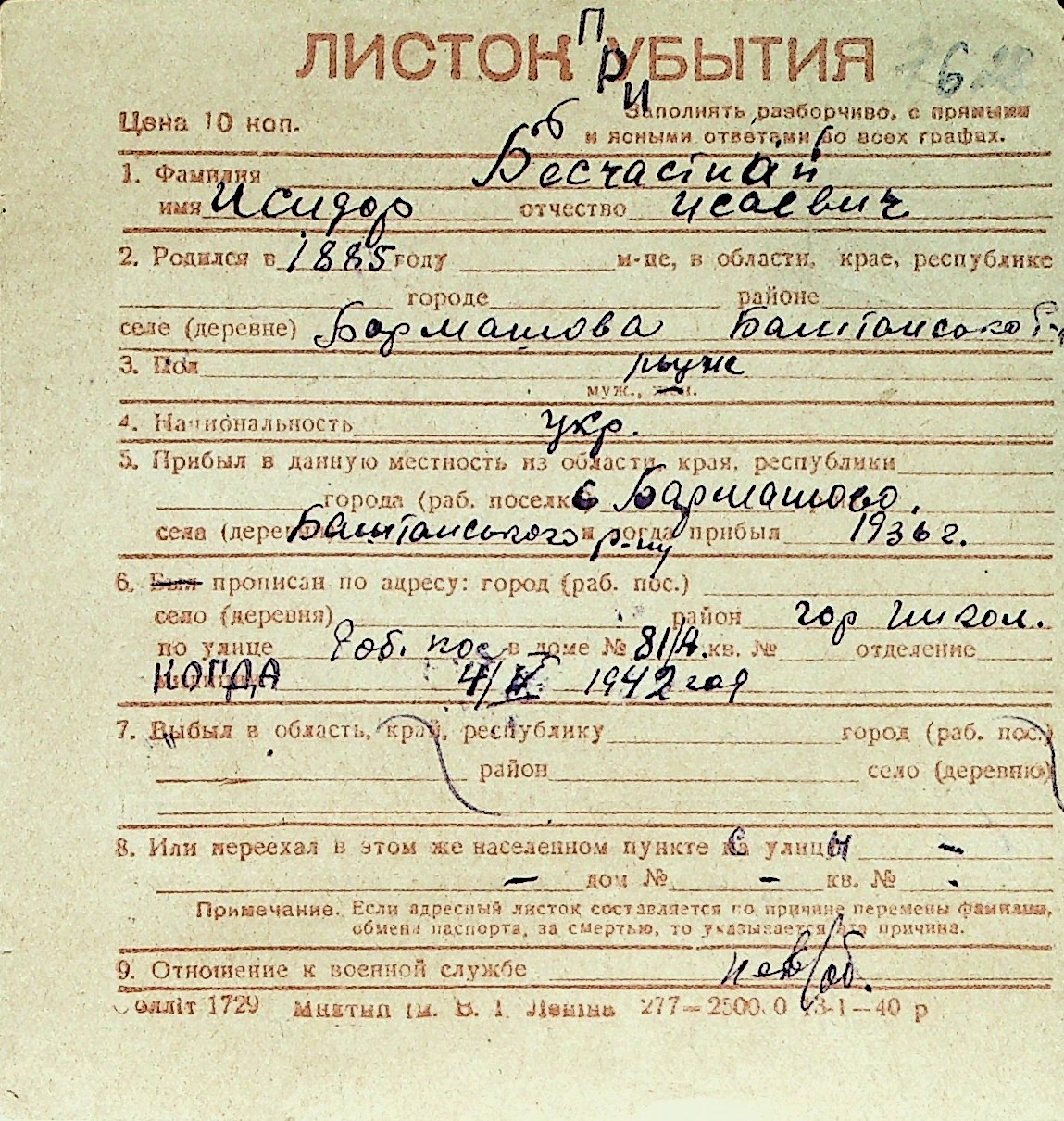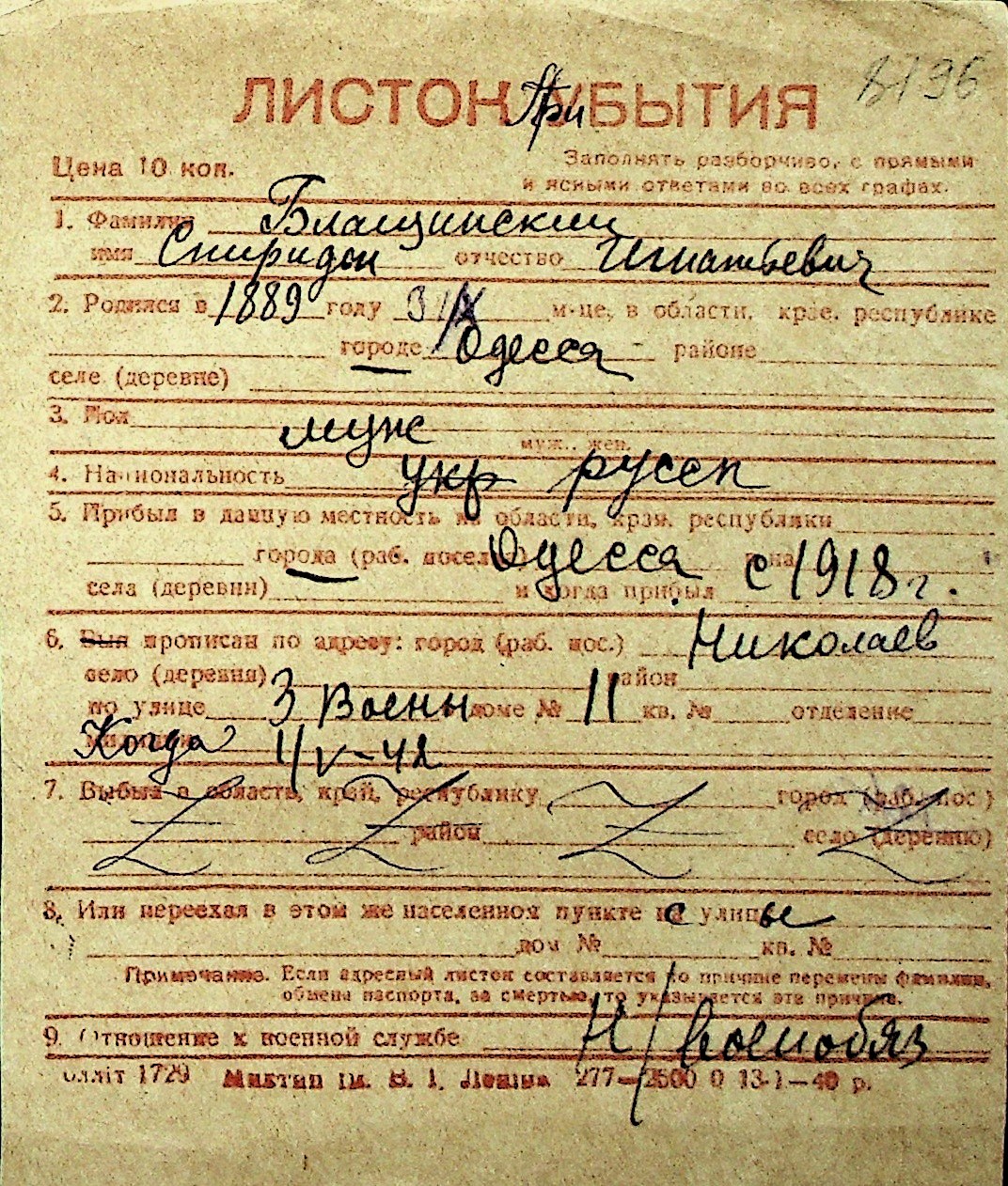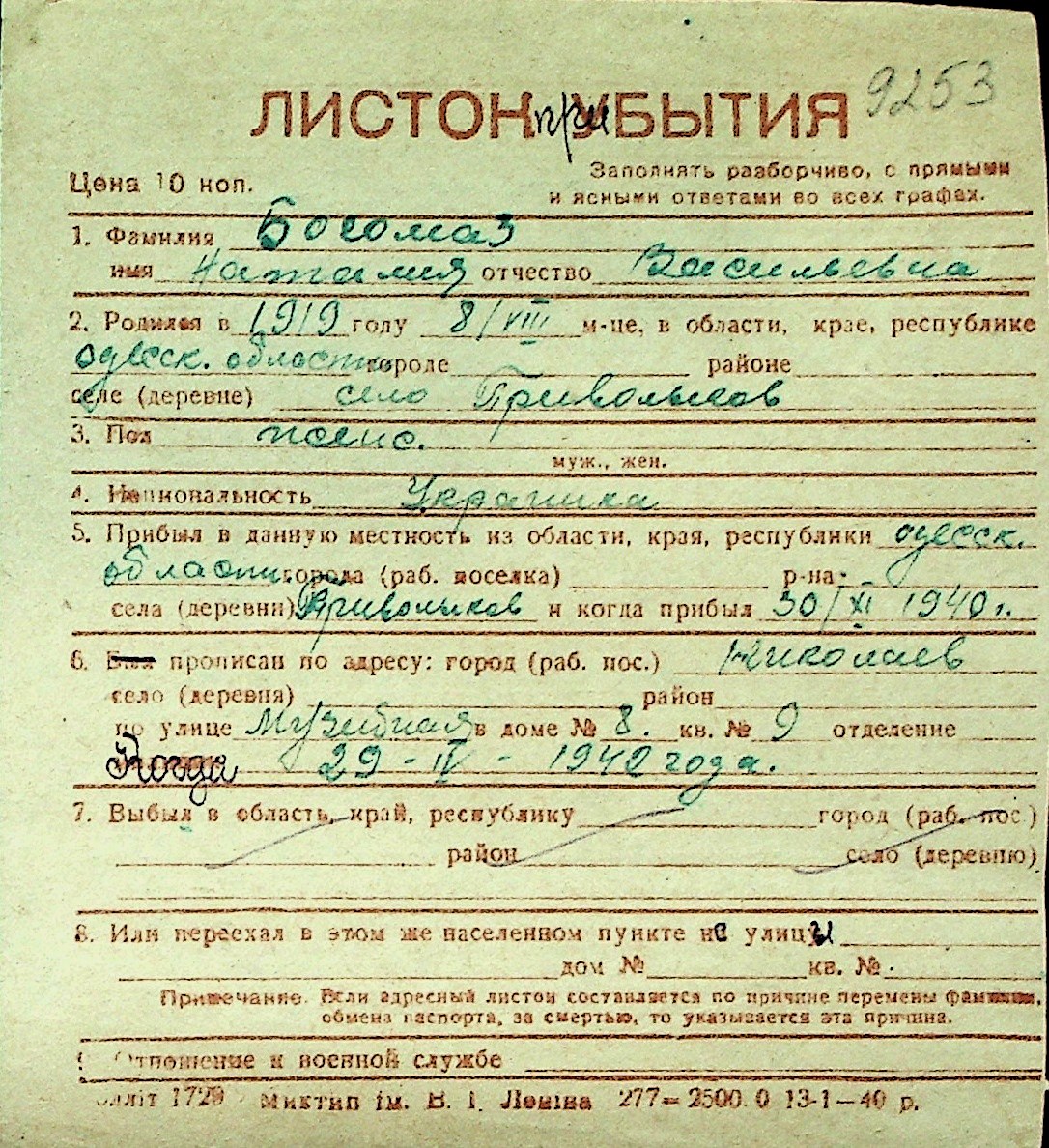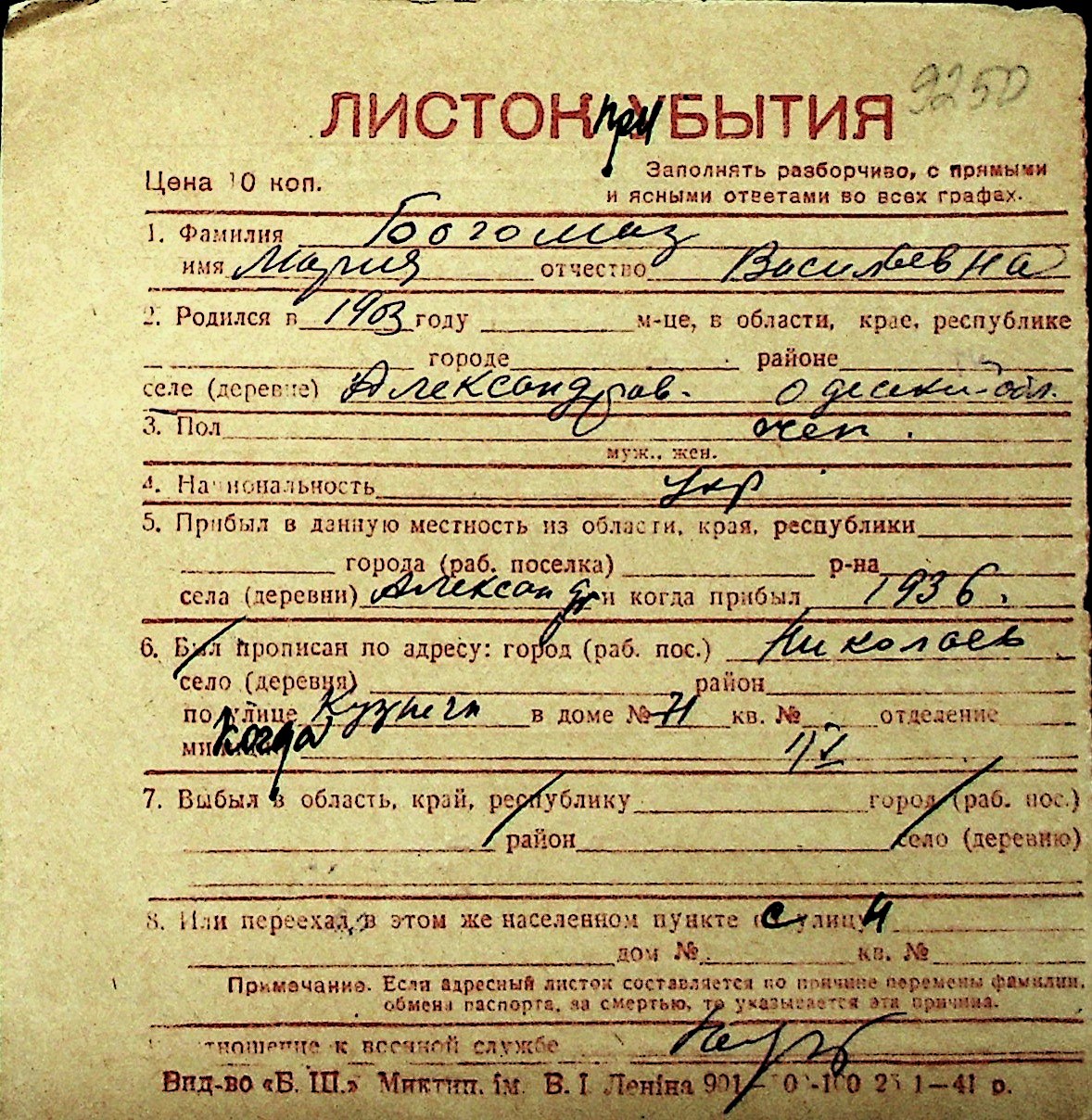 ◦ ◦ Перелік карток на осіб, які мешкали у м. Миколаїв у період окупації 1941–1944 років
