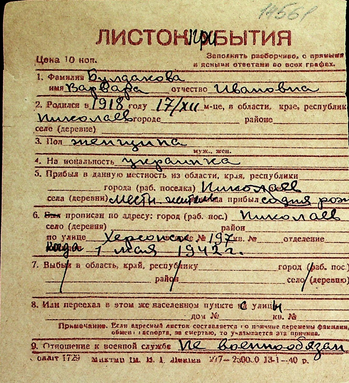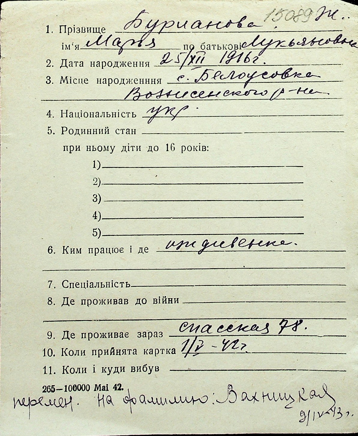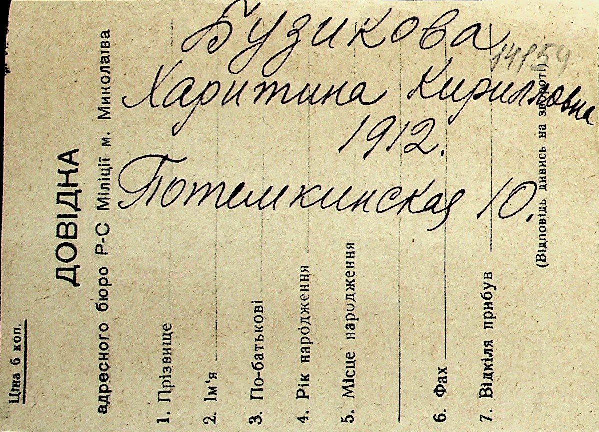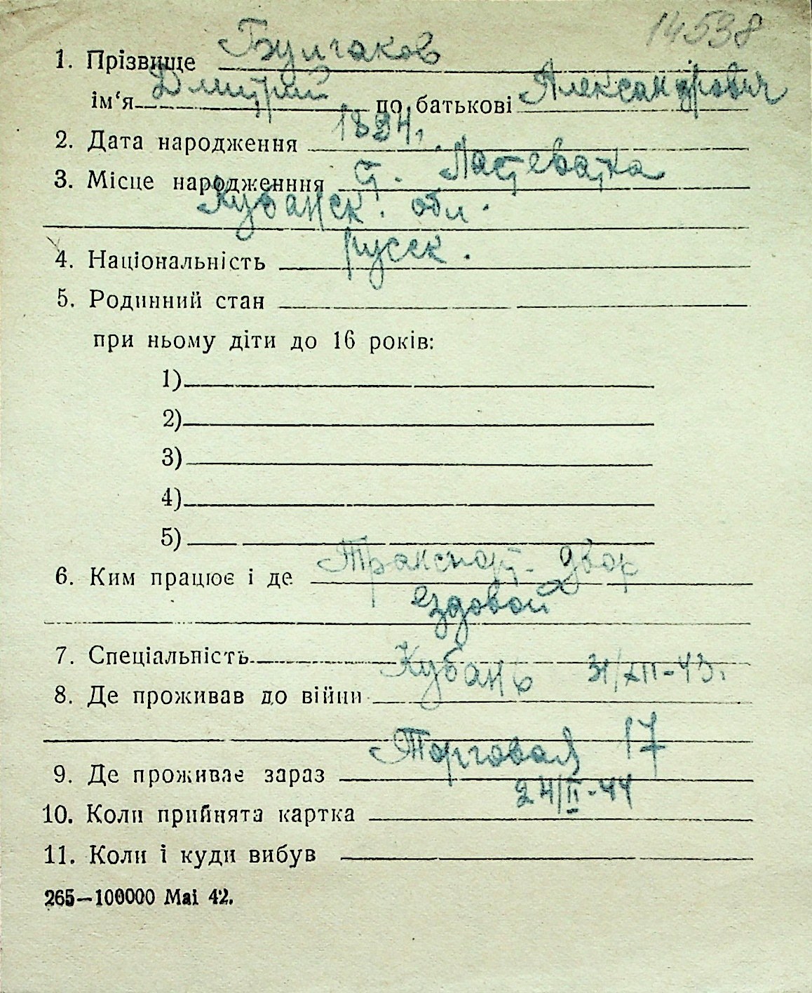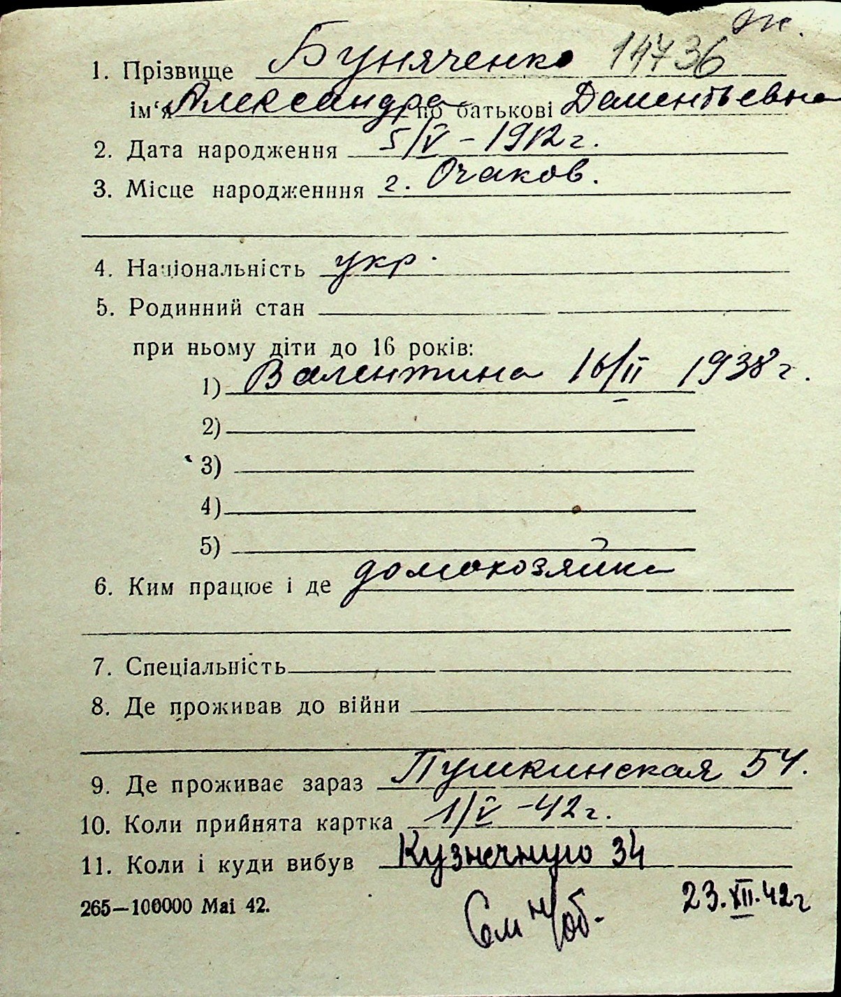 ◦ ◦ Перелік карток на осіб, які мешкали у м. Миколаїв у період окупації 1941–1944 років