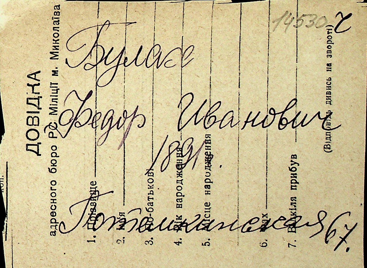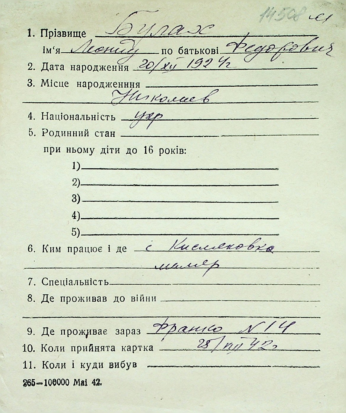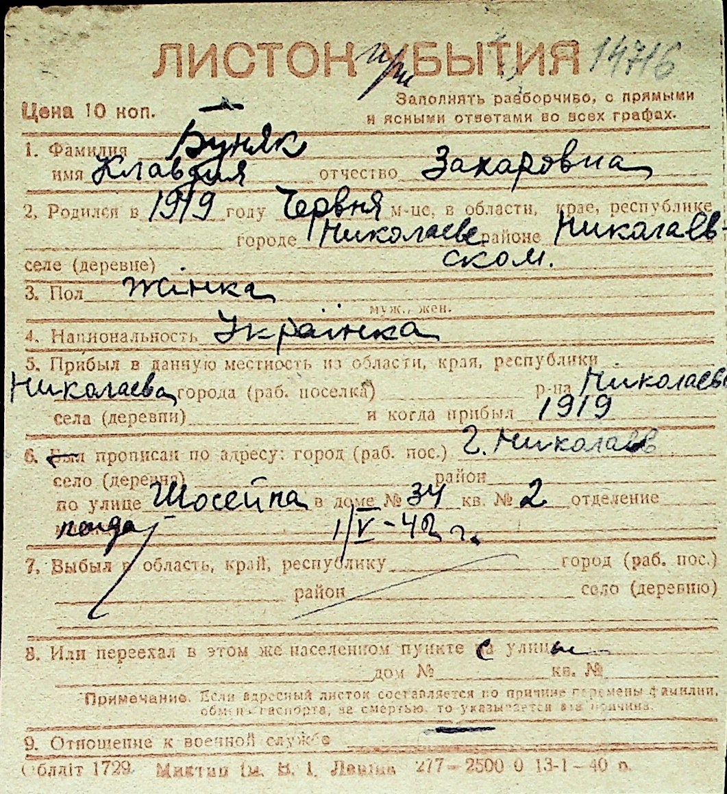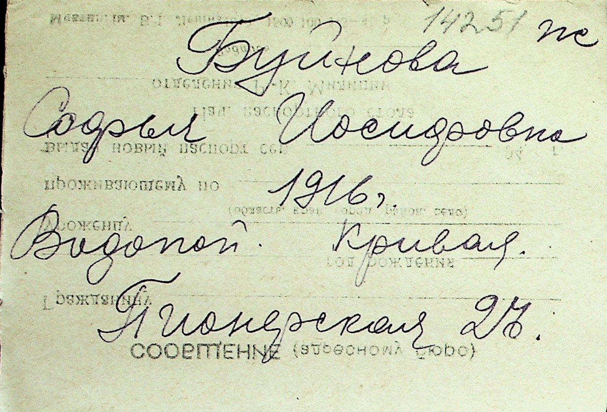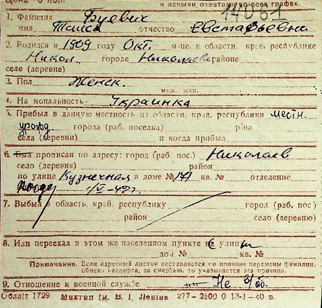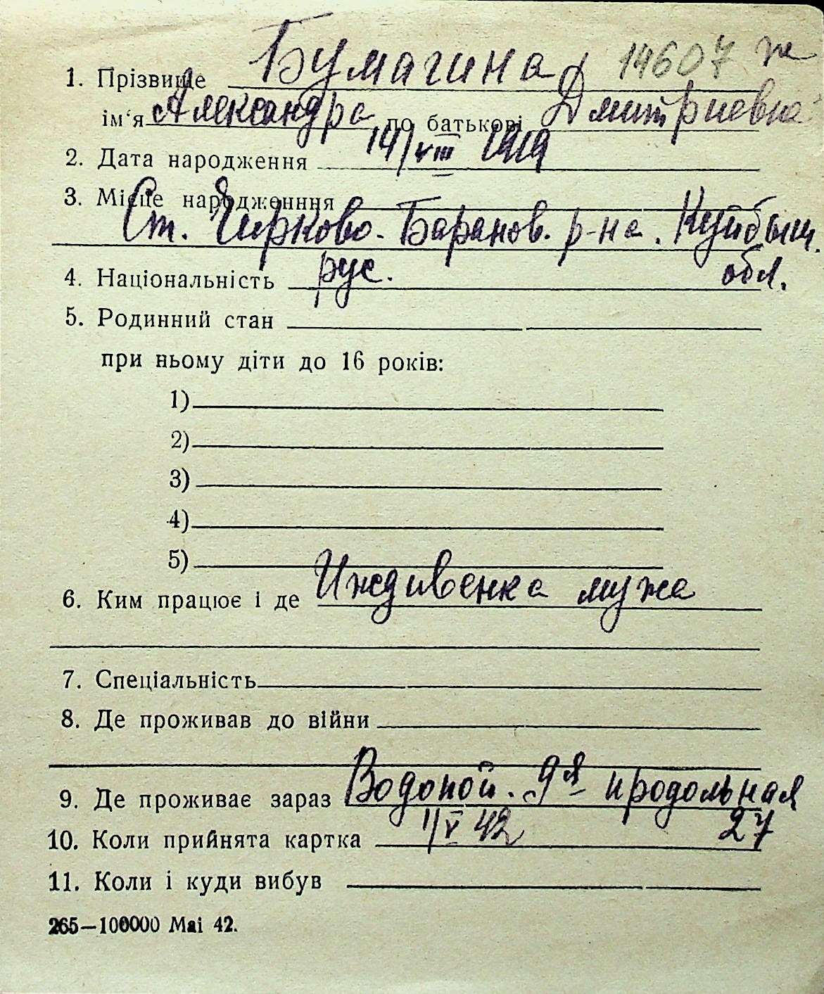 ◦ ◦ Перелік карток на осіб, які мешкали у м. Миколаїв у період окупації 1941–1944 років