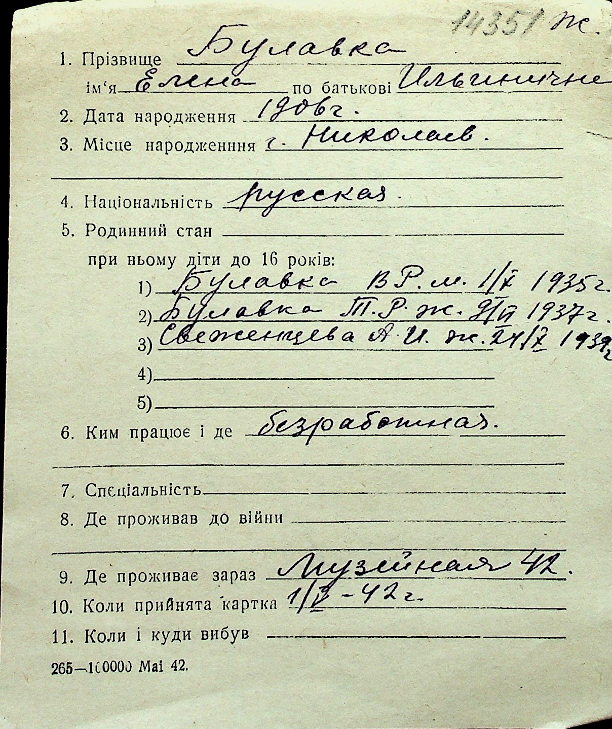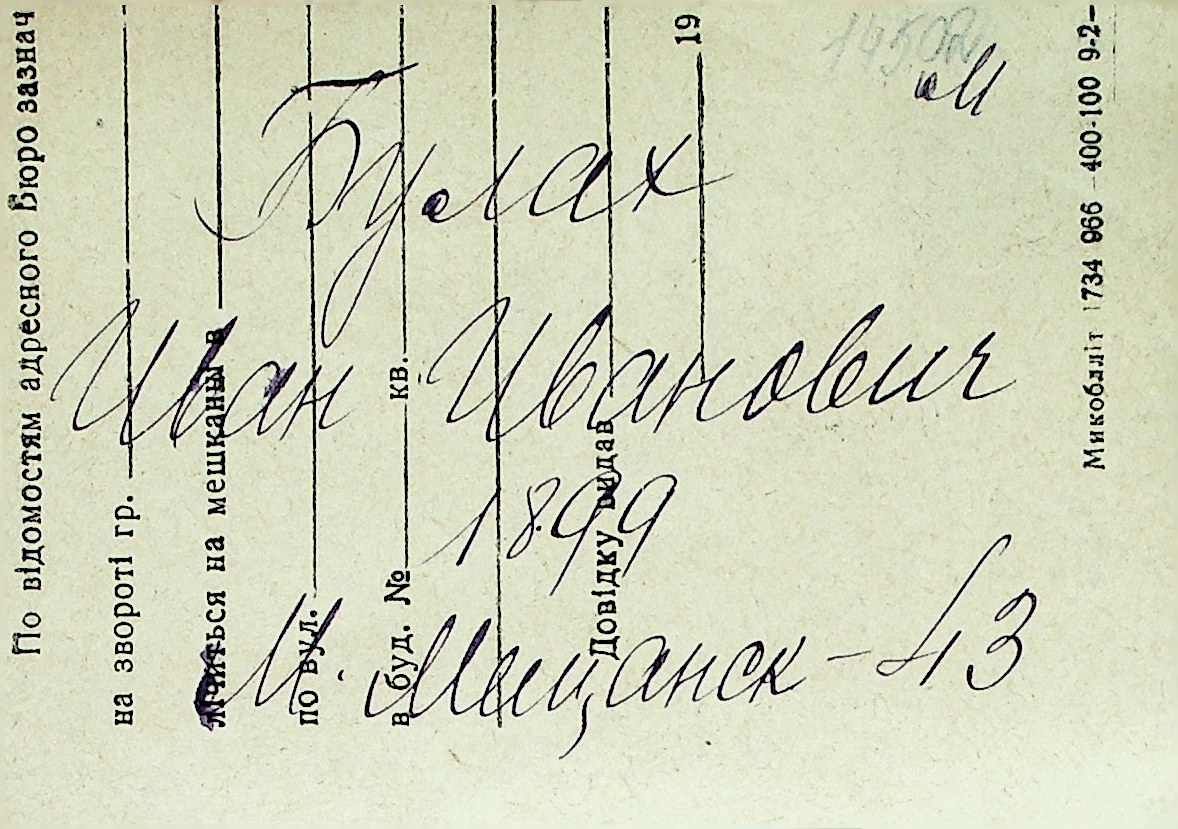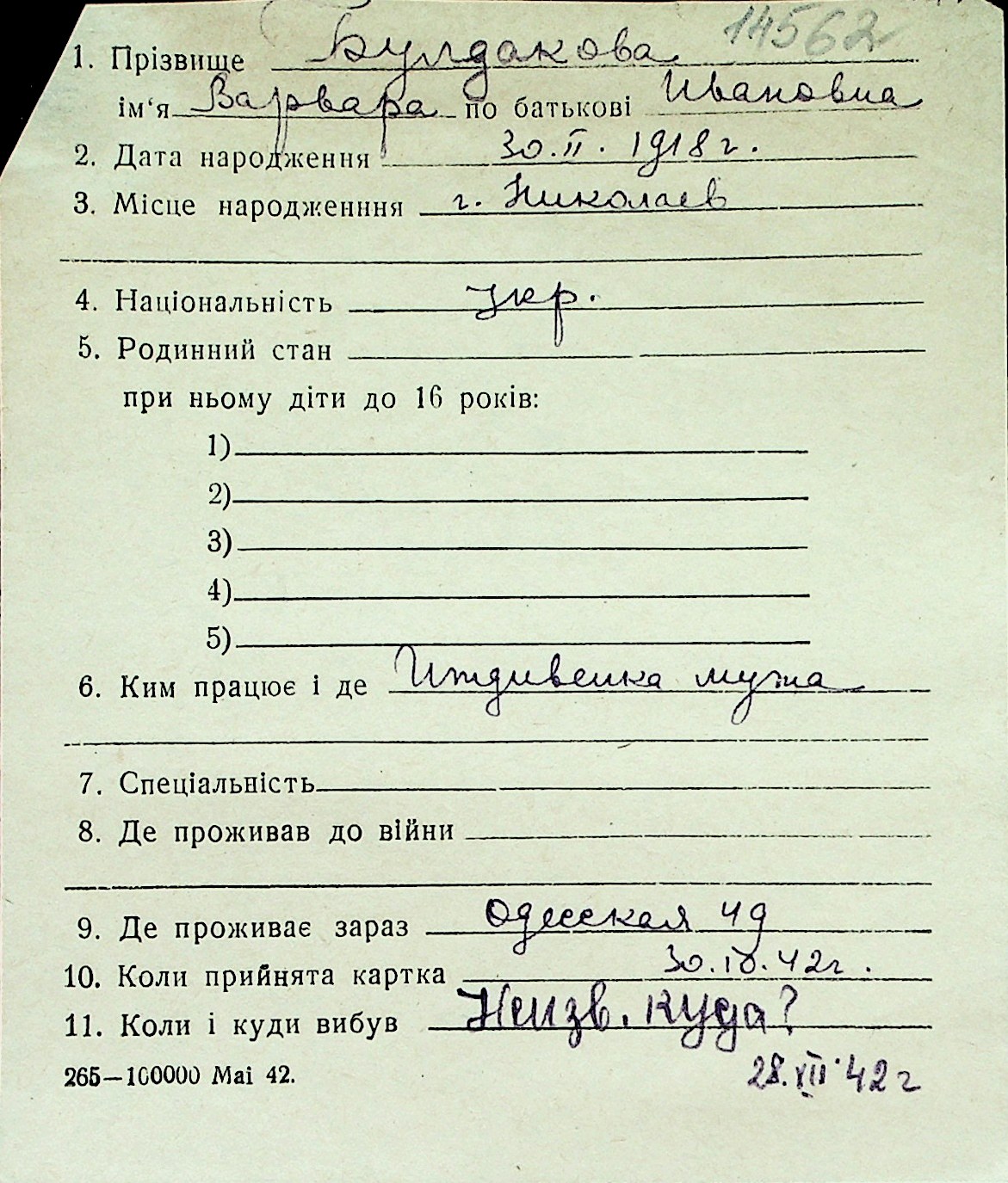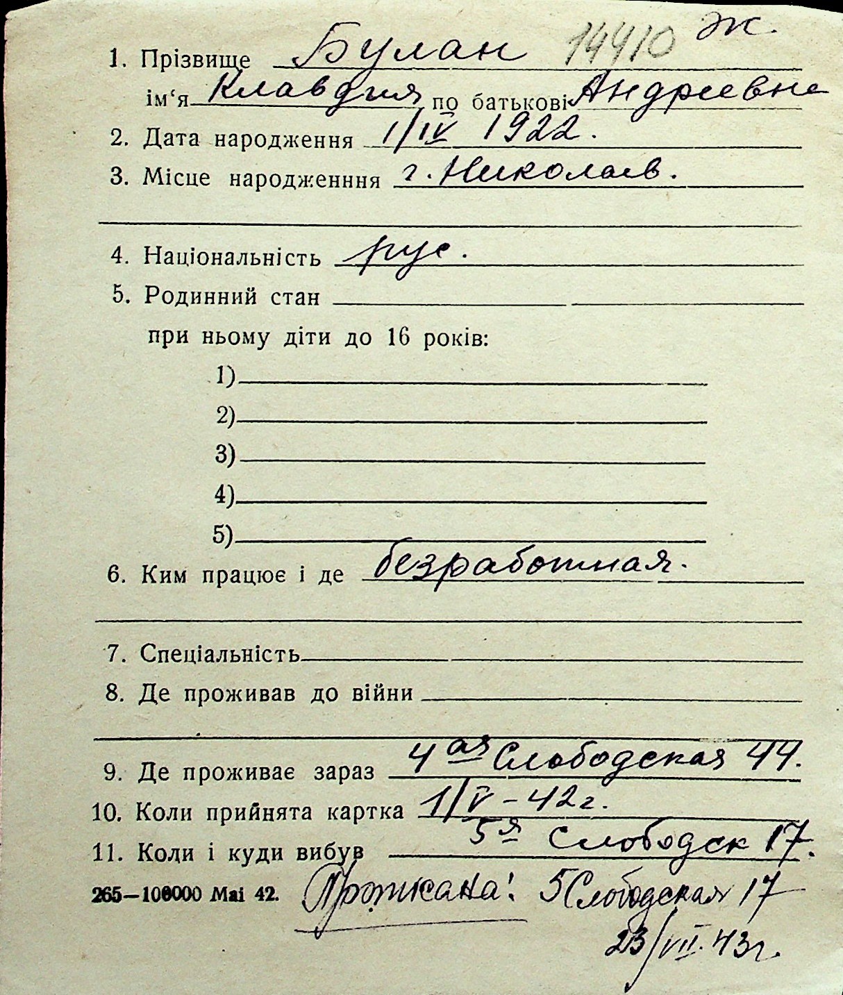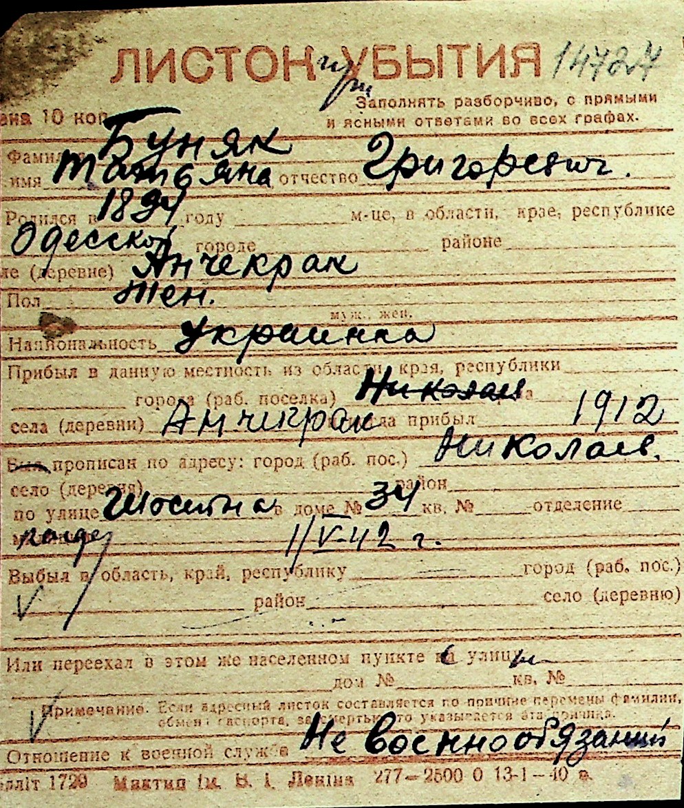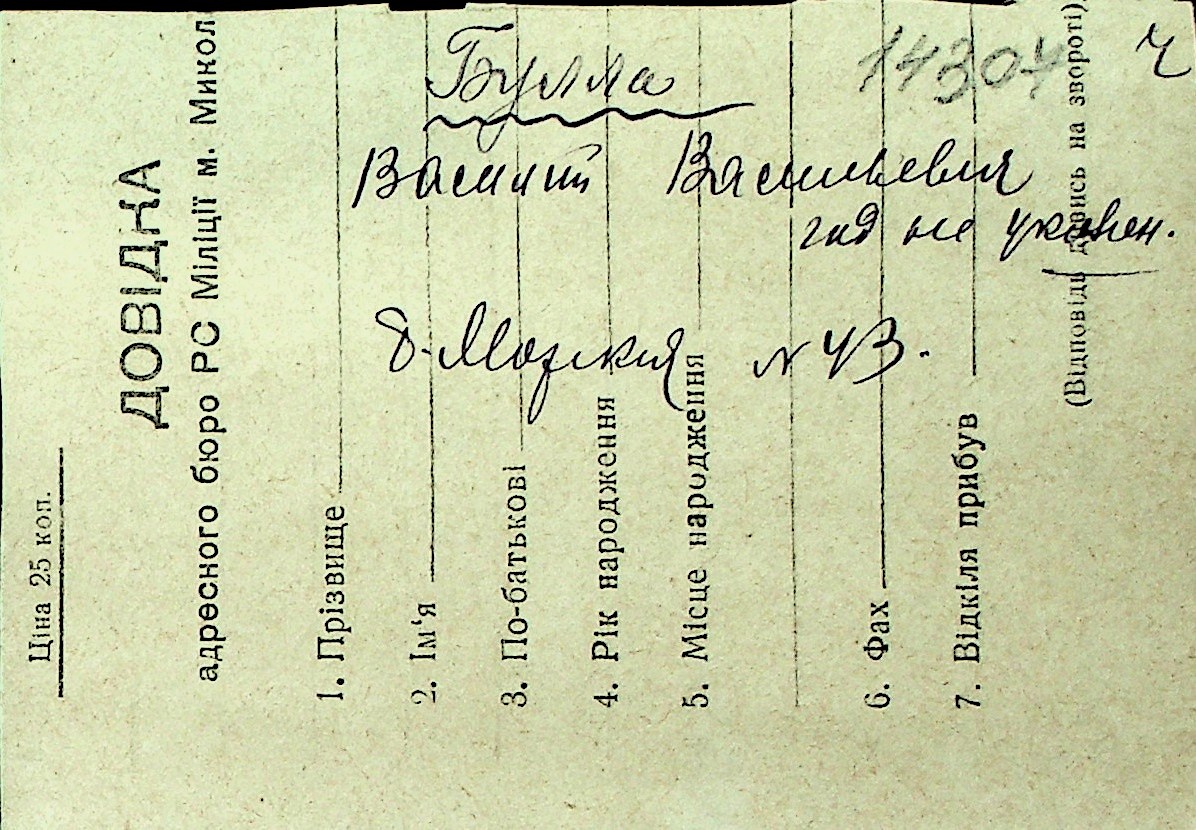 ◦ ◦ Перелік карток на осіб, які мешкали у м. Миколаїв у період окупації 1941–1944 років