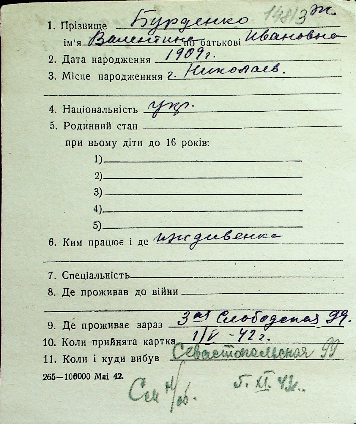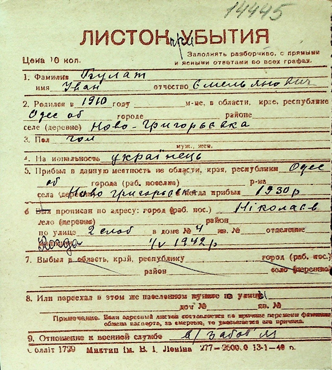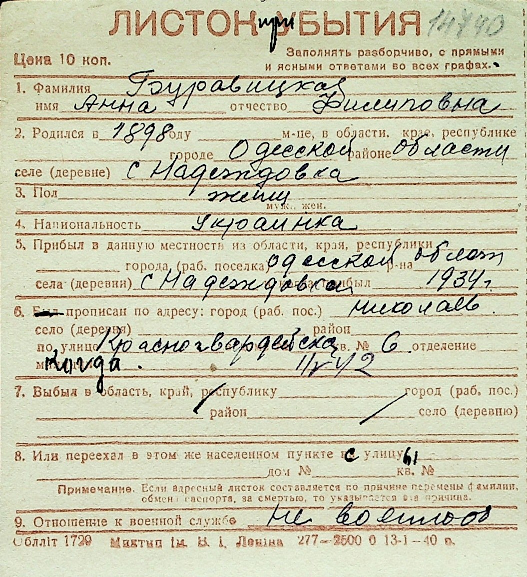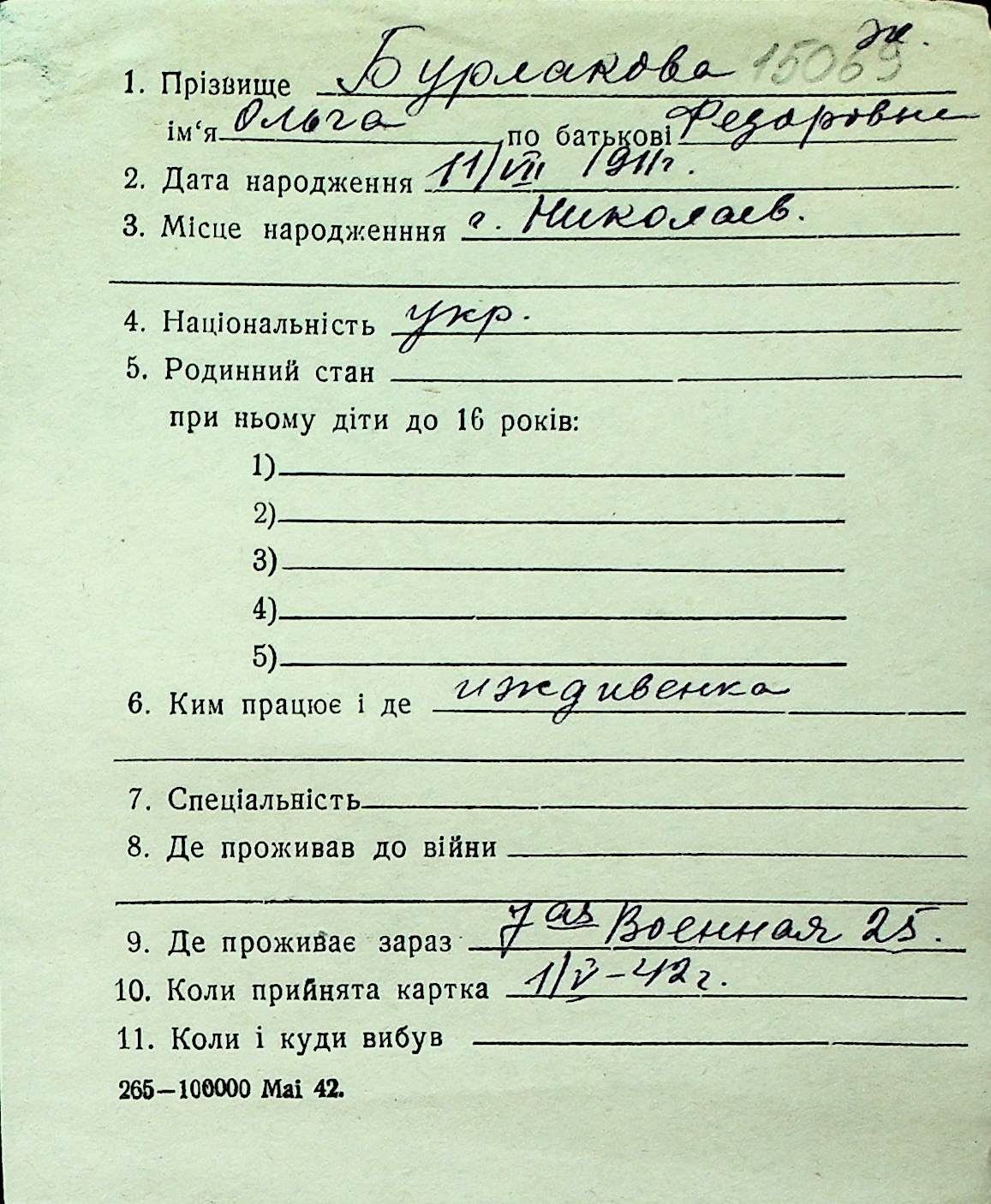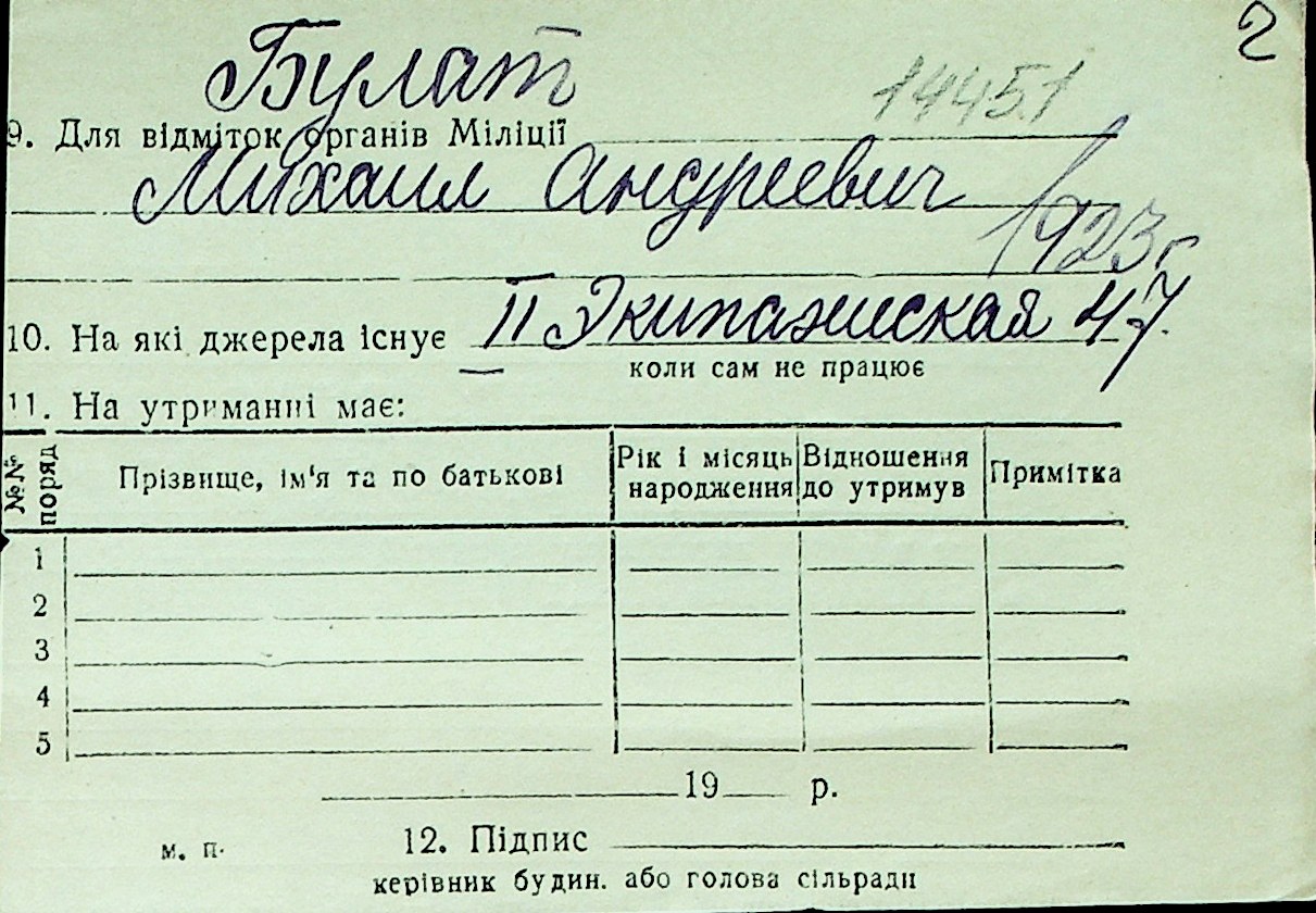 ◦ ◦ Перелік карток на осіб, які мешкали у м. Миколаїв у період окупації 1941–1944 років