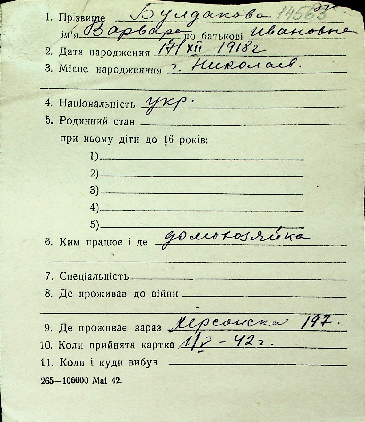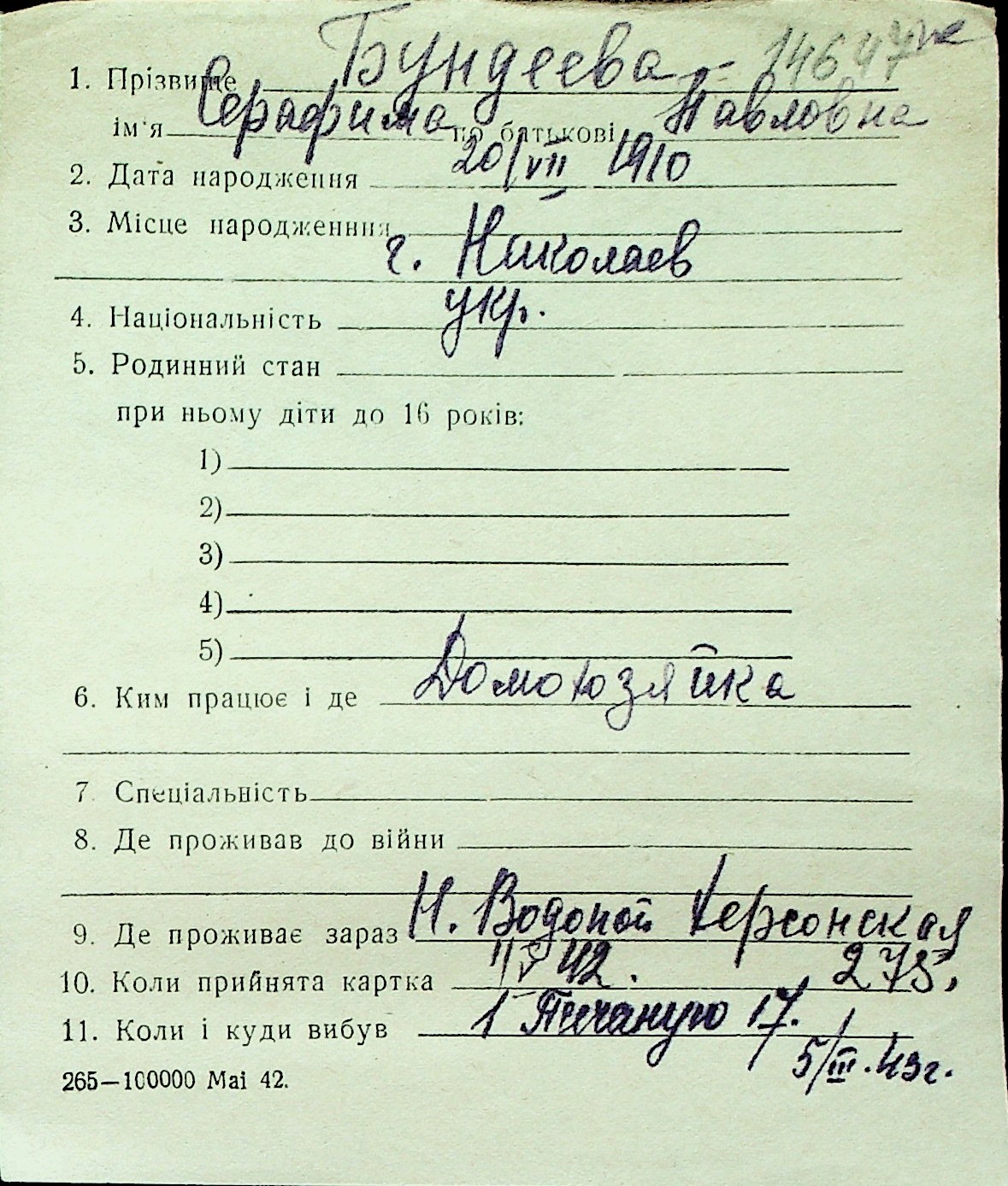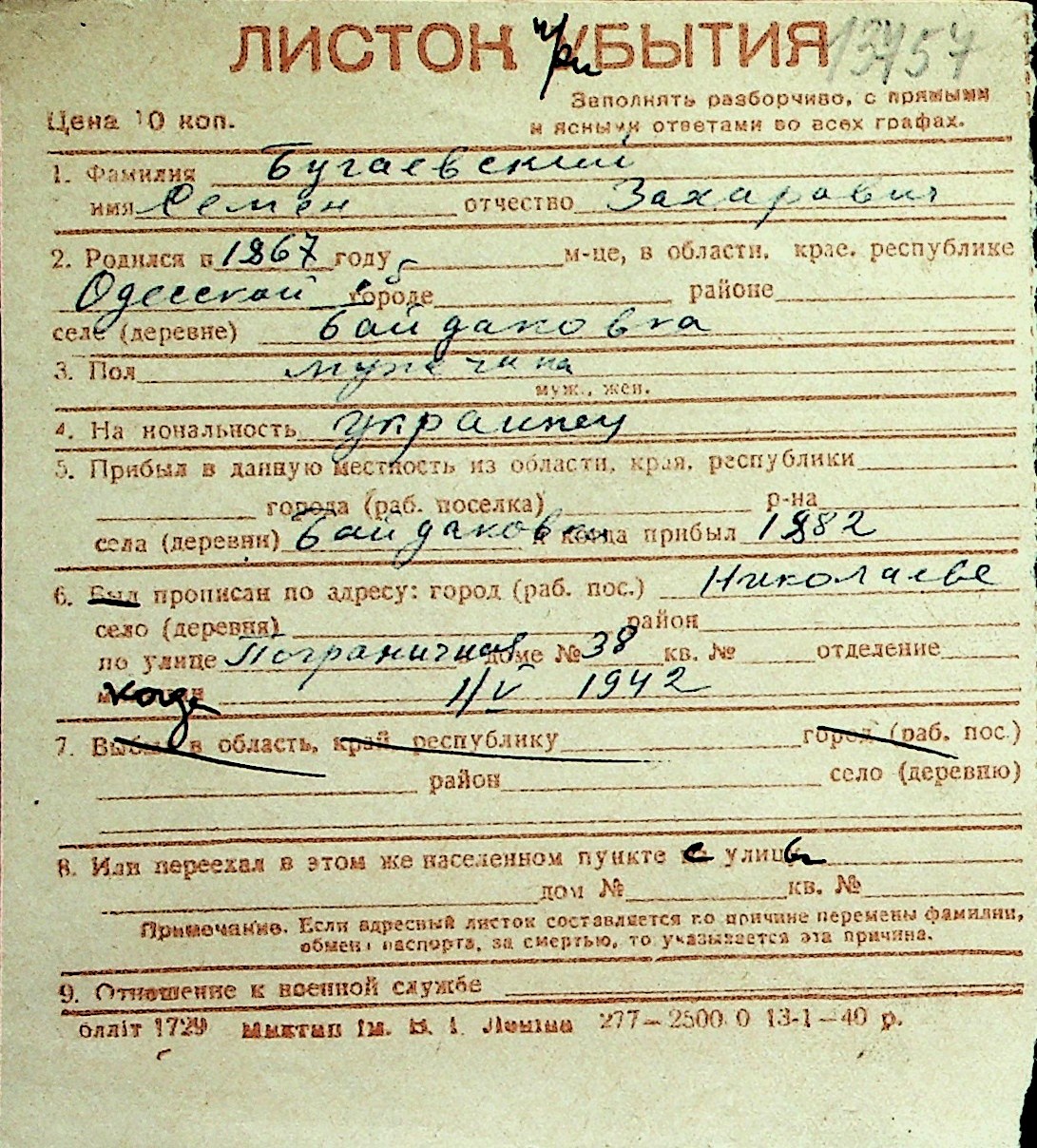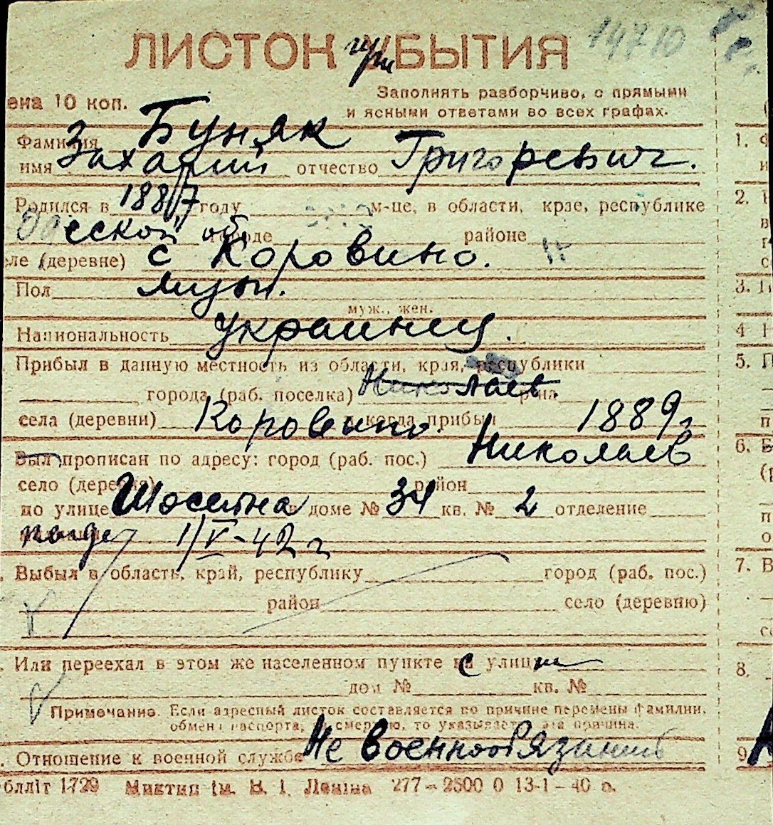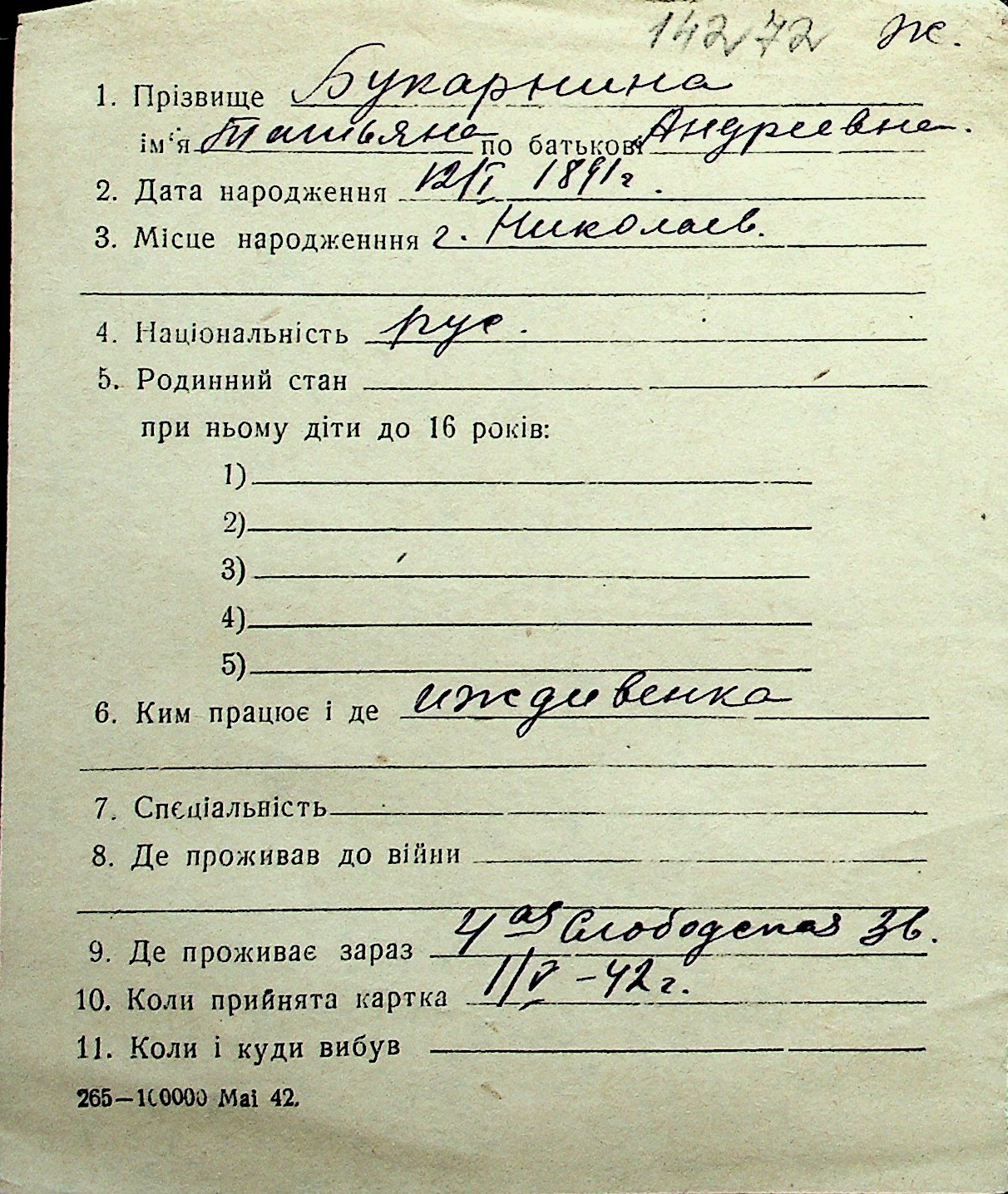 ◦ ◦ Перелік карток на осіб, які мешкали у м. Миколаїв у період окупації 1941–1944 років