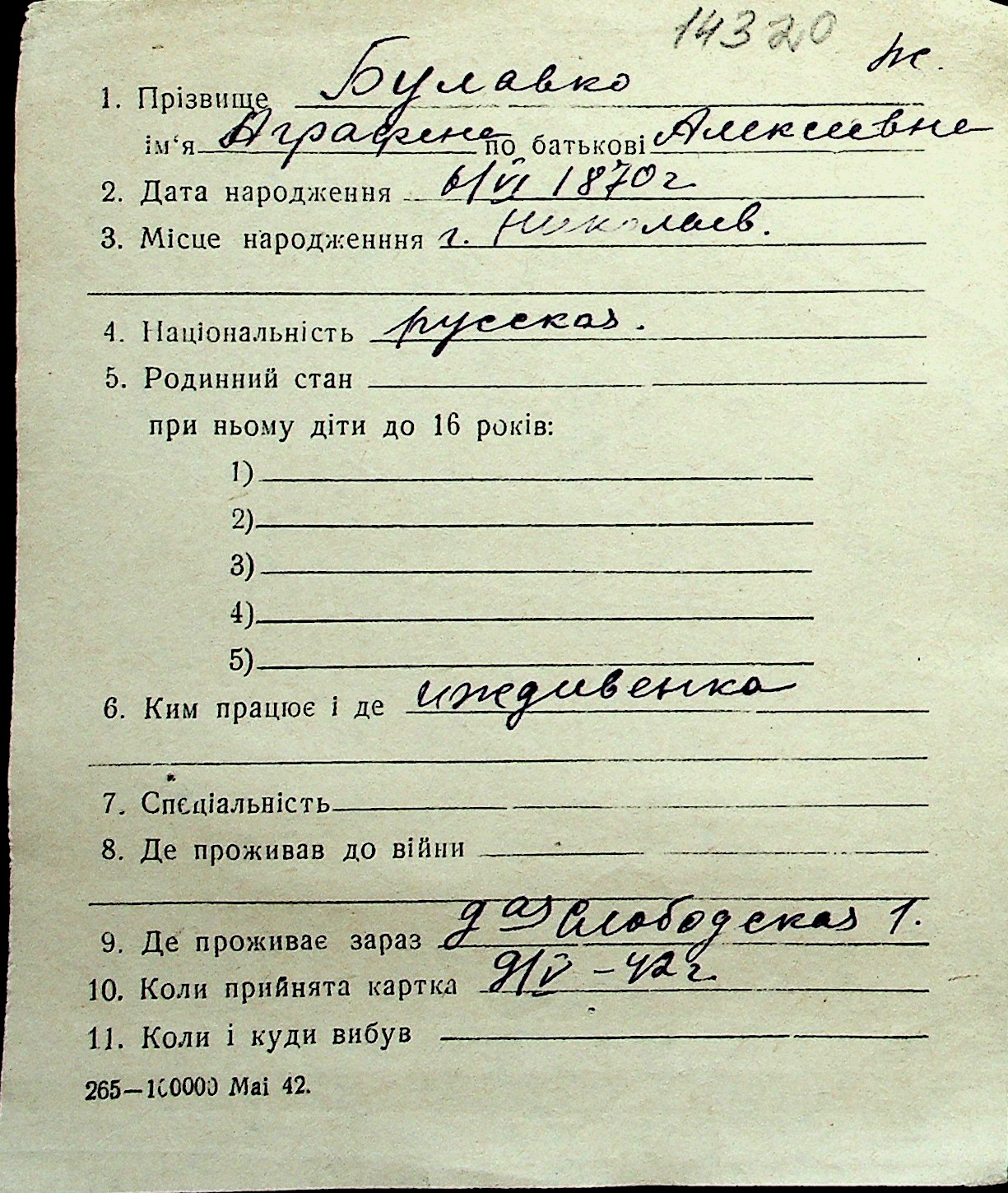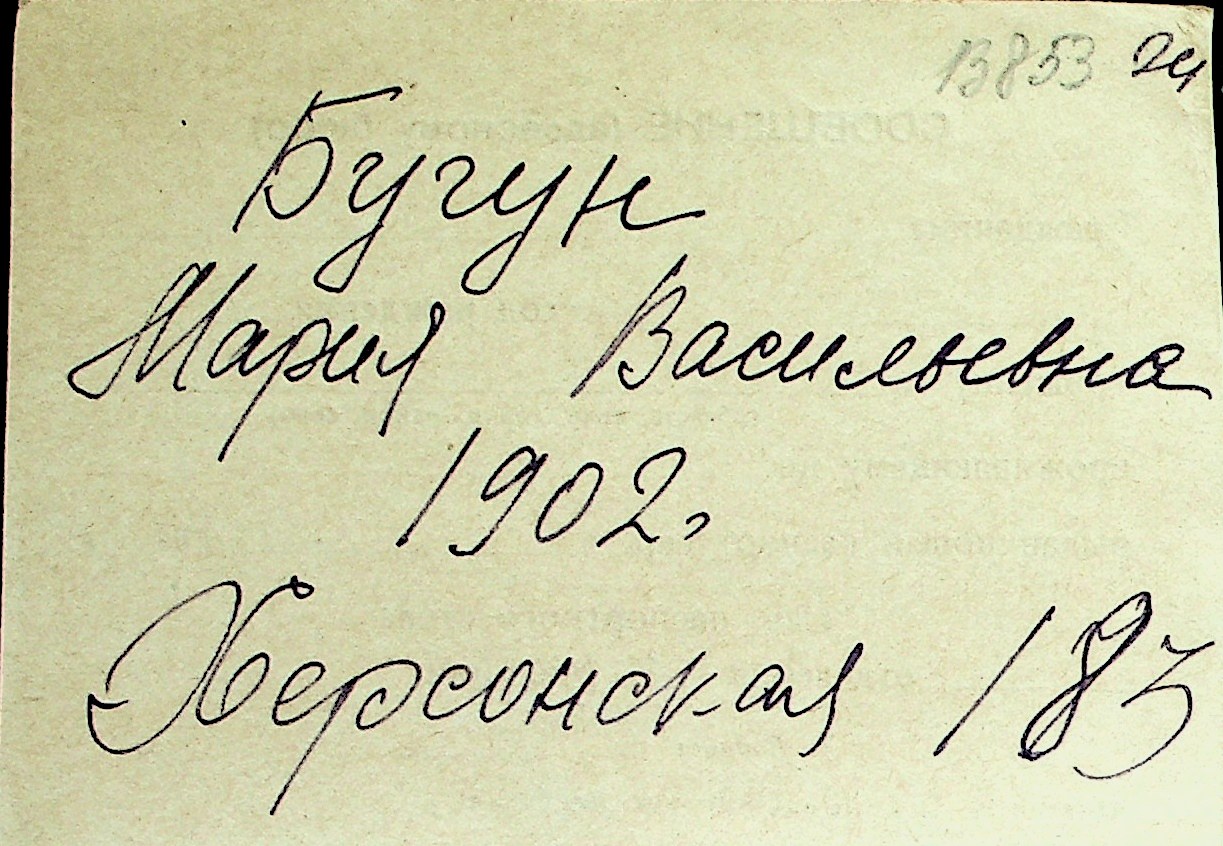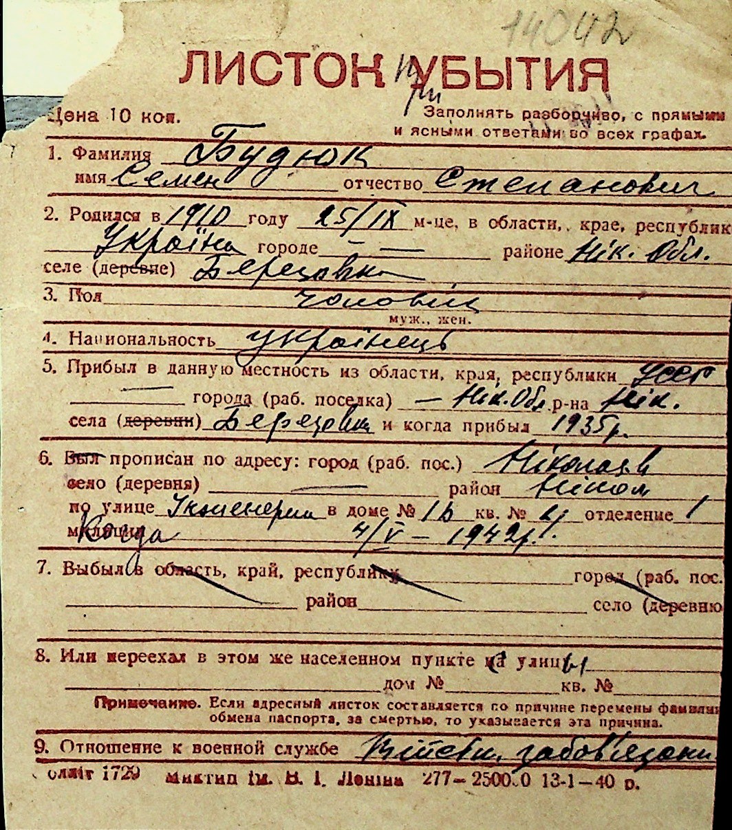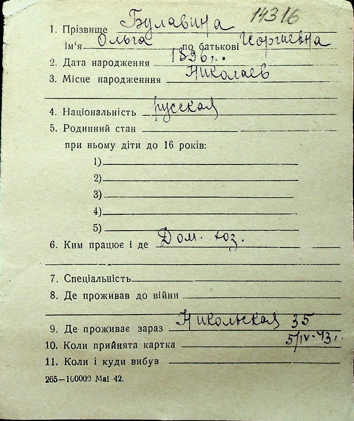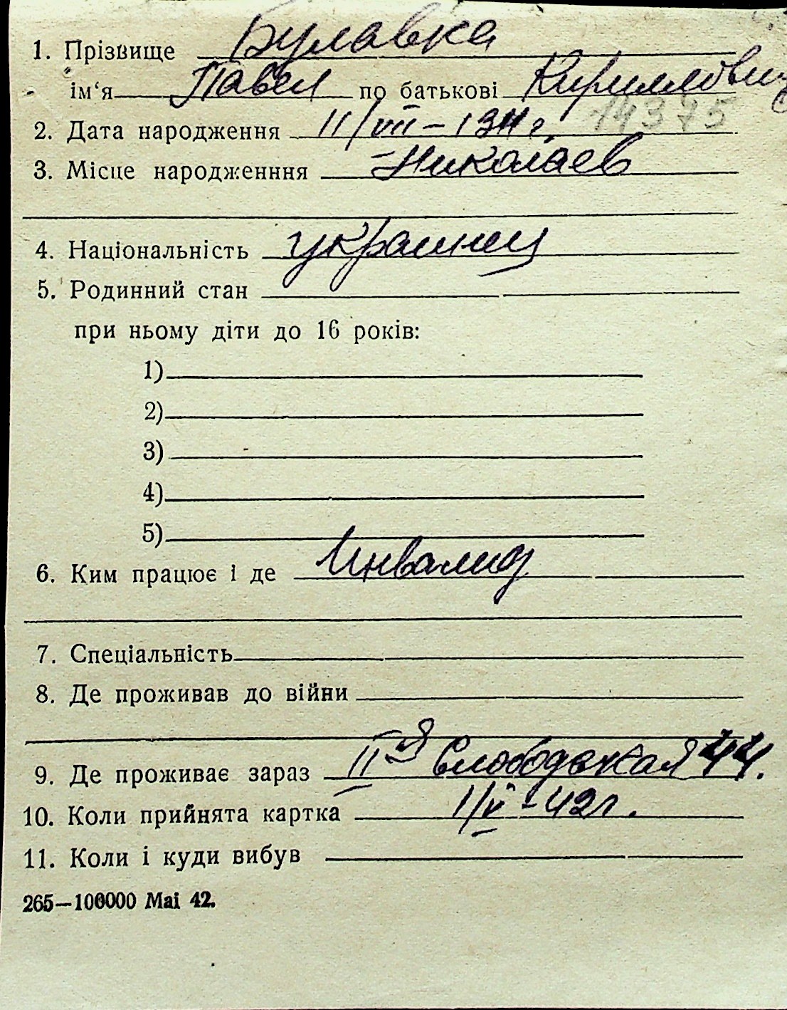 ◦ ◦ Перелік карток на осіб, які мешкали у м. Миколаїв у період окупації 1941–1944 років