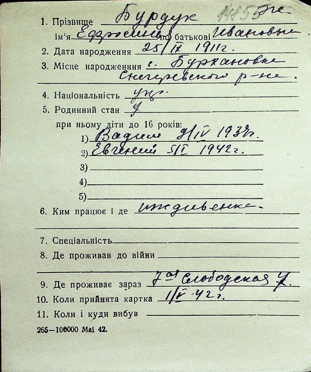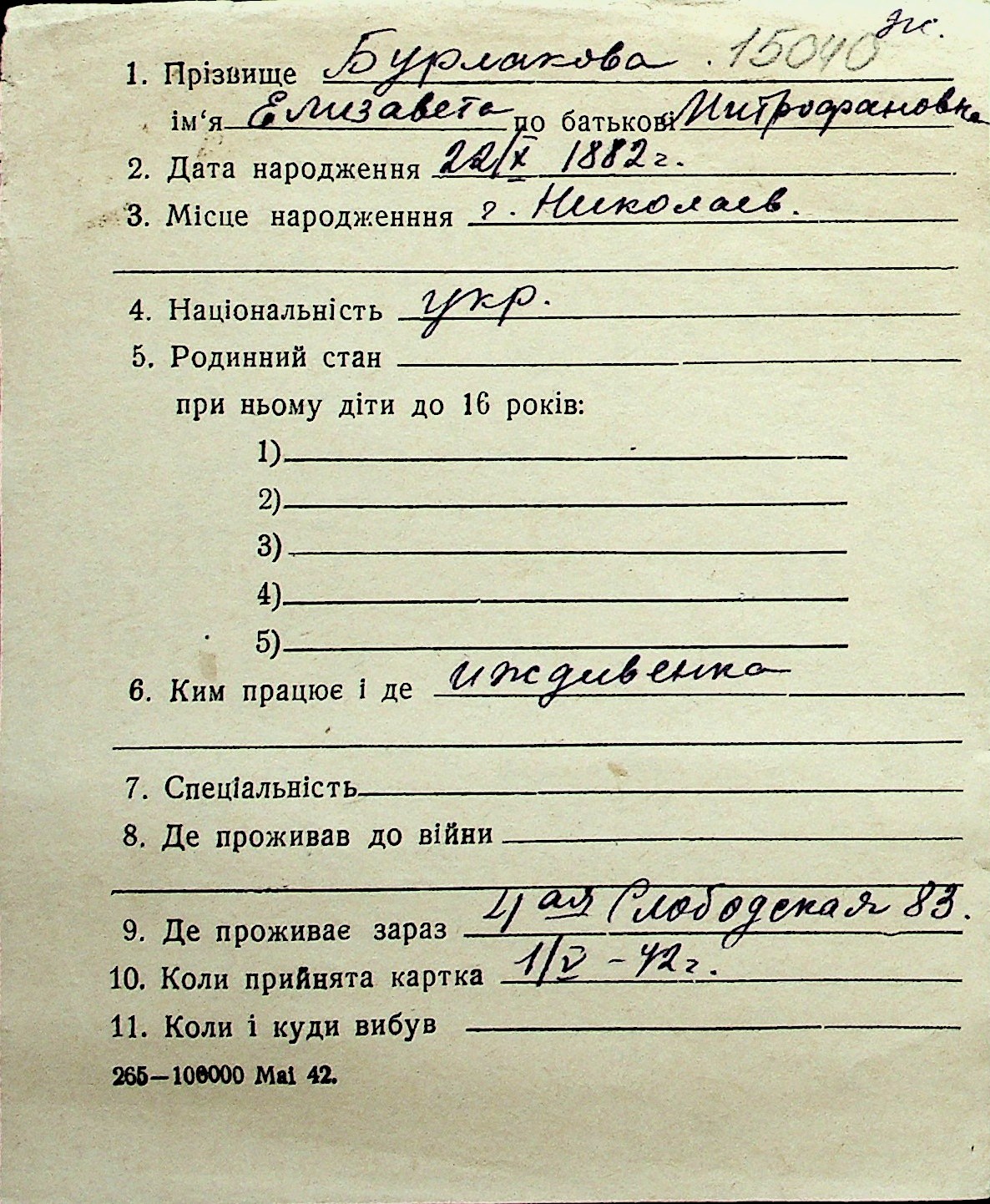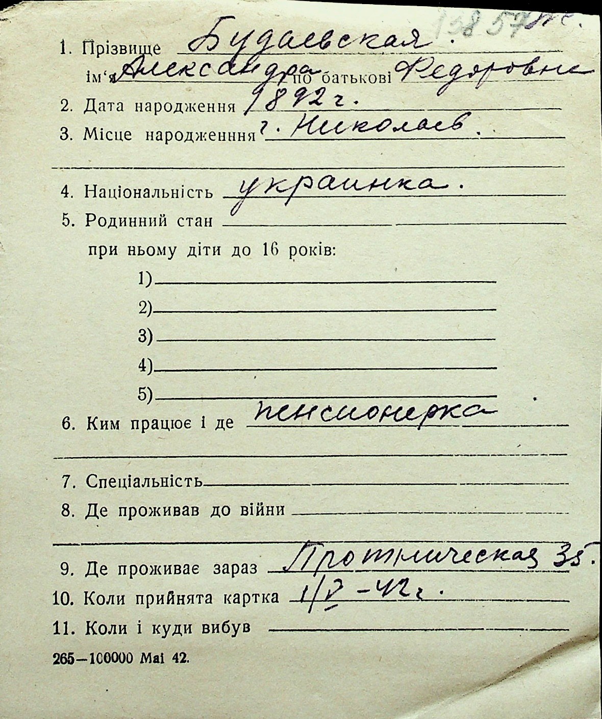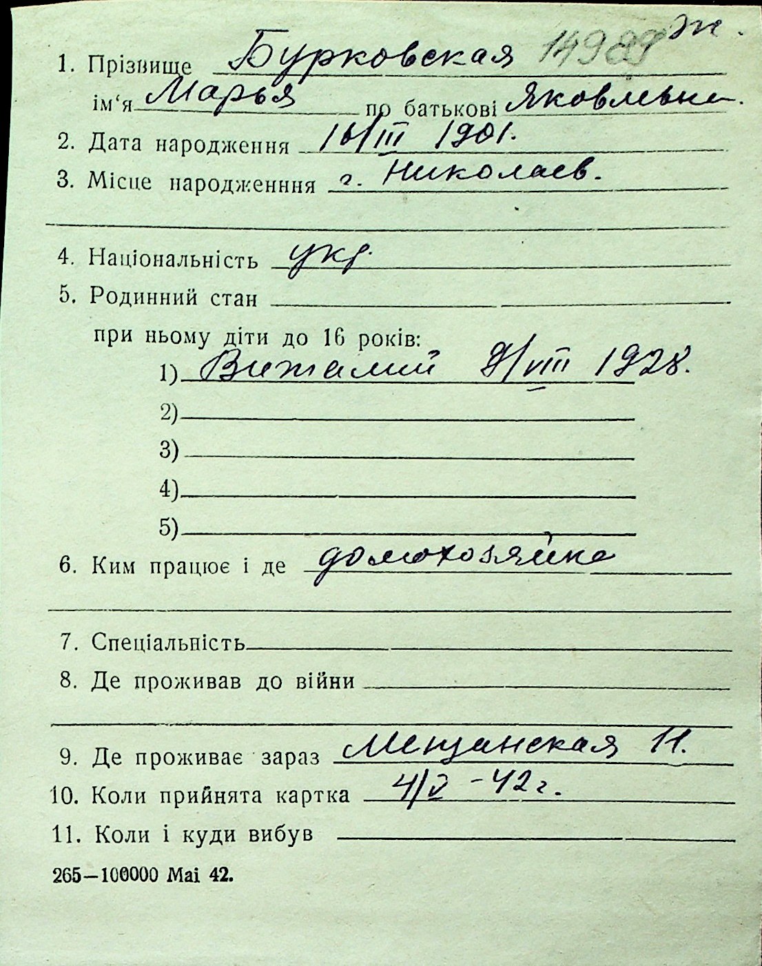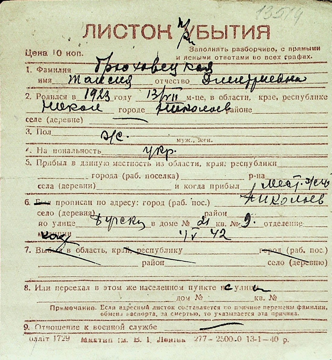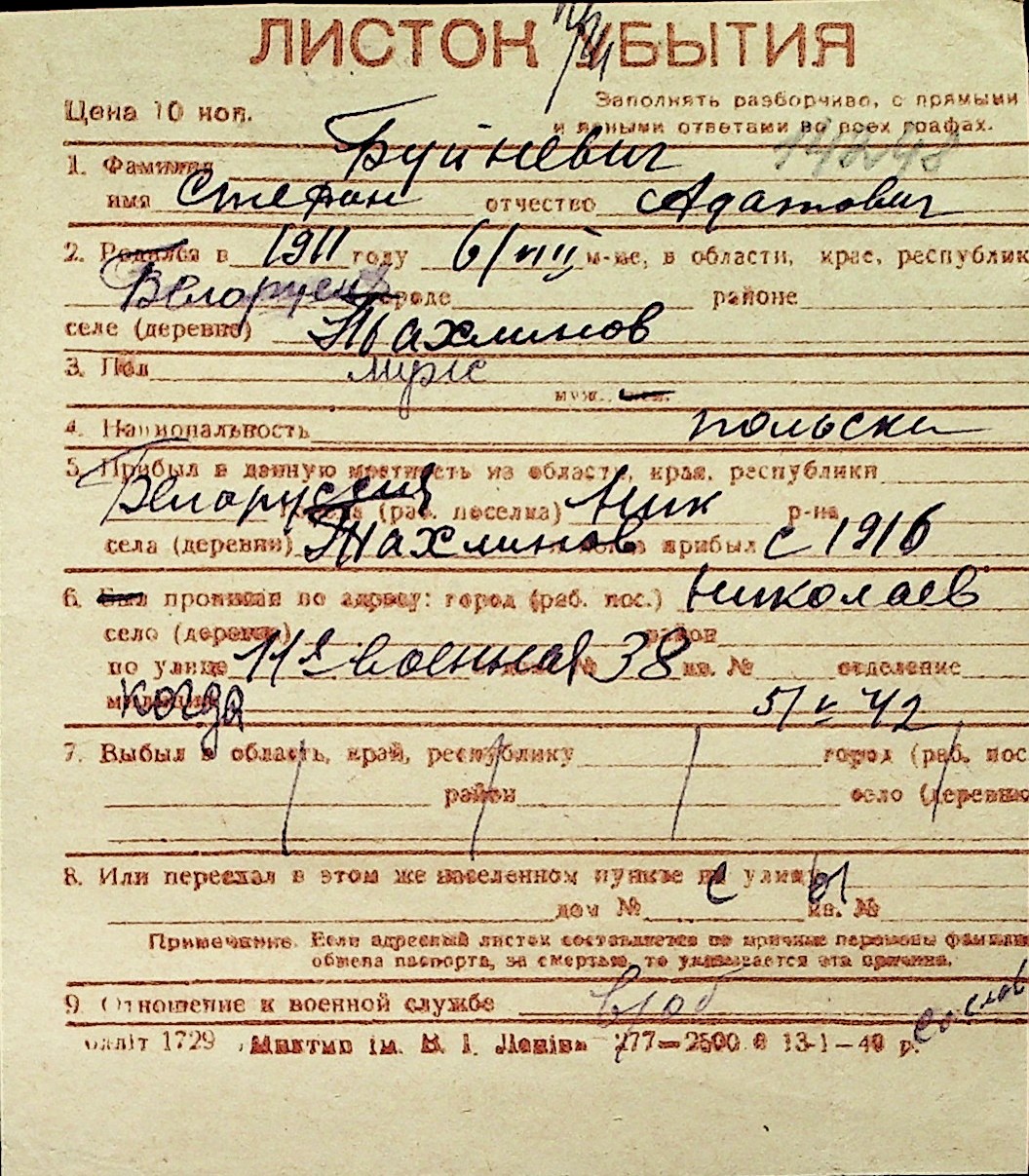 ◦ ◦ Перелік карток на осіб, які мешкали у м. Миколаїв у період окупації 1941–1944 років
