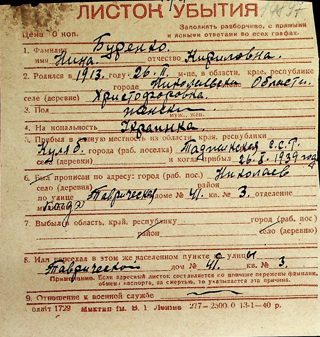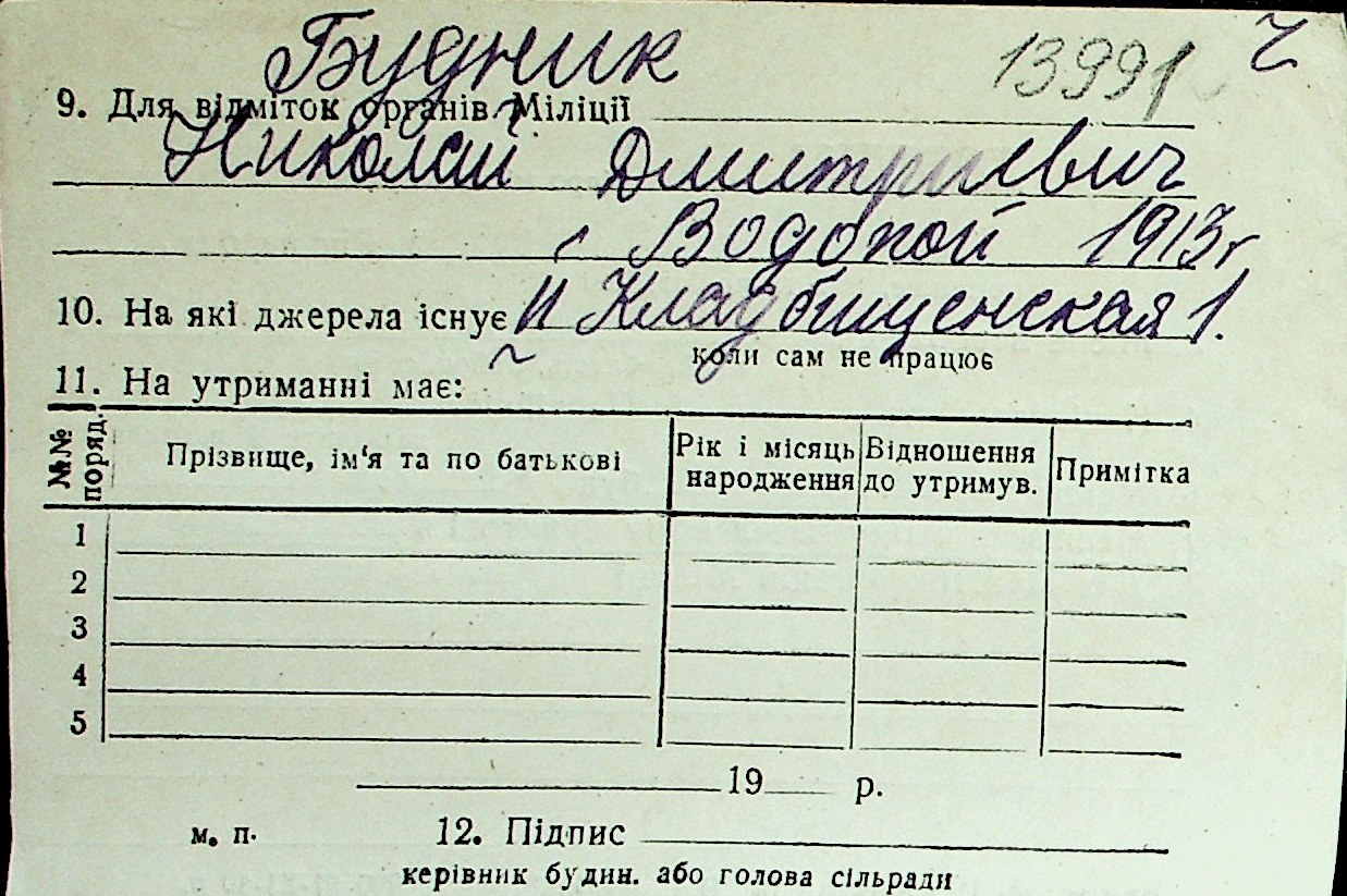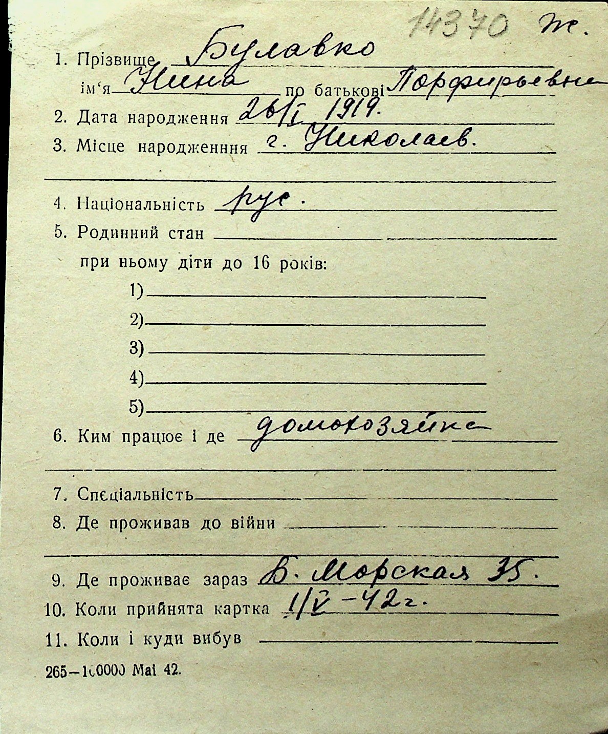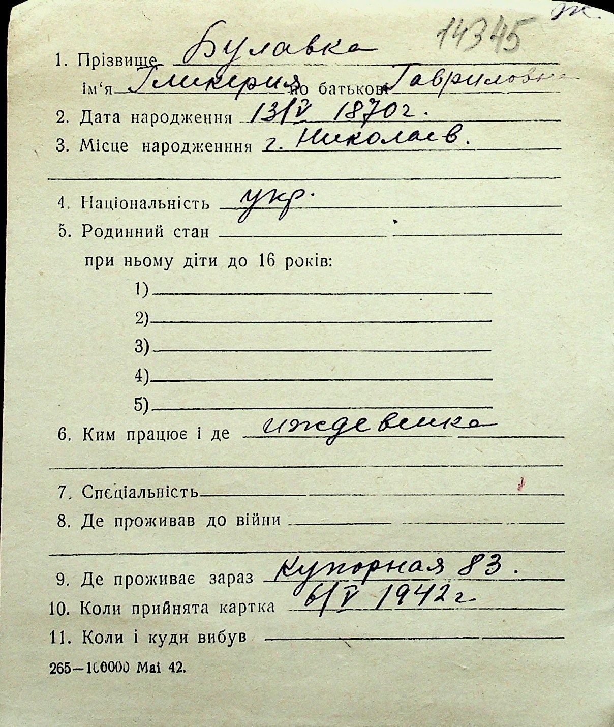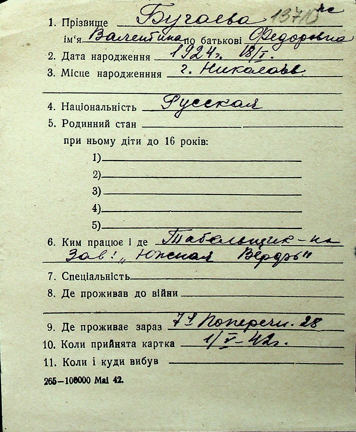 ◦ ◦ Перелік карток на осіб, які мешкали у м. Миколаїв у період окупації 1941–1944 років