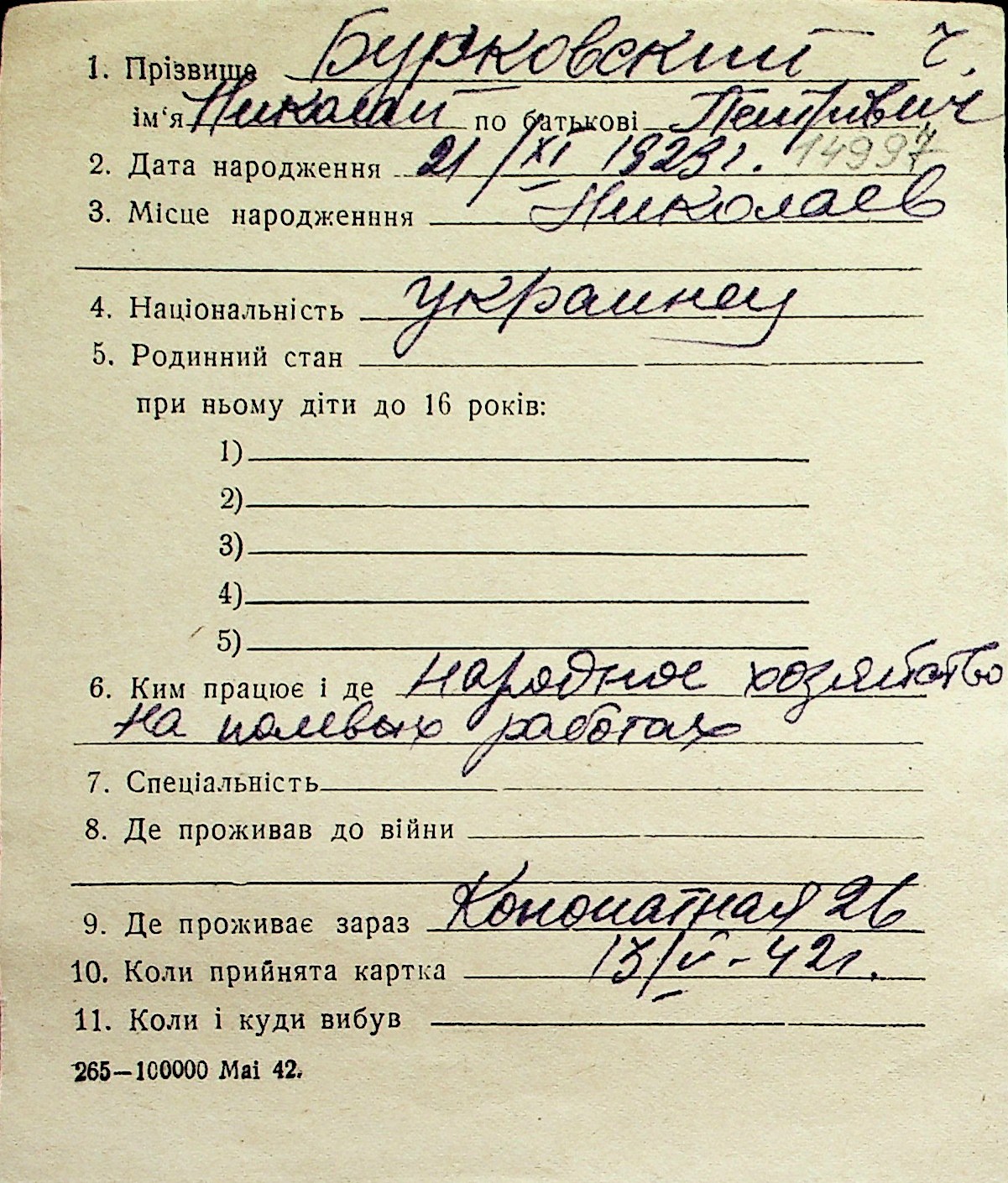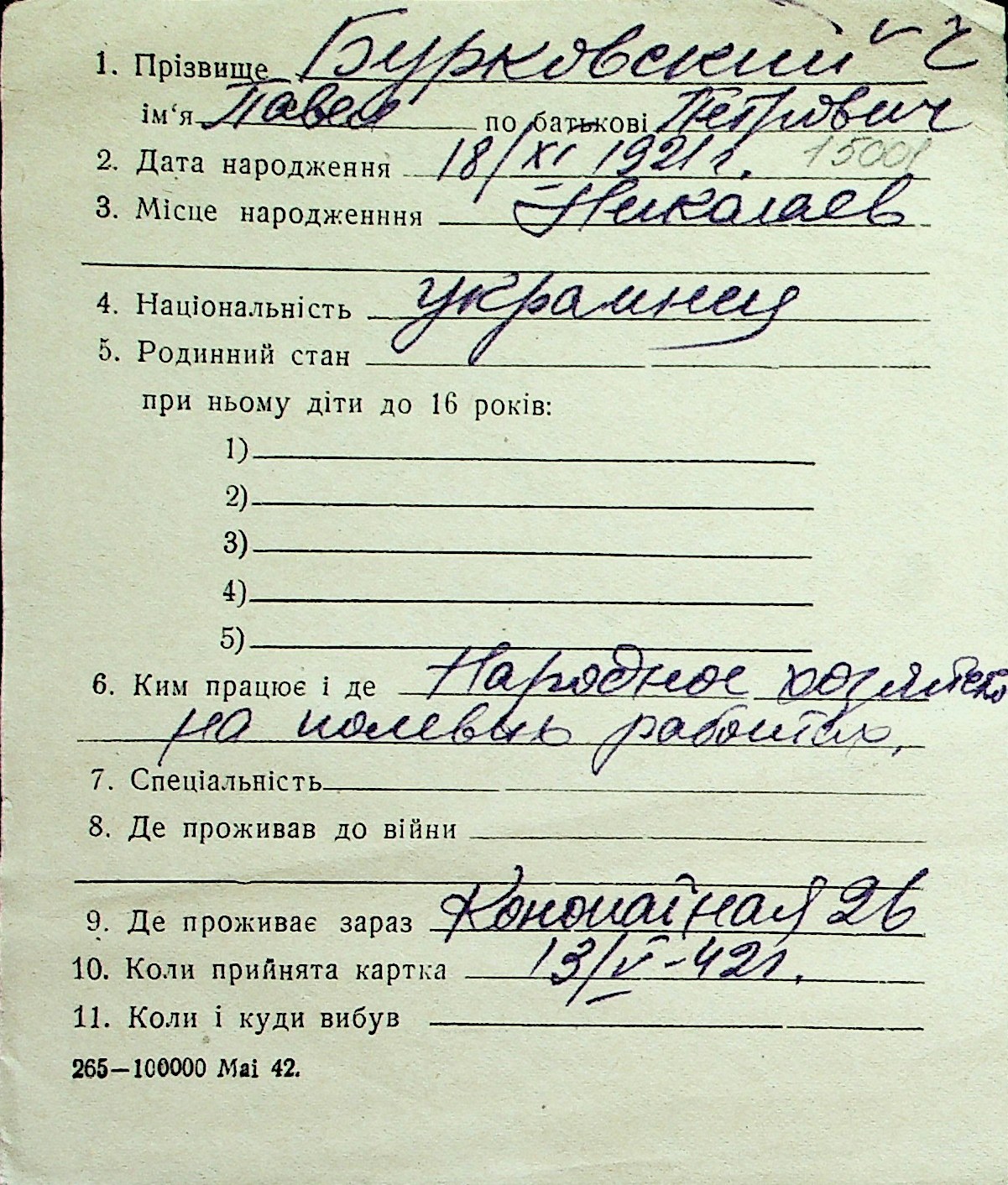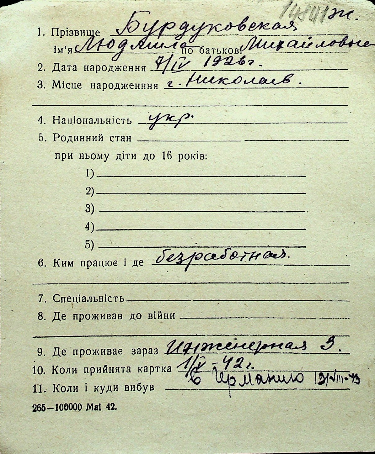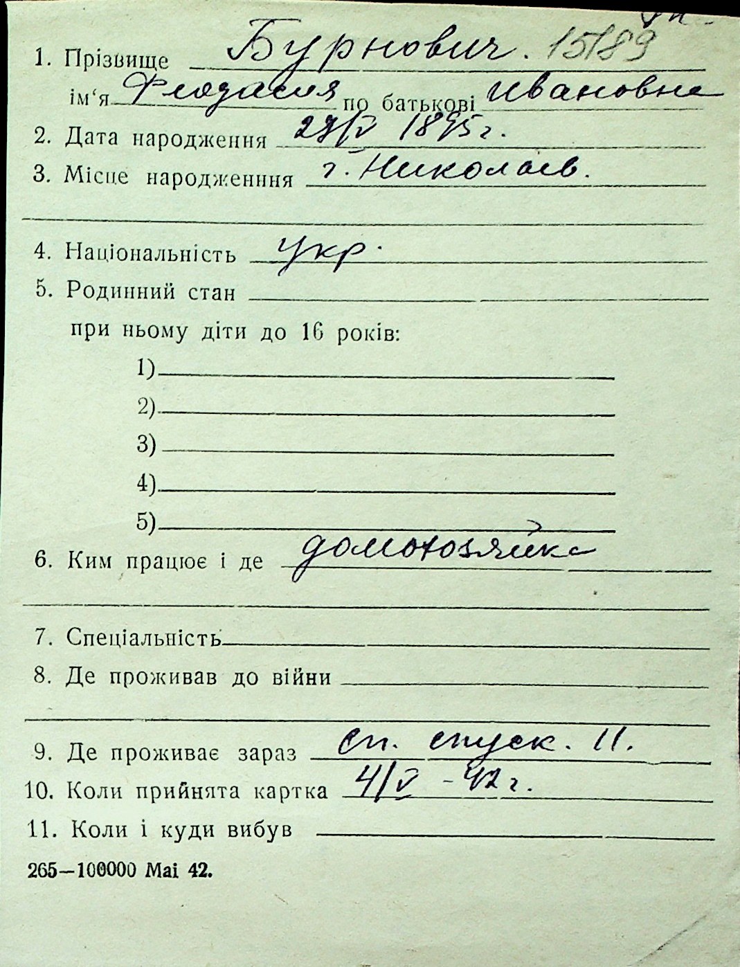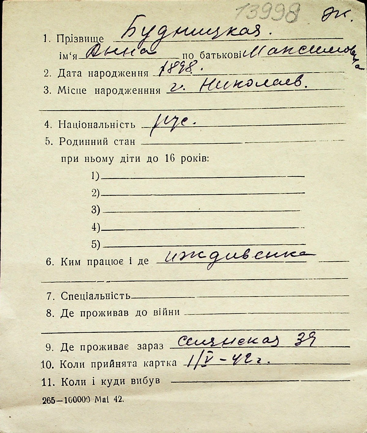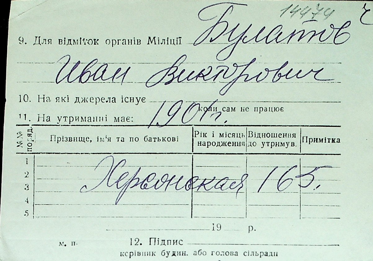 ◦ ◦ Перелік карток на осіб, які мешкали у м. Миколаїв у період окупації 1941–1944 років