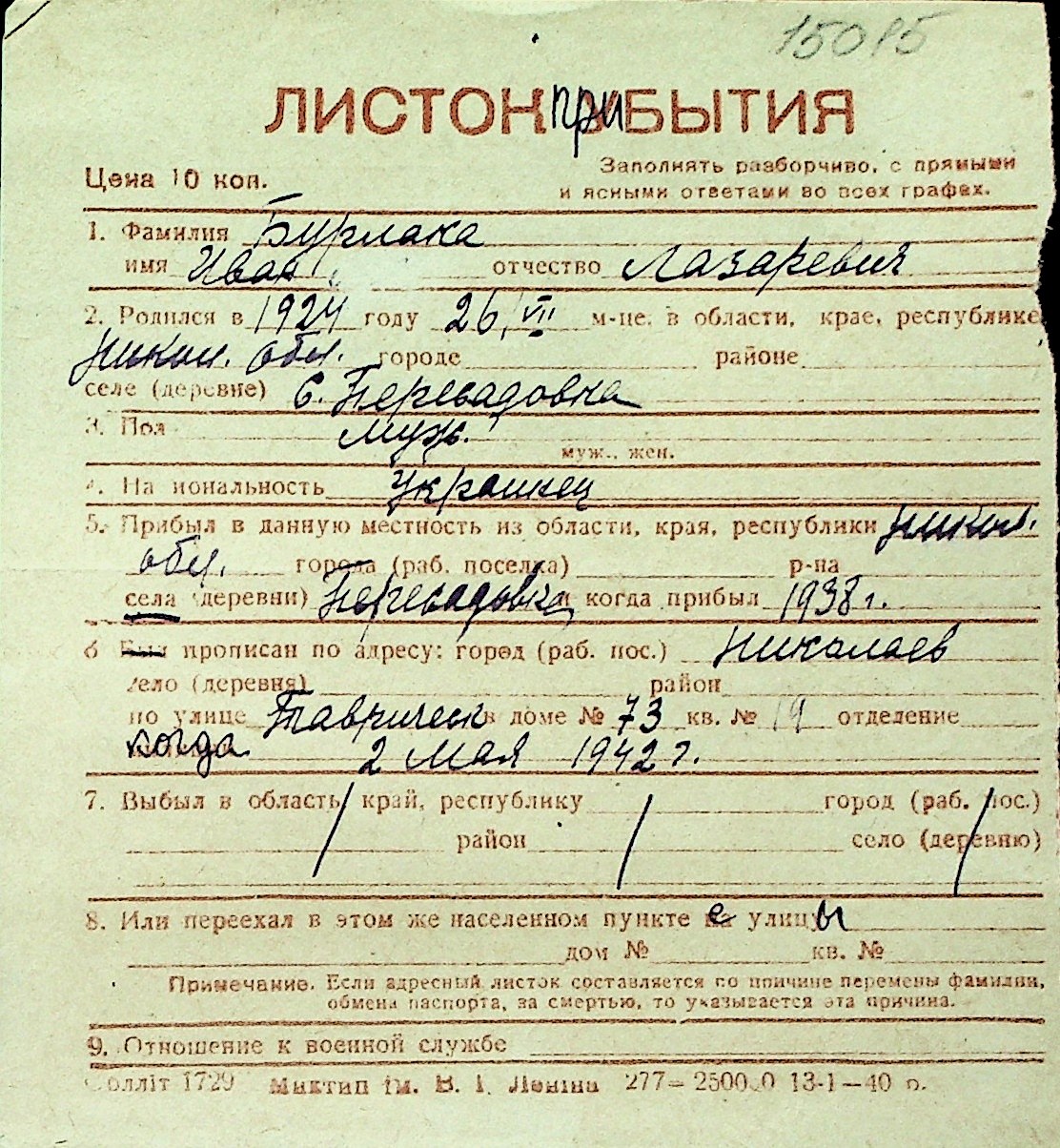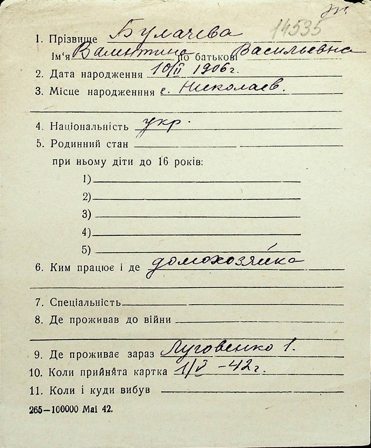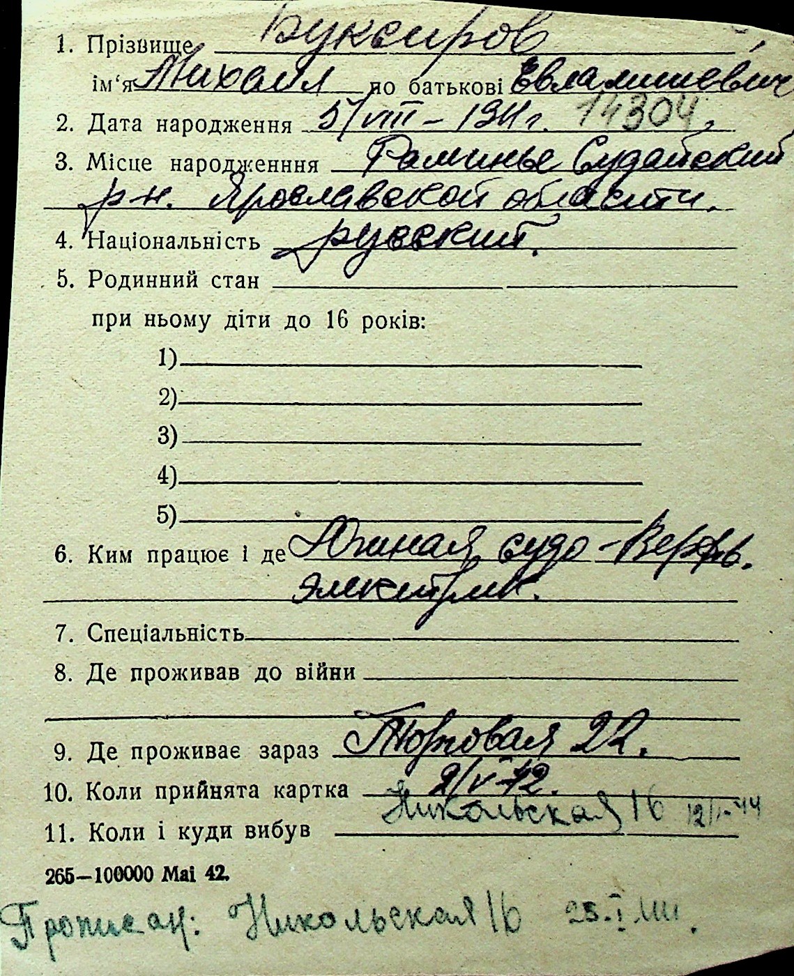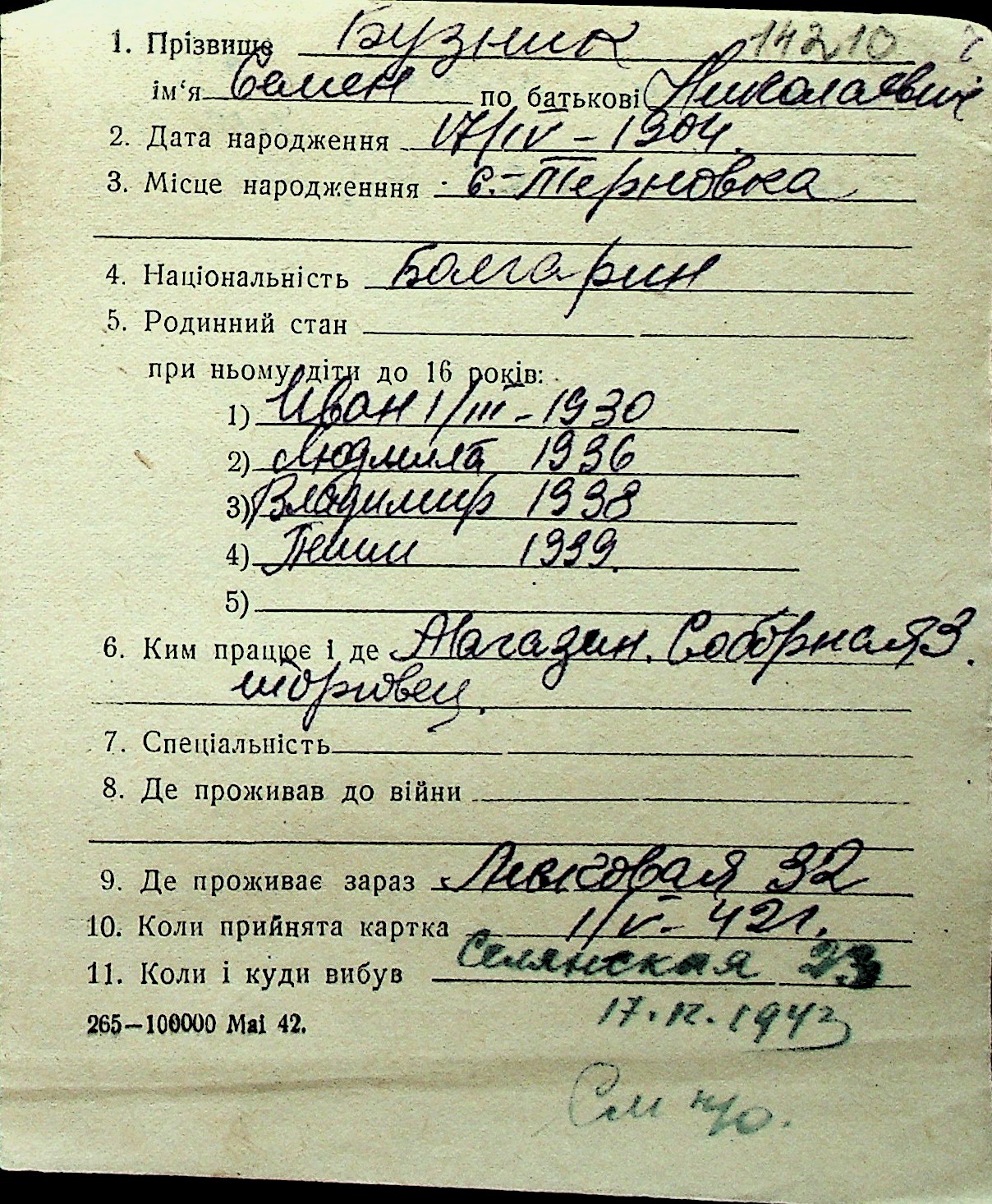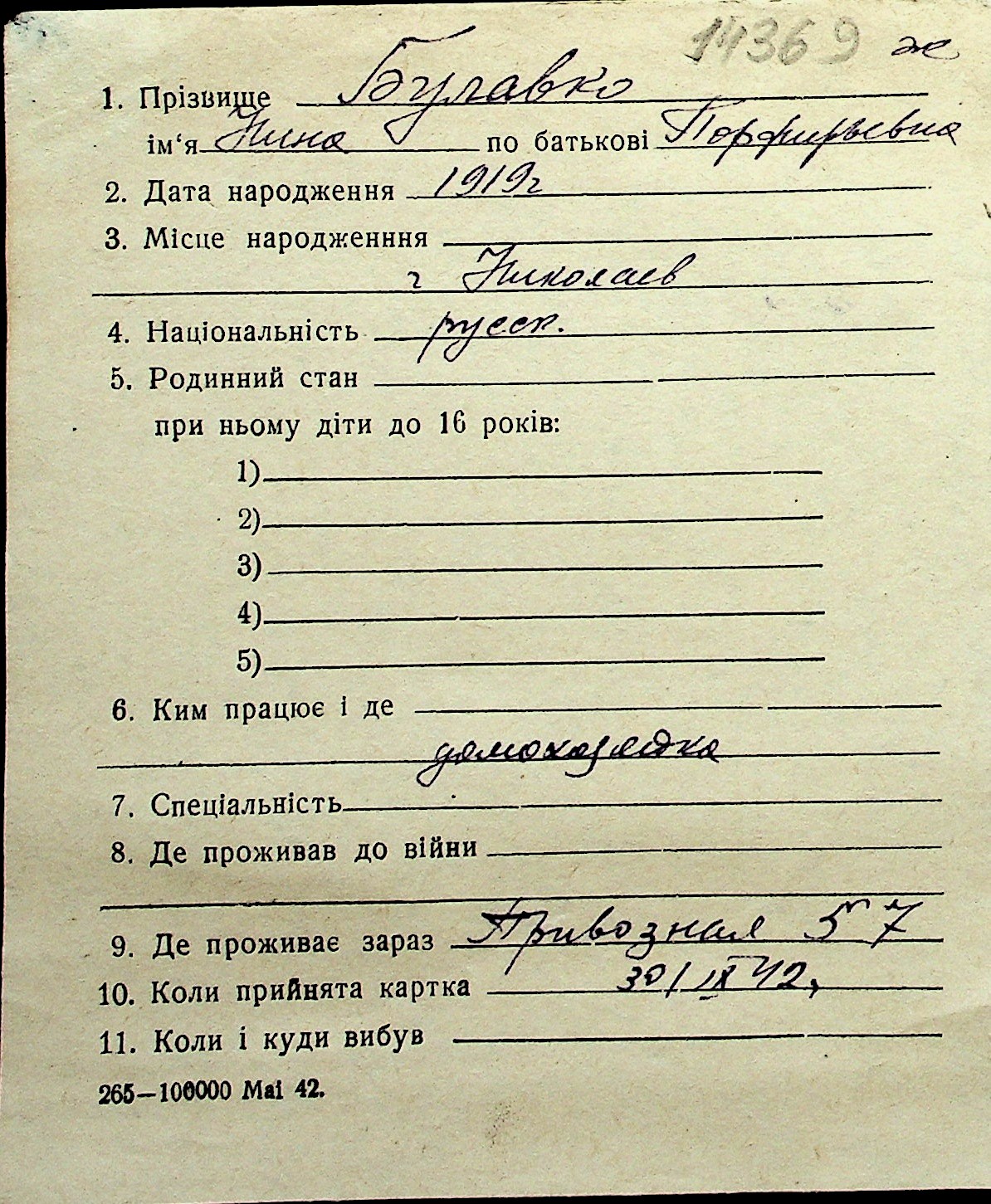 ◦ ◦ Перелік карток на осіб, які мешкали у м. Миколаїв у період окупації 1941–1944 років