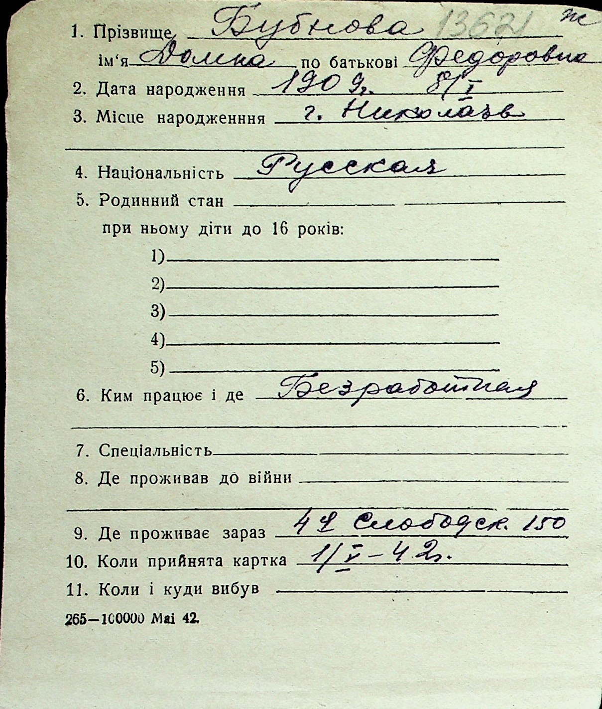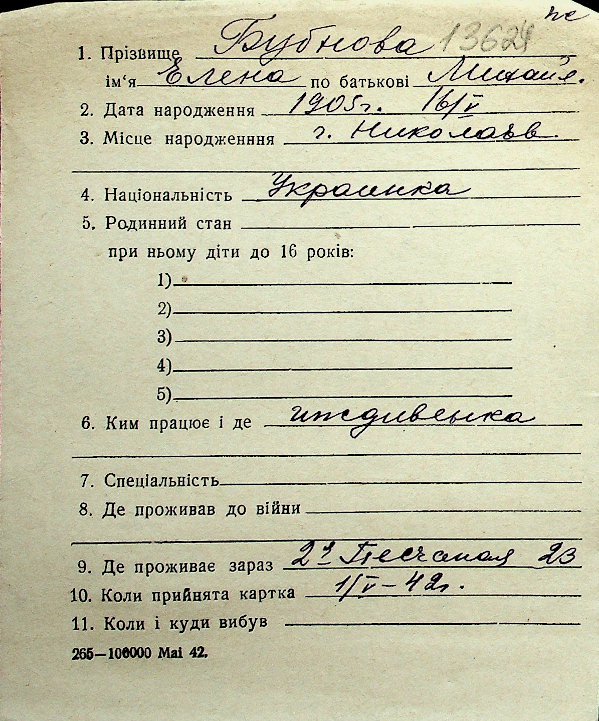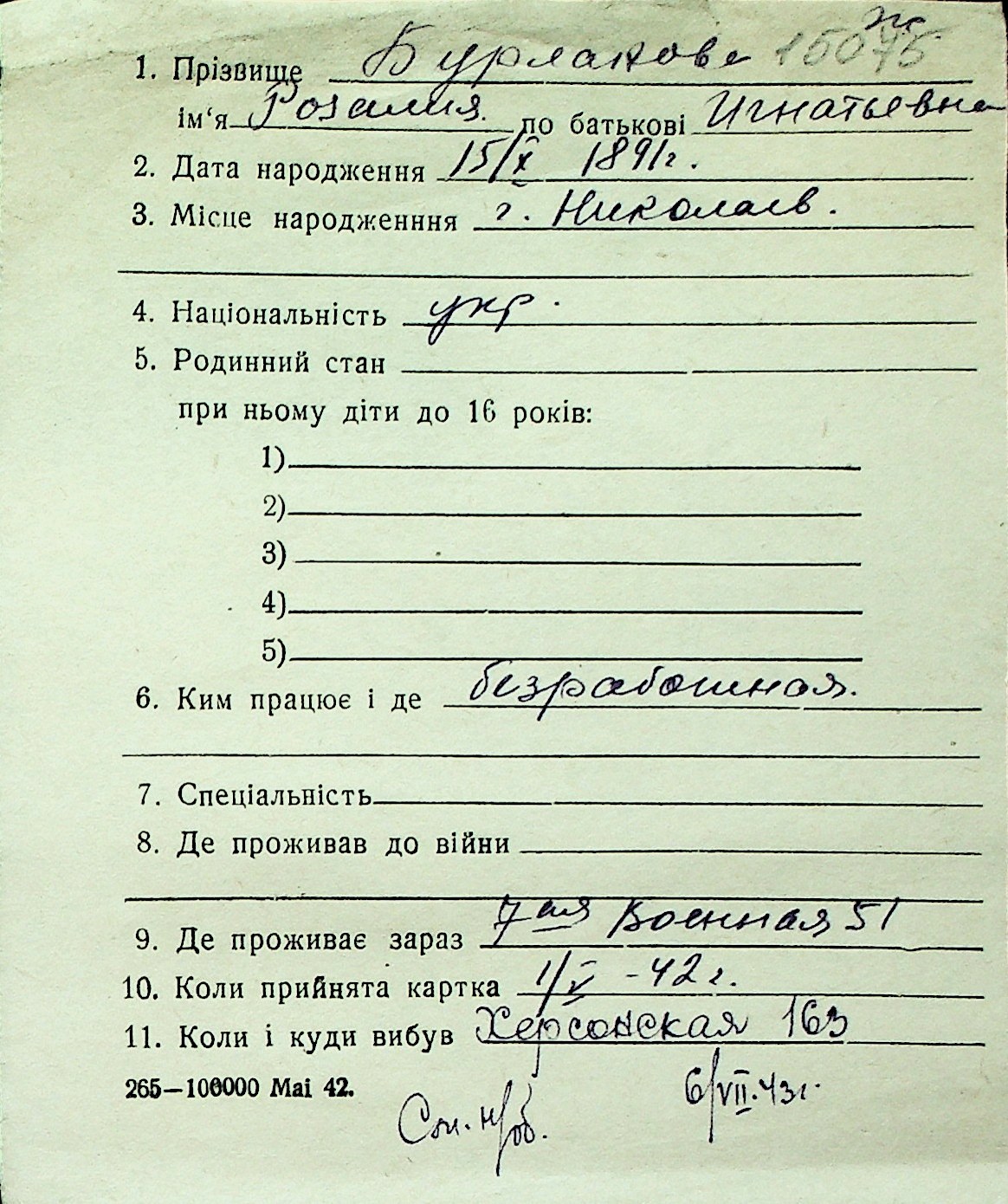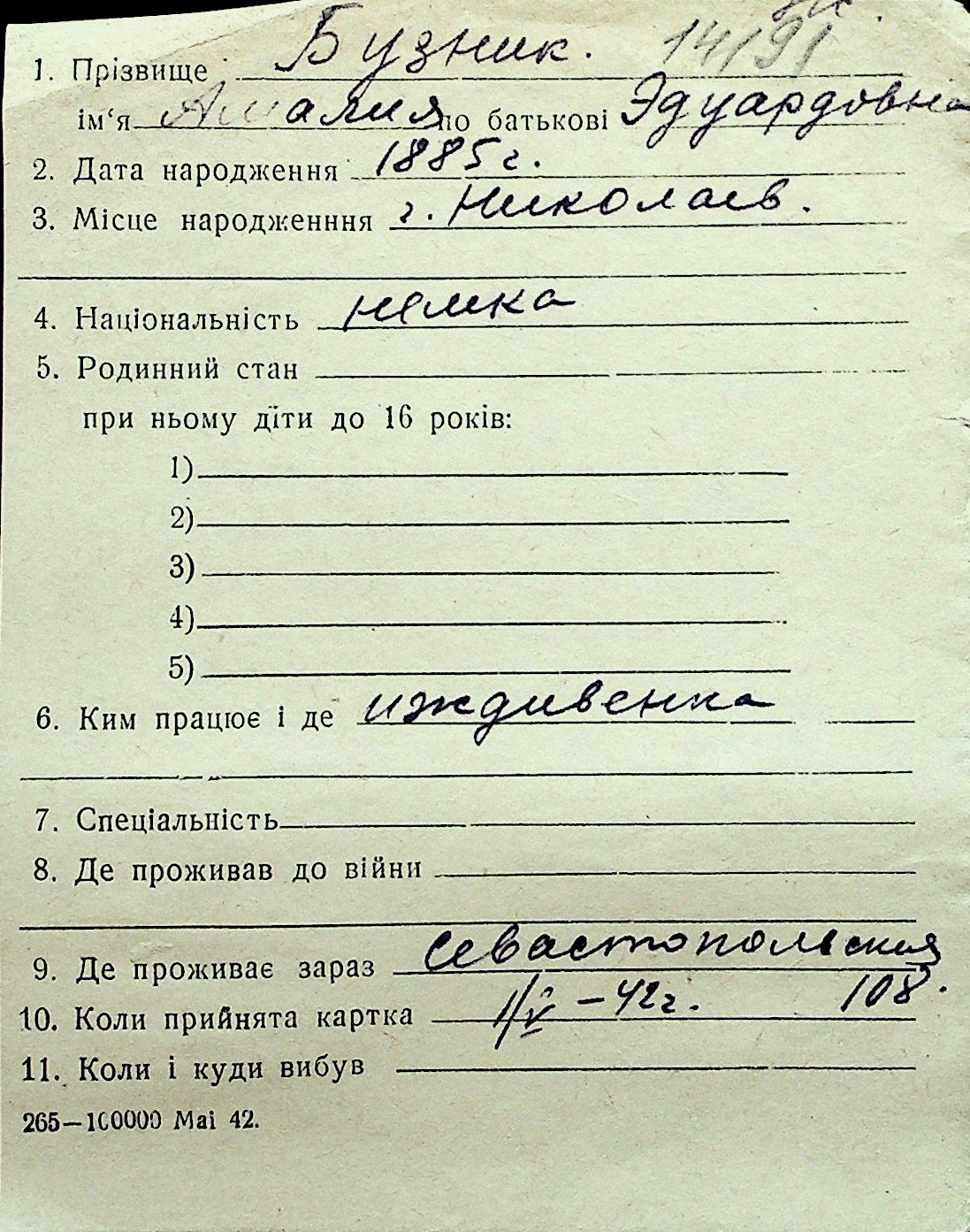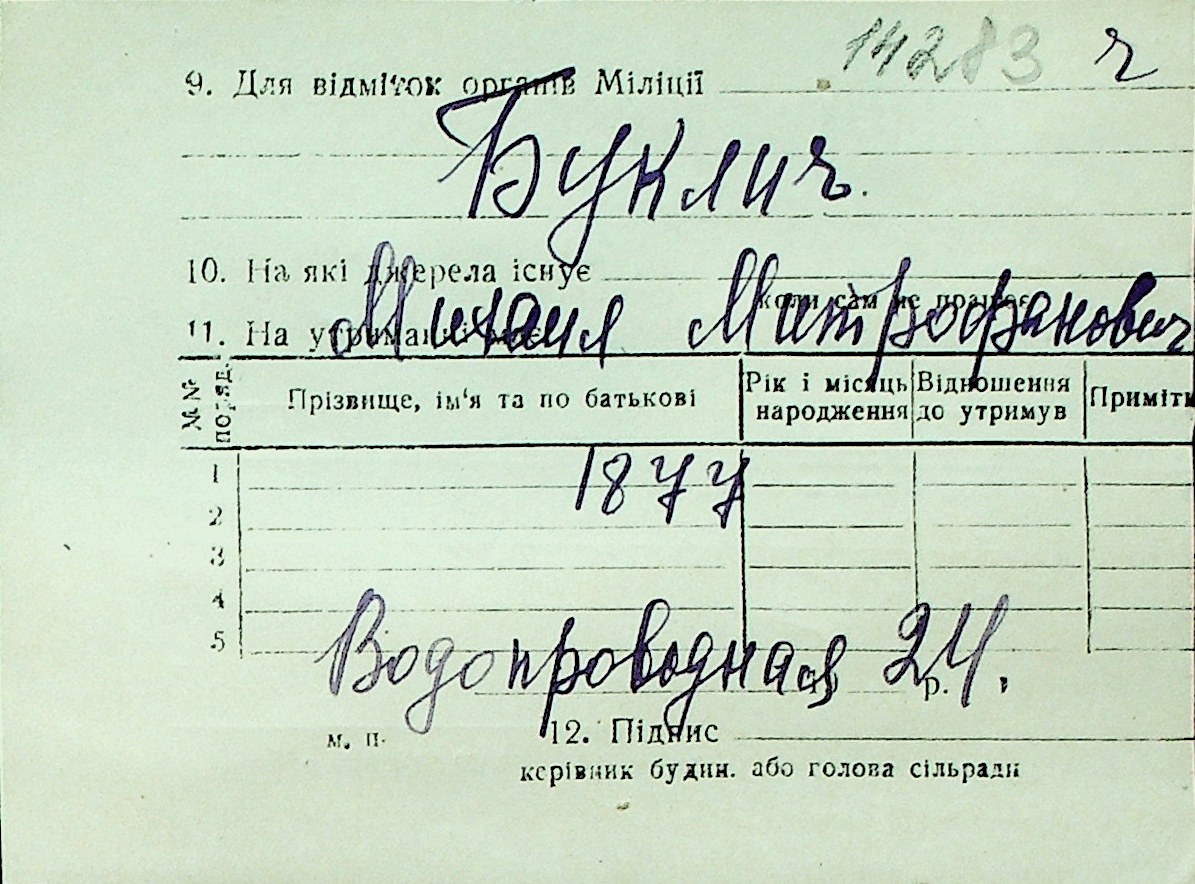 ◦ ◦ Перелік карток на осіб, які мешкали у м. Миколаїв у період окупації 1941–1944 років