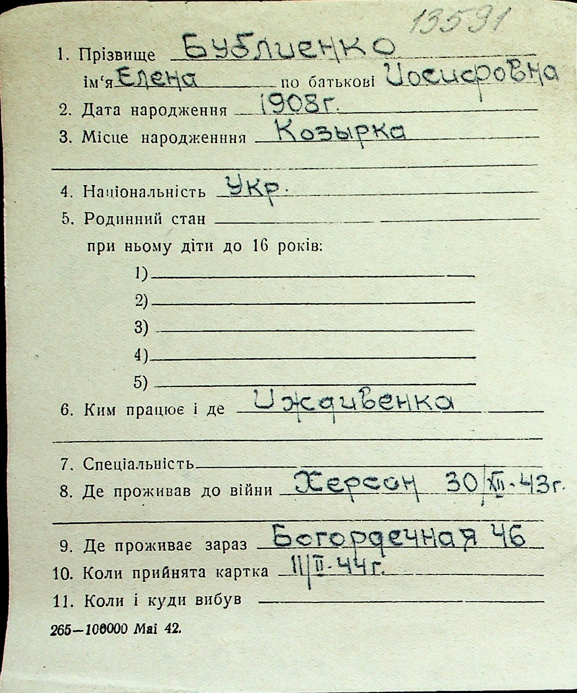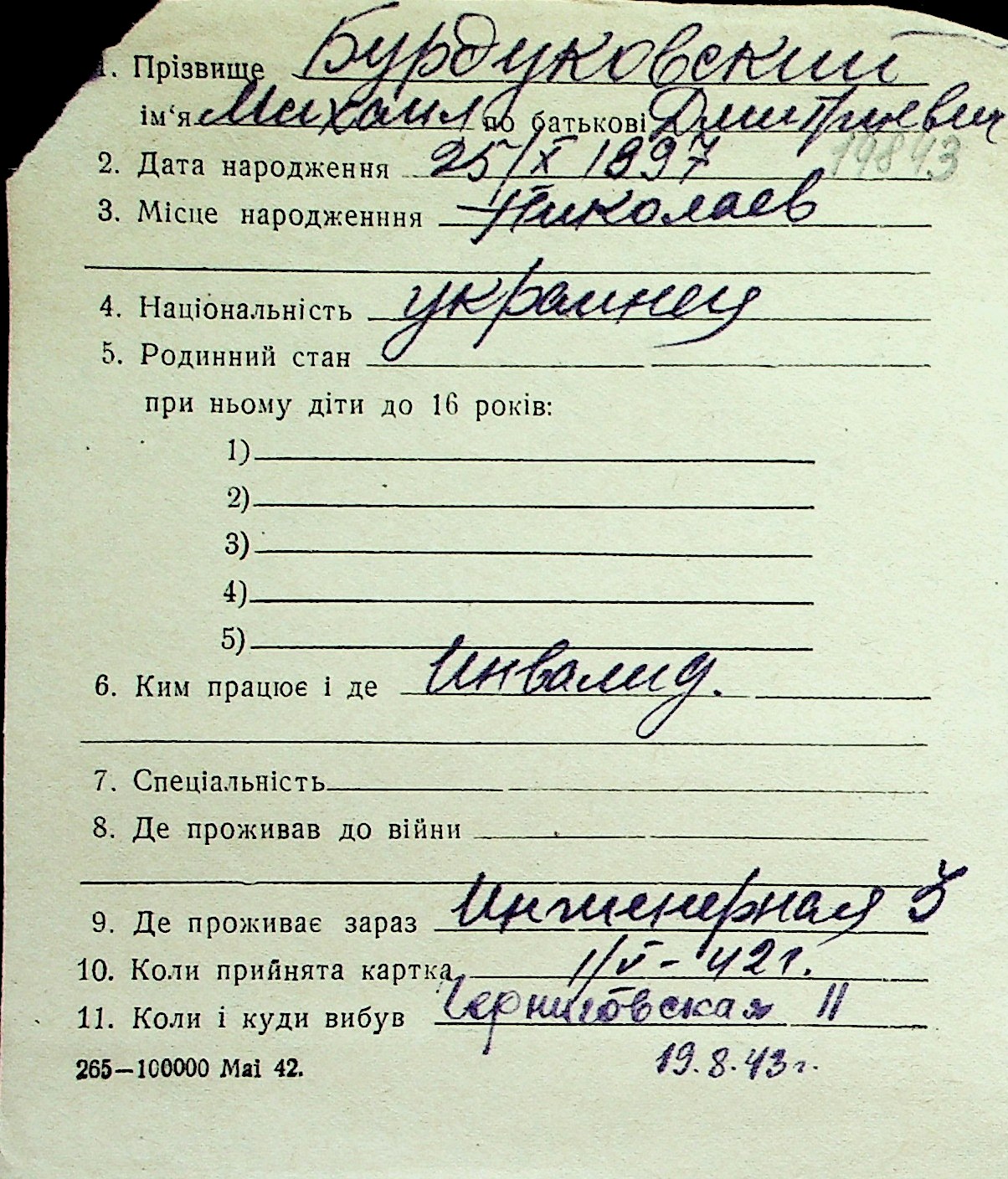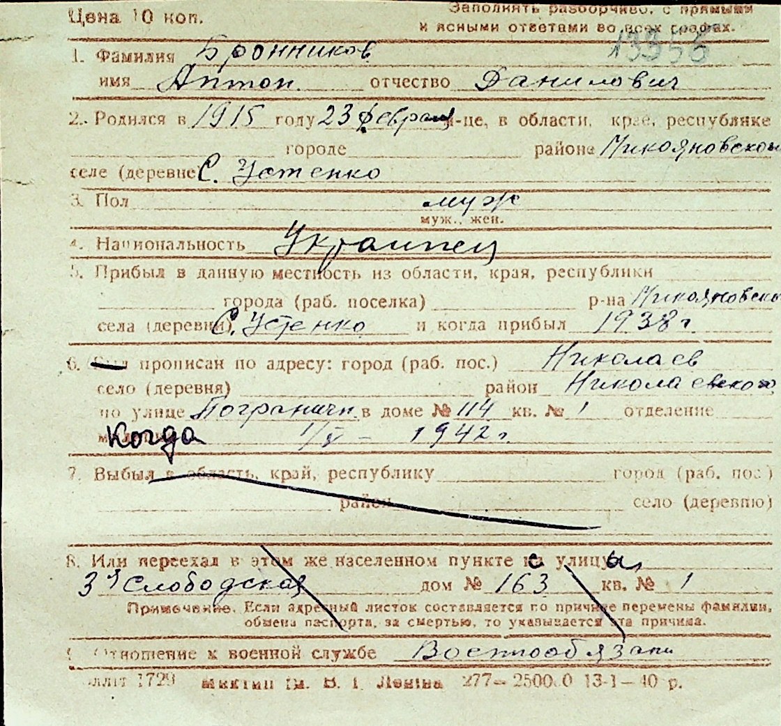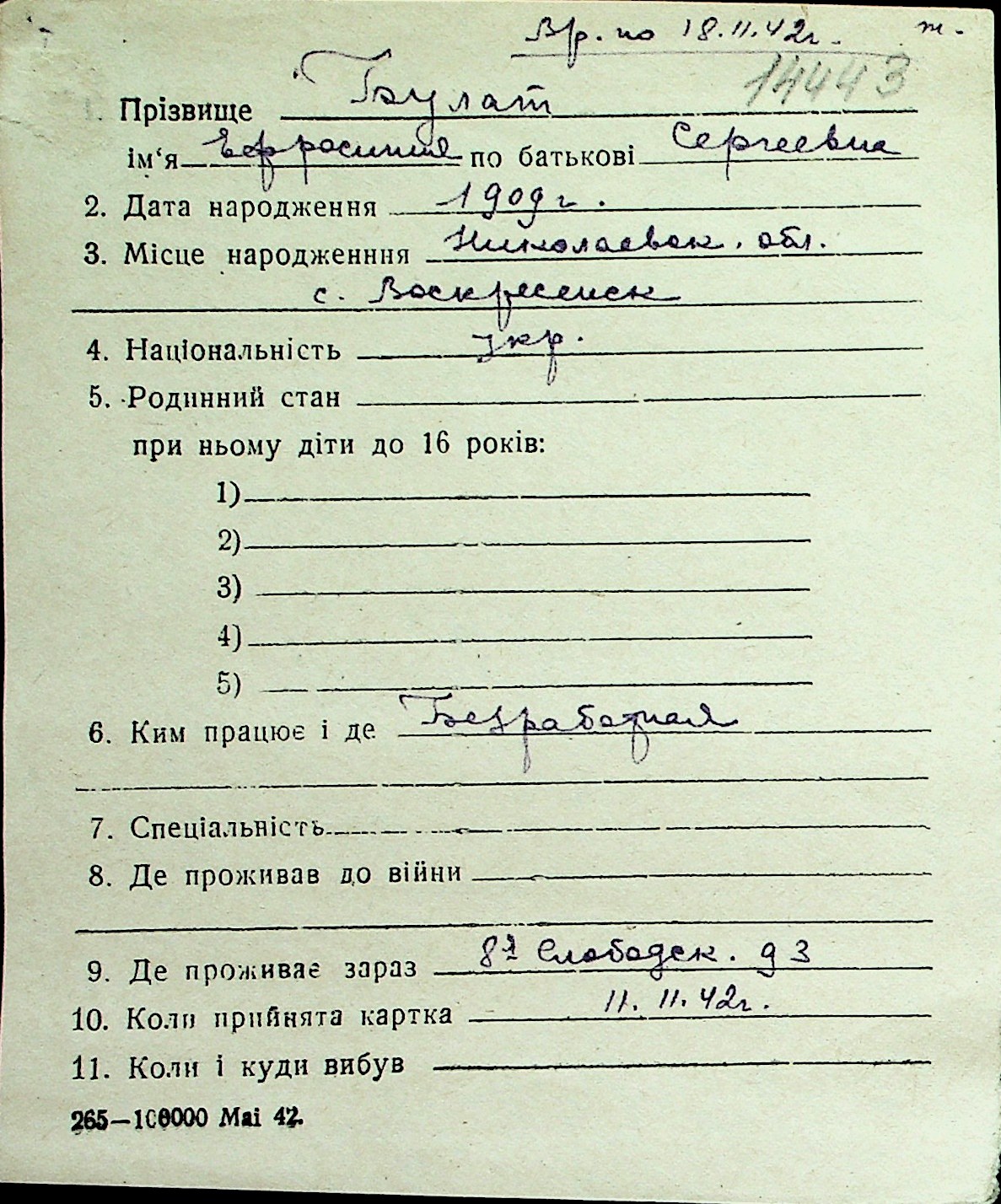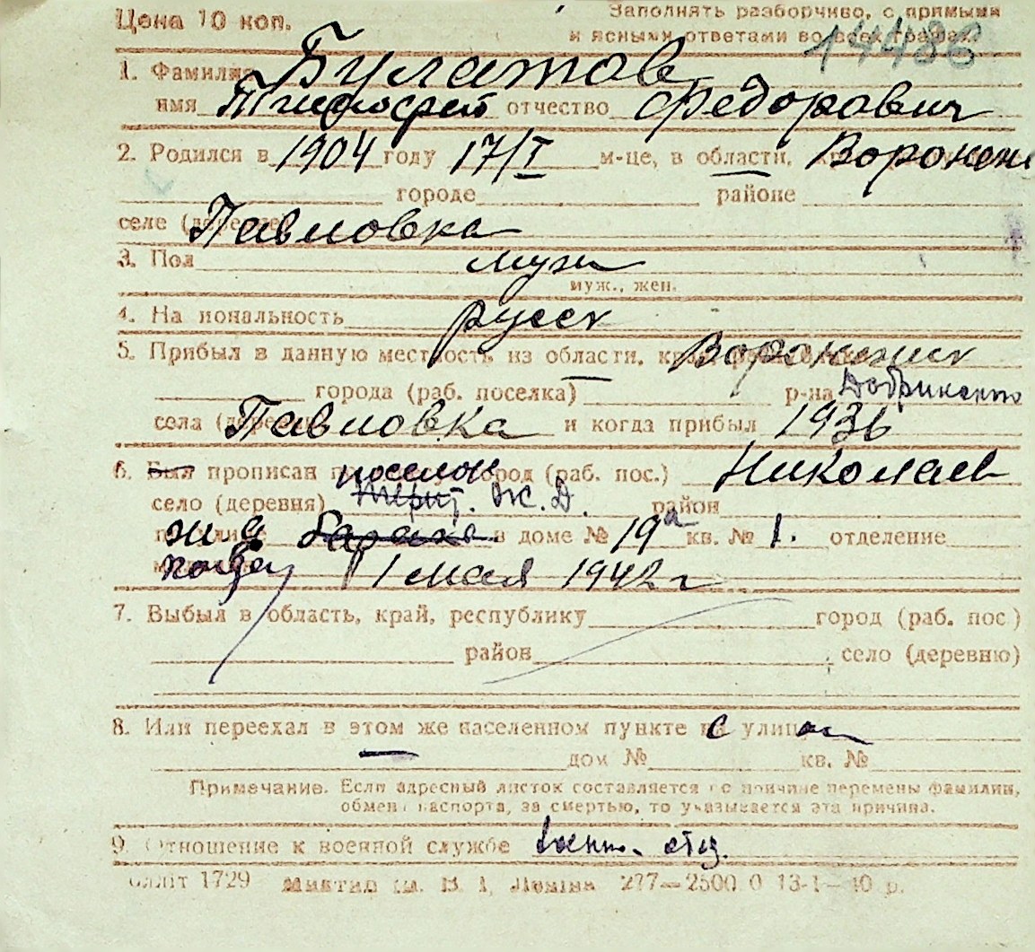 ◦ ◦ Перелік карток на осіб, які мешкали у м. Миколаїв у період окупації 1941–1944 років