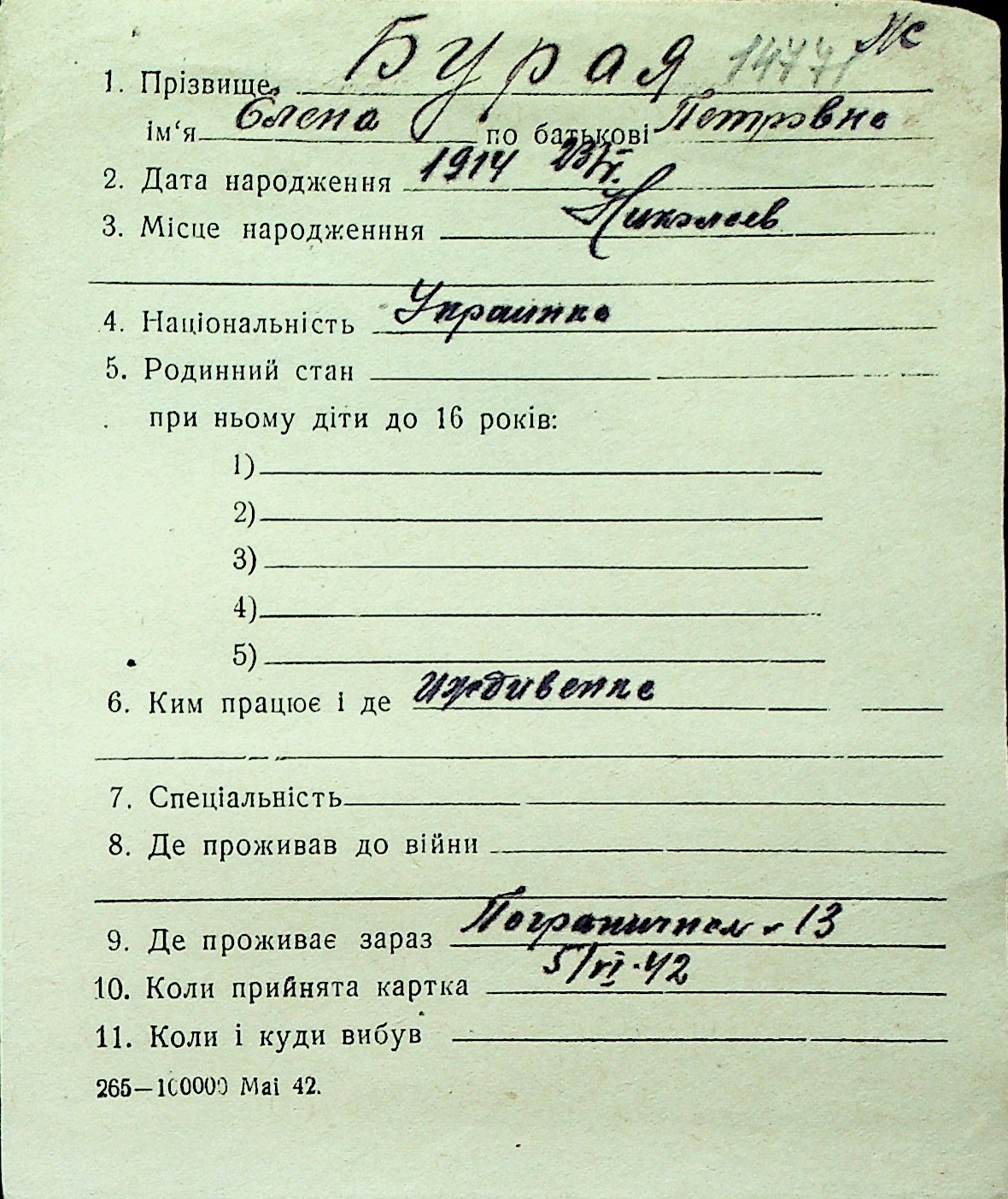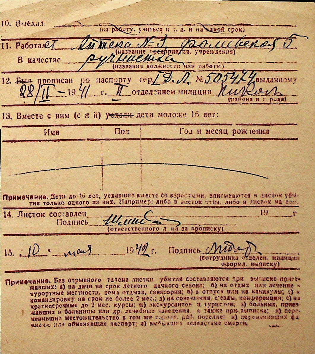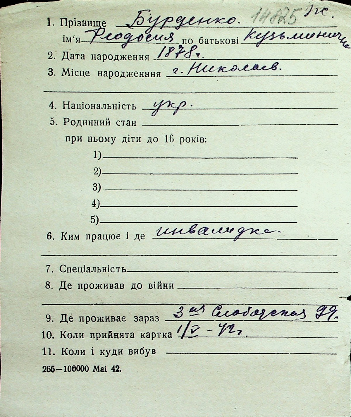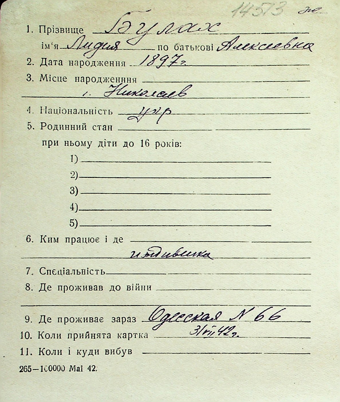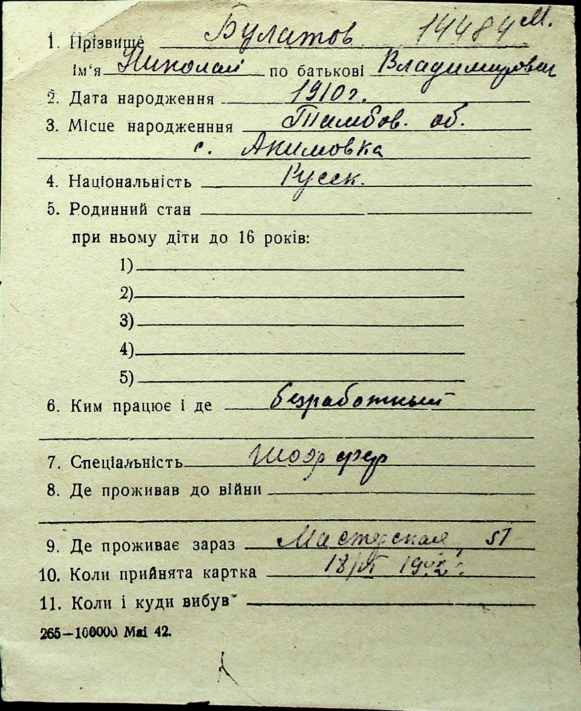 ◦ ◦ Перелік карток на осіб, які мешкали у м. Миколаїв у період окупації 1941–1944 років