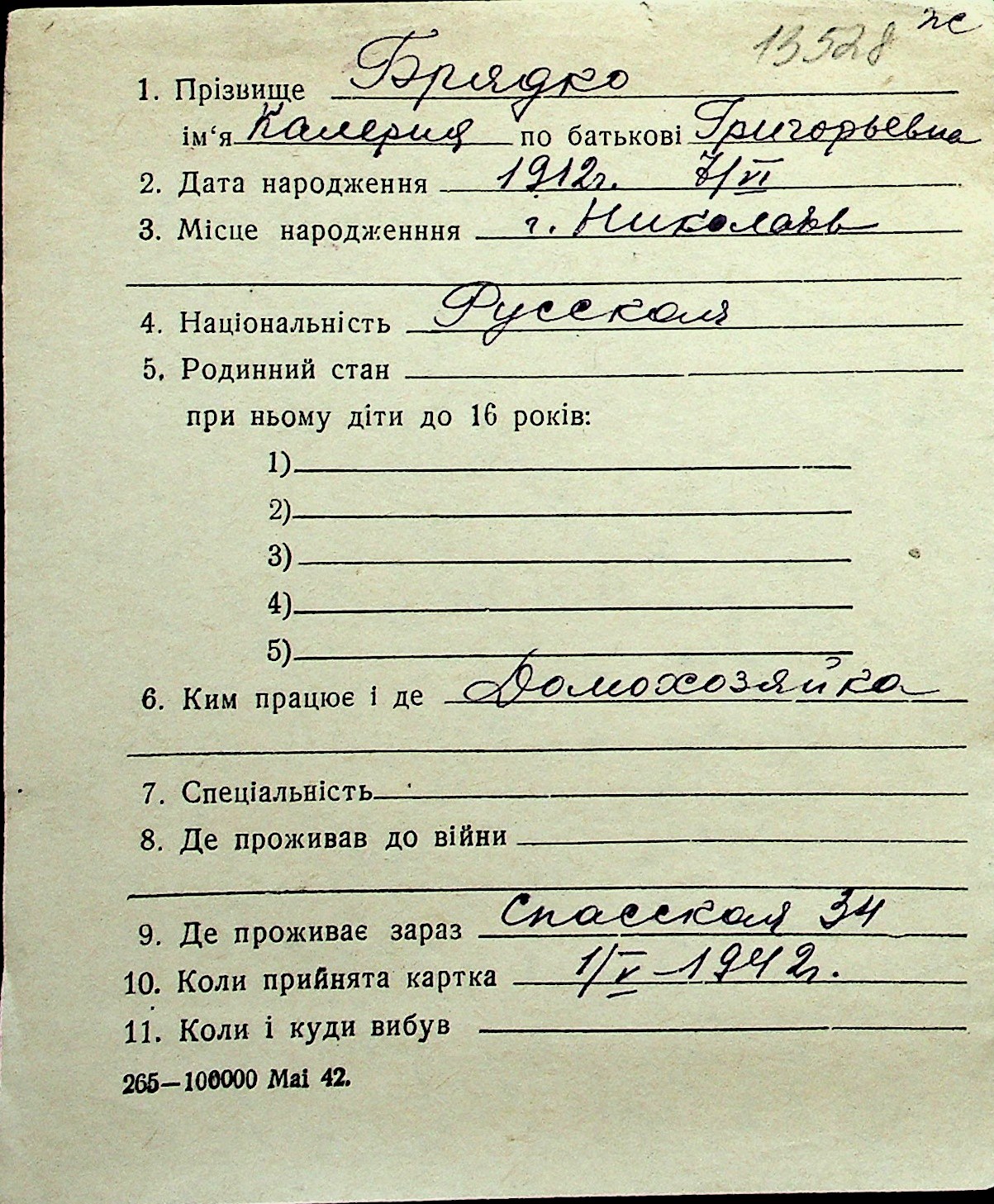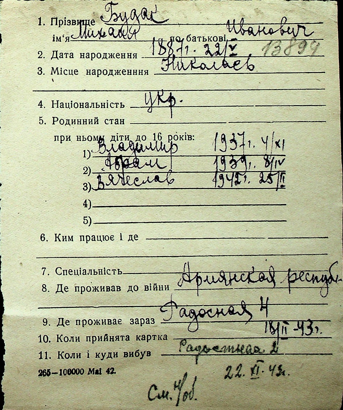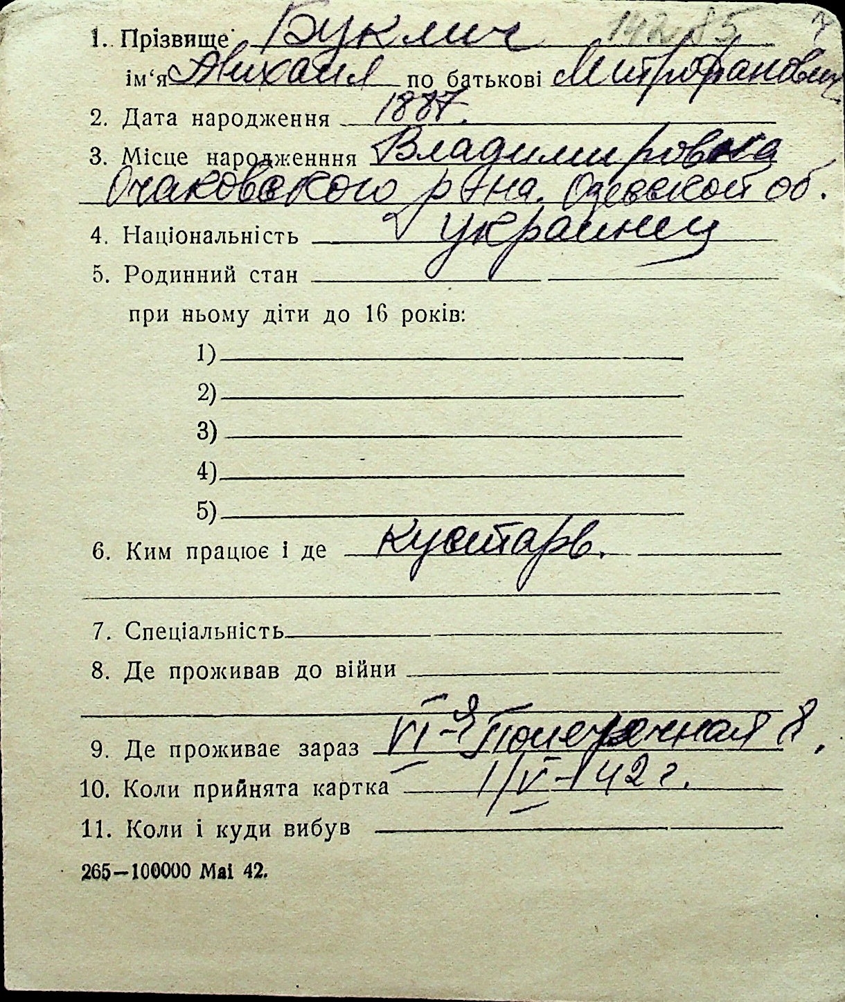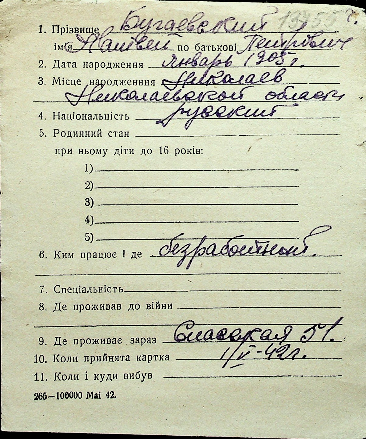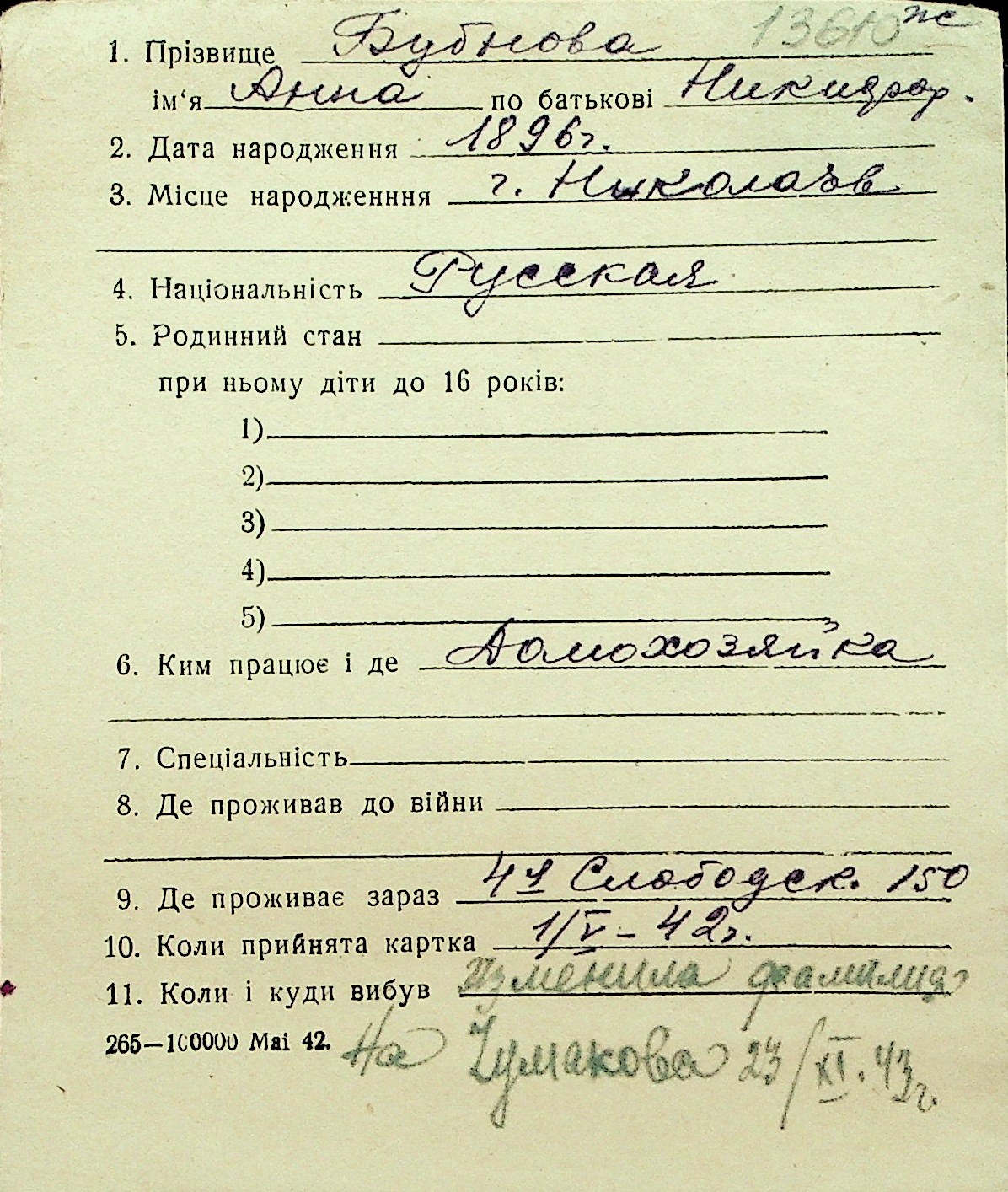◦ ◦ Перелік карток на осіб, які мешкали у м. Миколаїв у період окупації 1941–1944 років