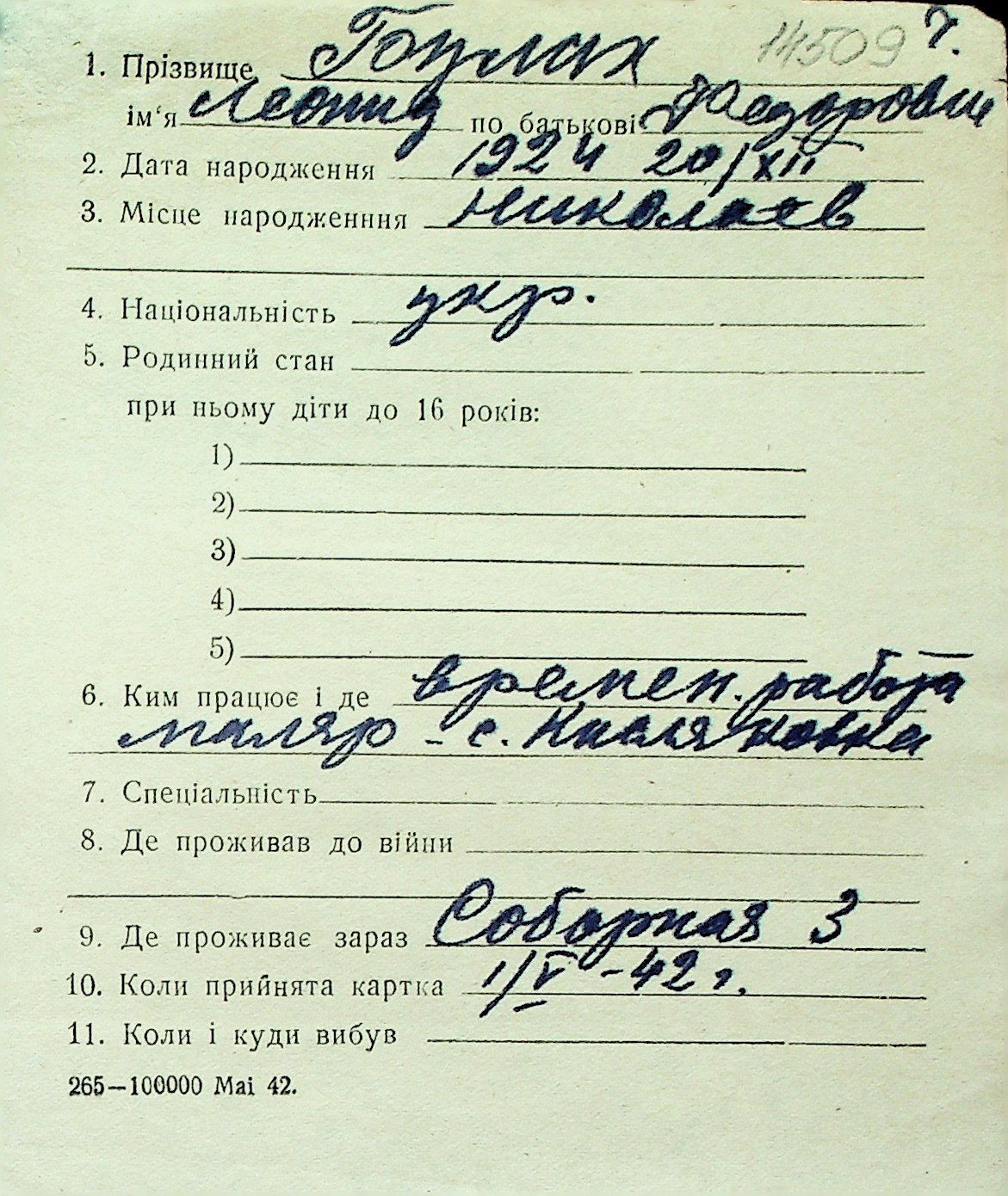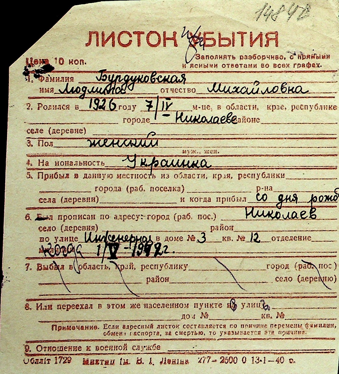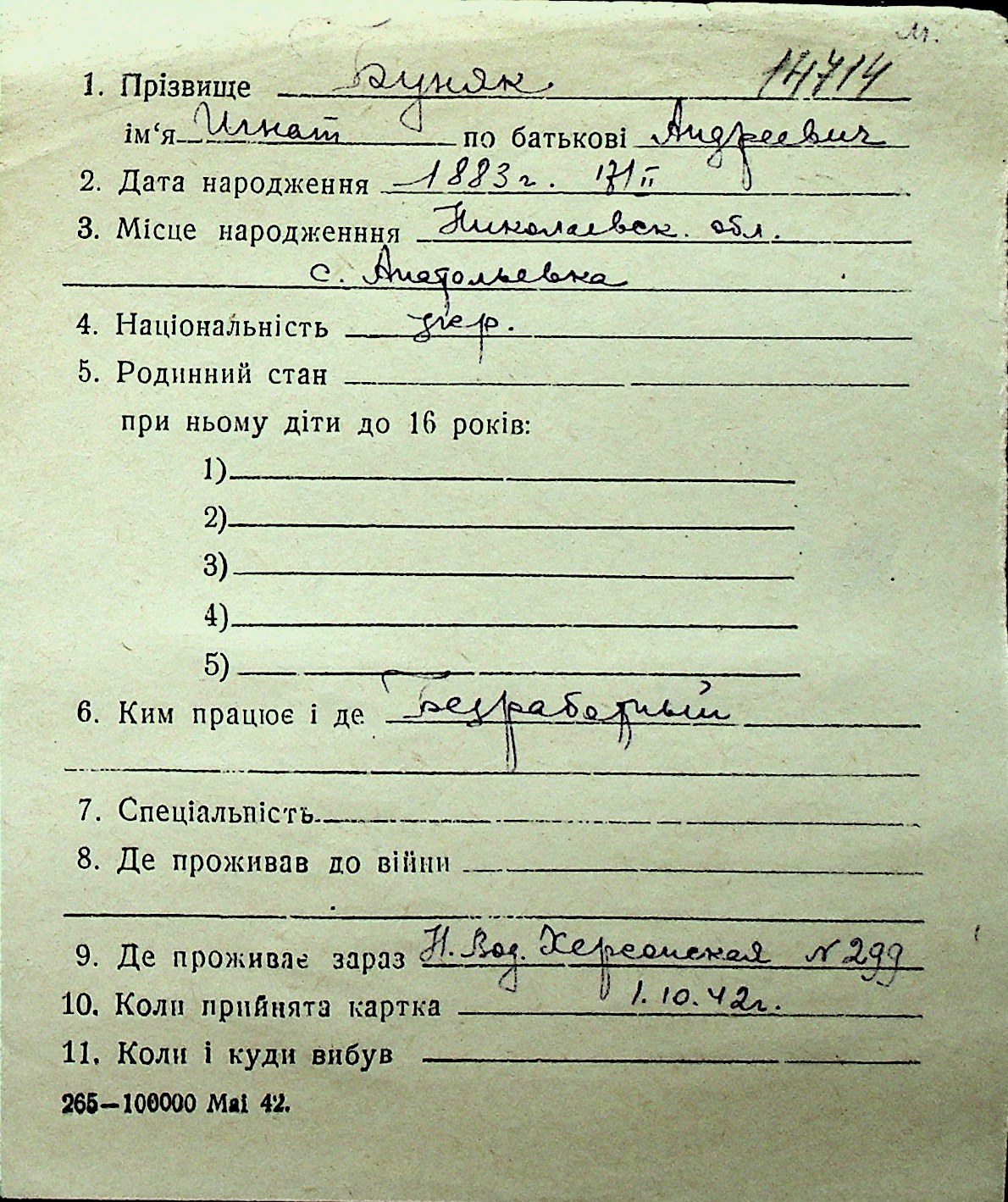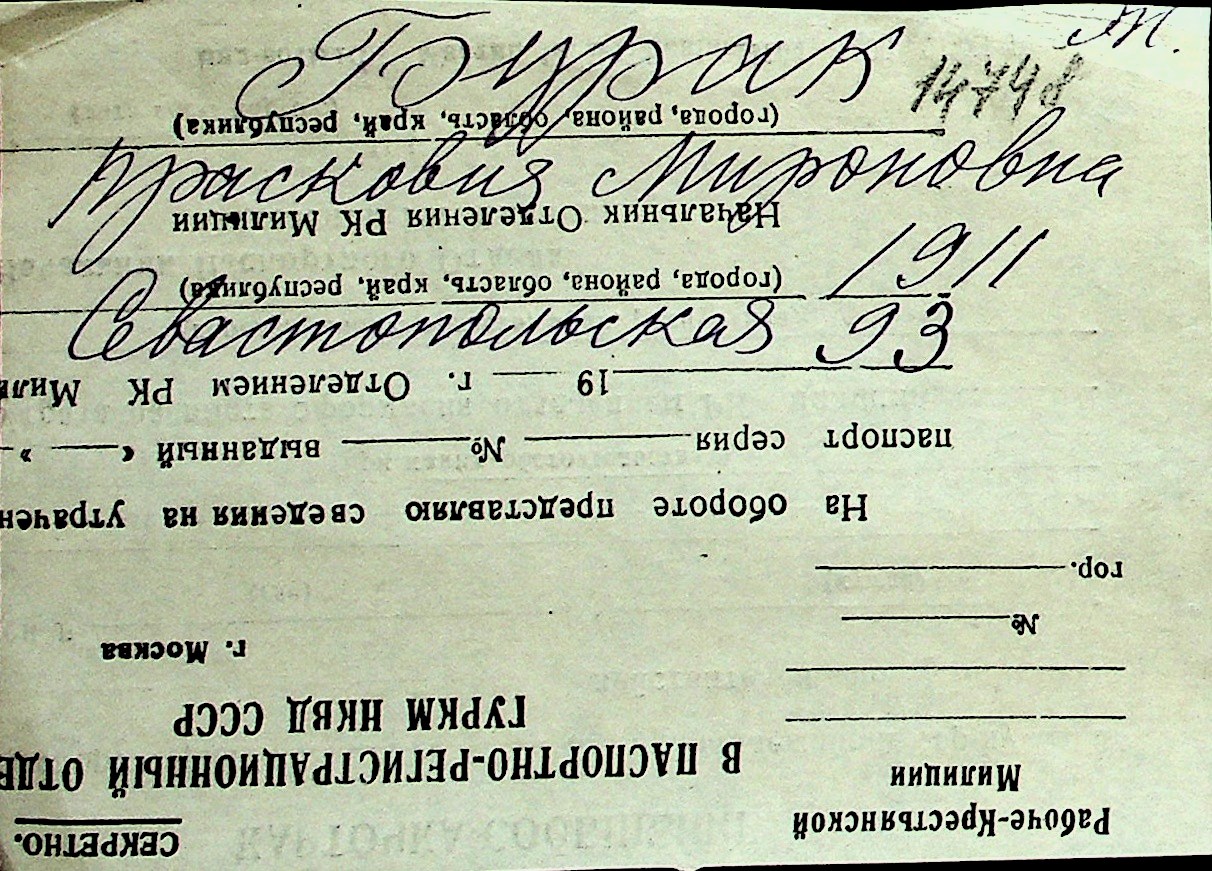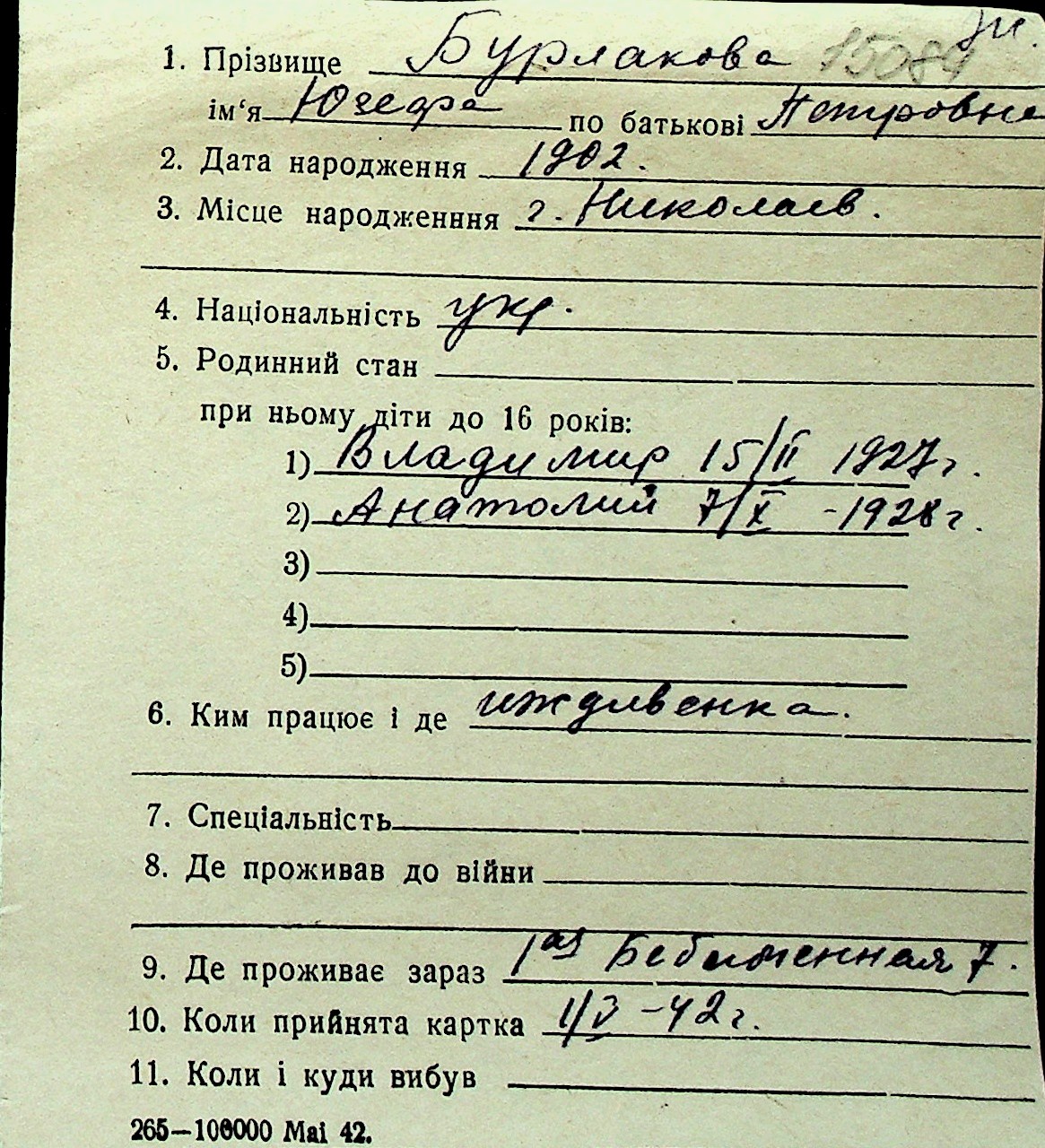 ◦ ◦ Перелік карток на осіб, які мешкали у м. Миколаїв у період окупації 1941–1944 років