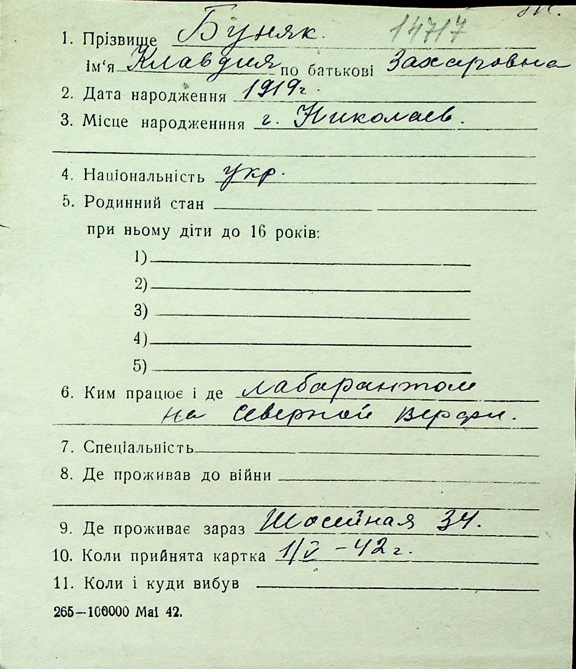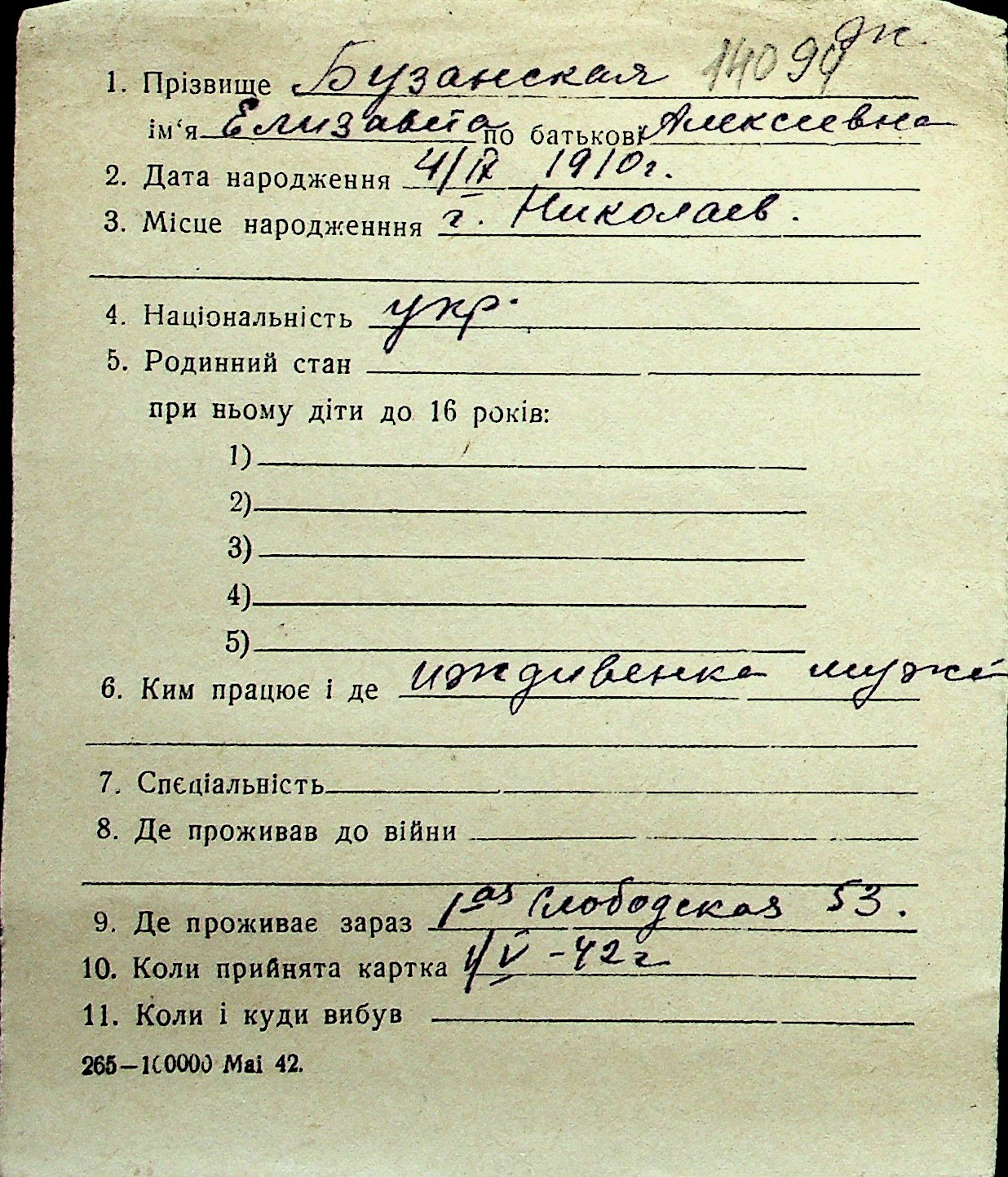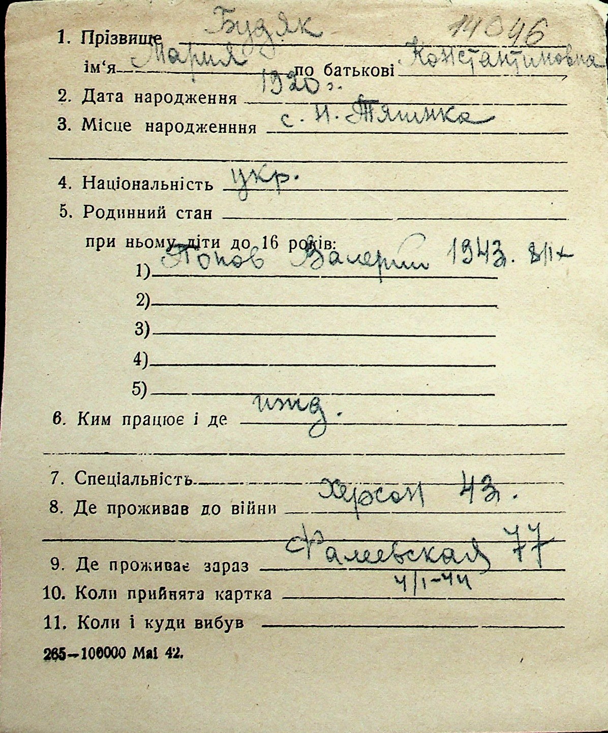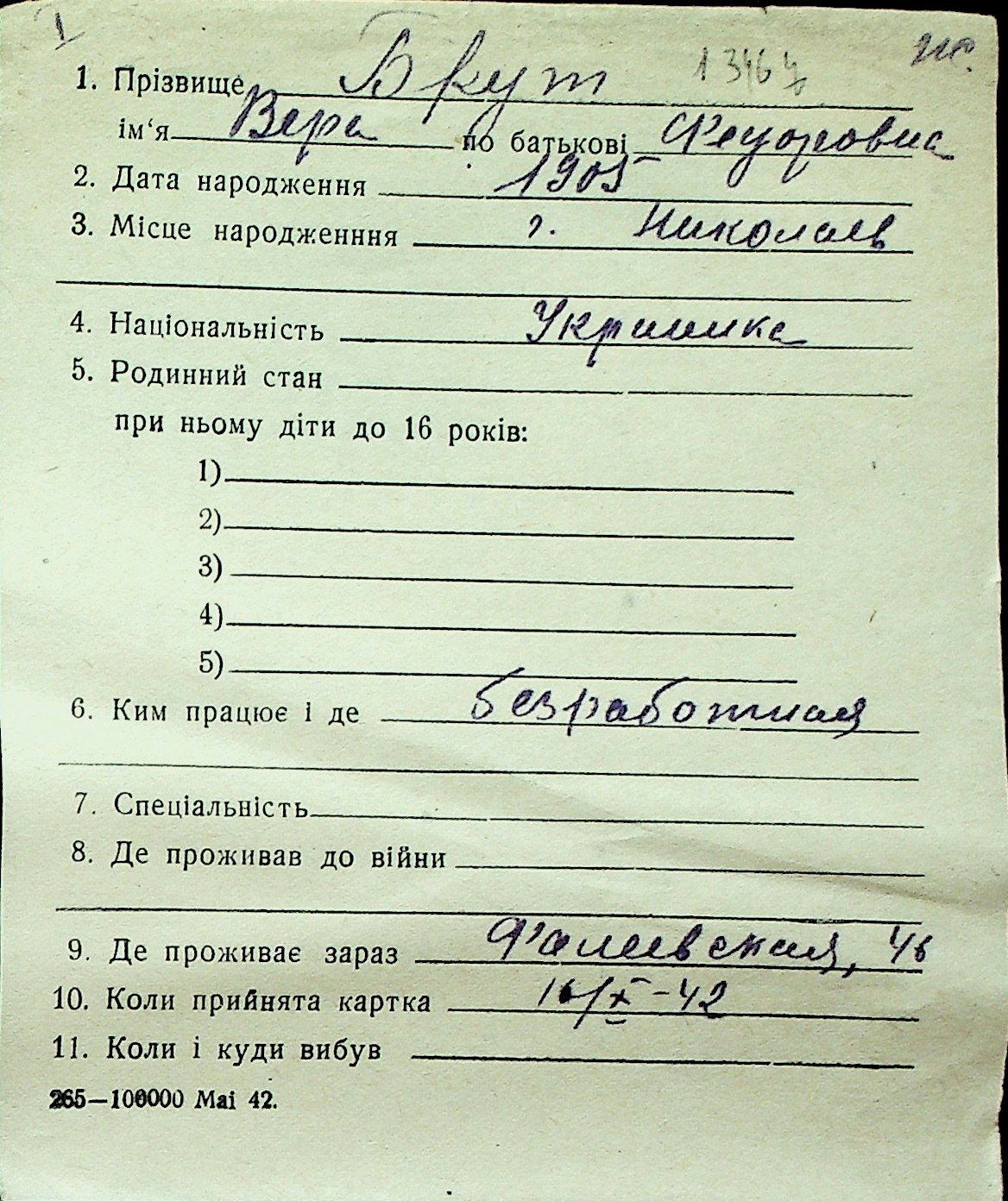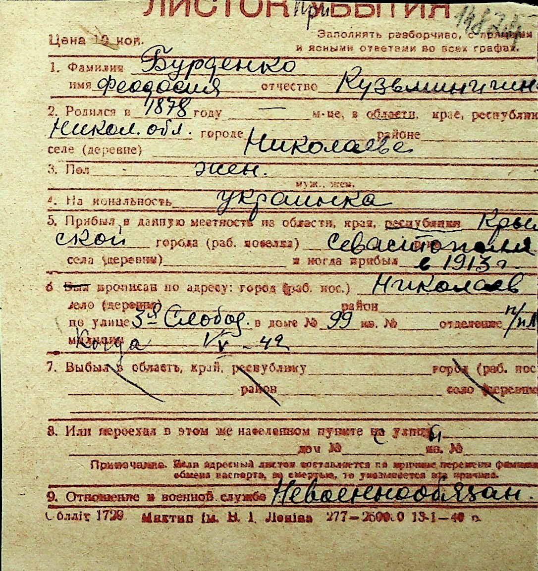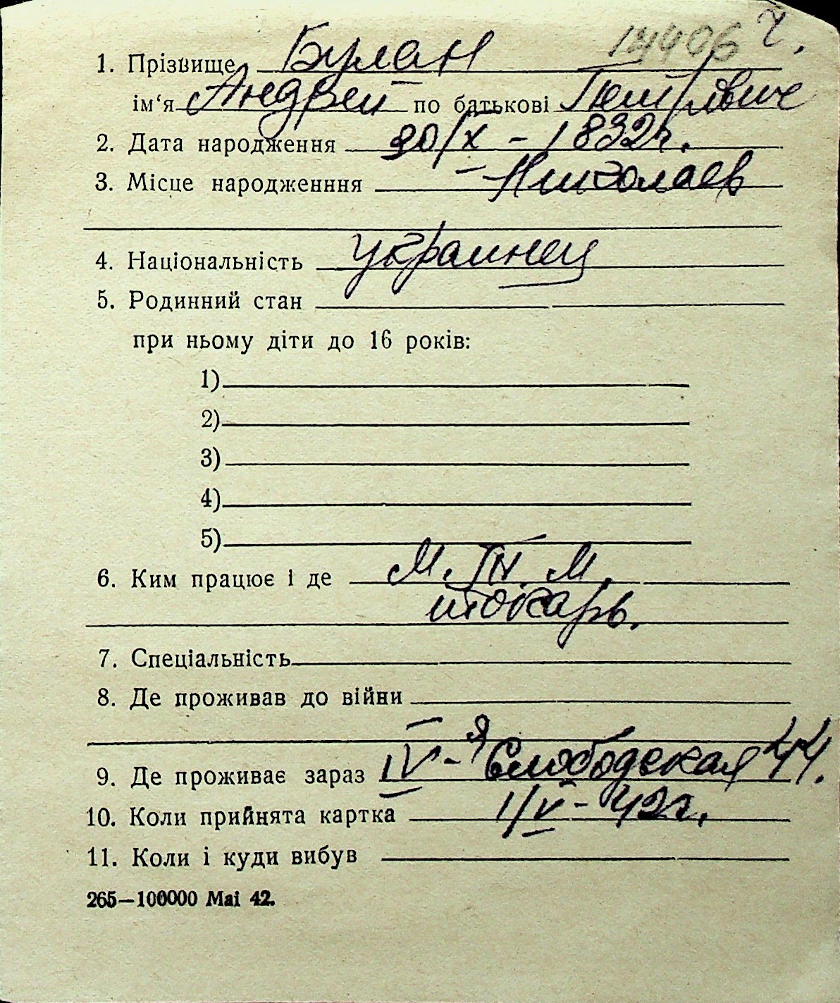 ◦ ◦ Перелік карток на осіб, які мешкали у м. Миколаїв у період окупації 1941–1944 років