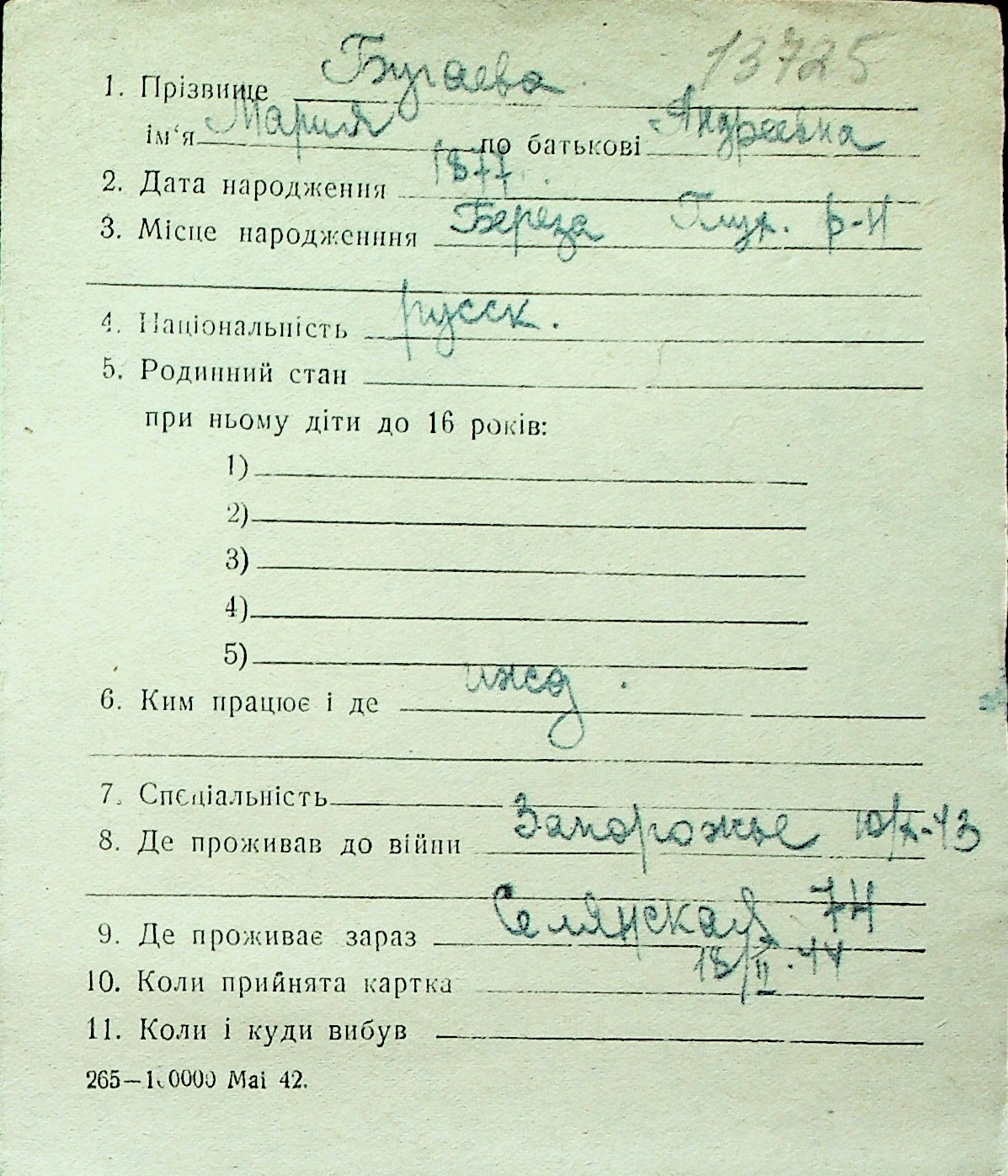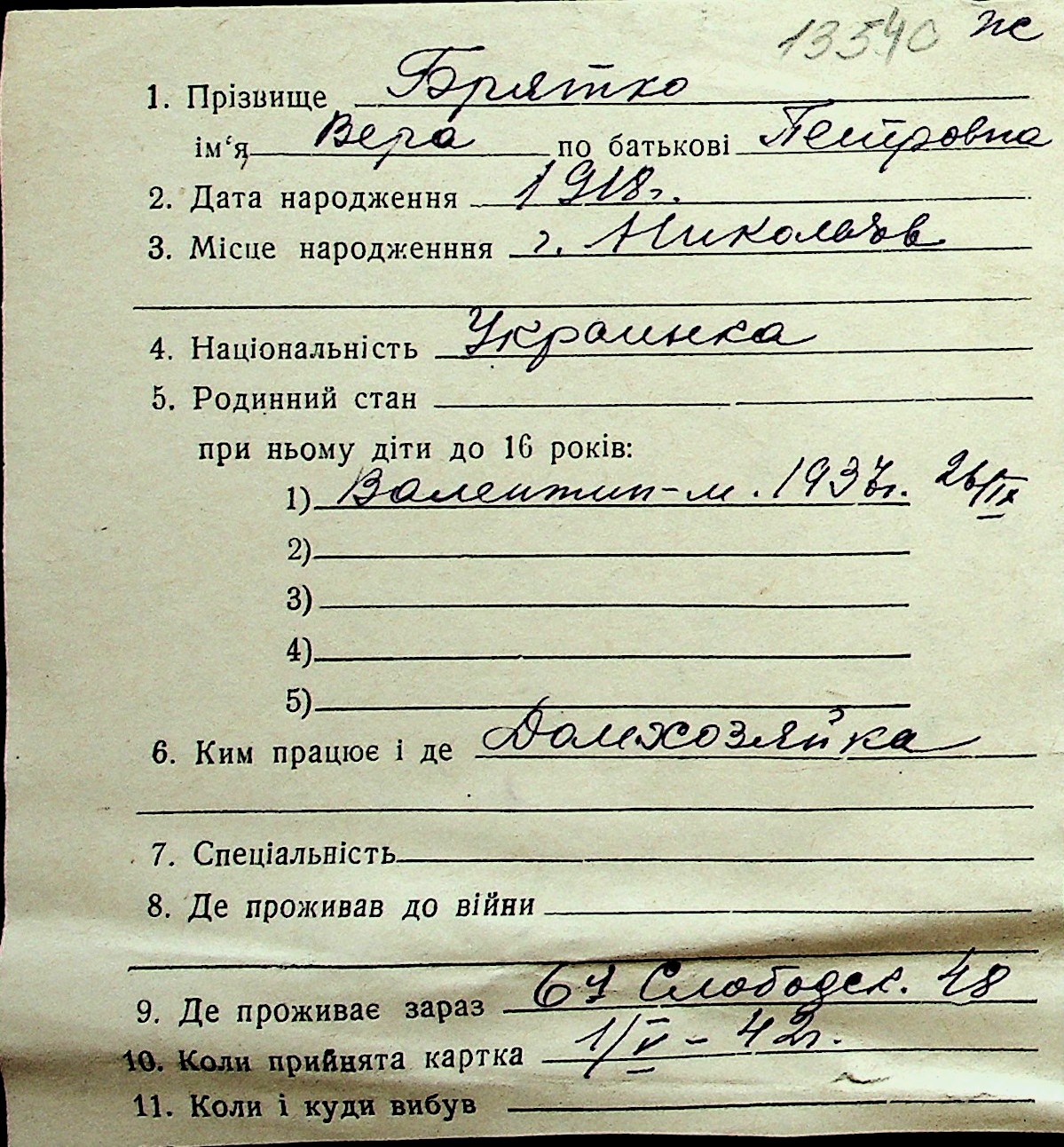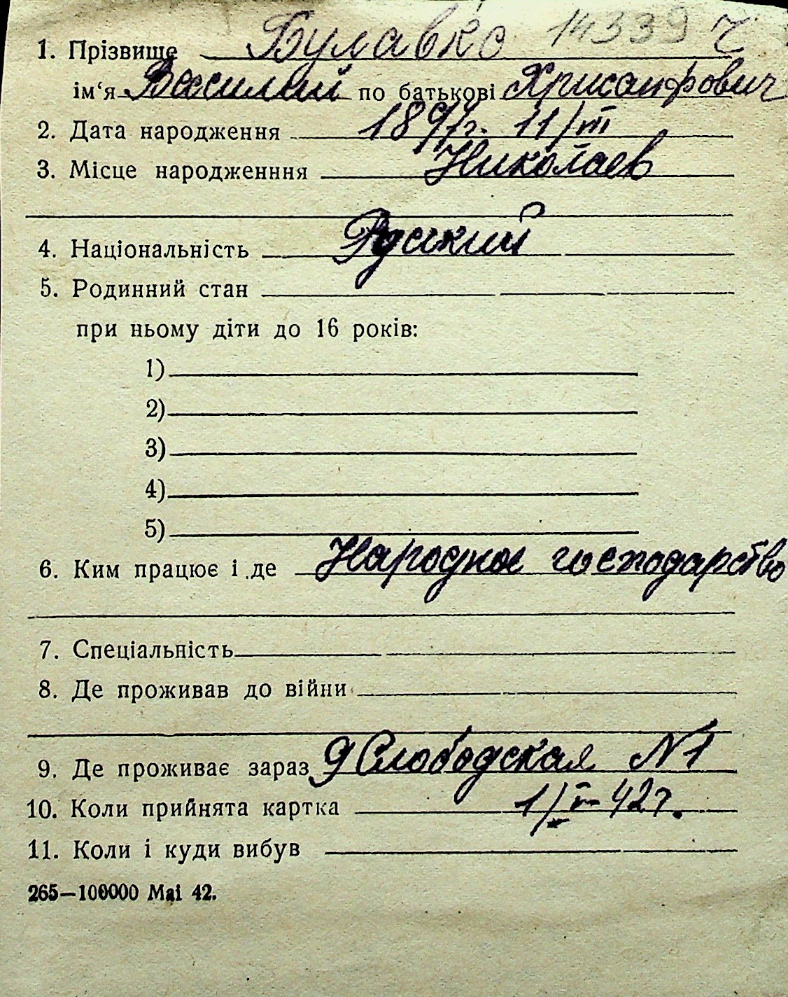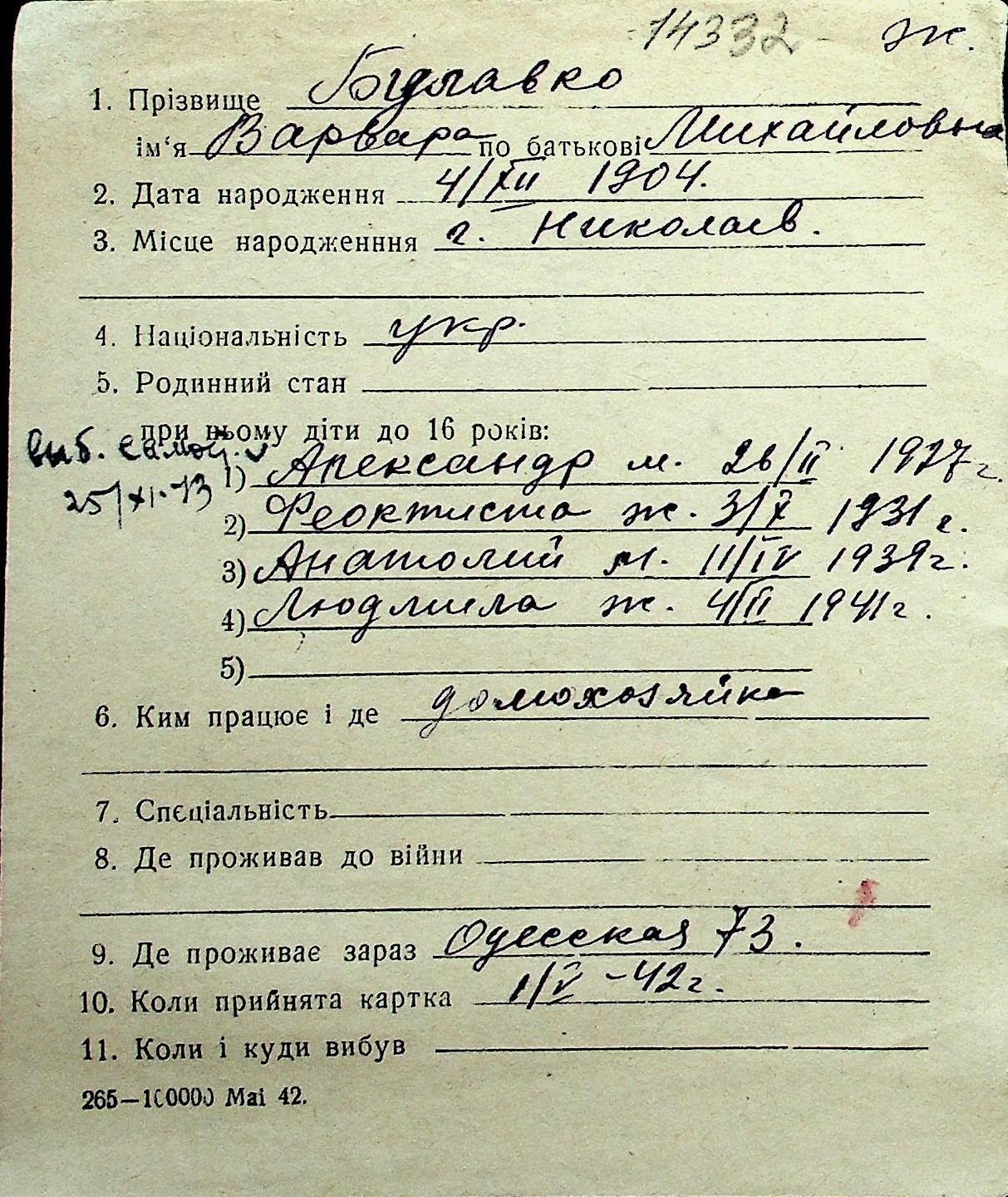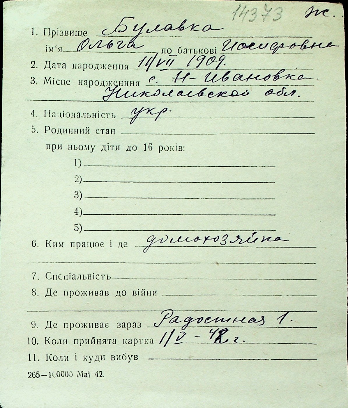 ◦ ◦ Перелік карток на осіб, які мешкали у м. Миколаїв у період окупації 1941–1944 років