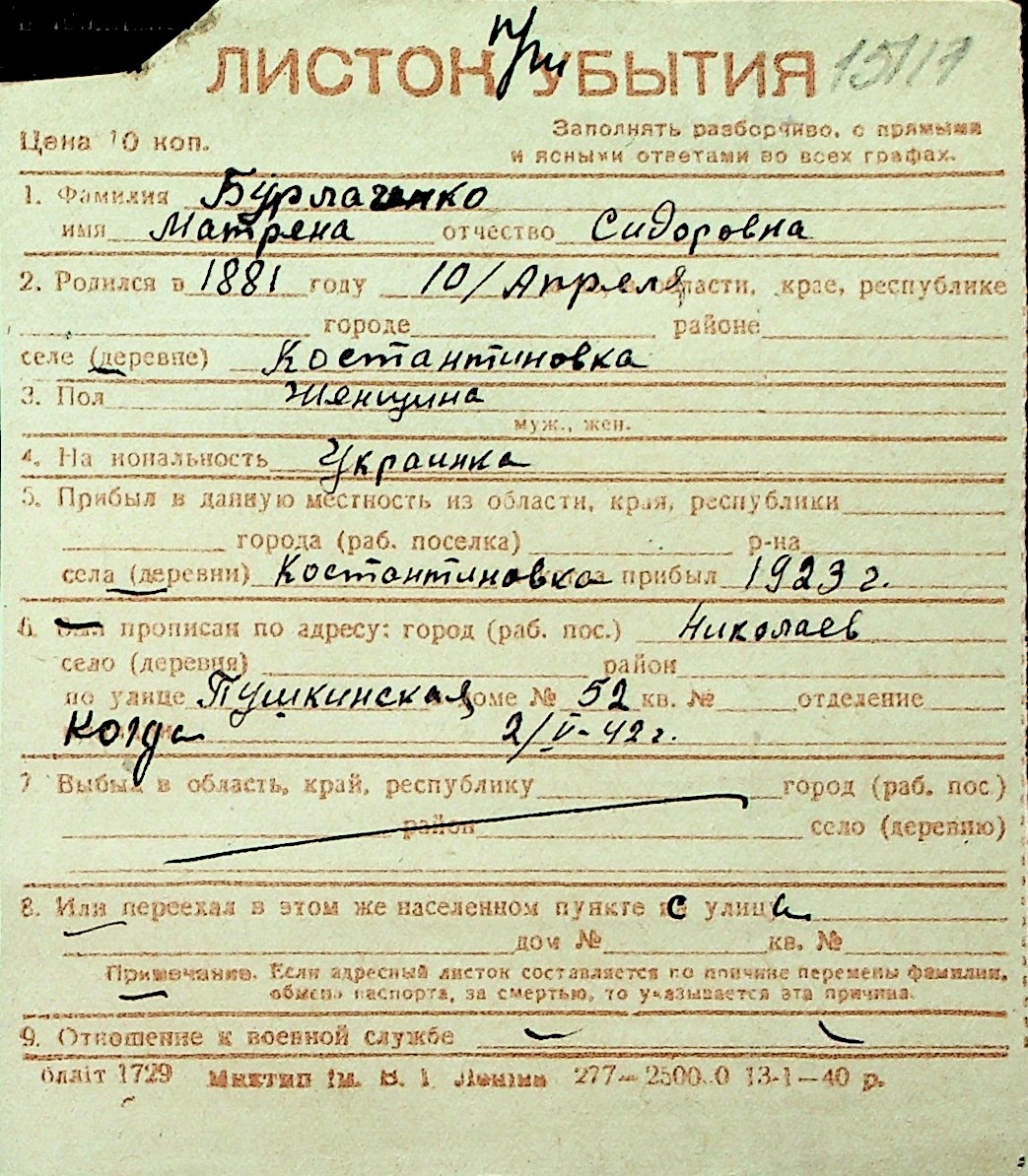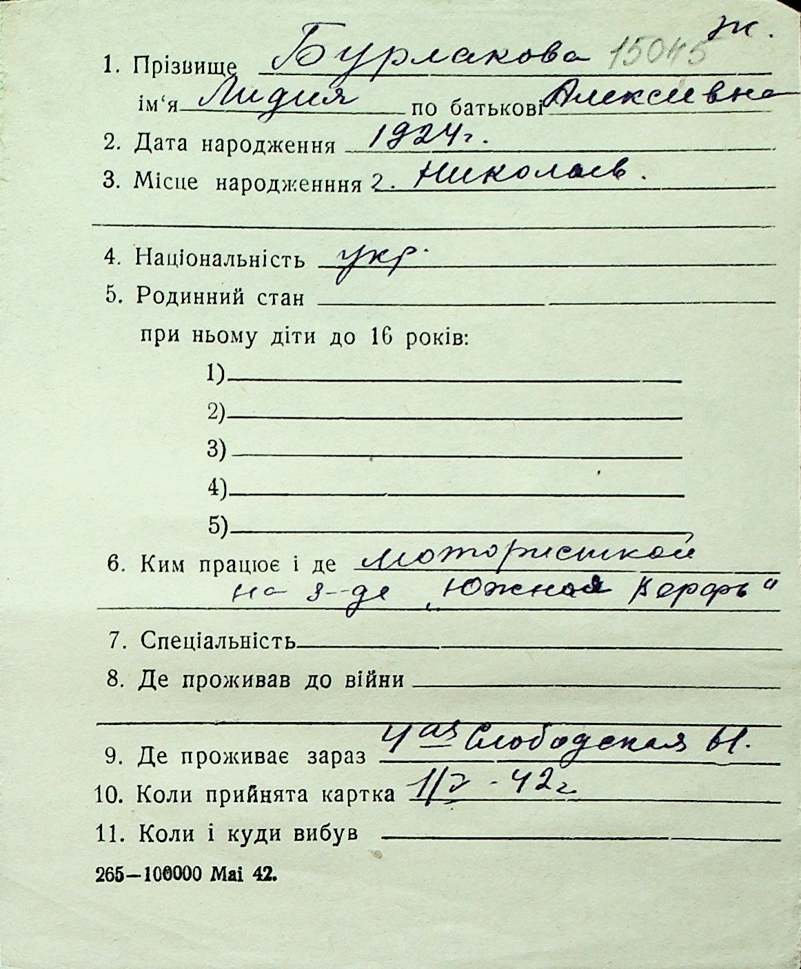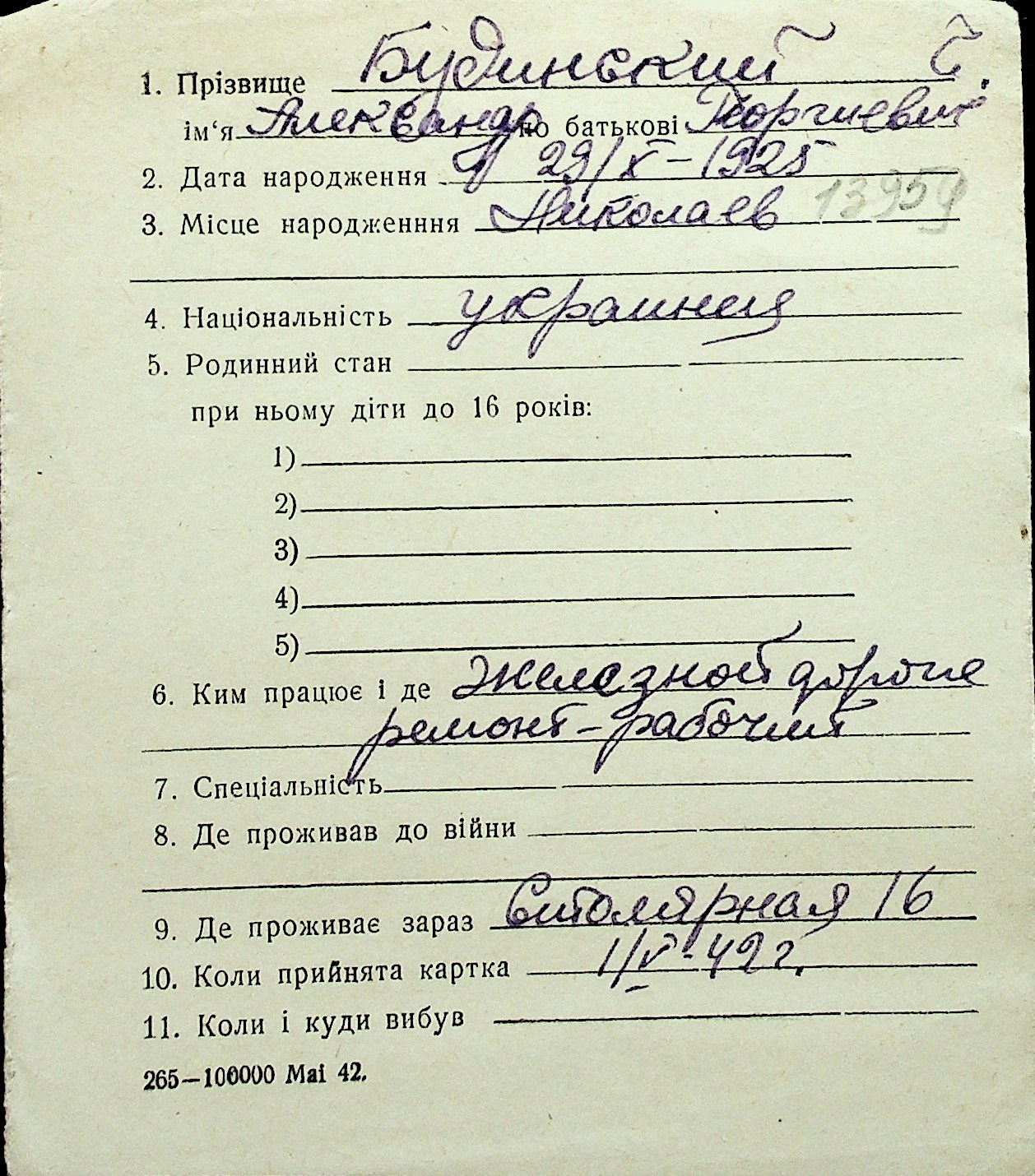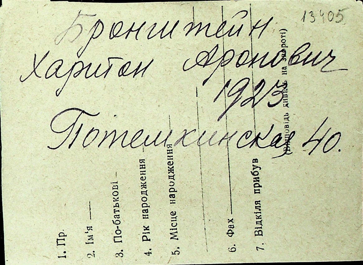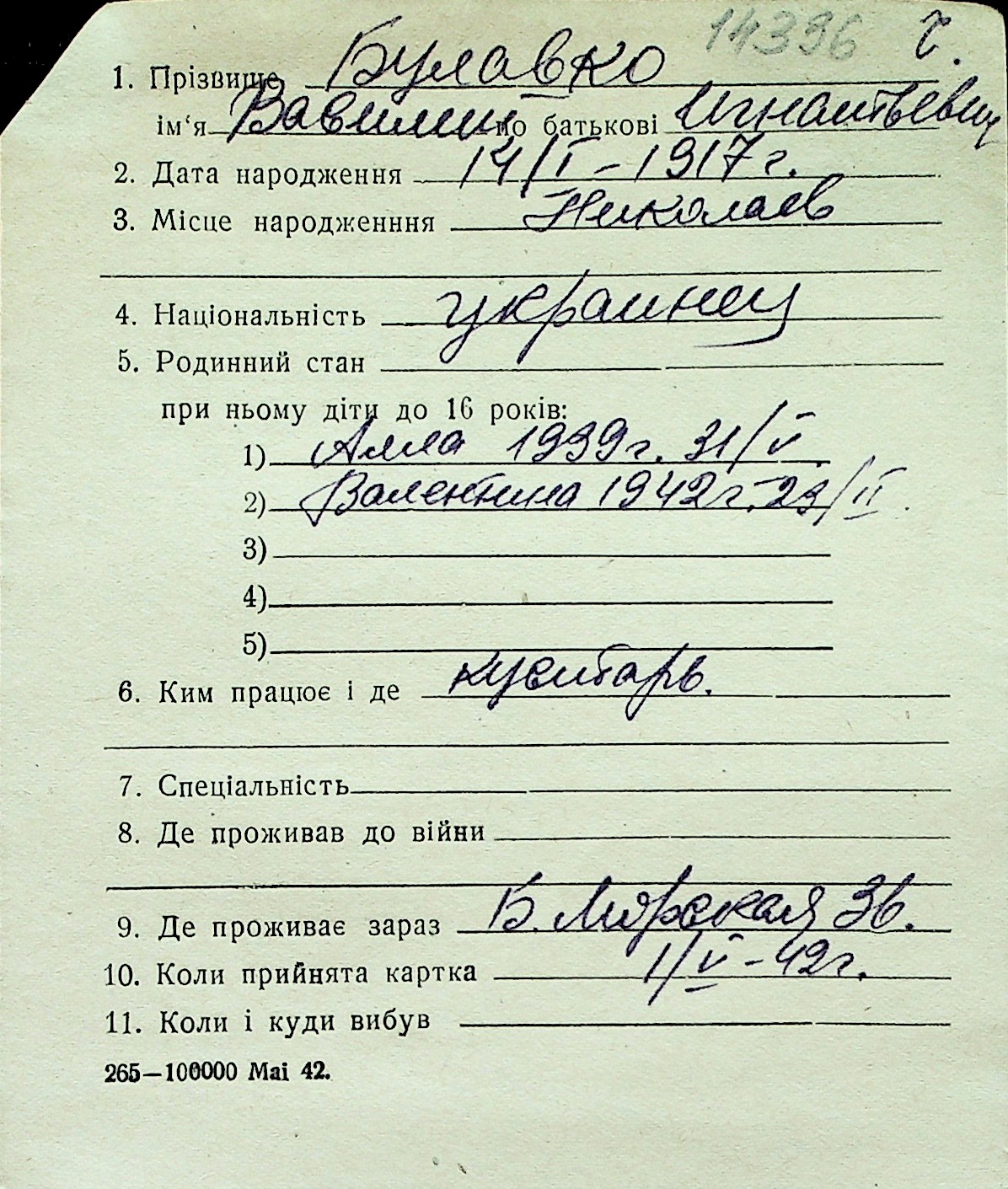 ◦ ◦ Перелік карток на осіб, які мешкали у м. Миколаїв у період окупації 1941–1944 років
