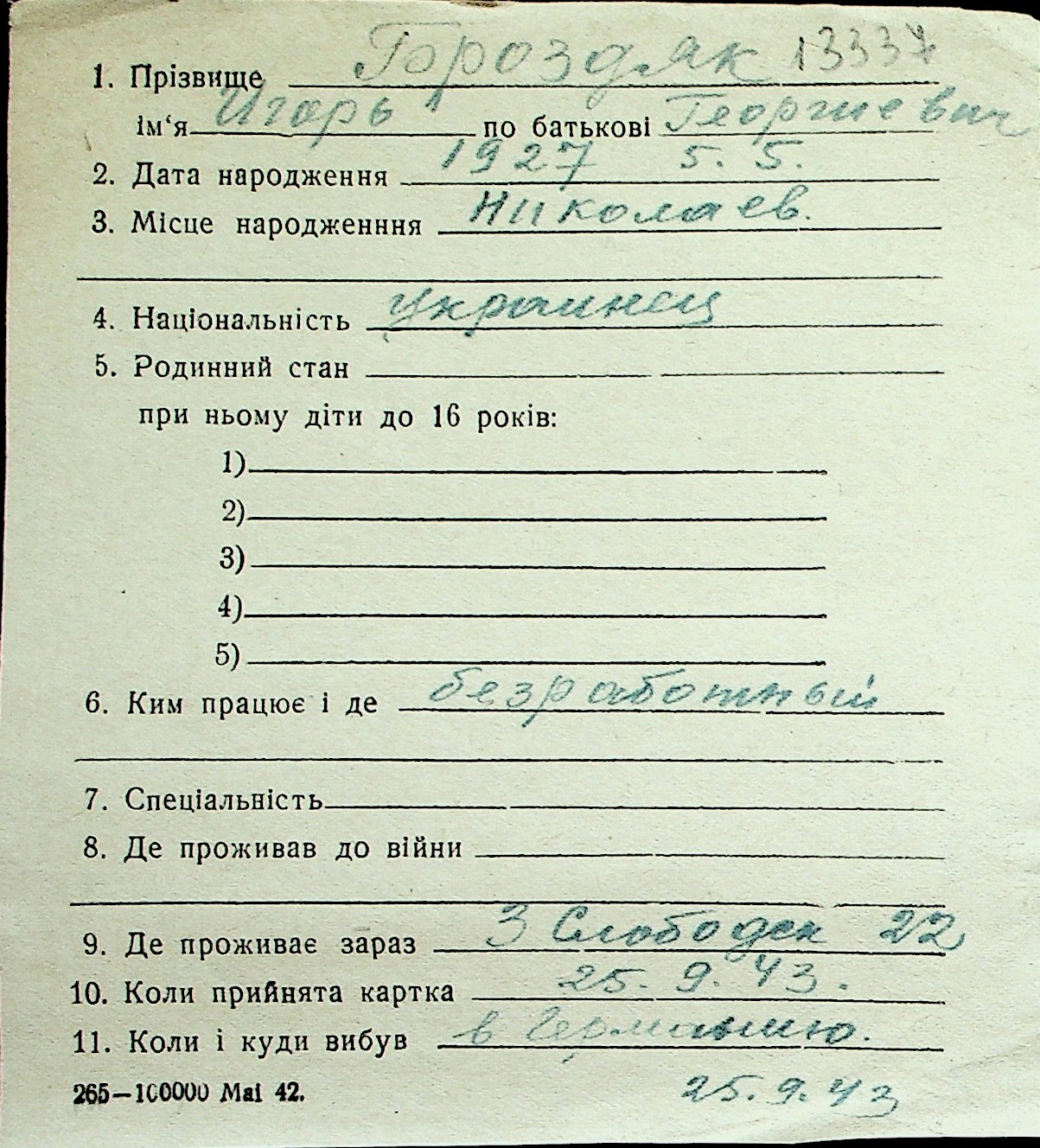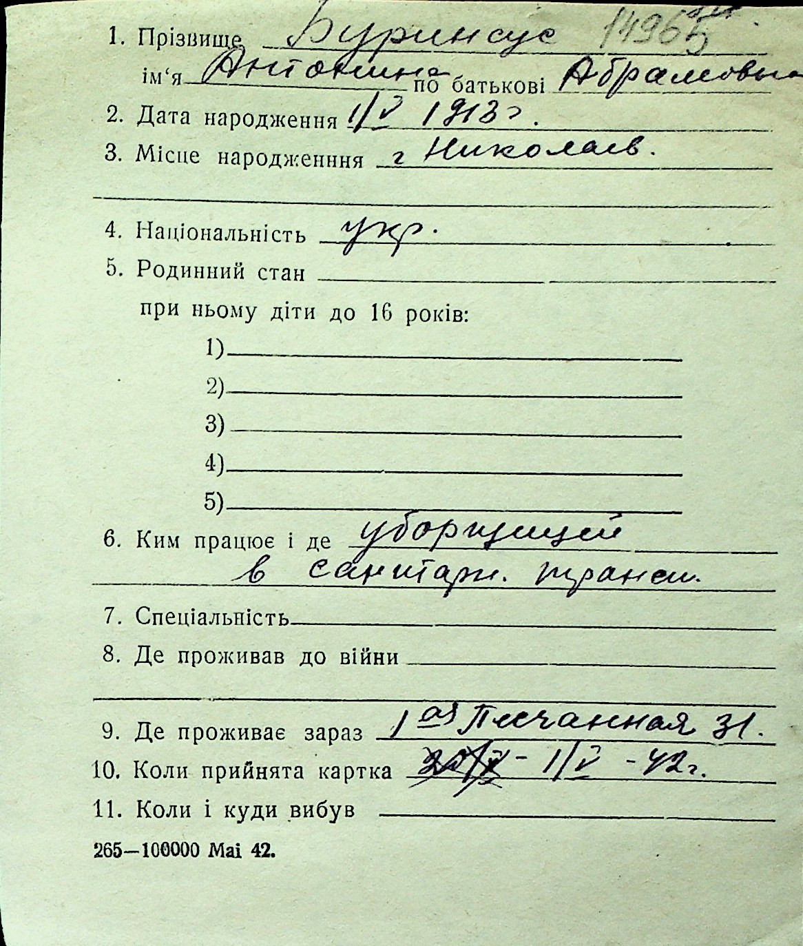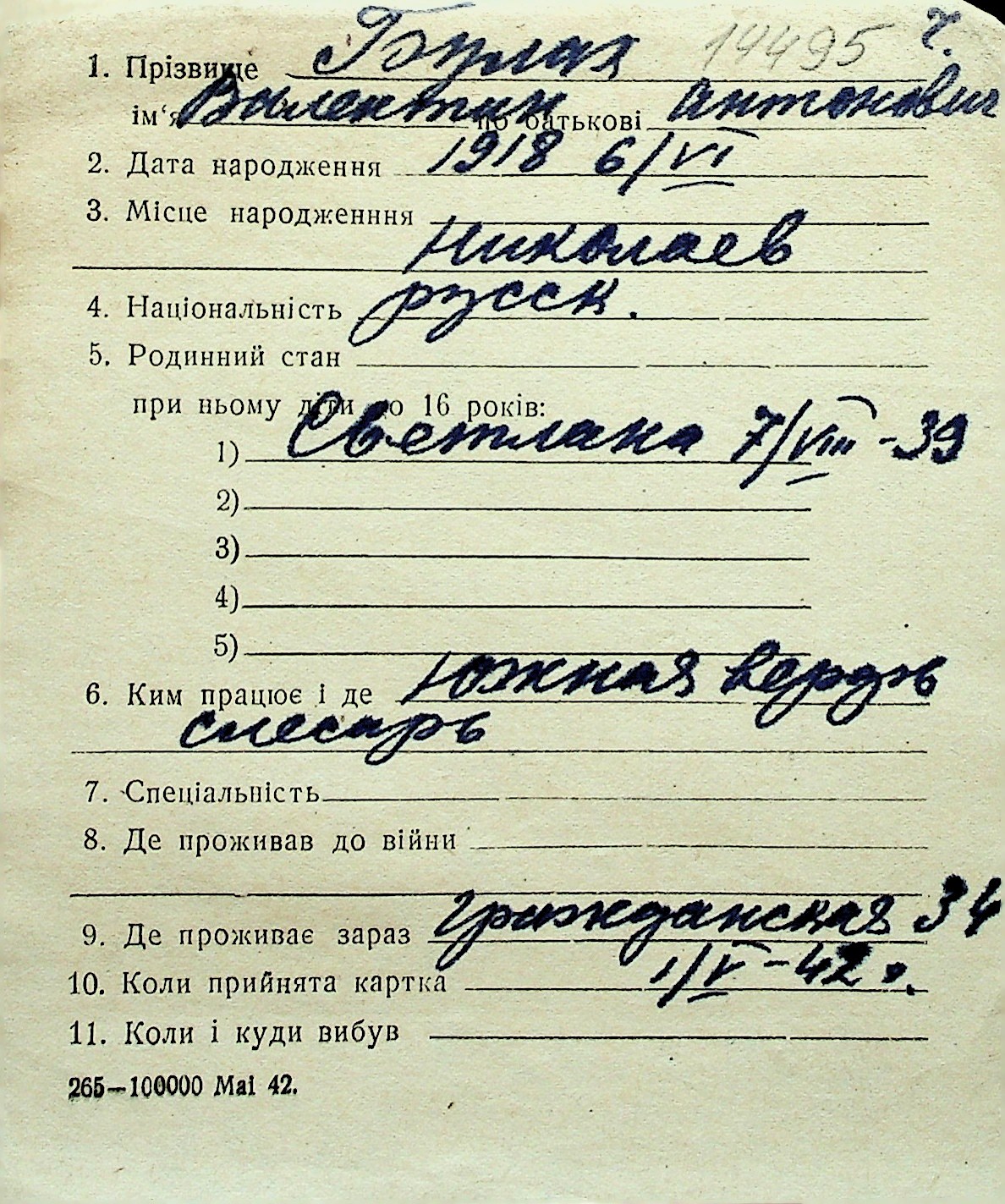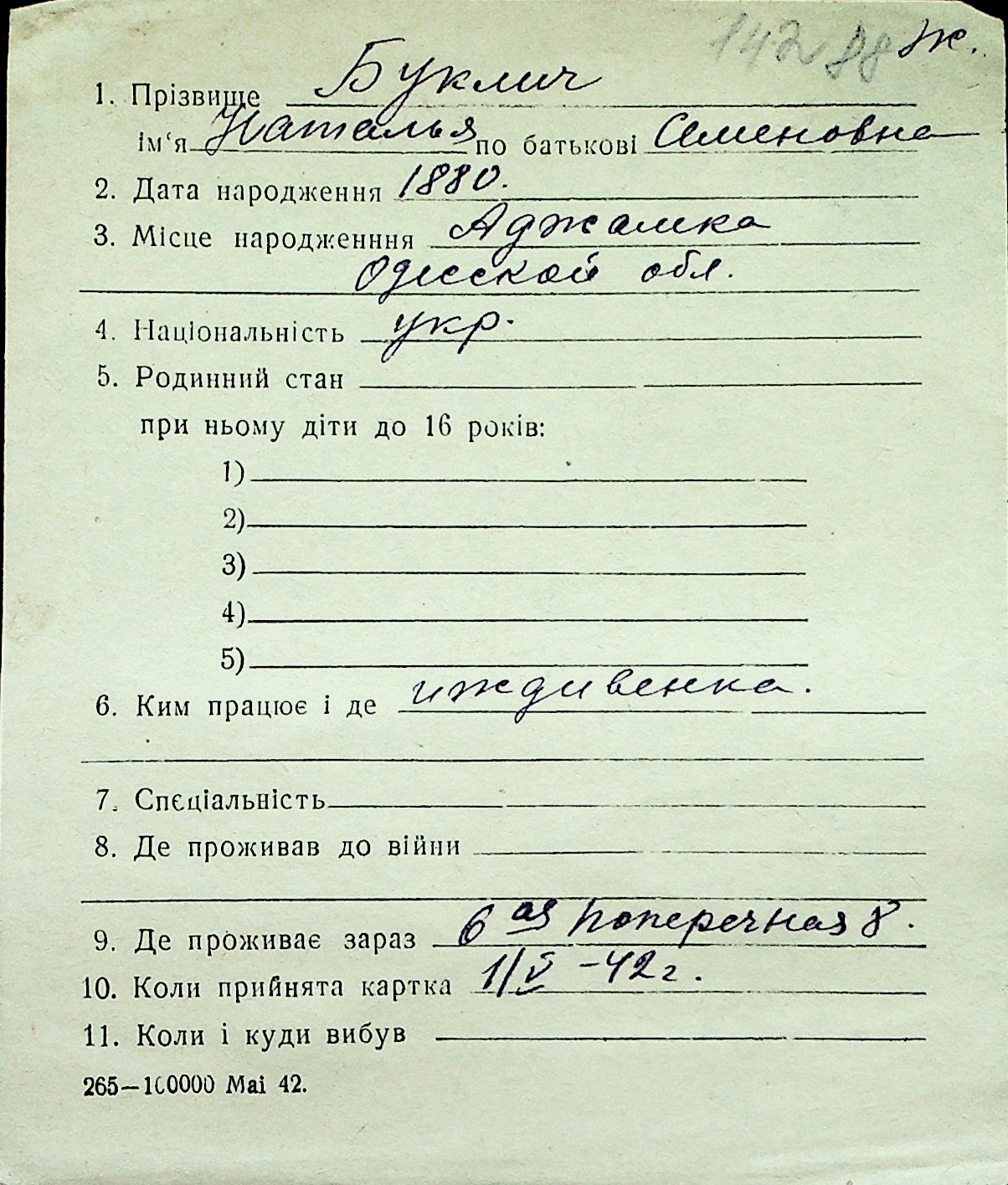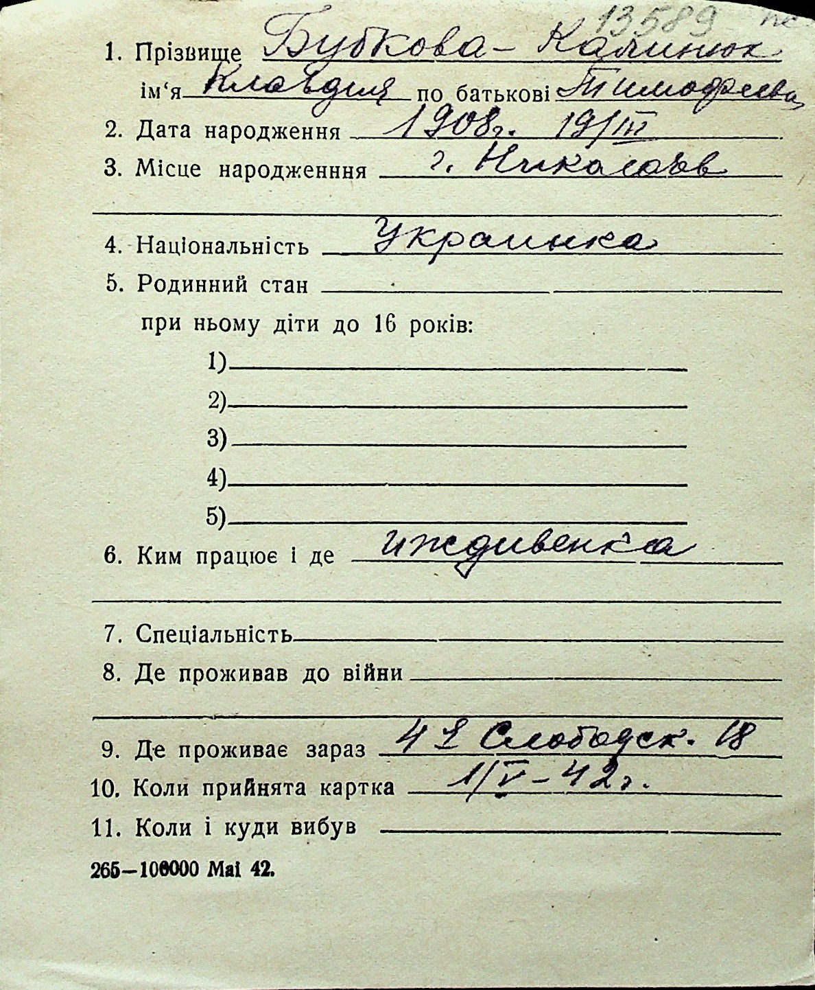◦ ◦ Перелік карток на осіб, які мешкали у м. Миколаїв у період окупації 1941–1944 років