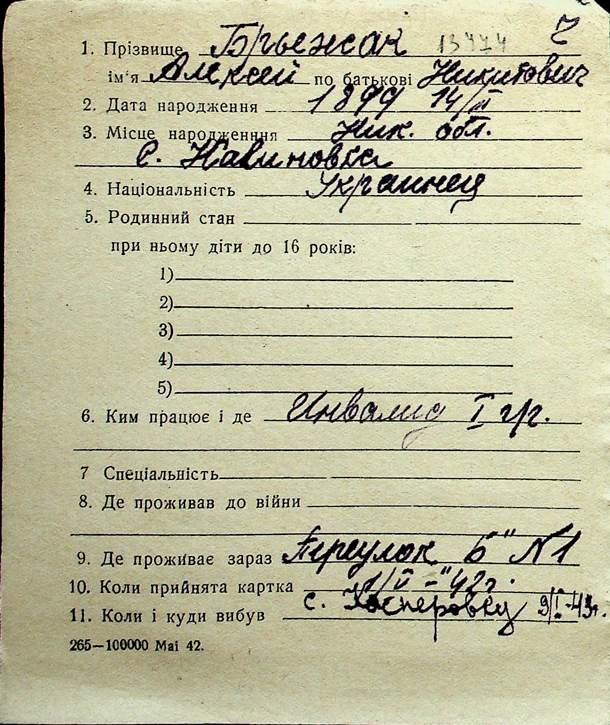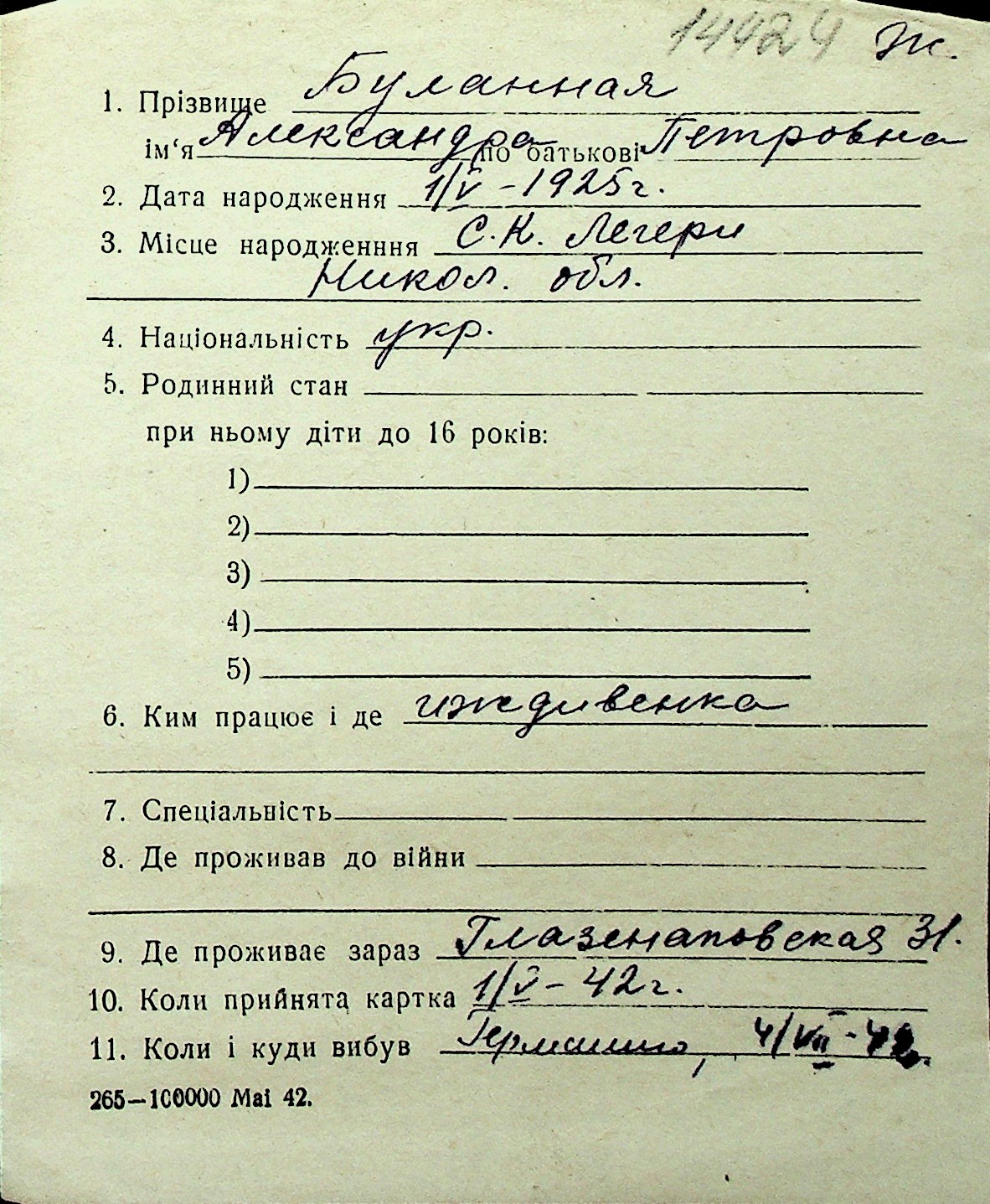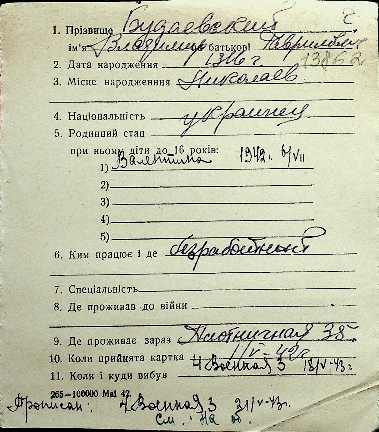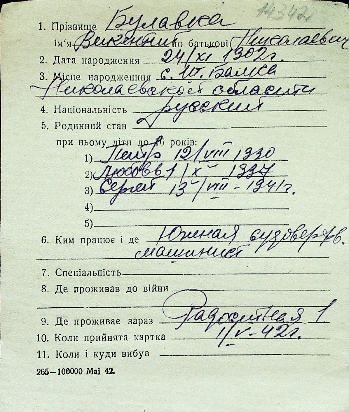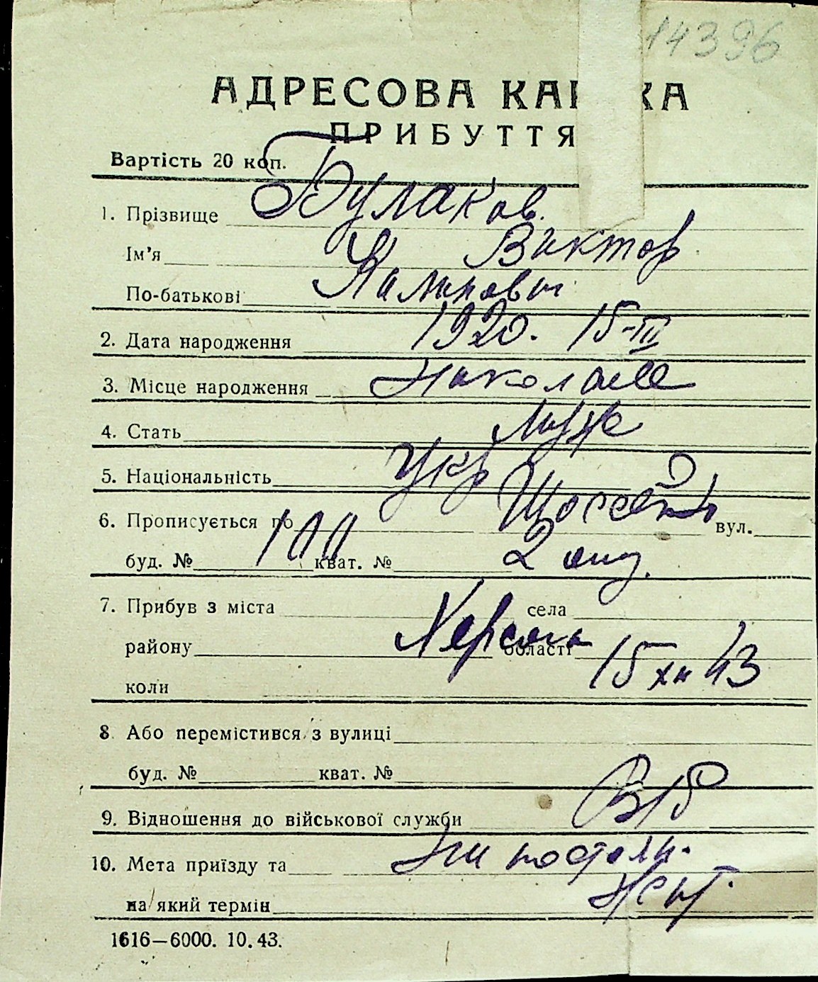 ◦ ◦ Перелік карток на осіб, які мешкали у м. Миколаїв у період окупації 1941–1944 років