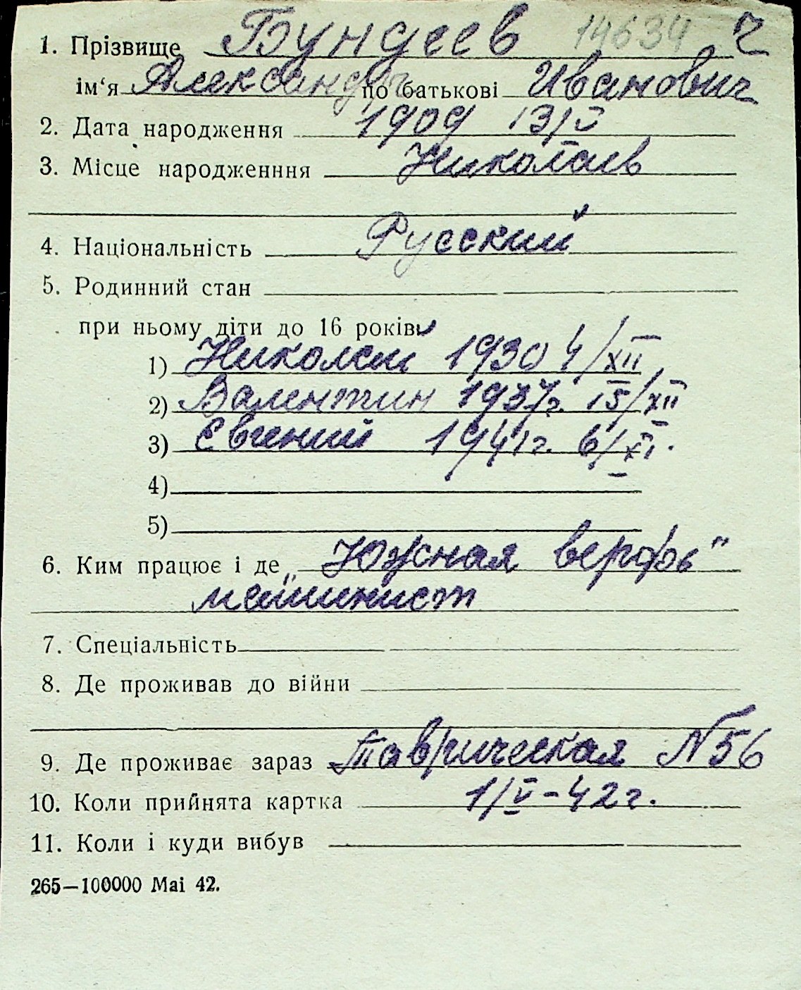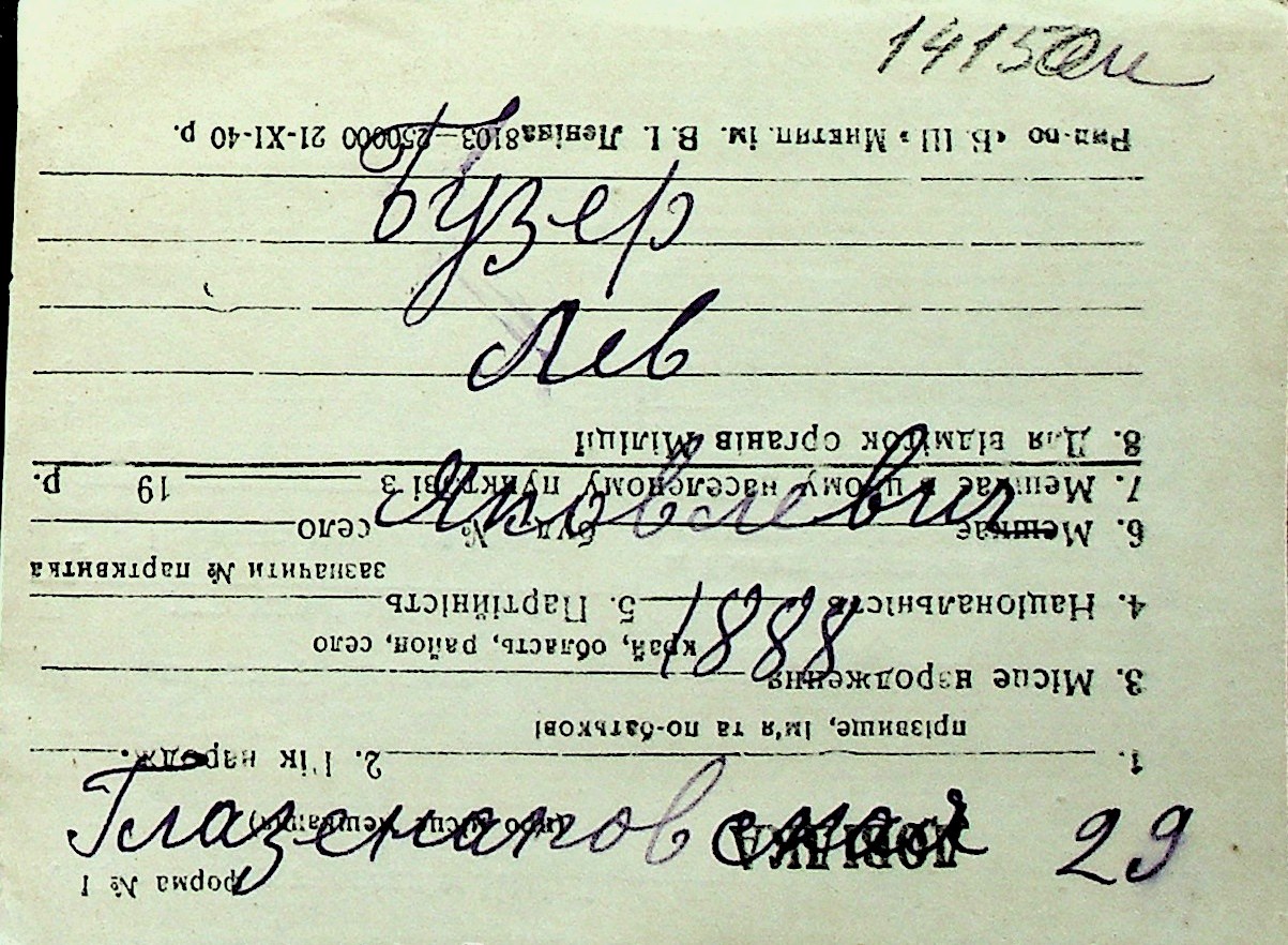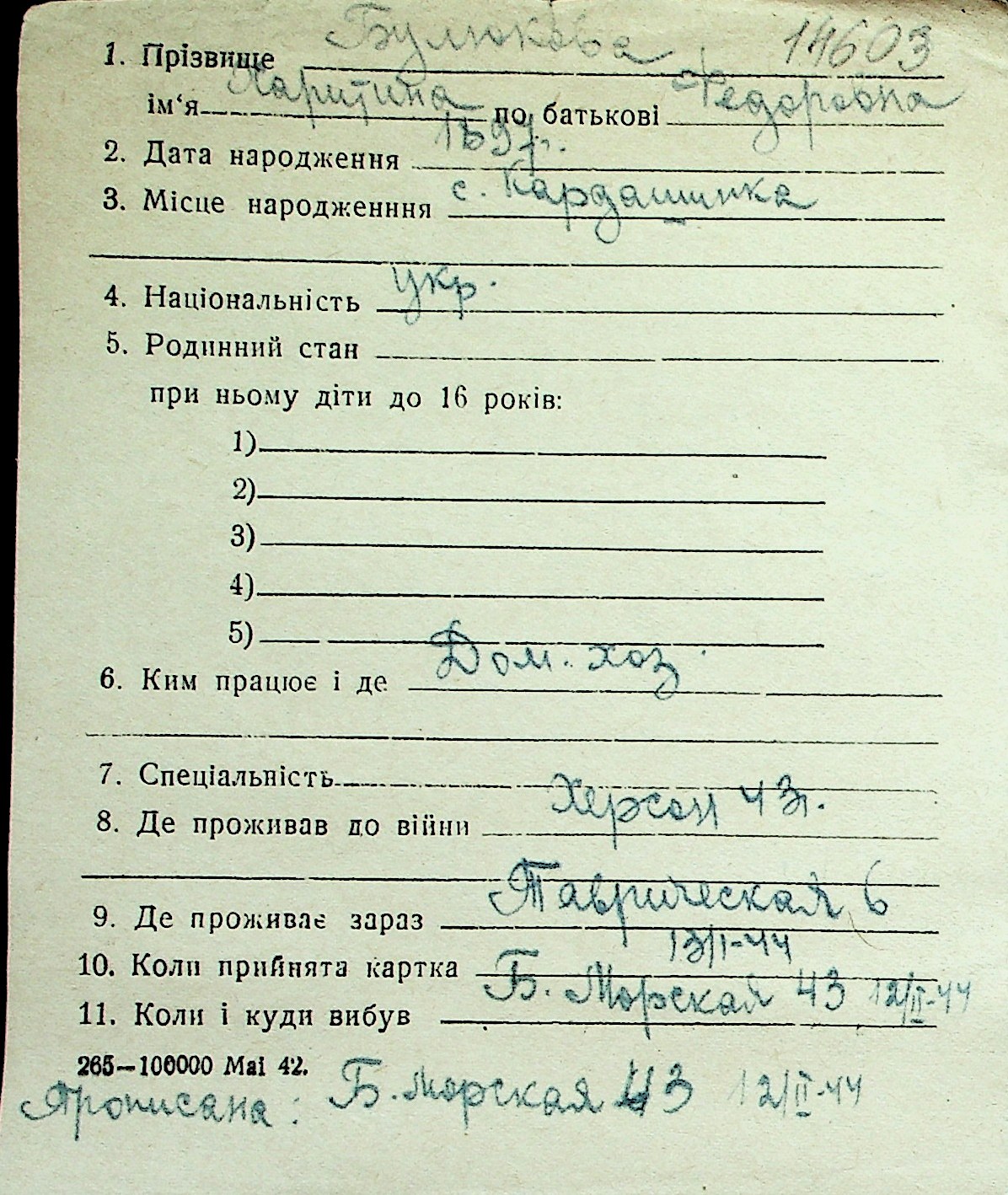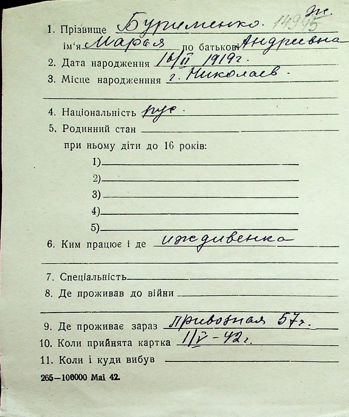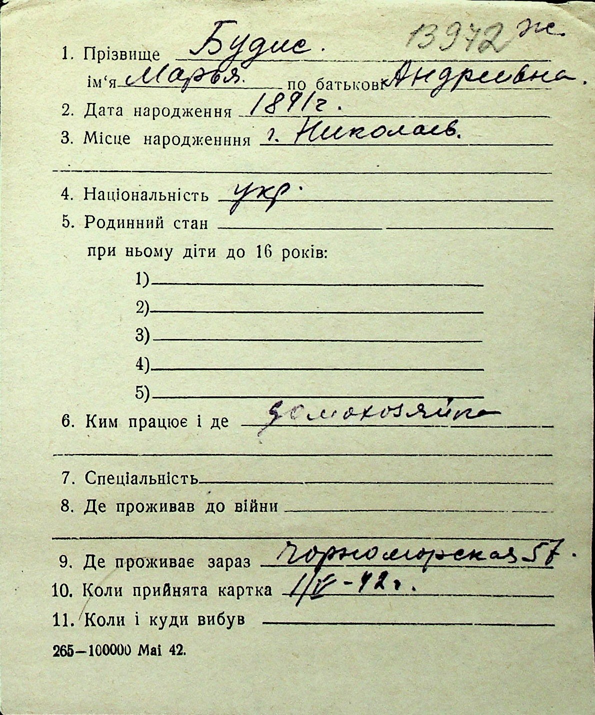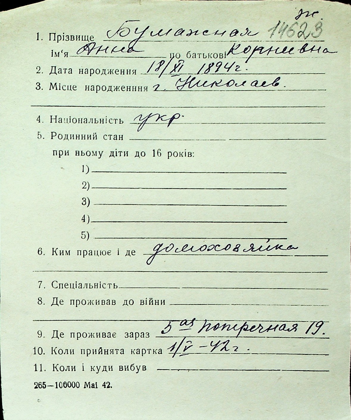 ◦ ◦ Перелік карток на осіб, які мешкали у м. Миколаїв у період окупації 1941–1944 років