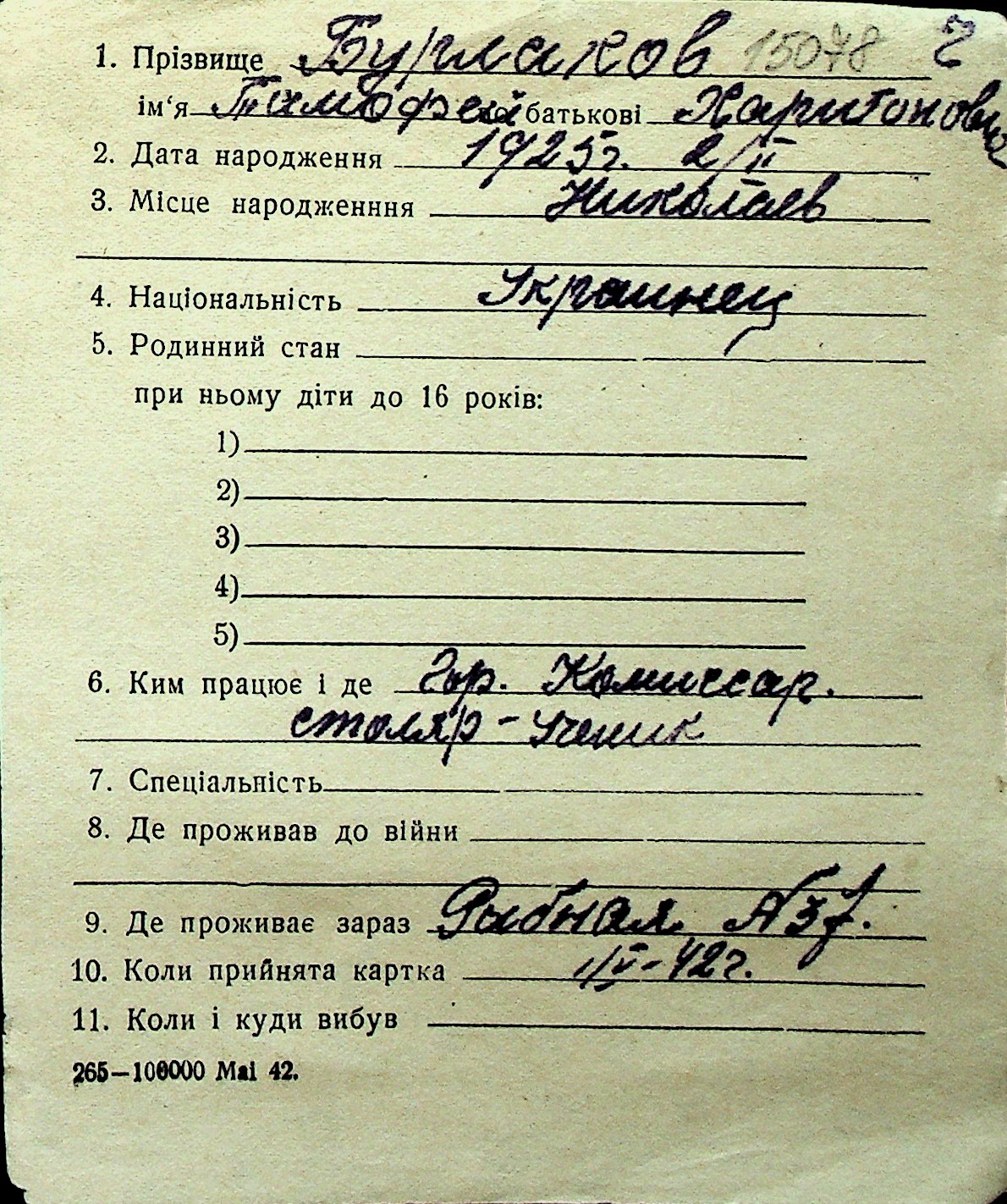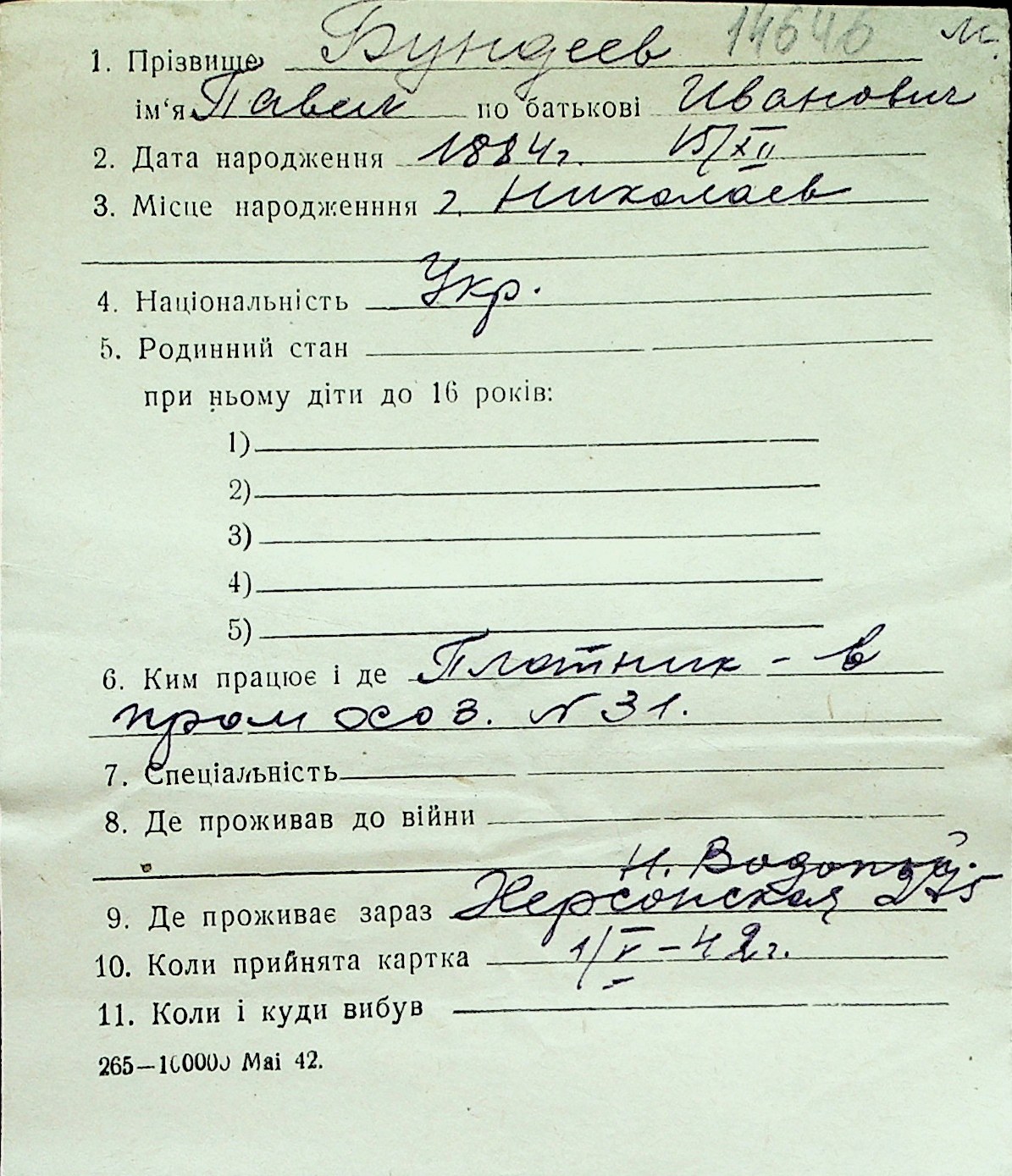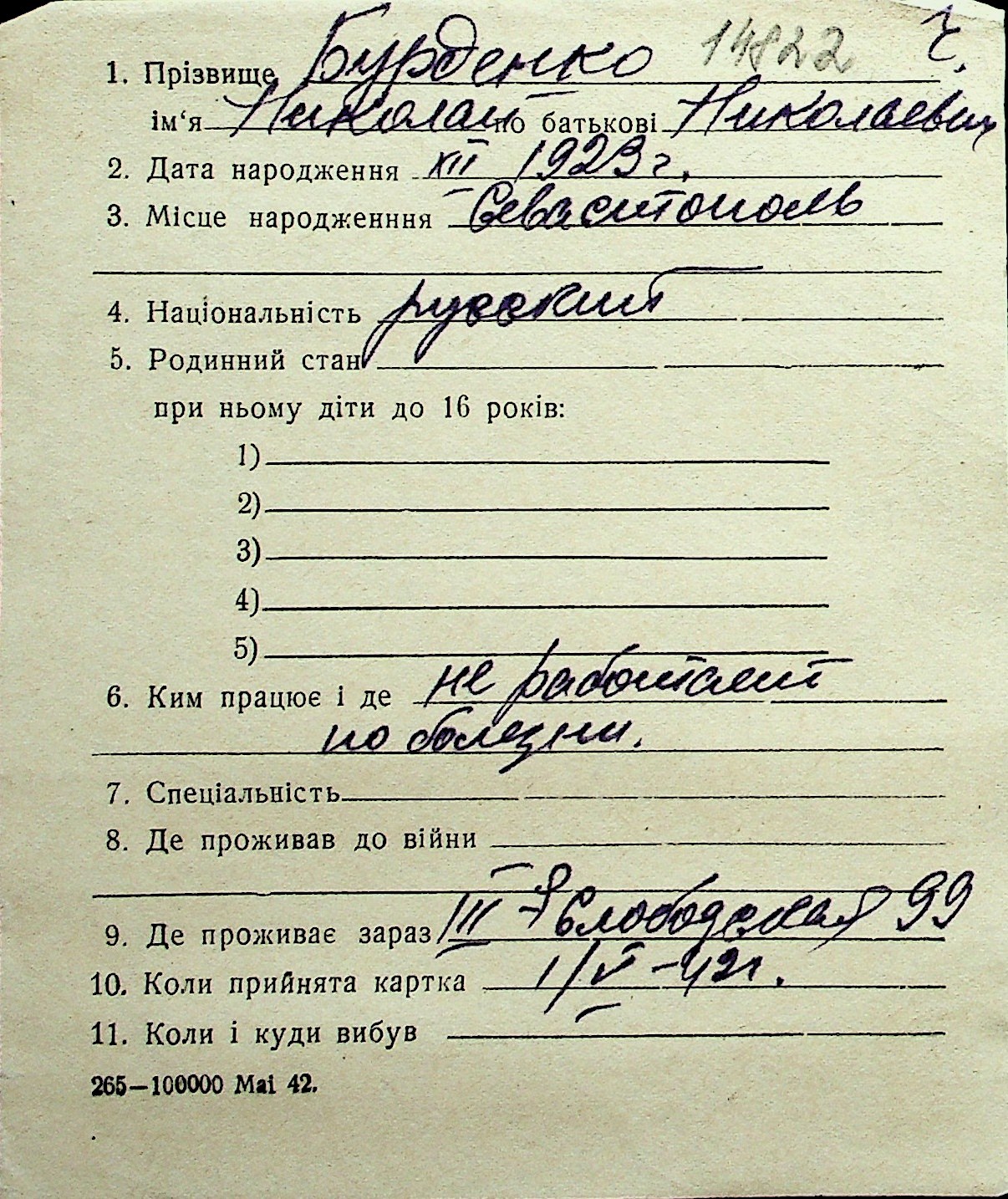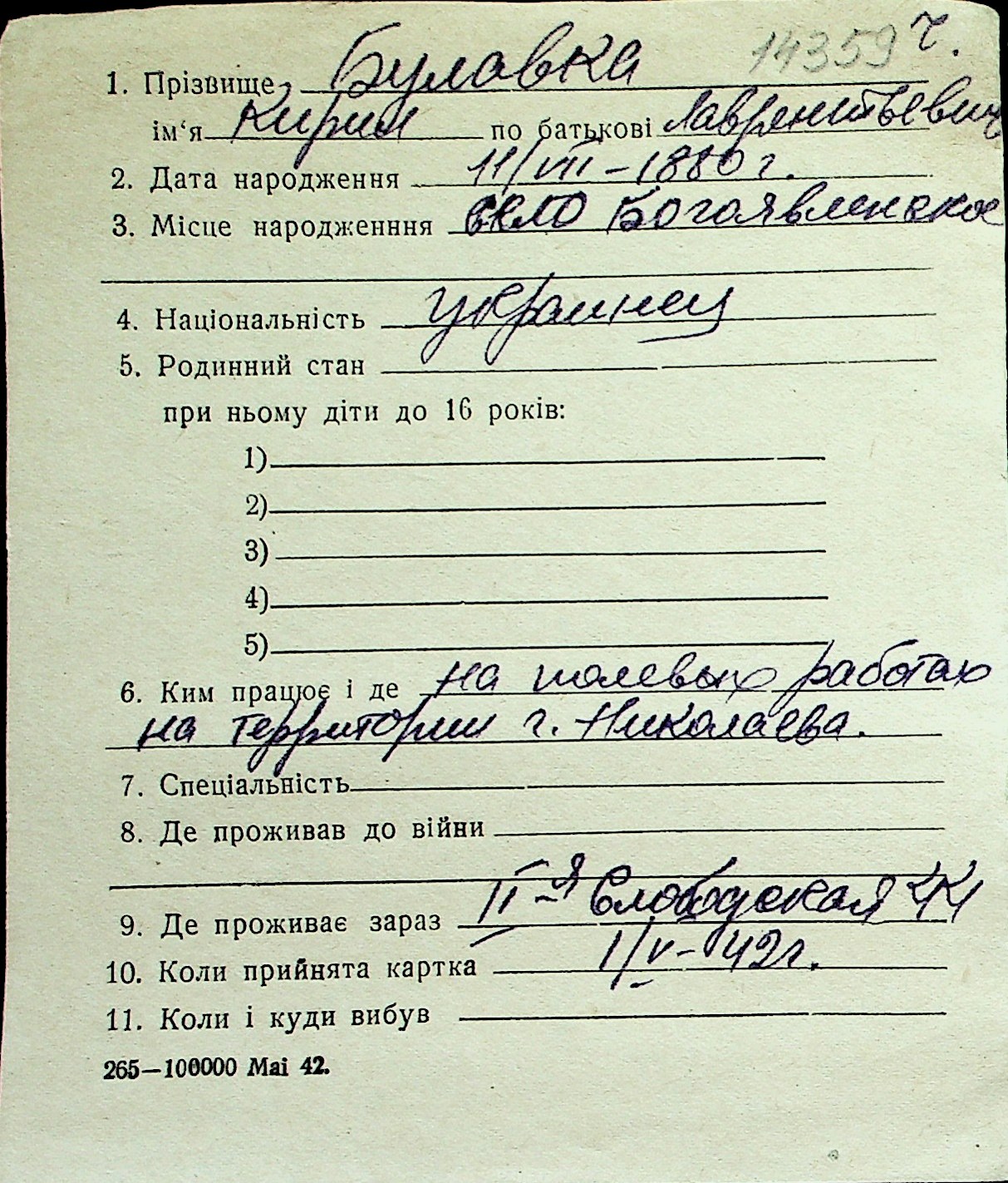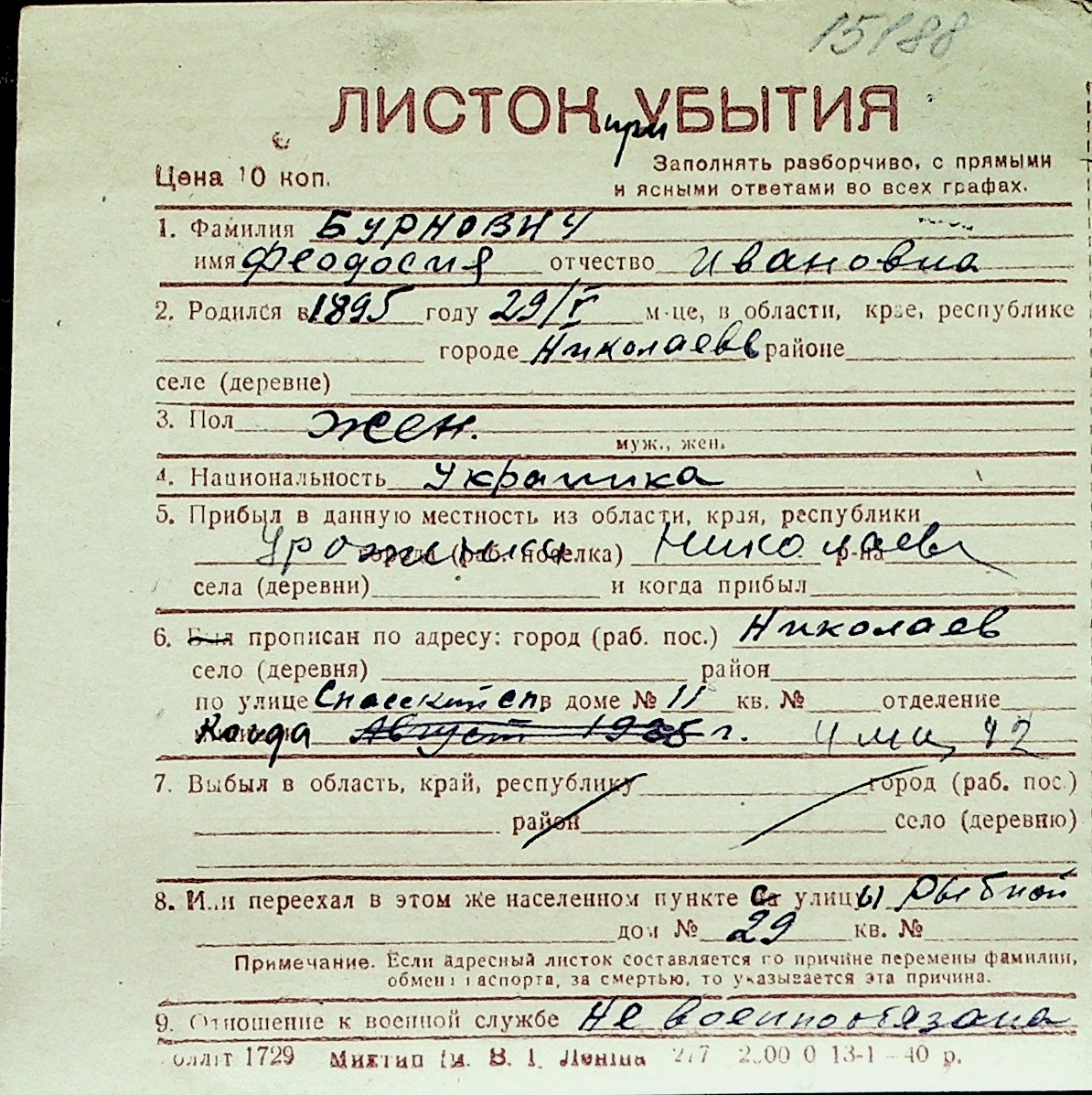 ◦ ◦ Перелік карток на осіб, які мешкали у м. Миколаїв у період окупації 1941–1944 років