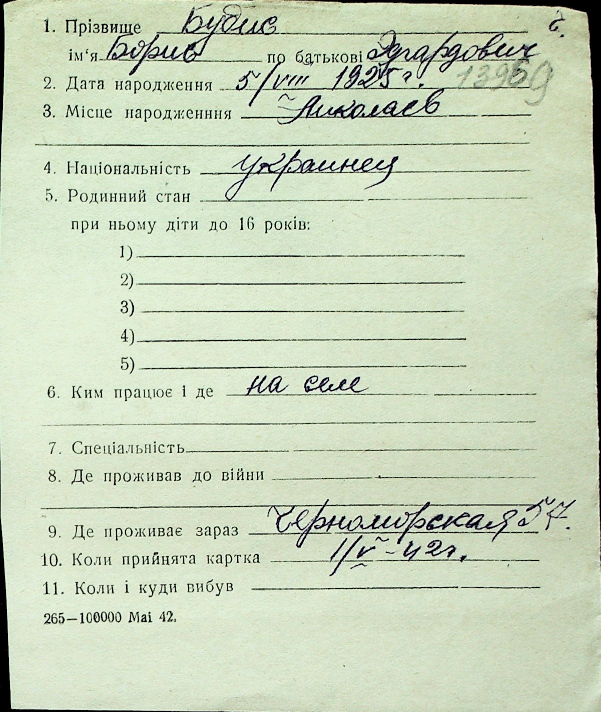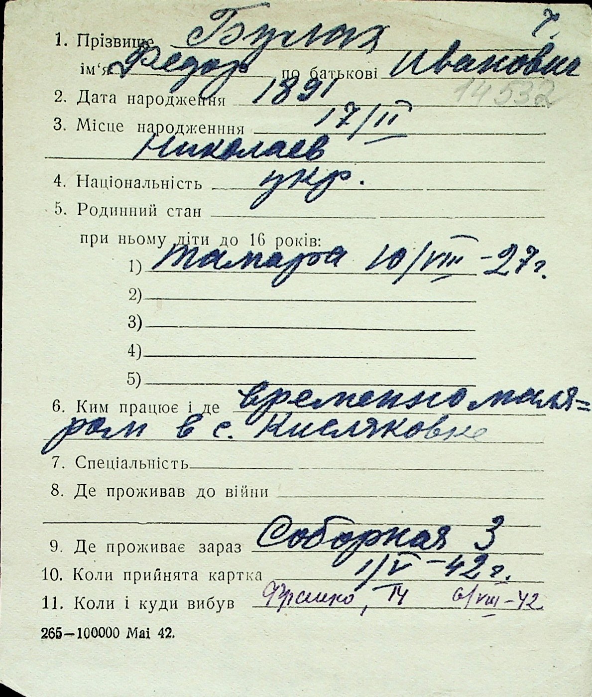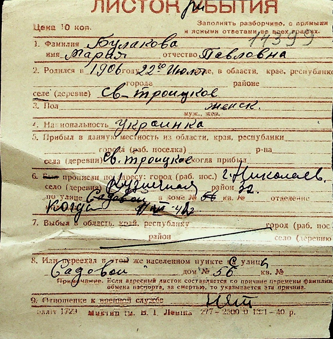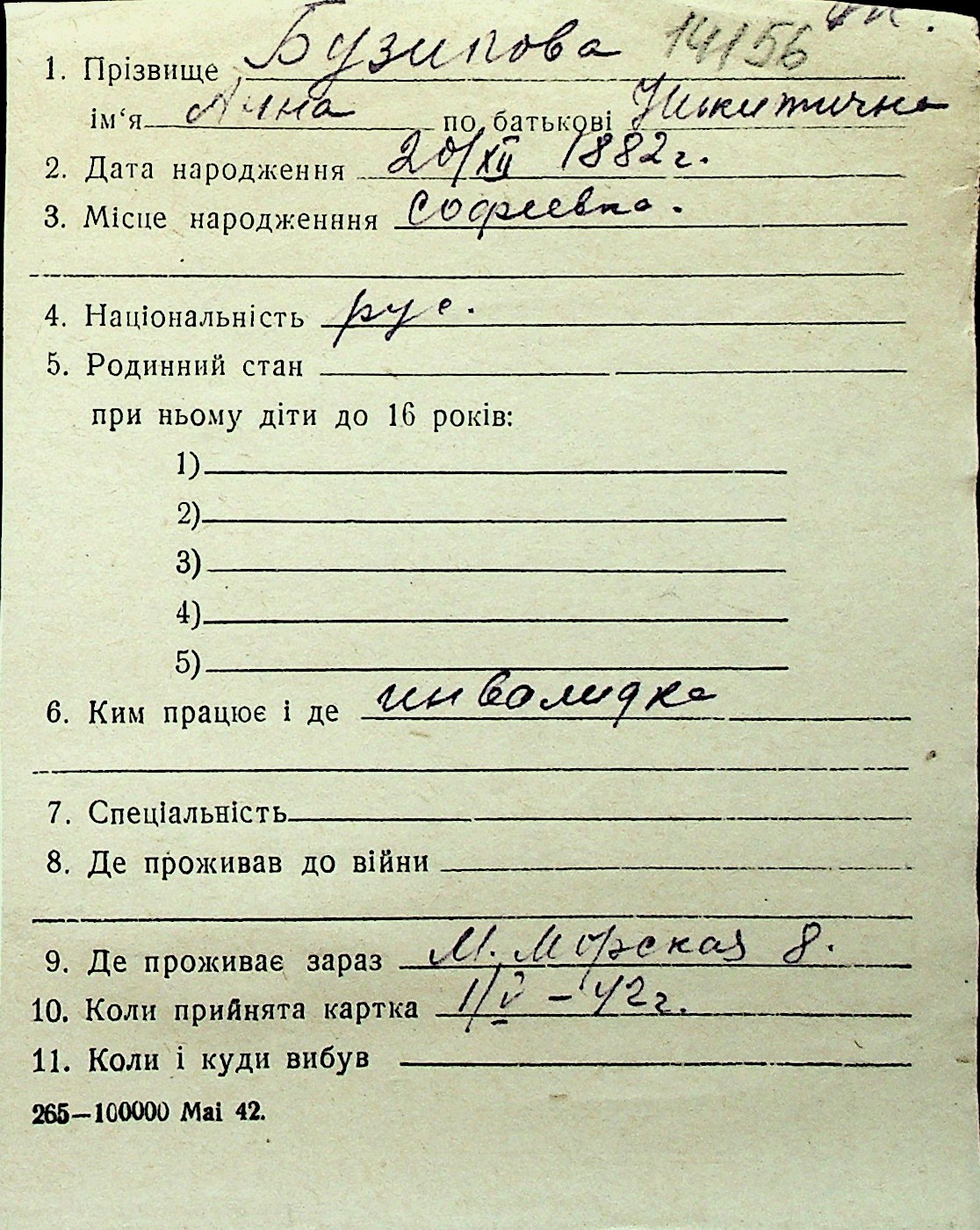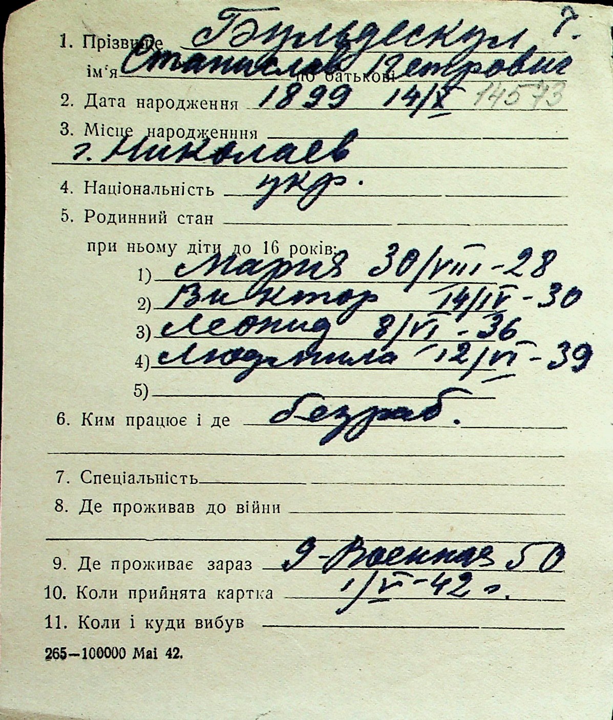 ◦ ◦ Перелік карток на осіб, які мешкали у м. Миколаїв у період окупації 1941–1944 років