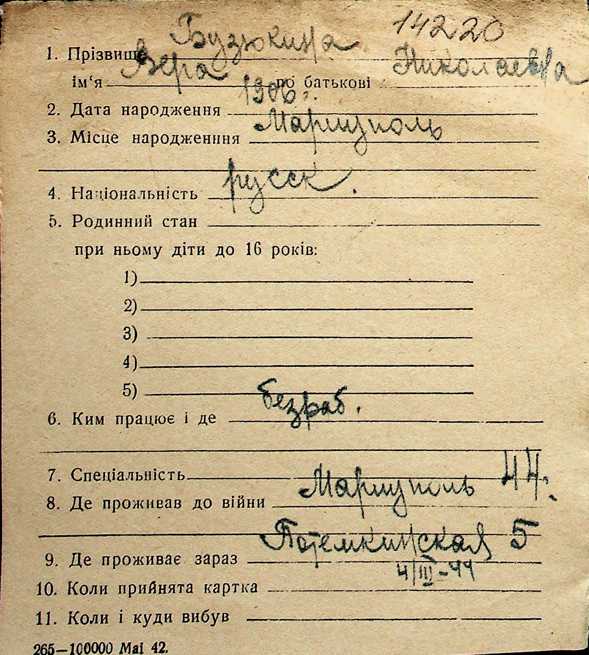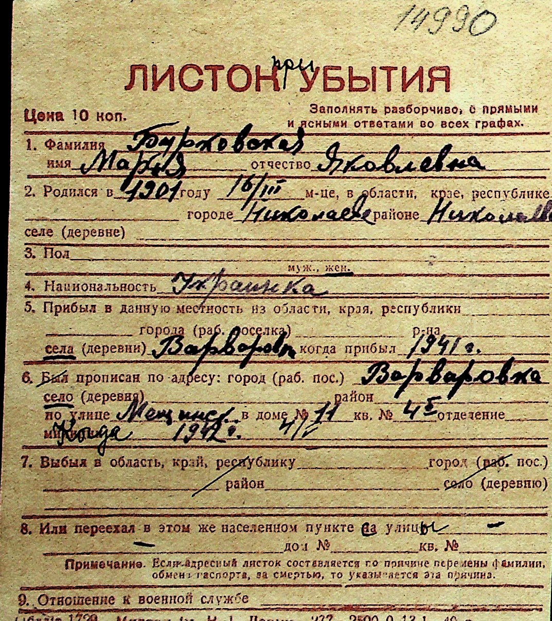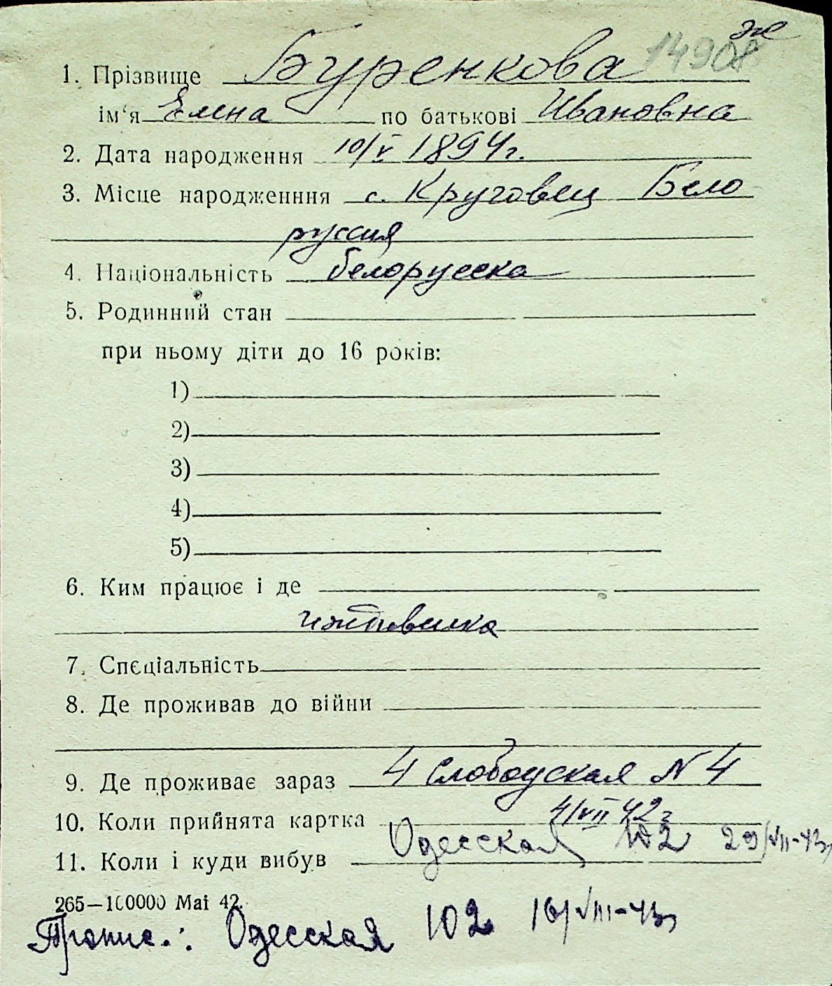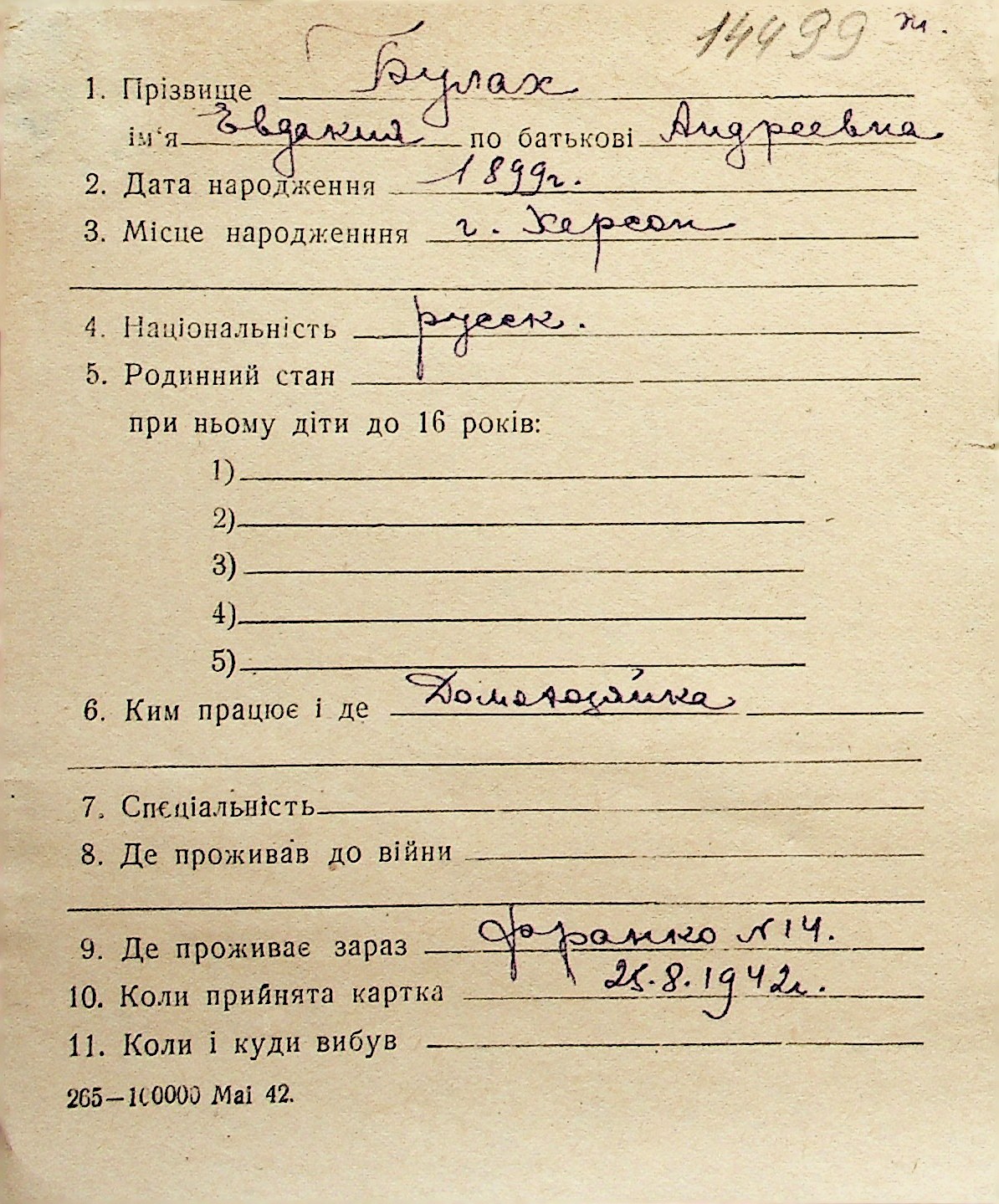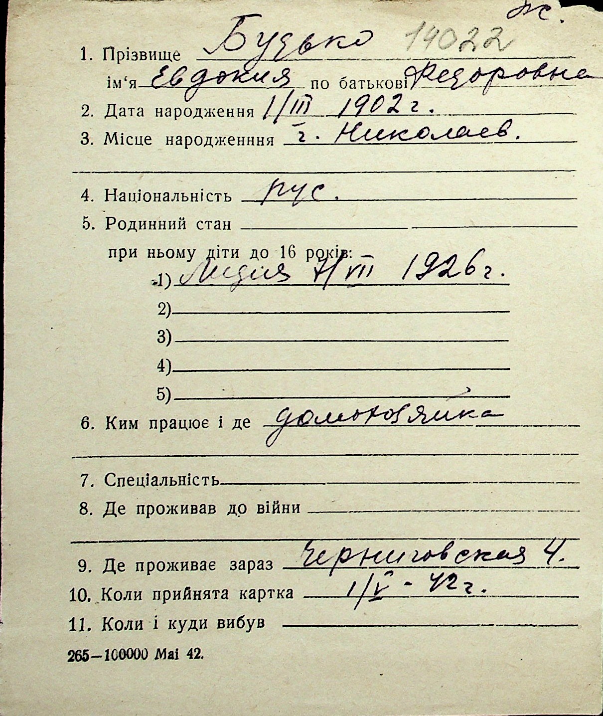 ◦ ◦ Перелік карток на осіб, які мешкали у м. Миколаїв у період окупації 1941–1944 років