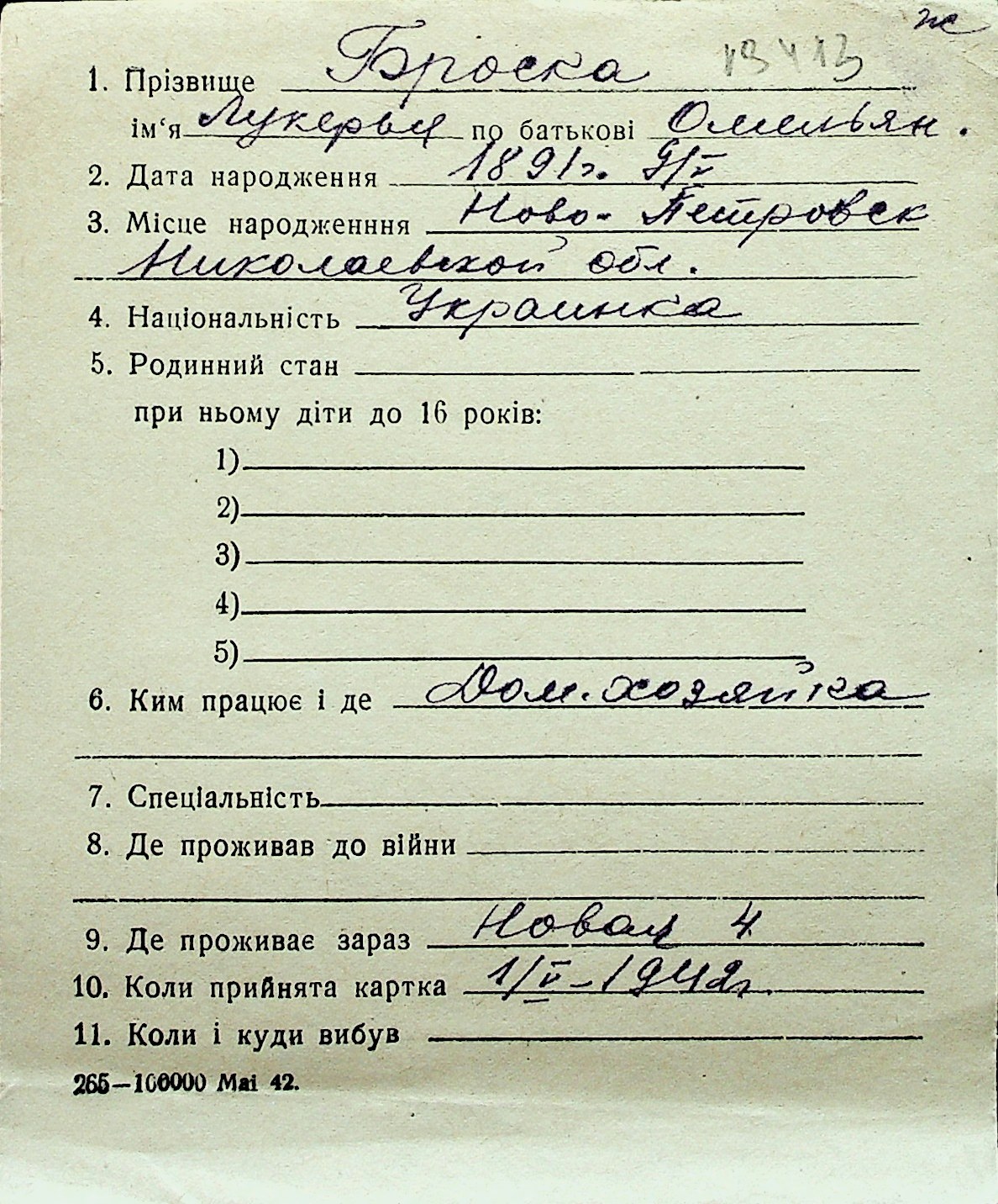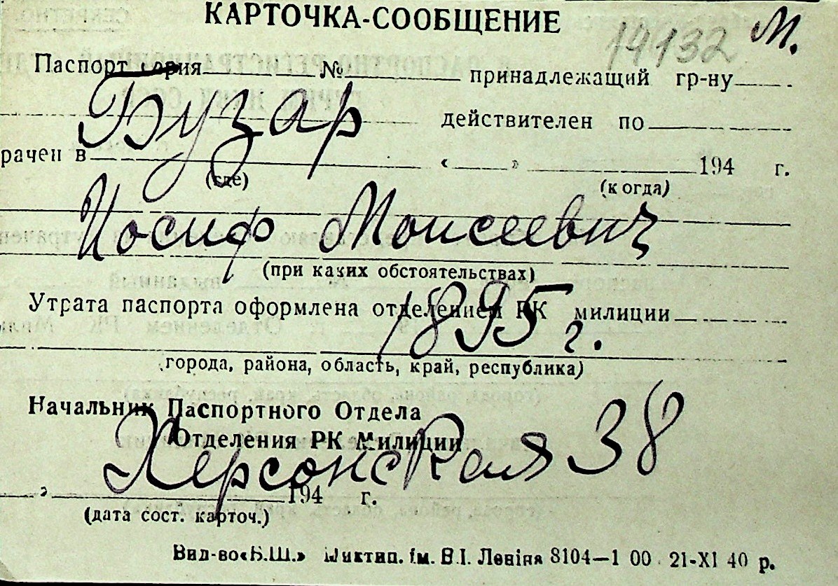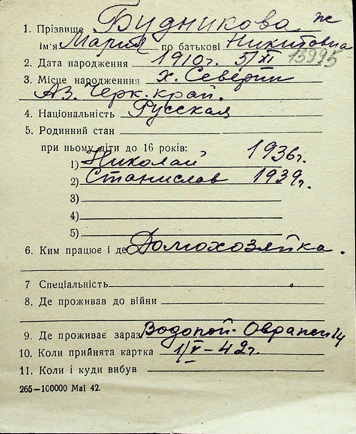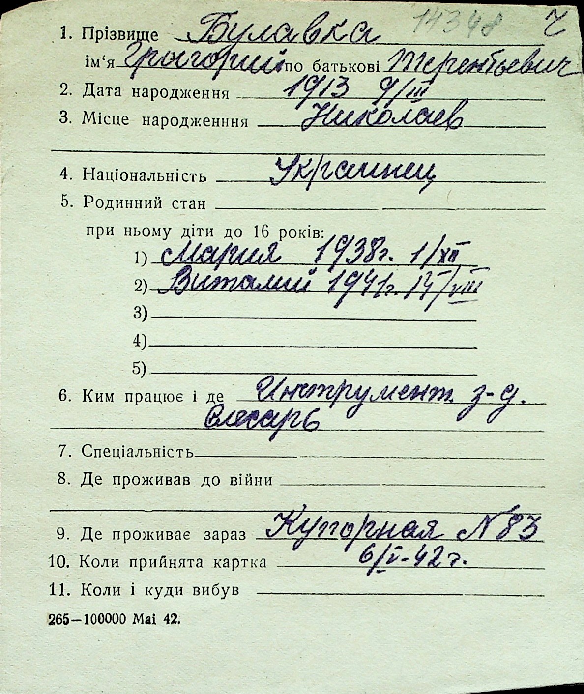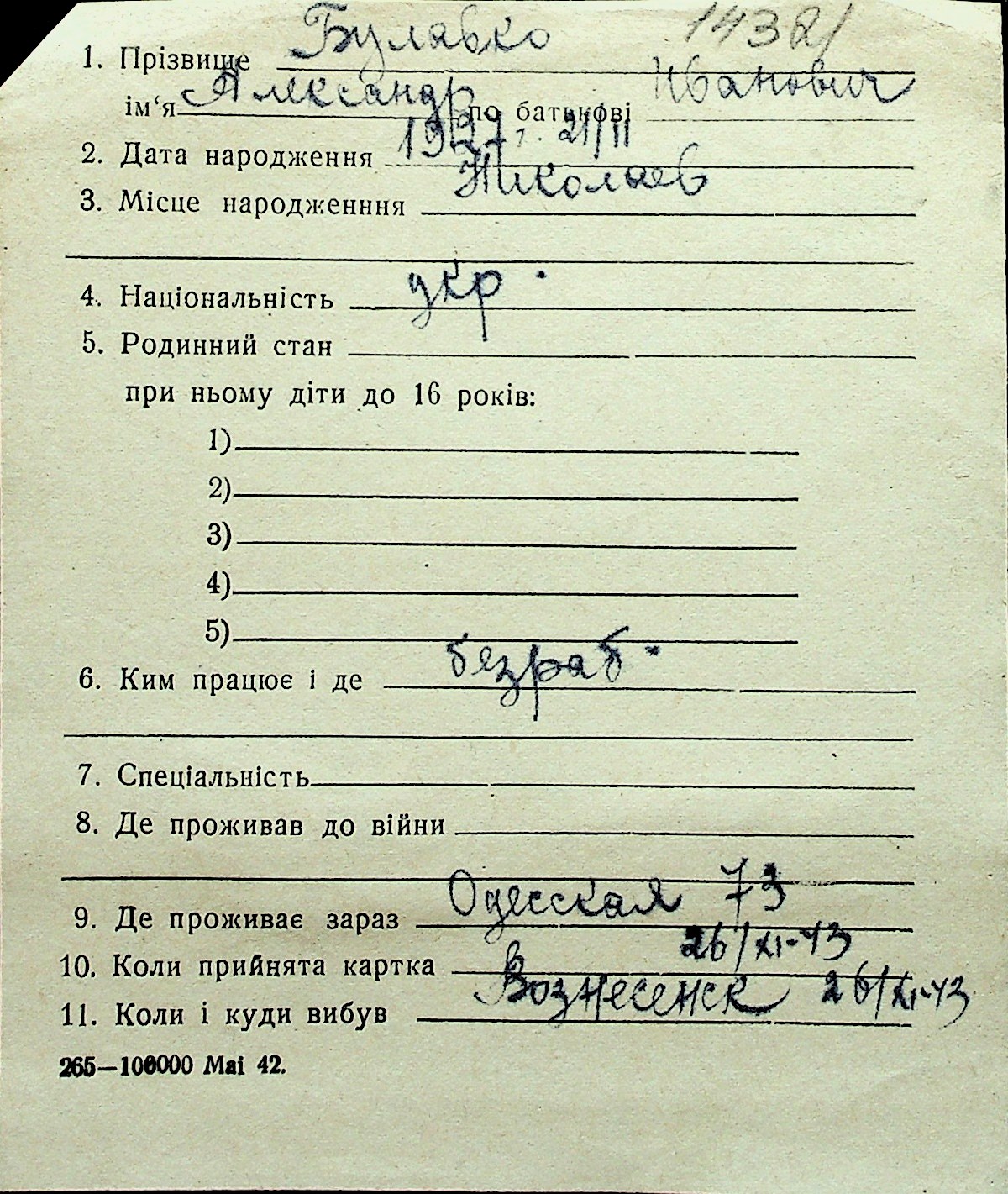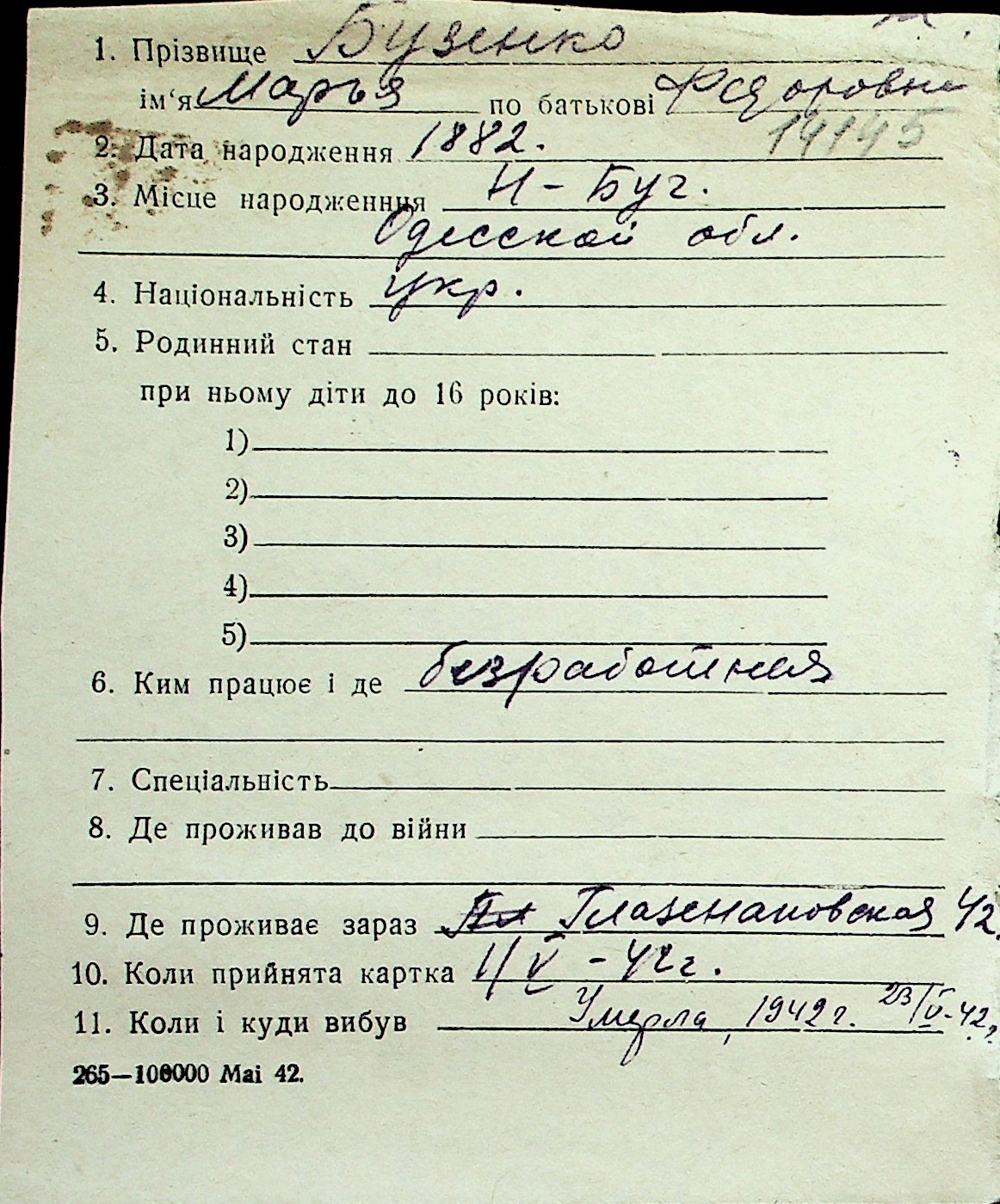 ◦ ◦ Перелік карток на осіб, які мешкали у м. Миколаїв у період окупації 1941–1944 років