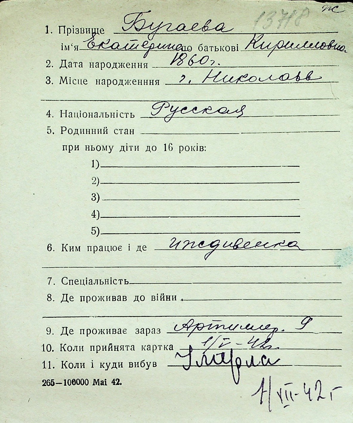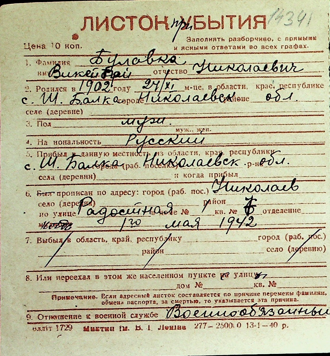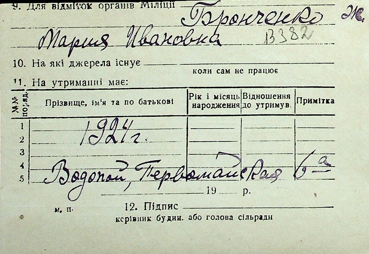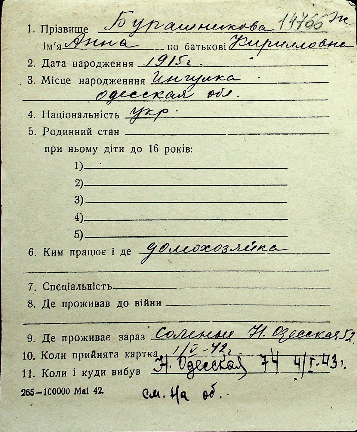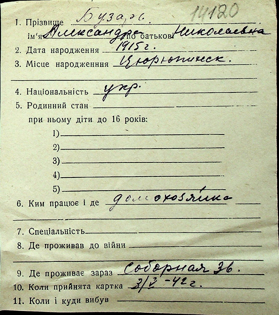 ◦ ◦ Перелік карток на осіб, які мешкали у м. Миколаїв у період окупації 1941–1944 років