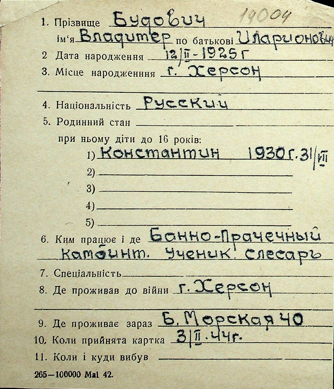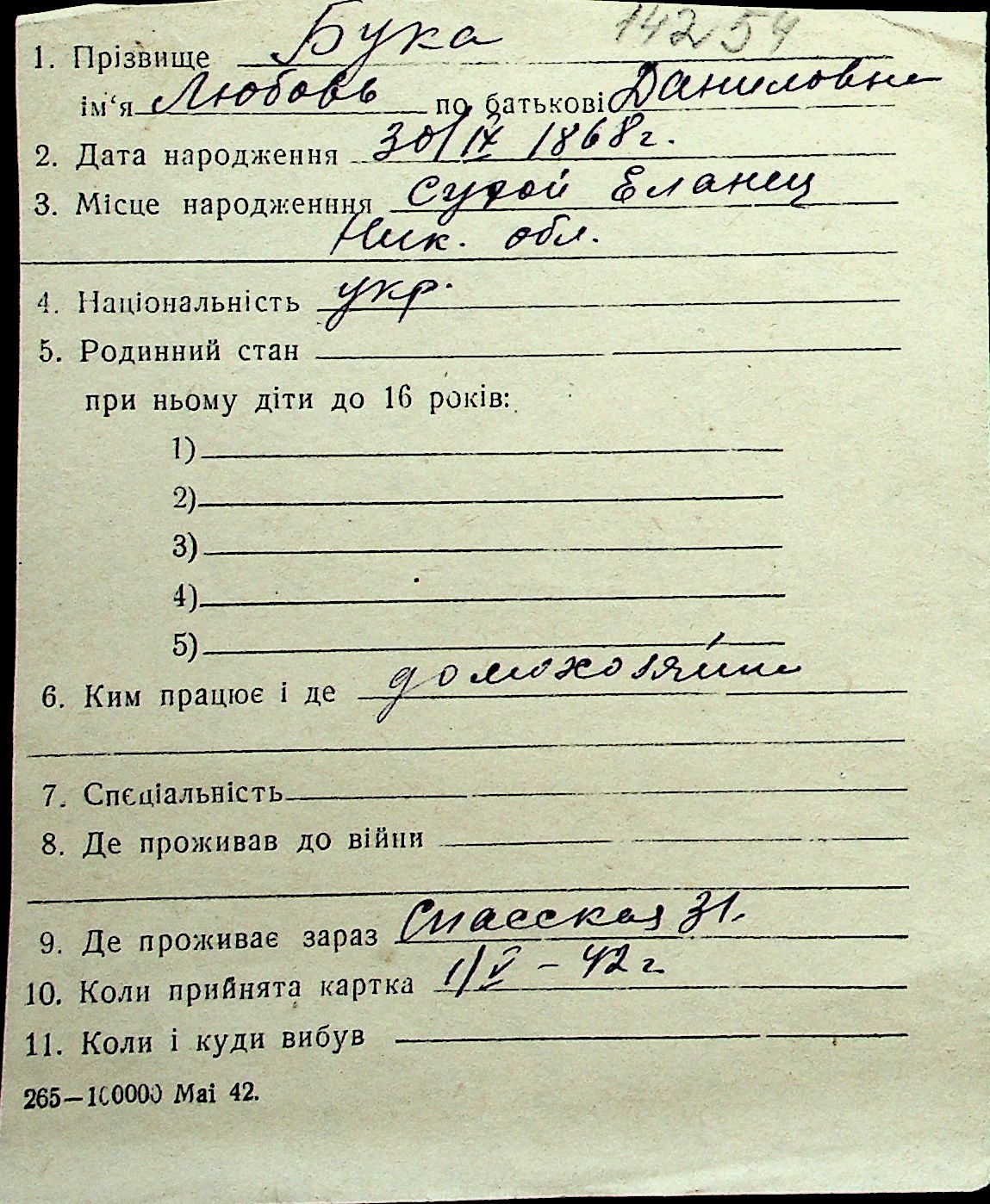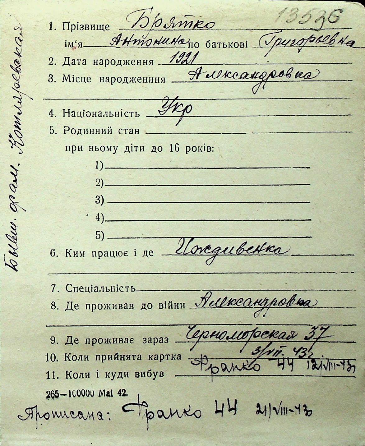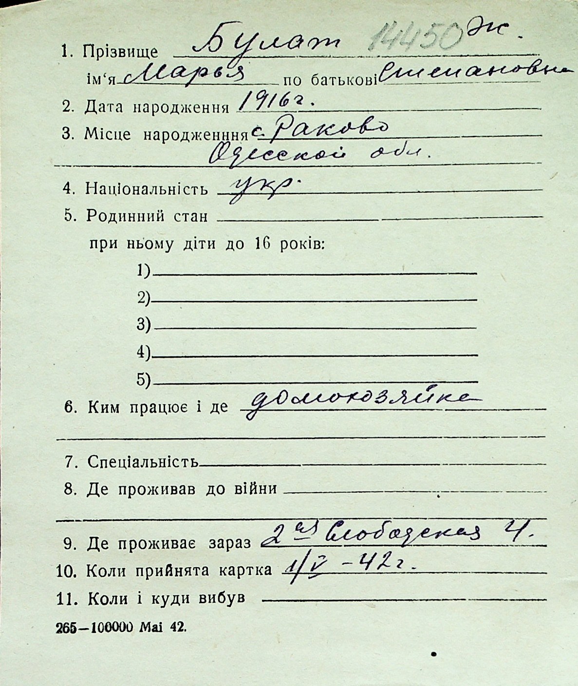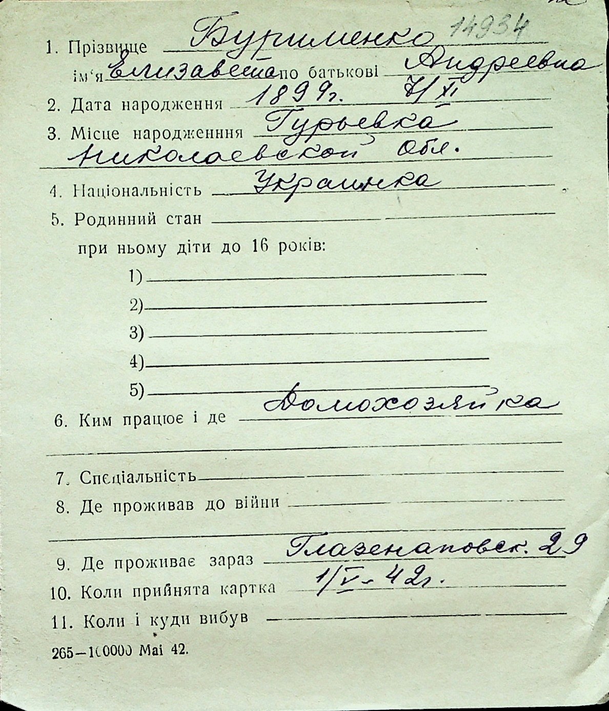 ◦ ◦ Перелік карток на осіб, які мешкали у м. Миколаїв у період окупації 1941–1944 років