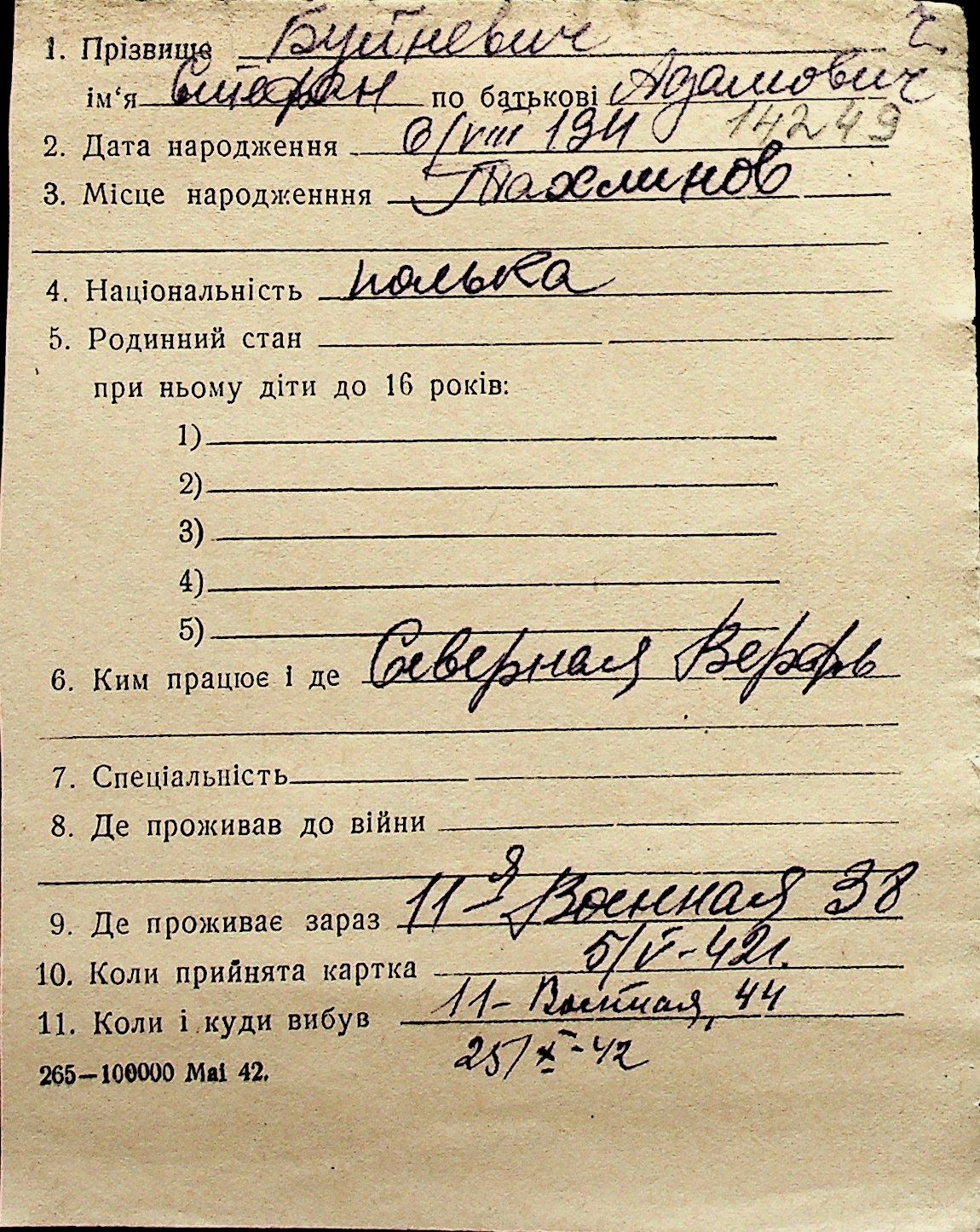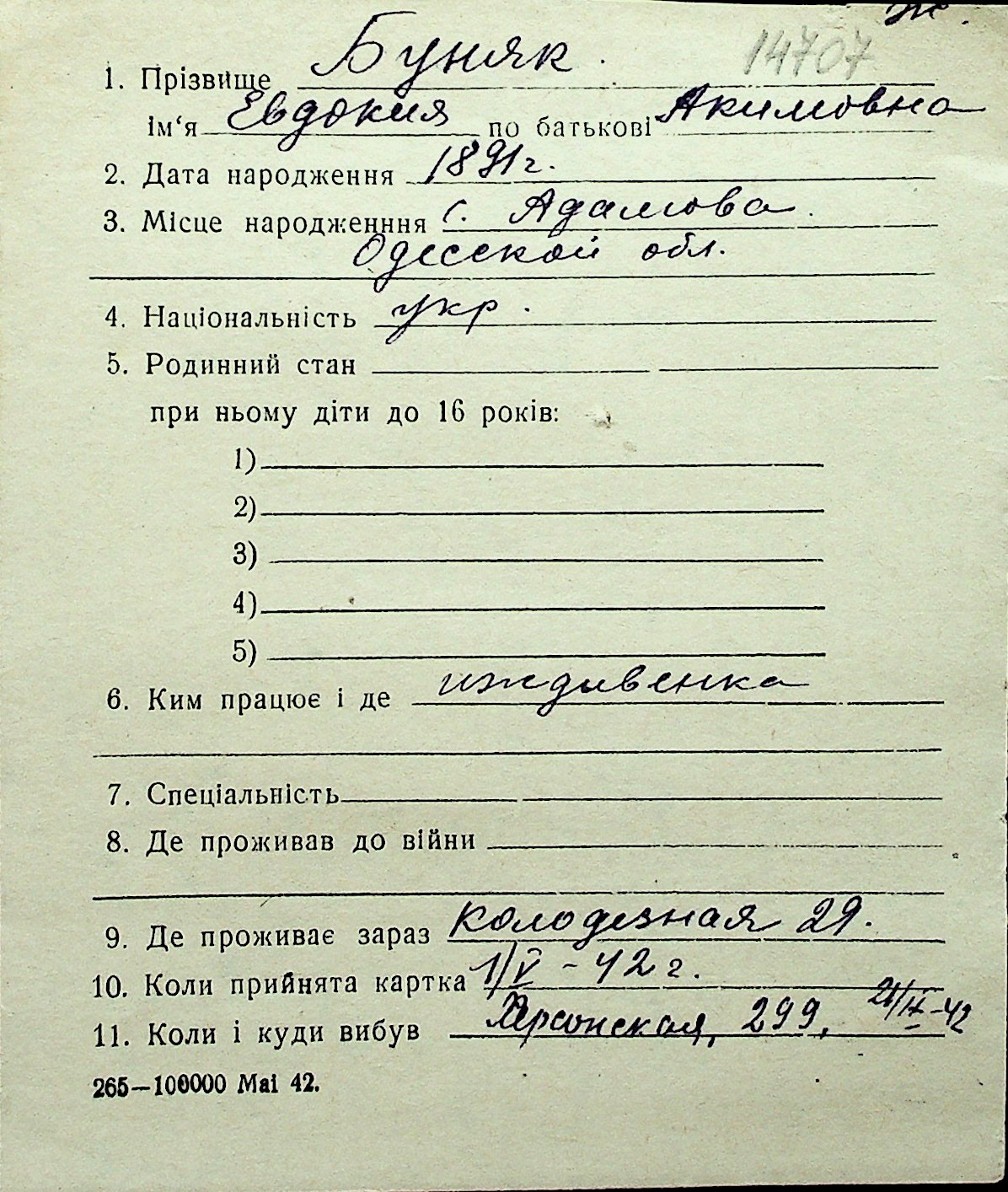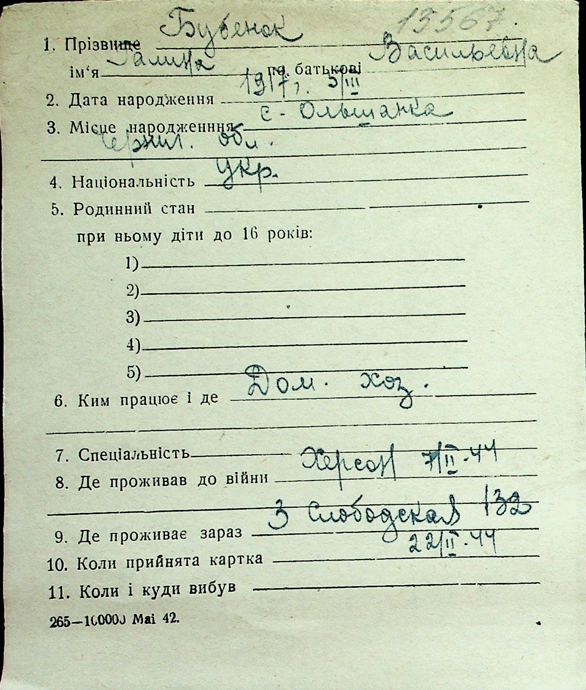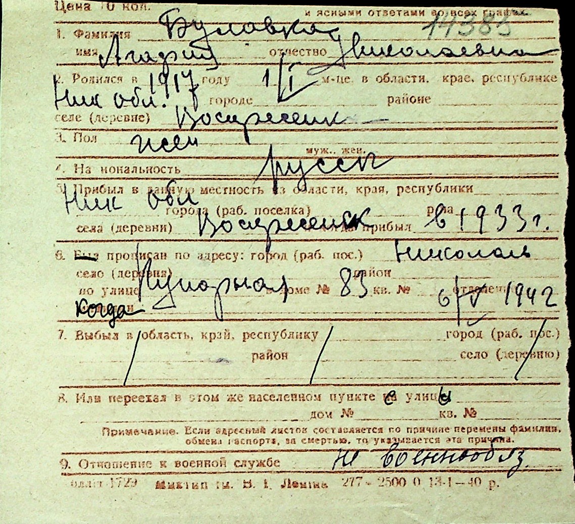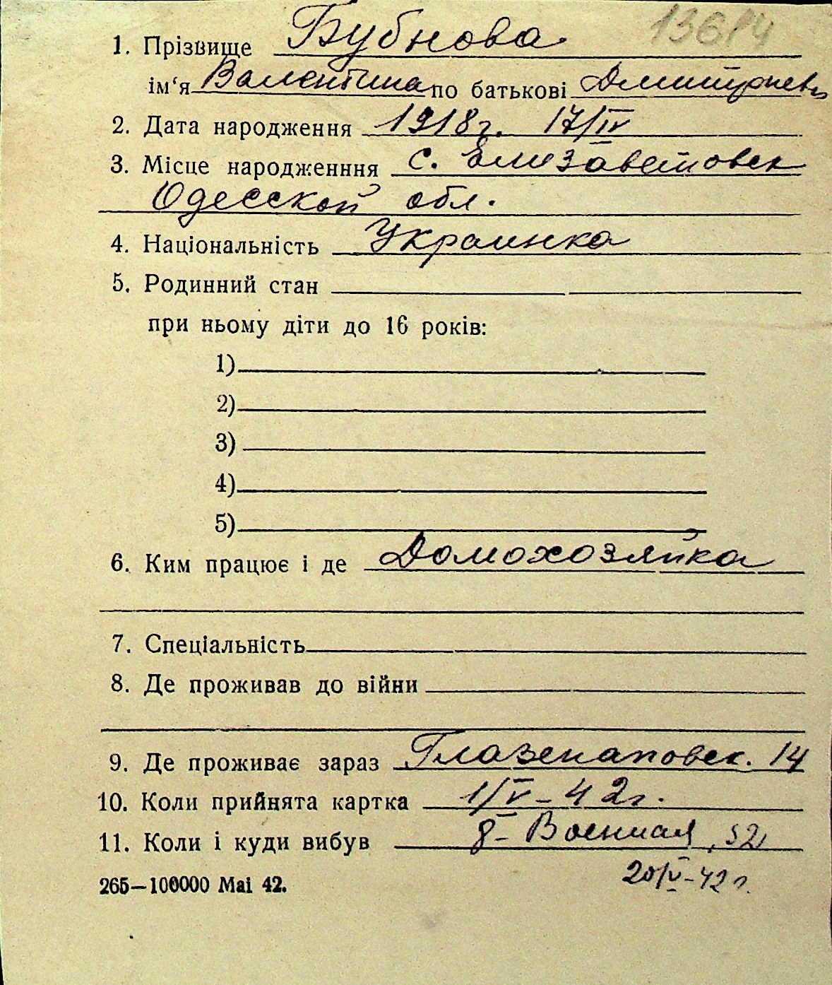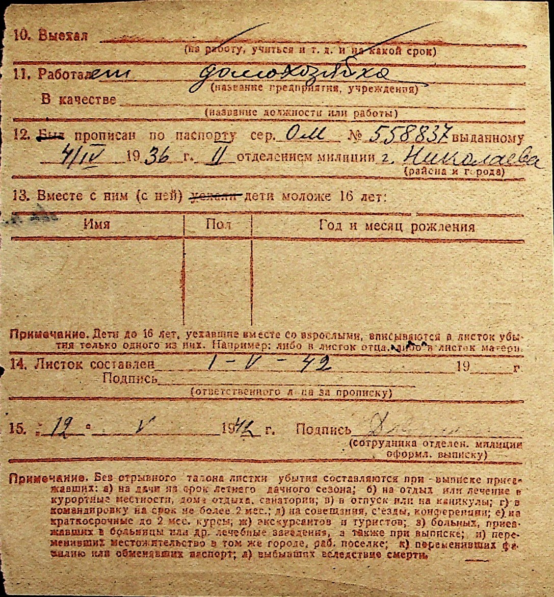 ◦ ◦ Перелік карток на осіб, які мешкали у м. Миколаїв у період окупації 1941–1944 років