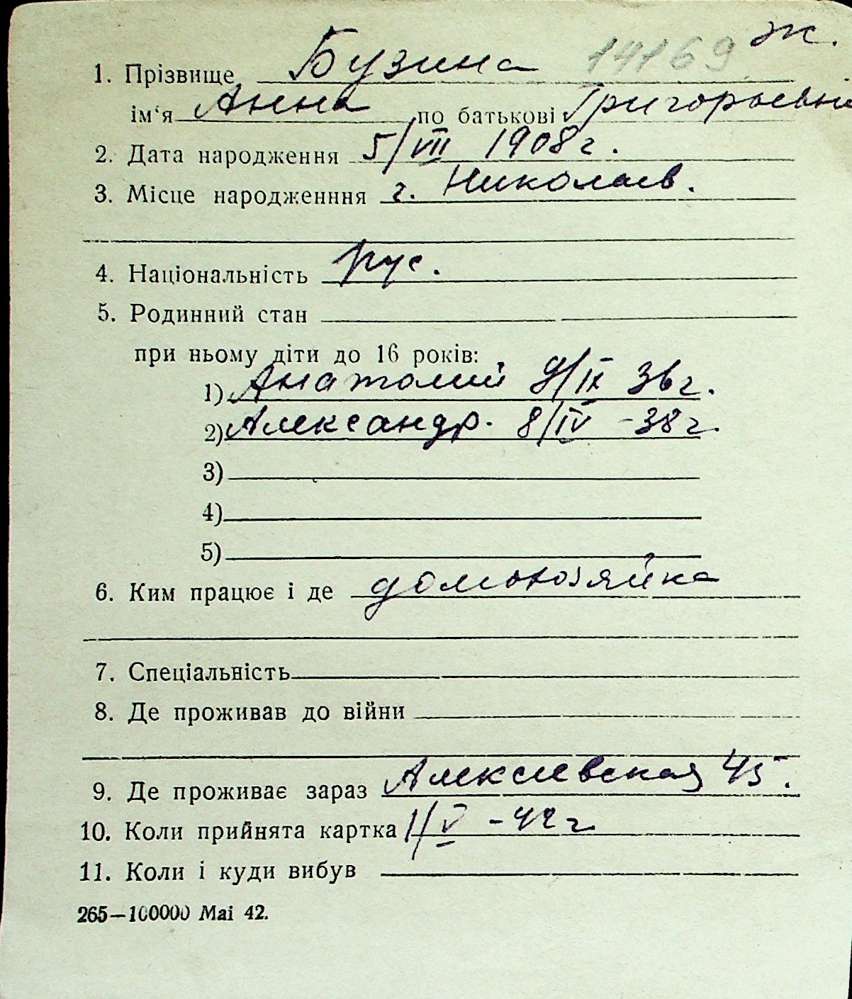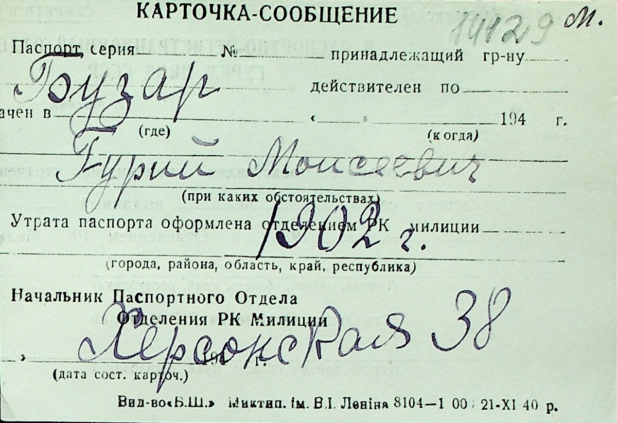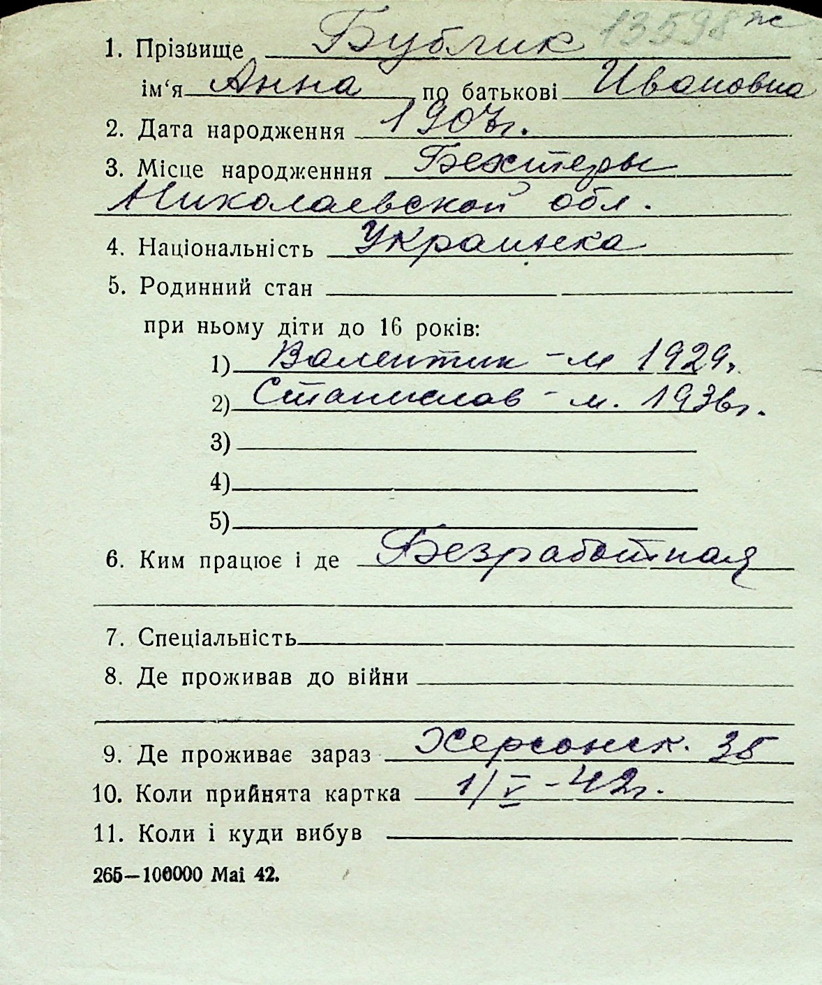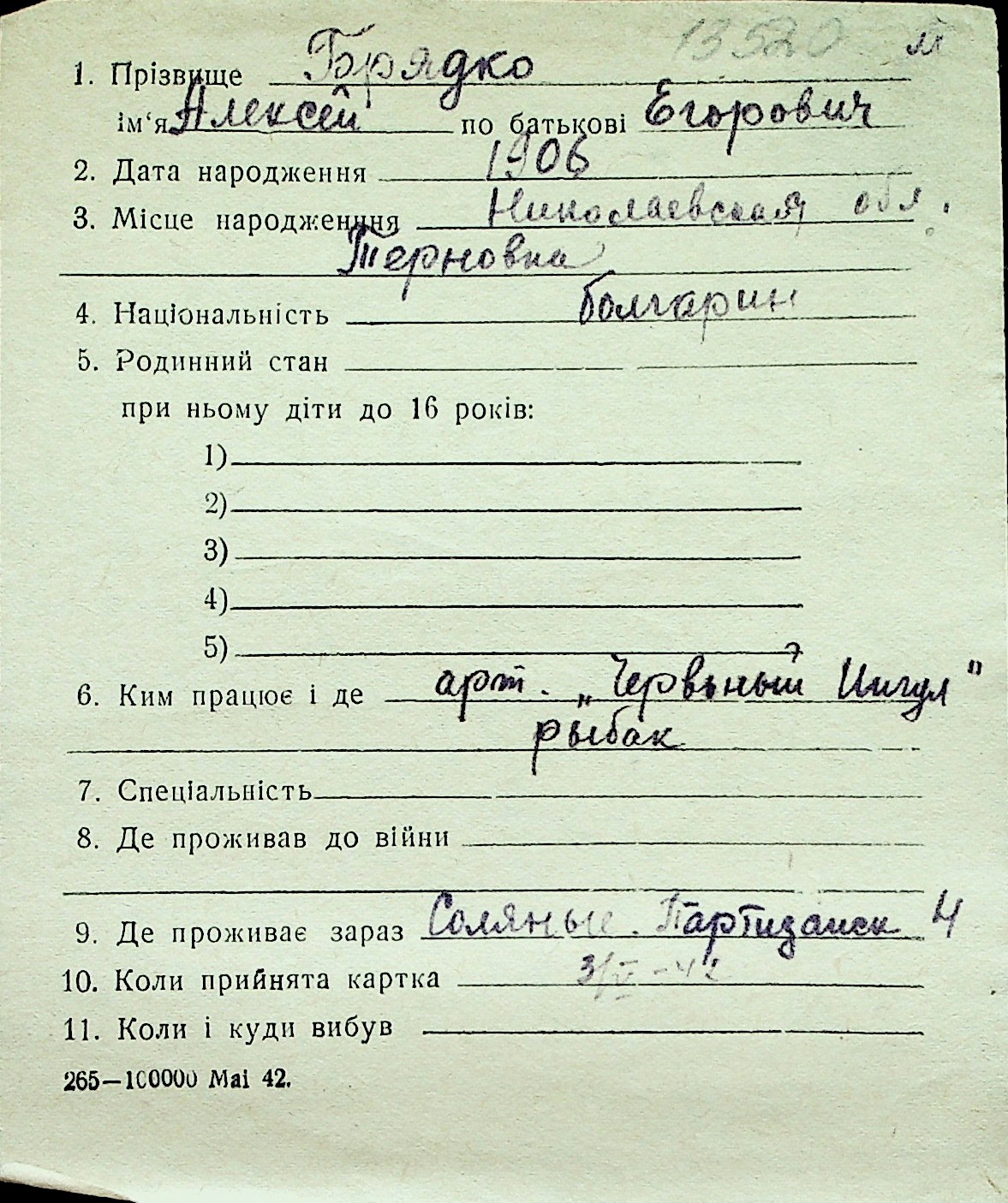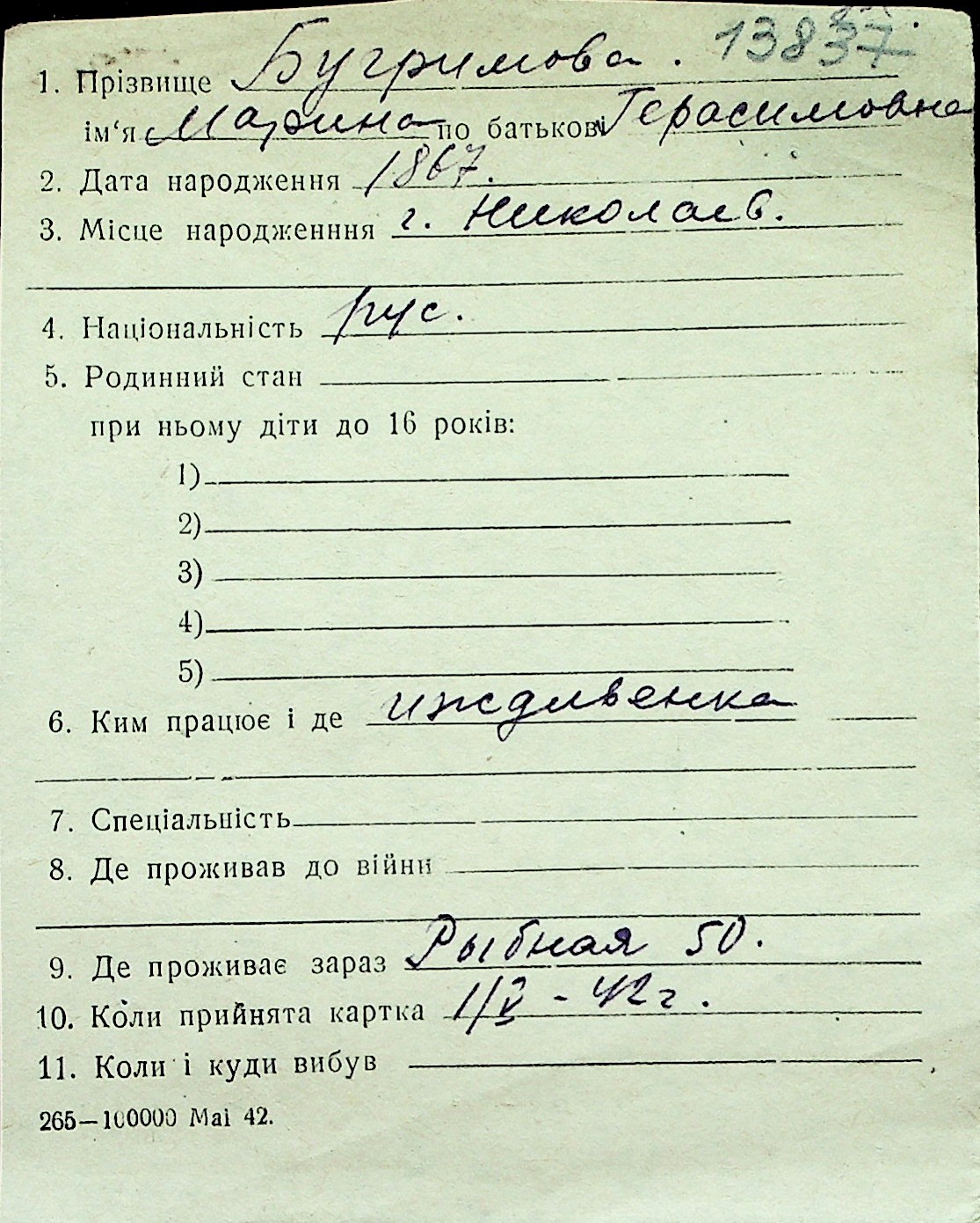 ◦ ◦ Перелік карток на осіб, які мешкали у м. Миколаїв у період окупації 1941–1944 років