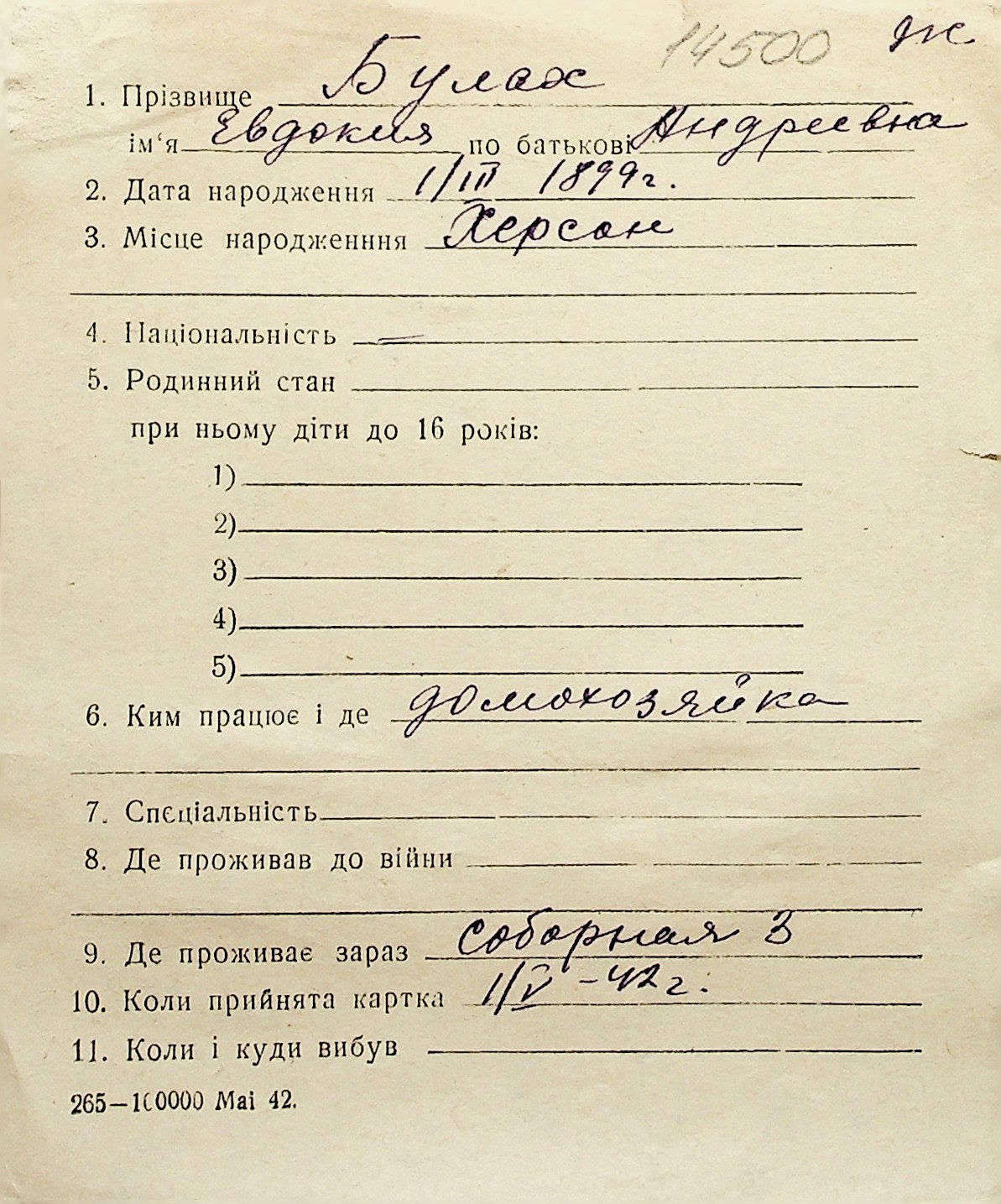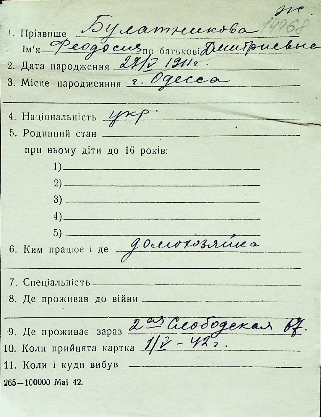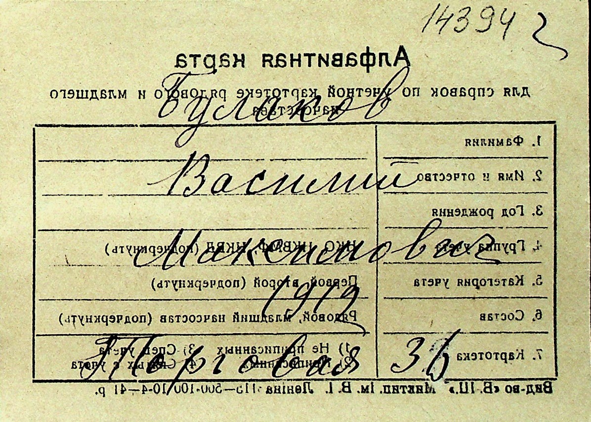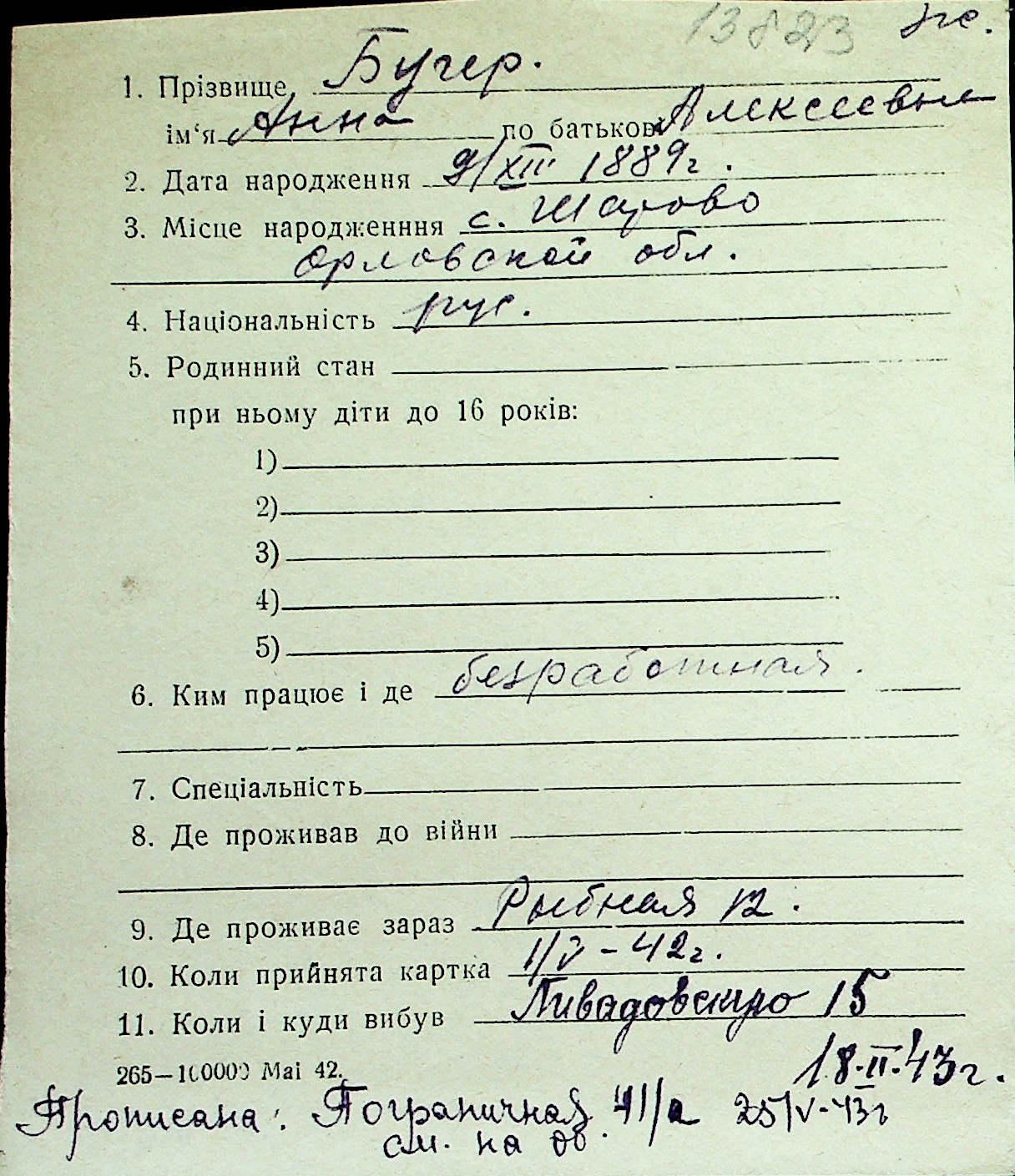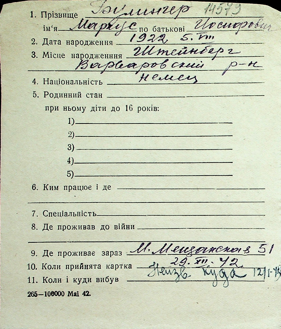 ◦ ◦ Перелік карток на осіб, які мешкали у м. Миколаїв у період окупації 1941–1944 років