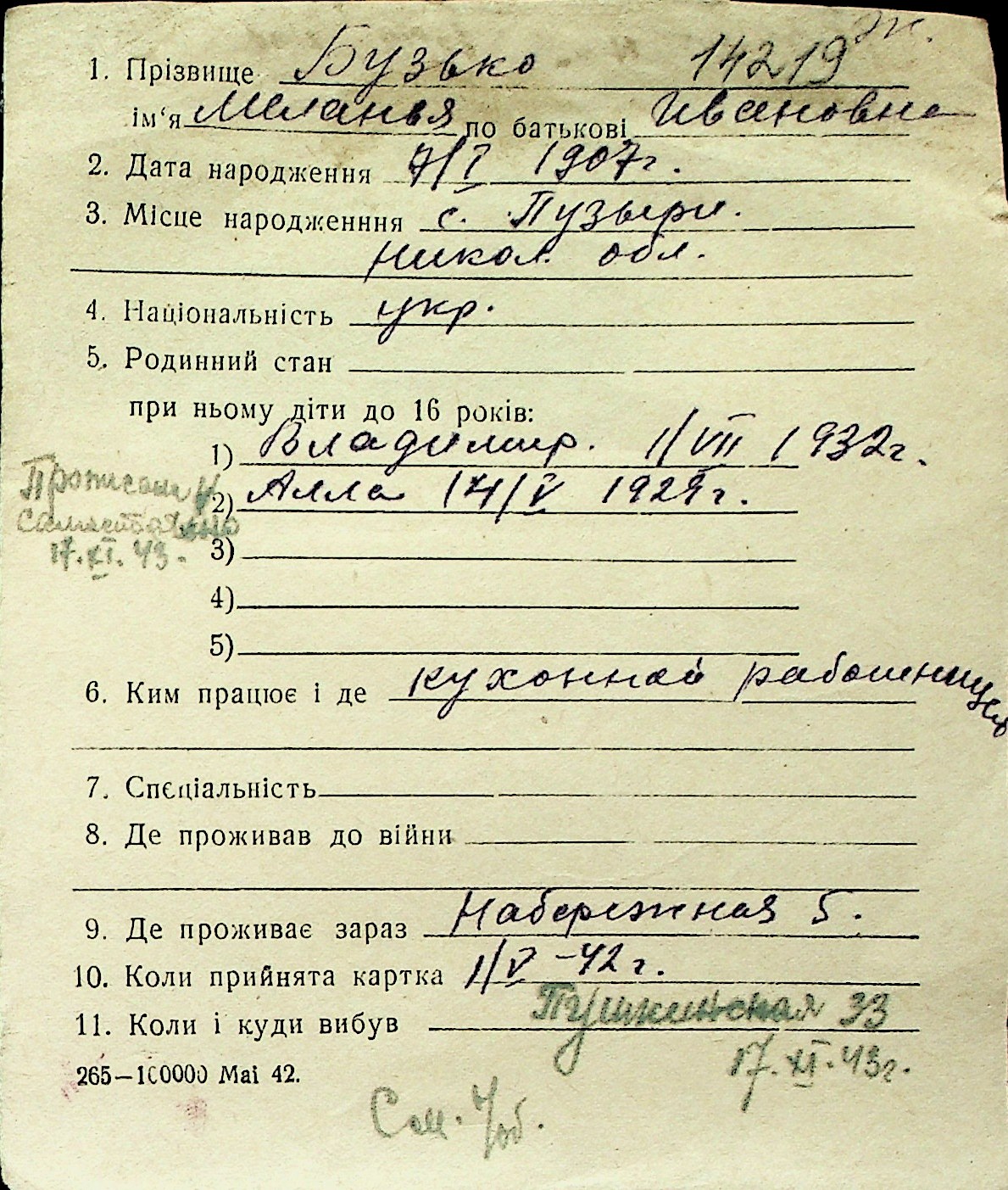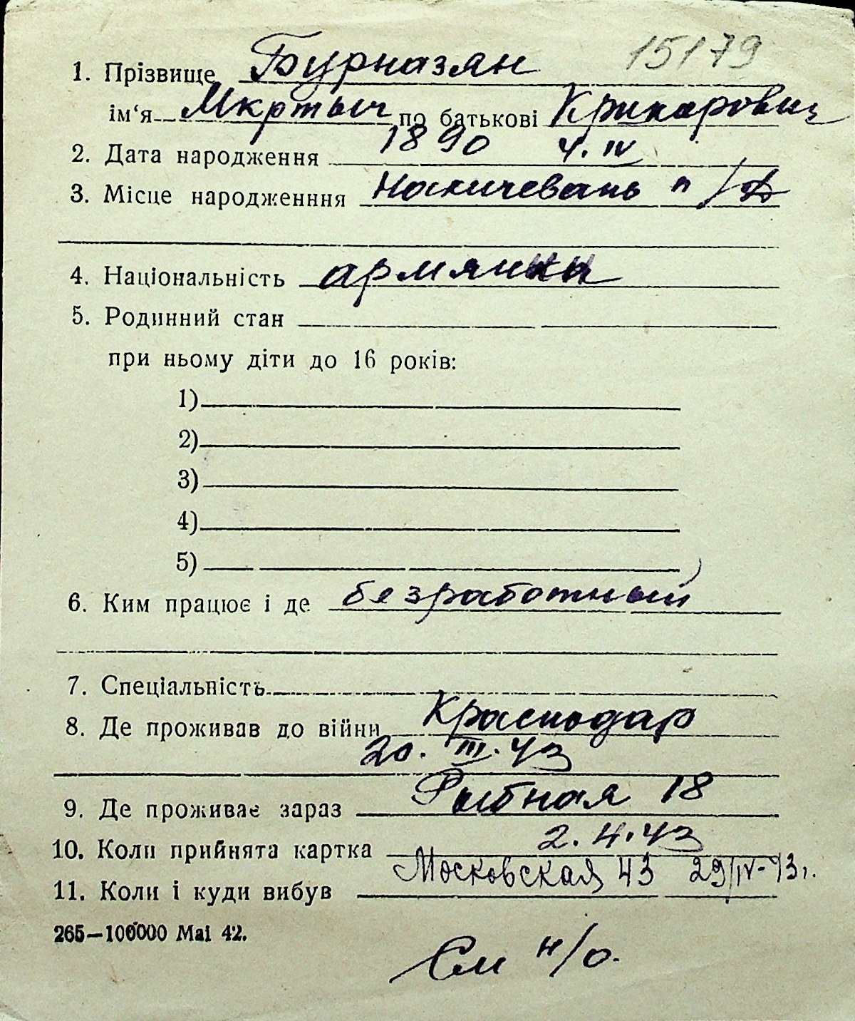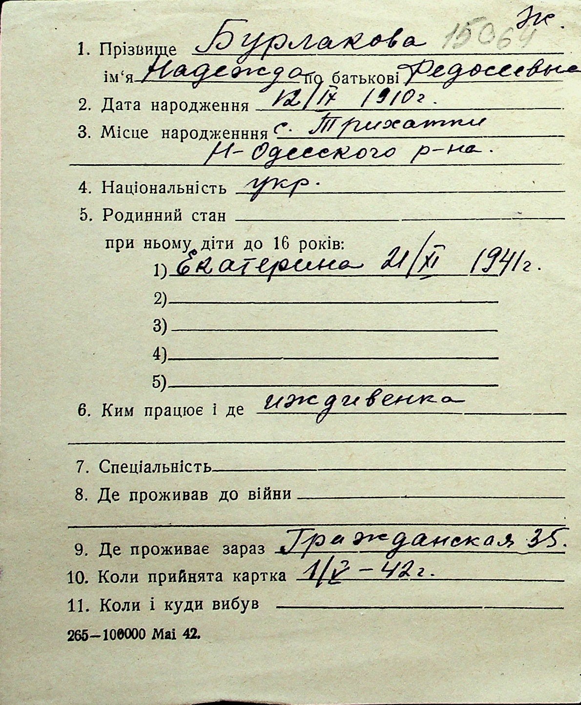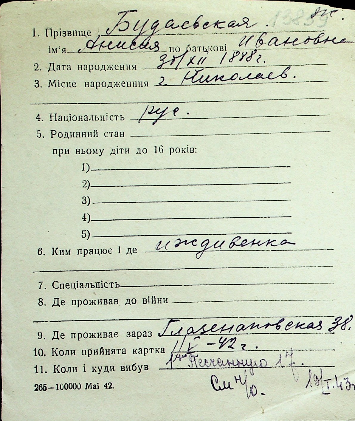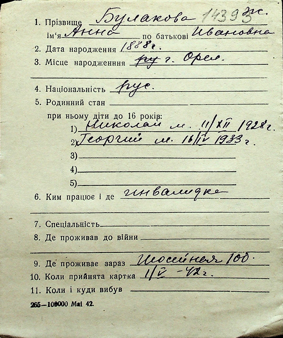 ◦ ◦ Перелік карток на осіб, які мешкали у м. Миколаїв у період окупації 1941–1944 років
