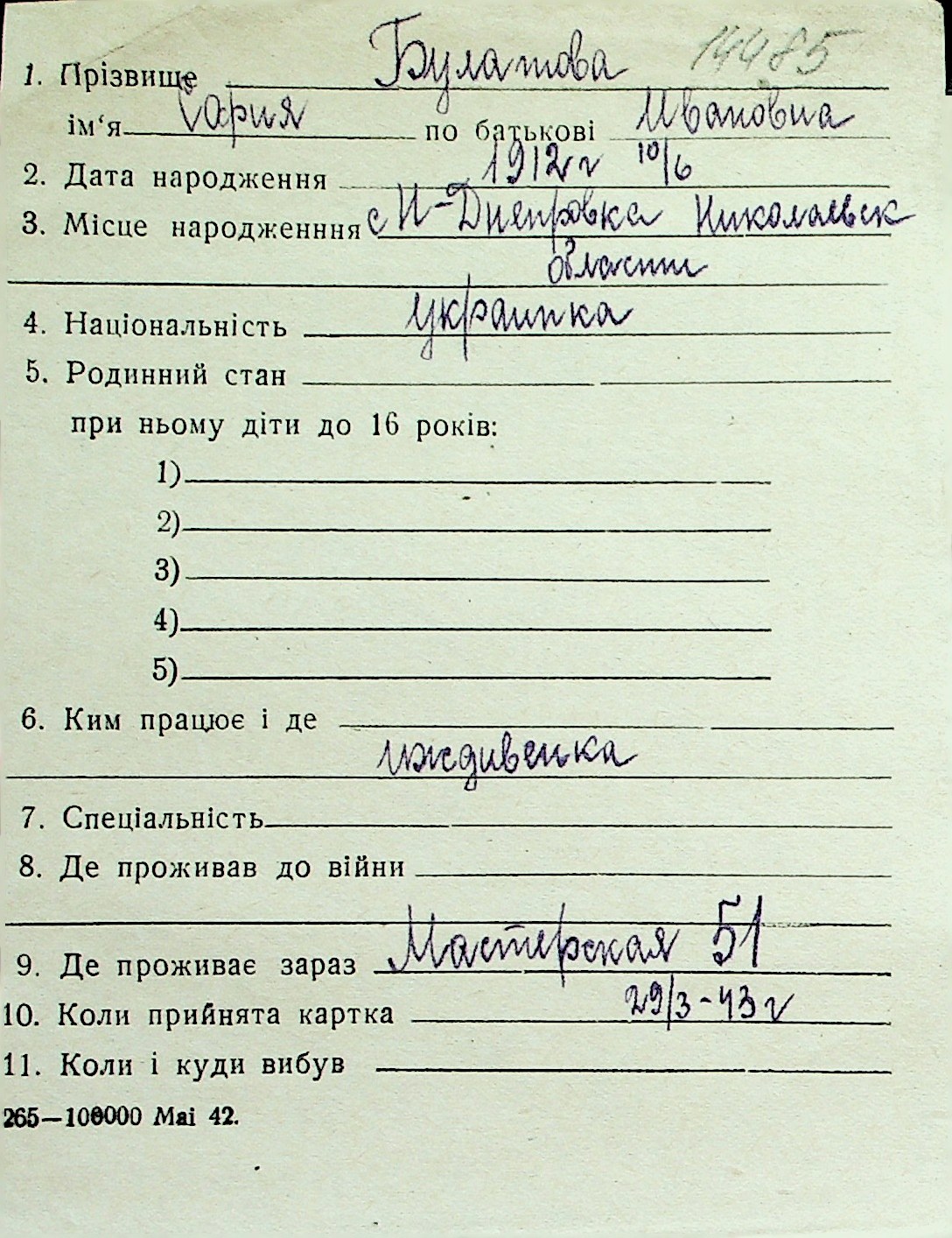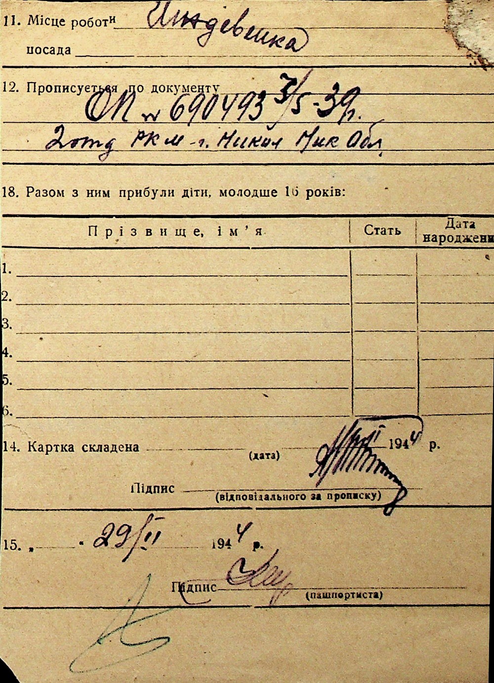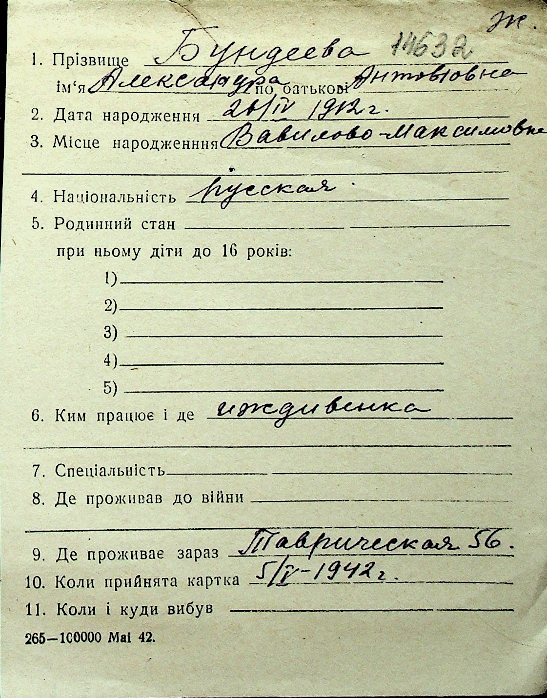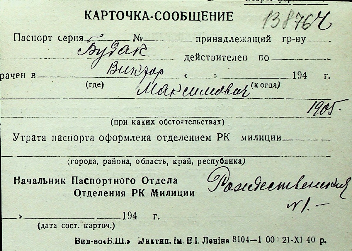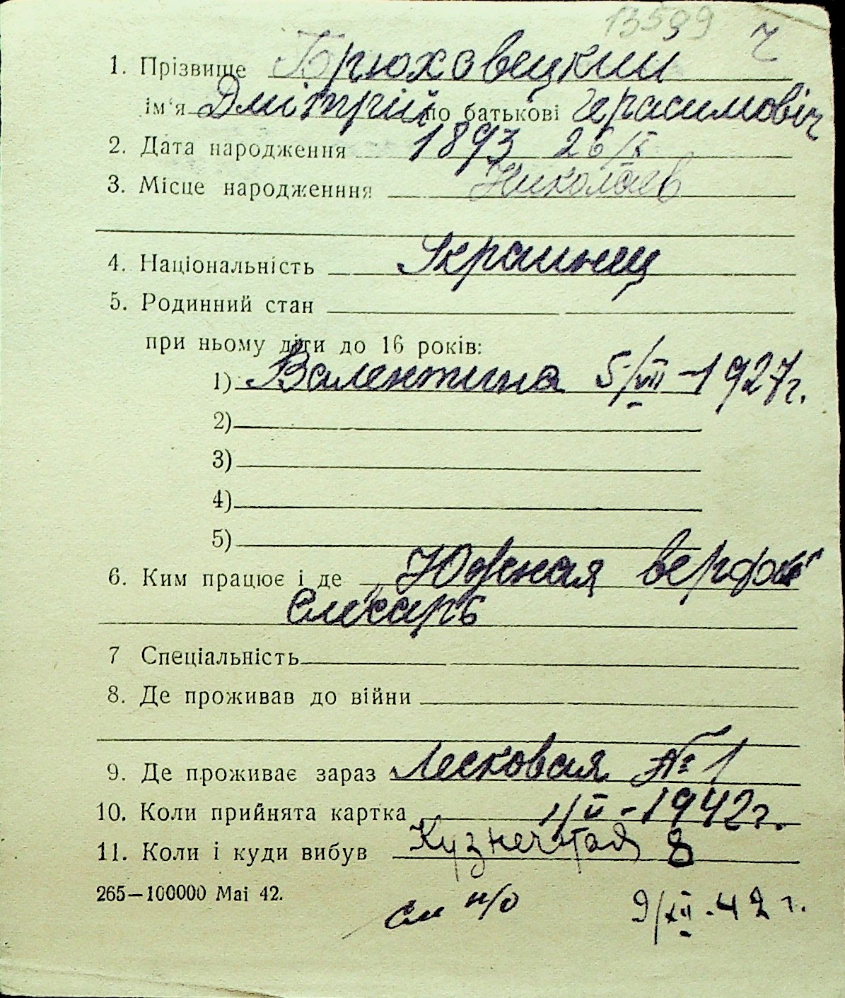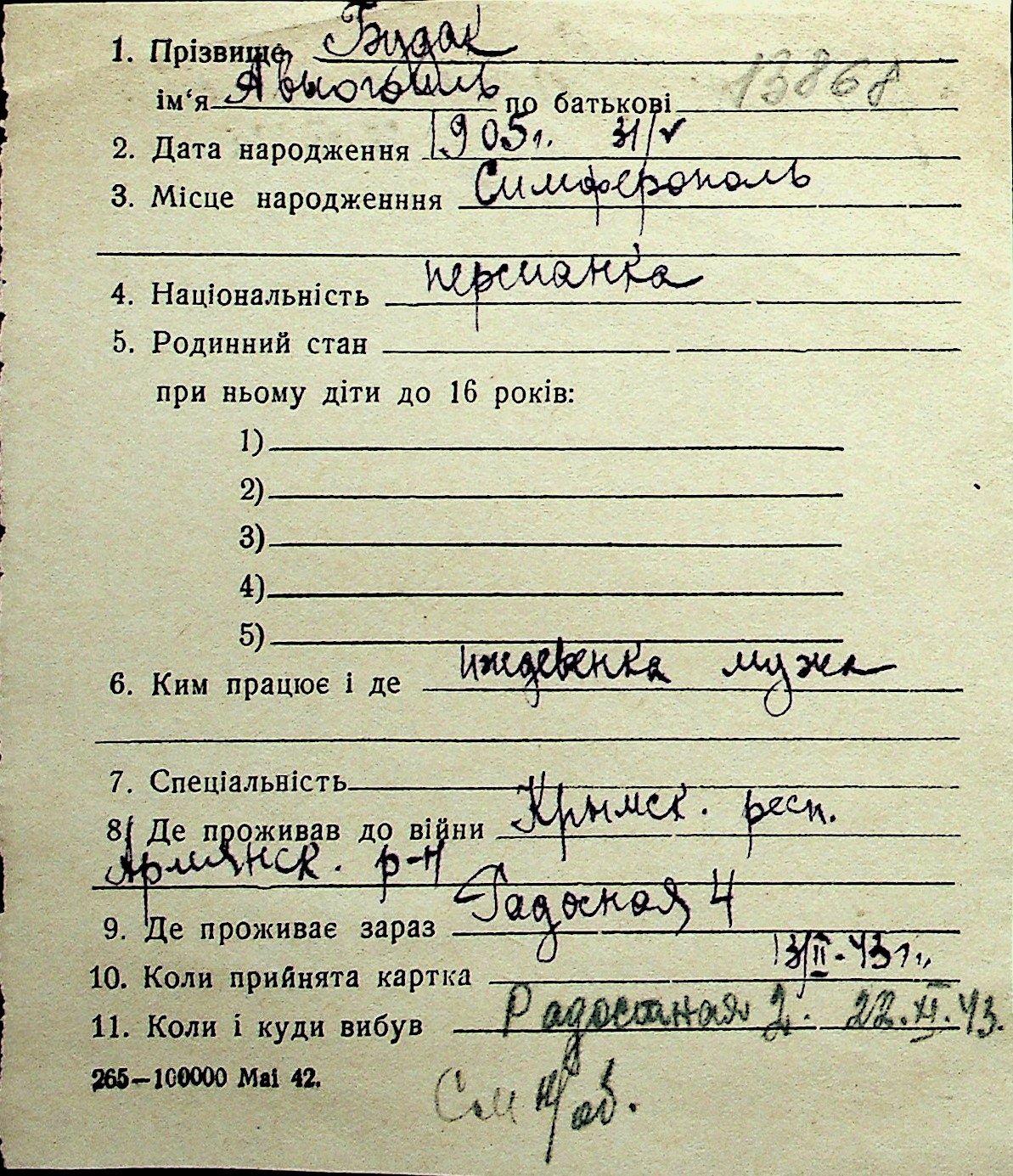◦ ◦ Перелік карток на осіб, які мешкали у м. Миколаїв у період окупації 1941–1944 років