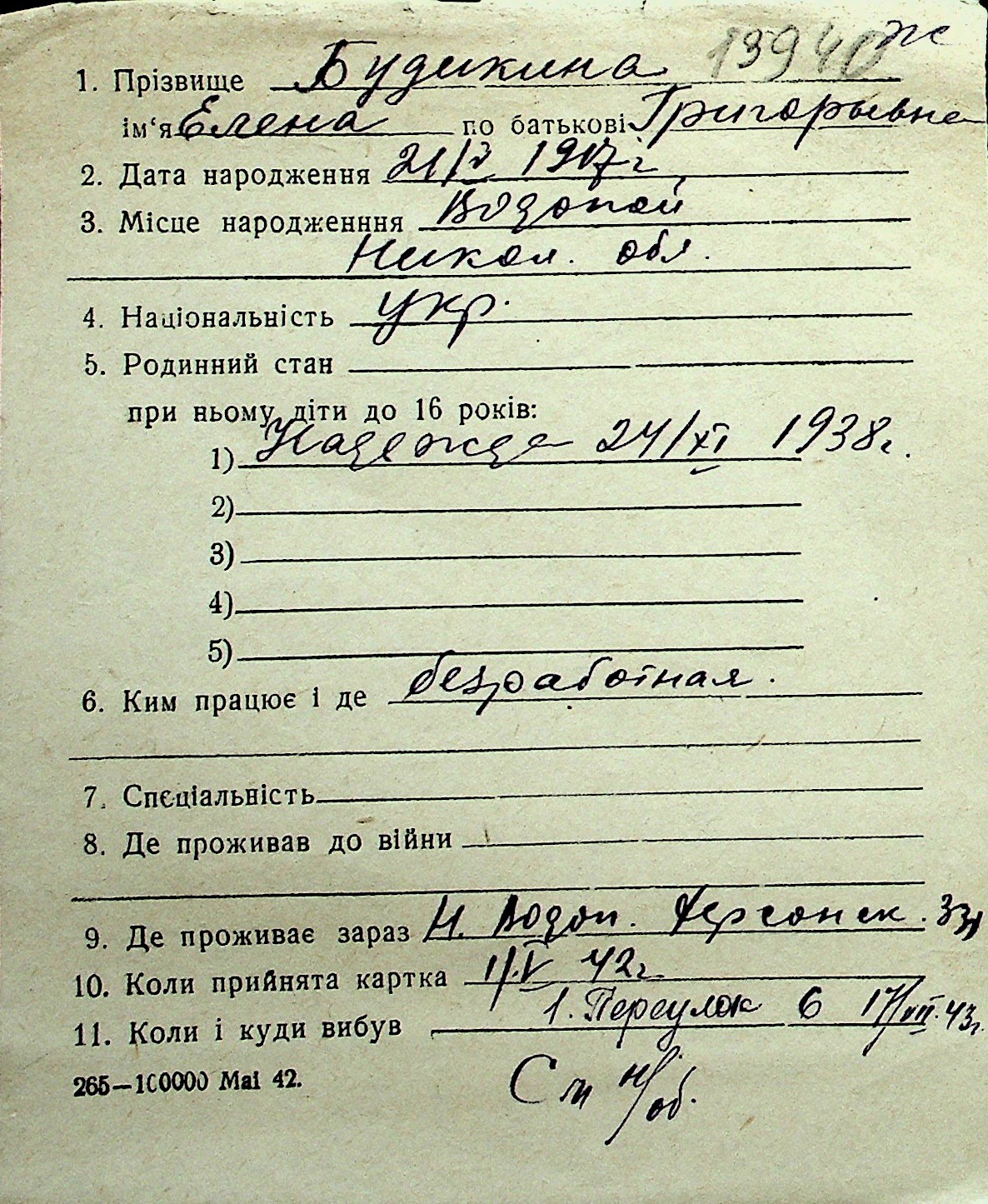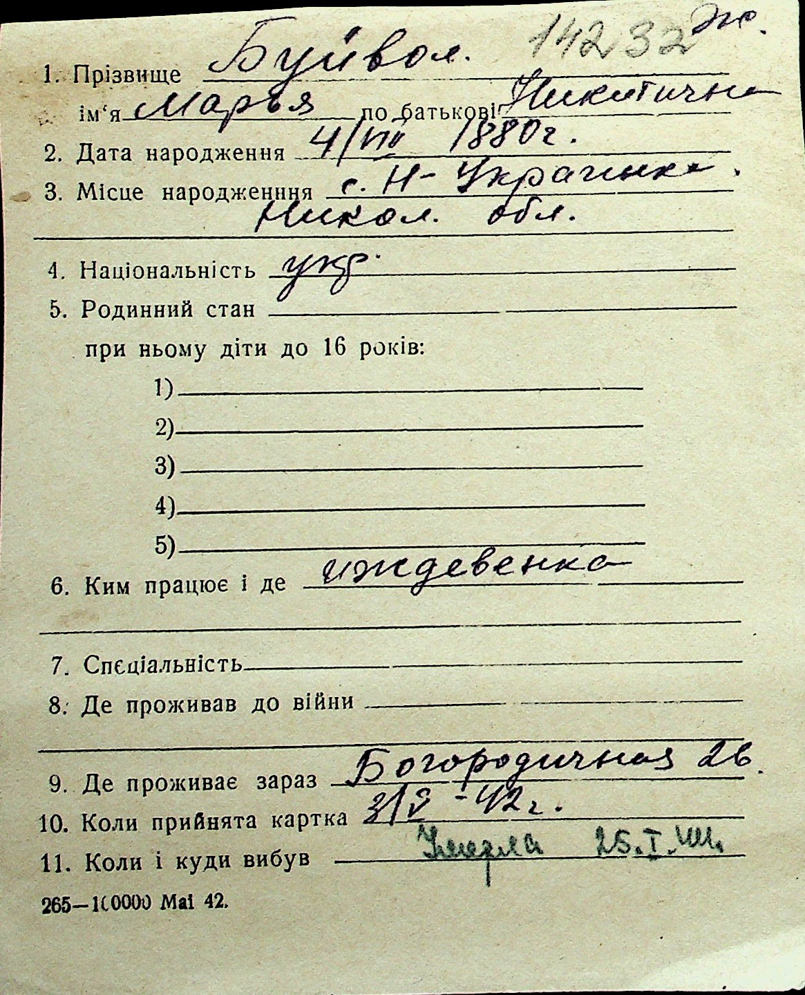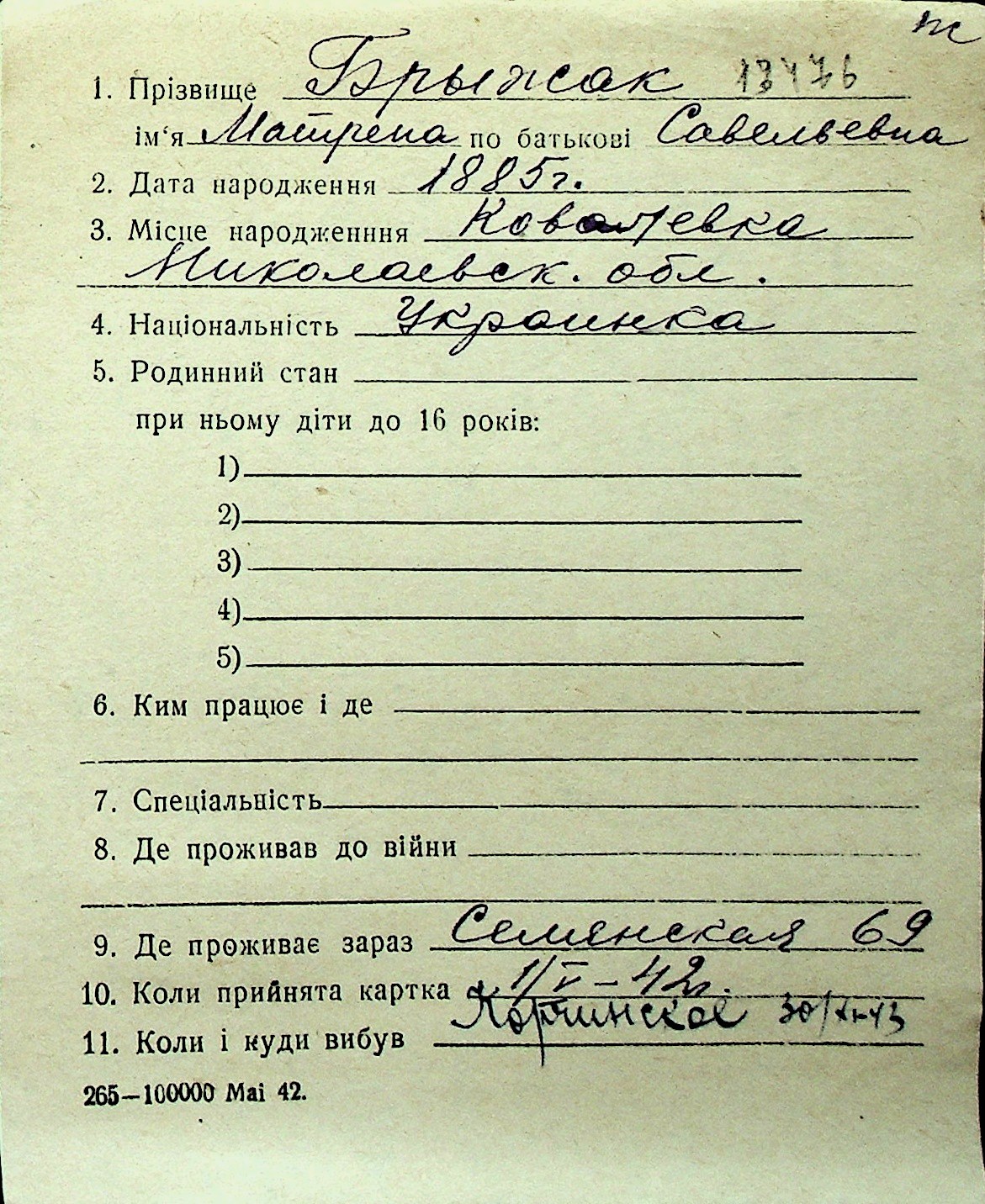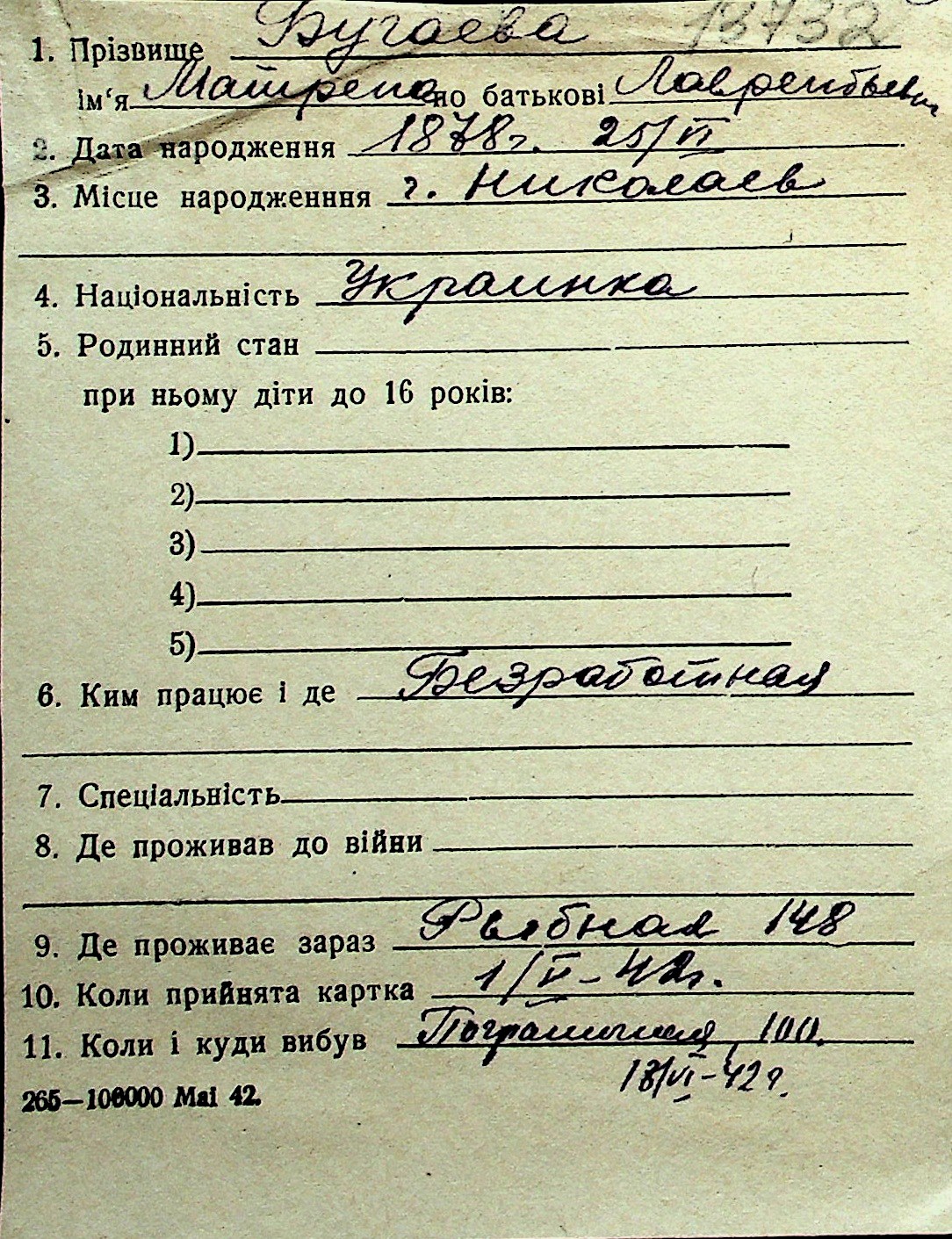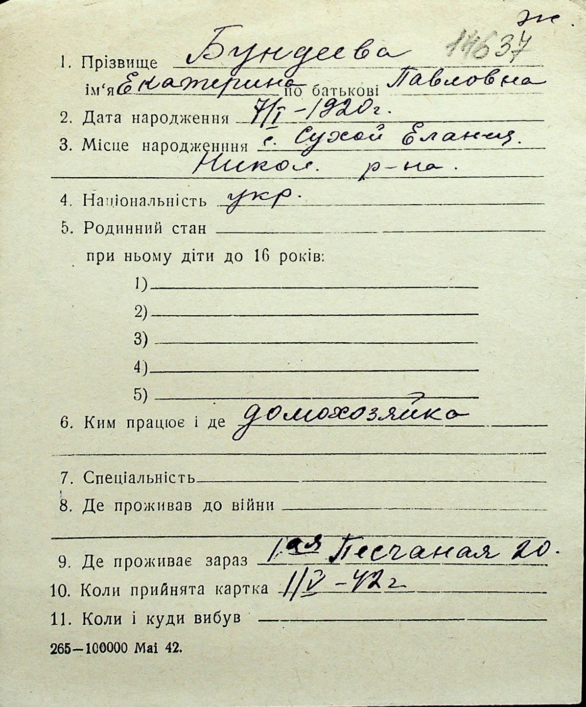 ◦ ◦ Перелік карток на осіб, які мешкали у м. Миколаїв у період окупації 1941–1944 років