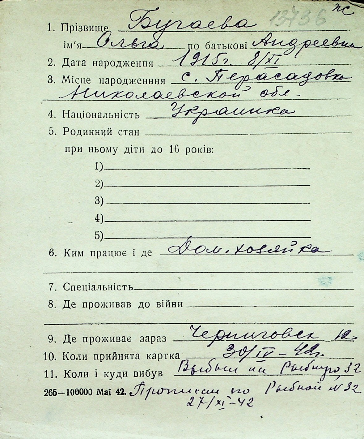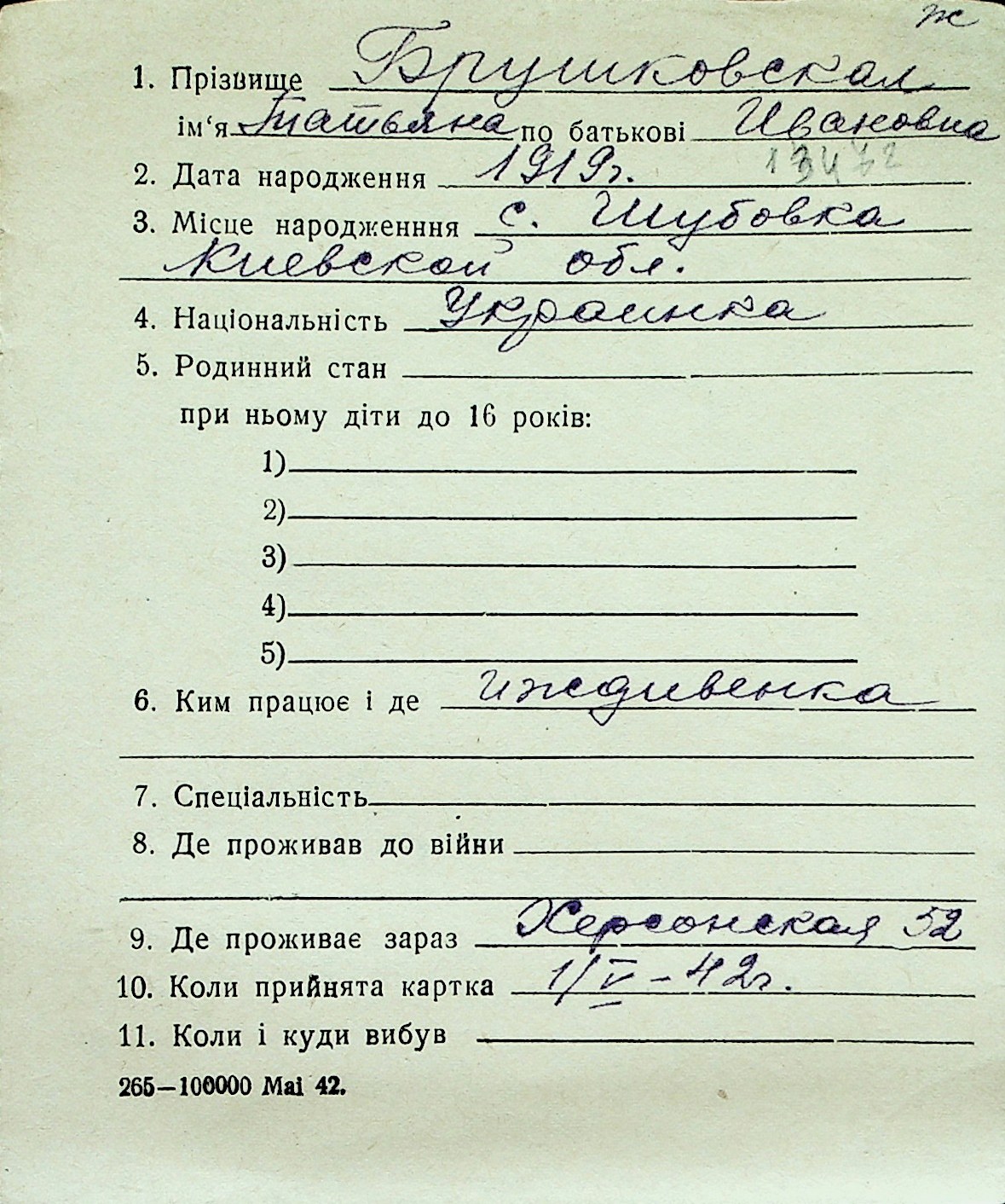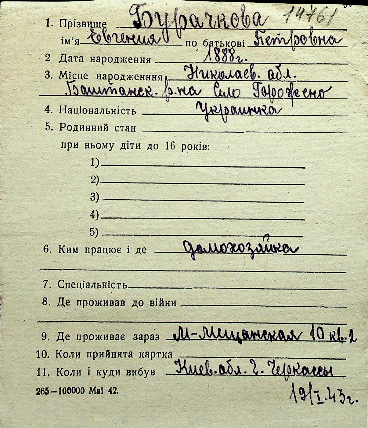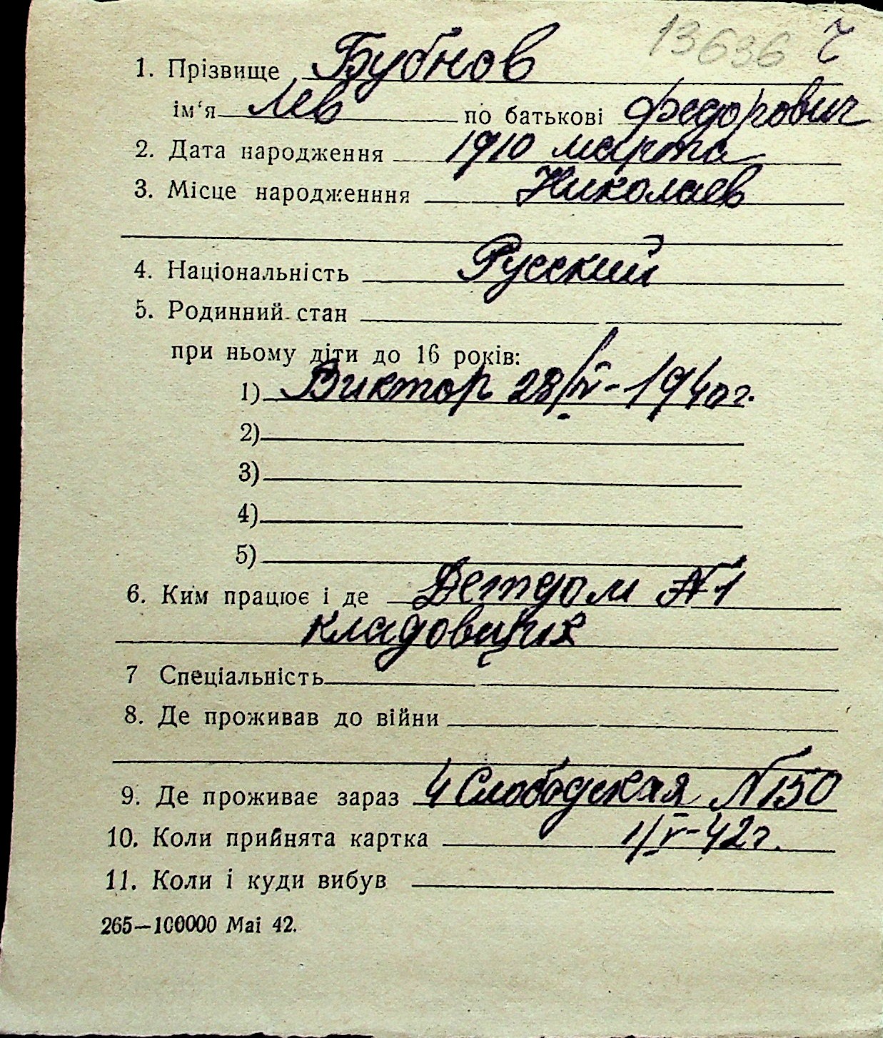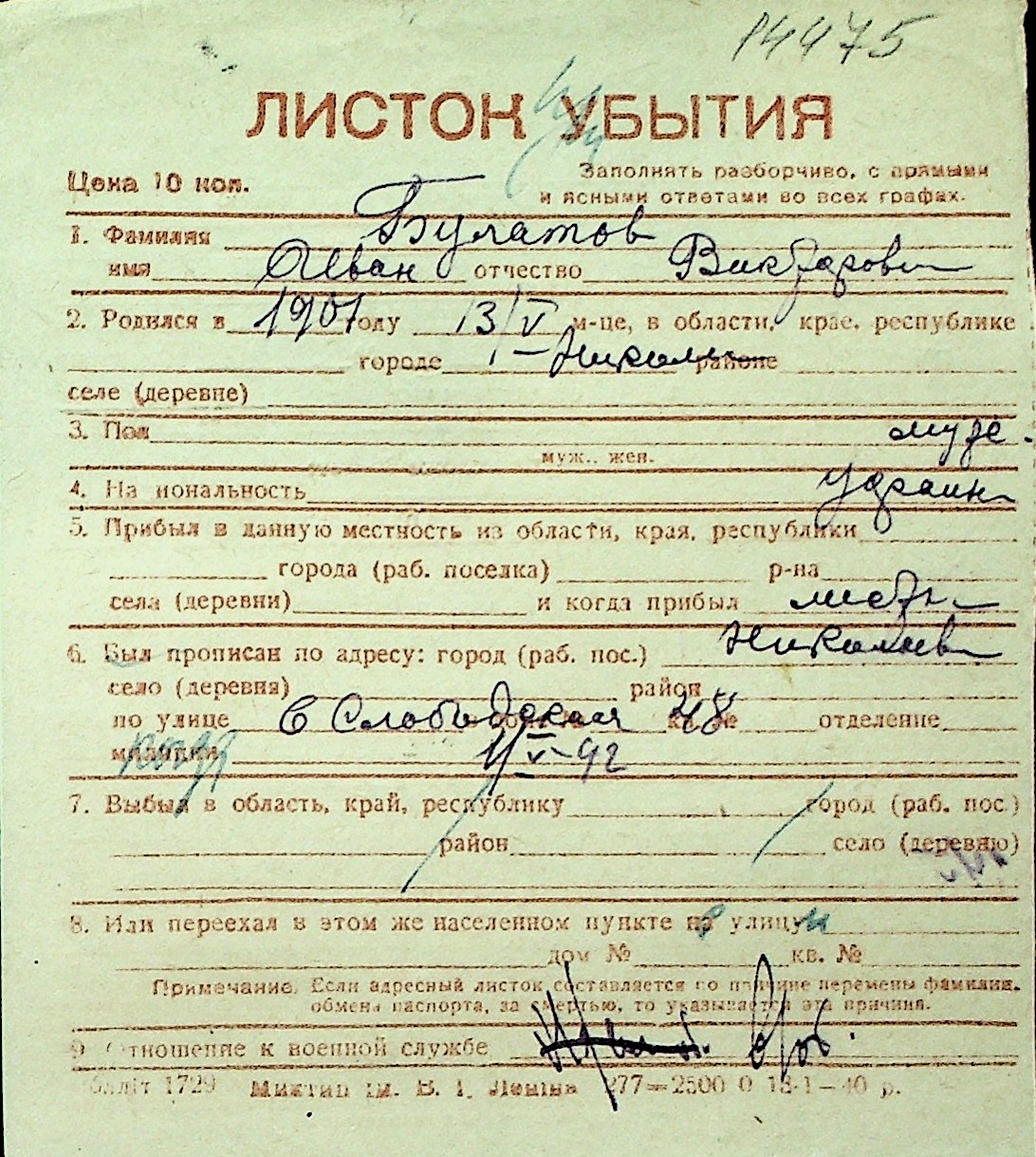 ◦ ◦ Перелік карток на осіб, які мешкали у м. Миколаїв у період окупації 1941–1944 років