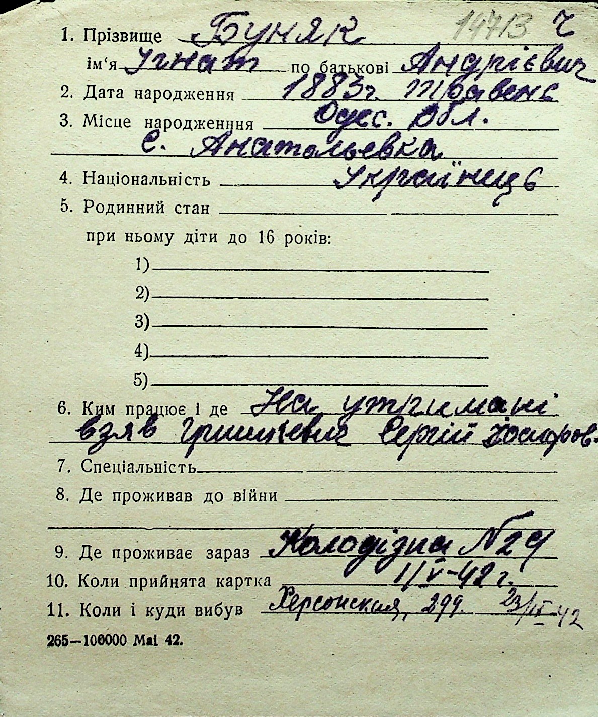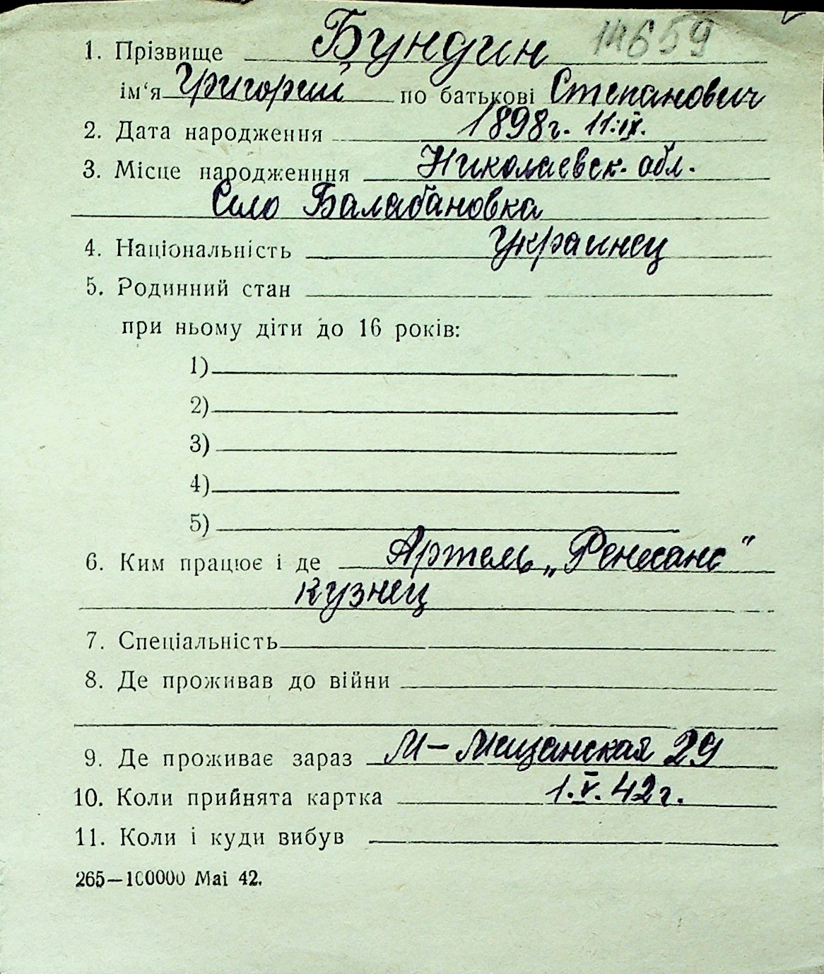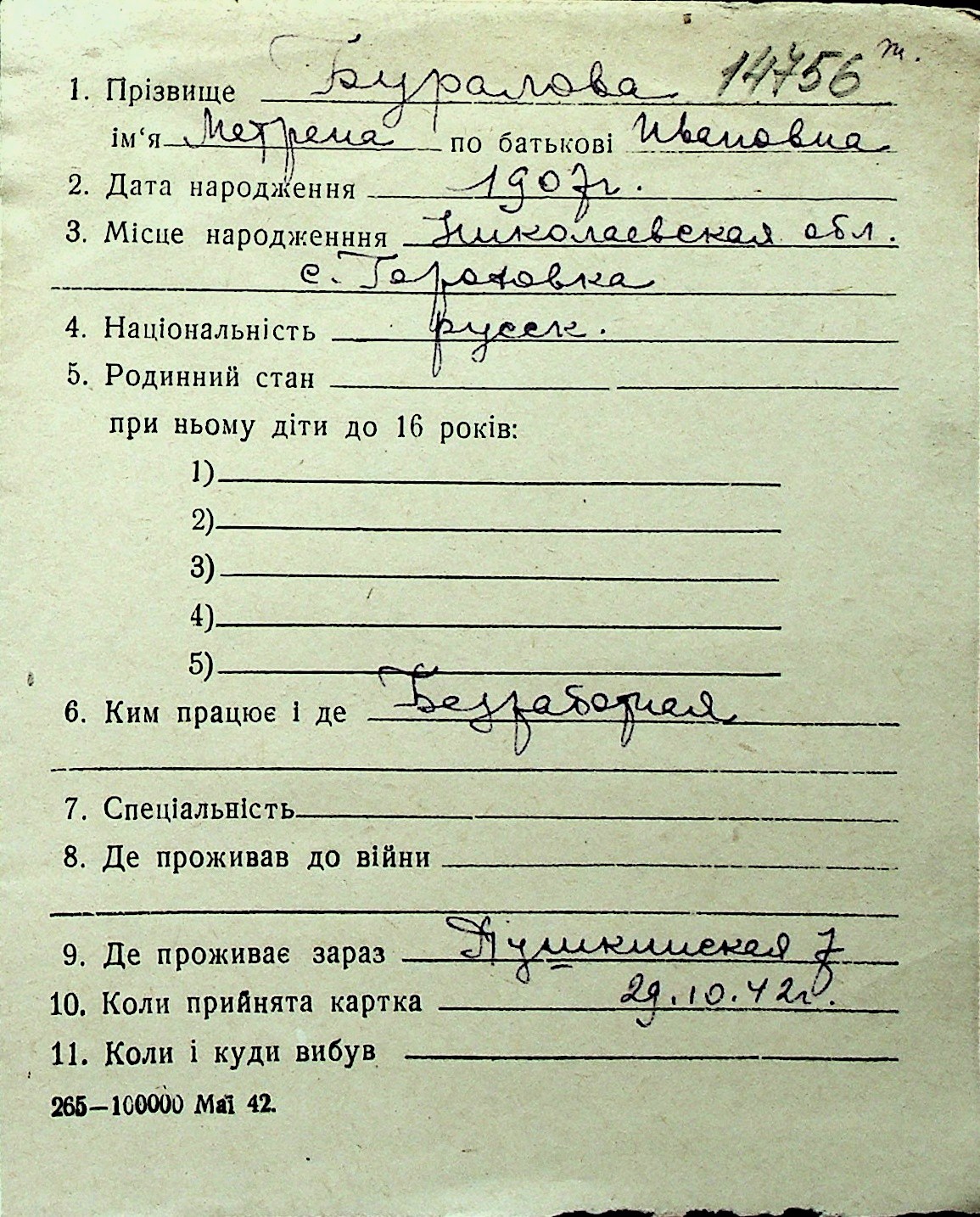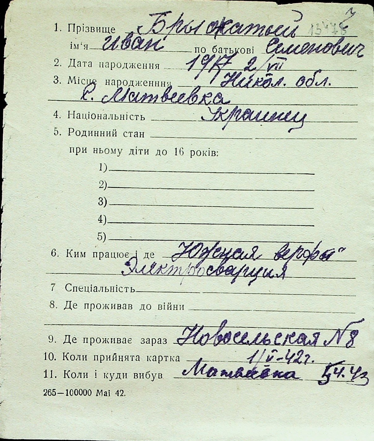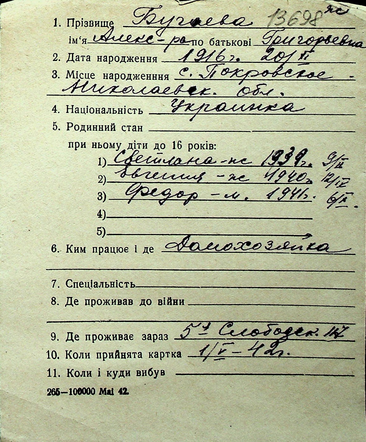 ◦ ◦ Перелік карток на осіб, які мешкали у м. Миколаїв у період окупації 1941–1944 років