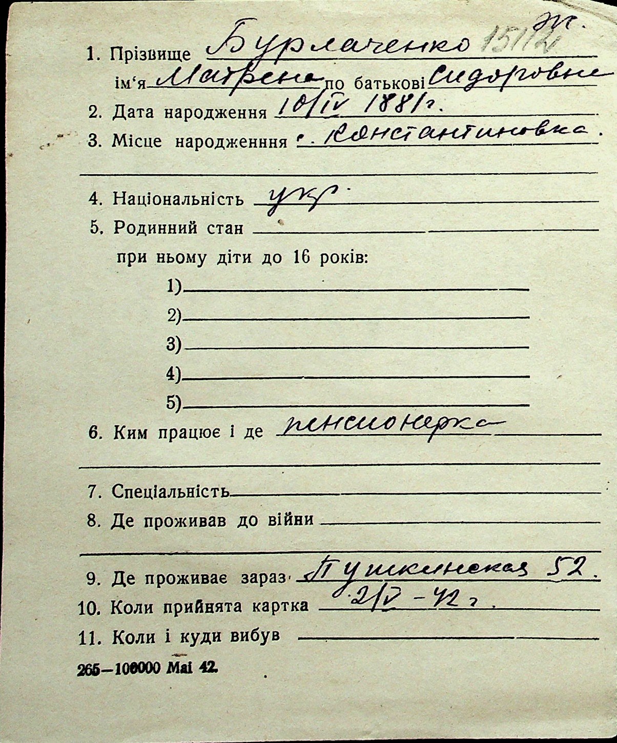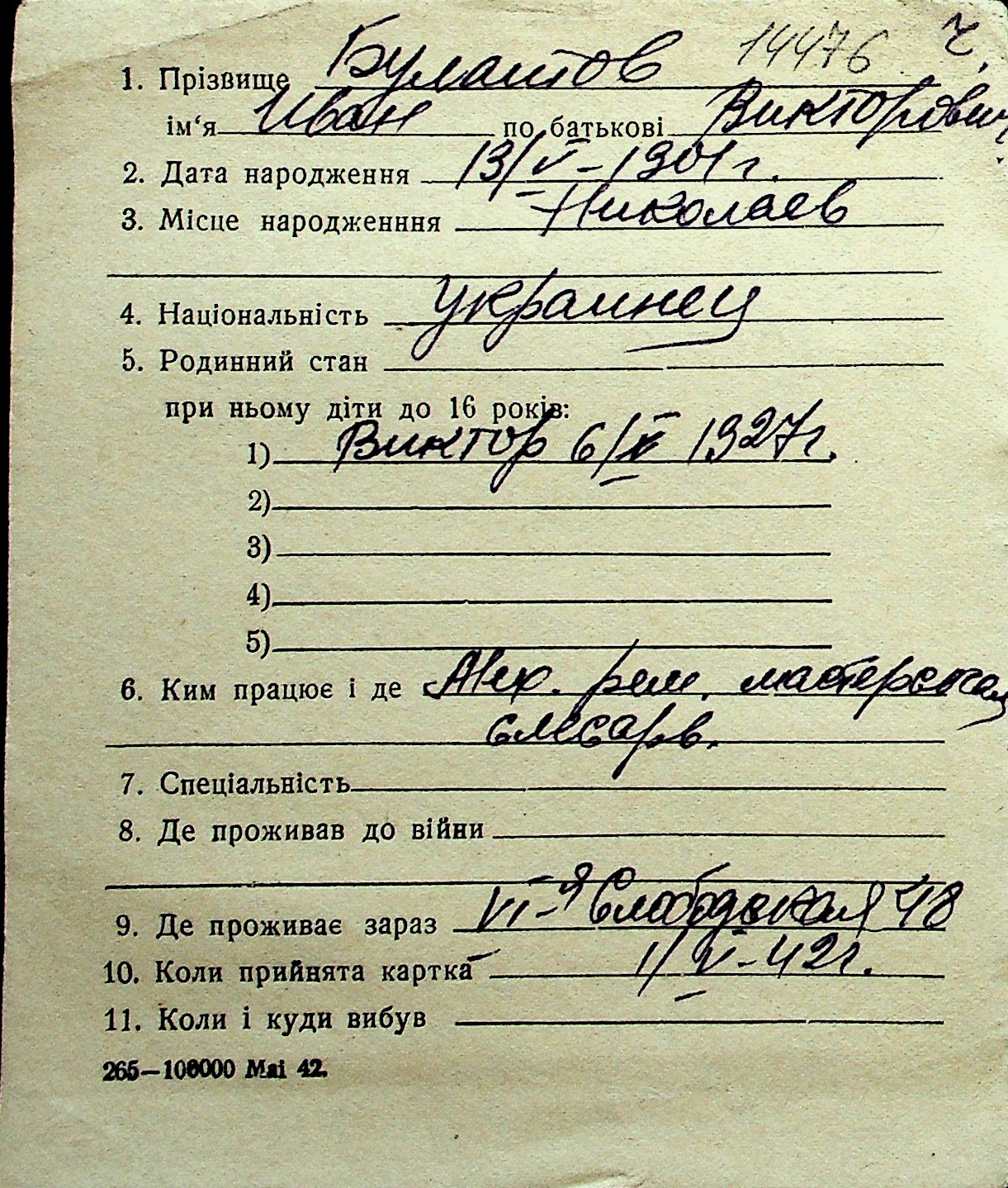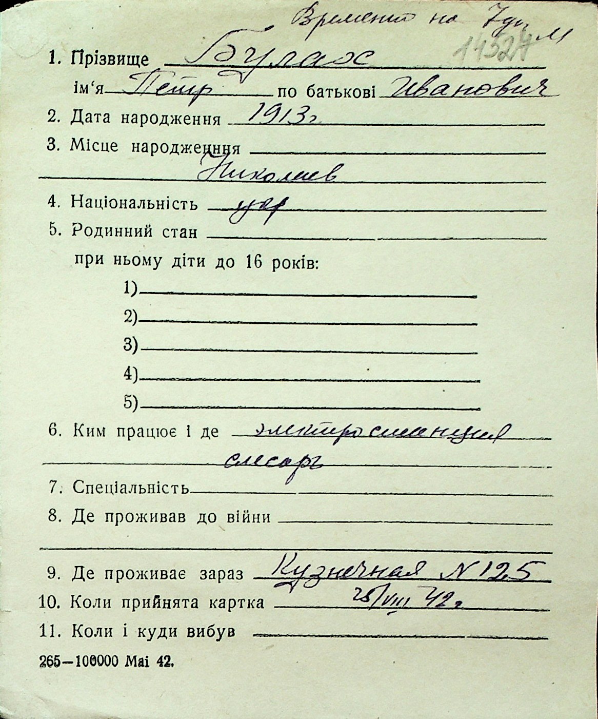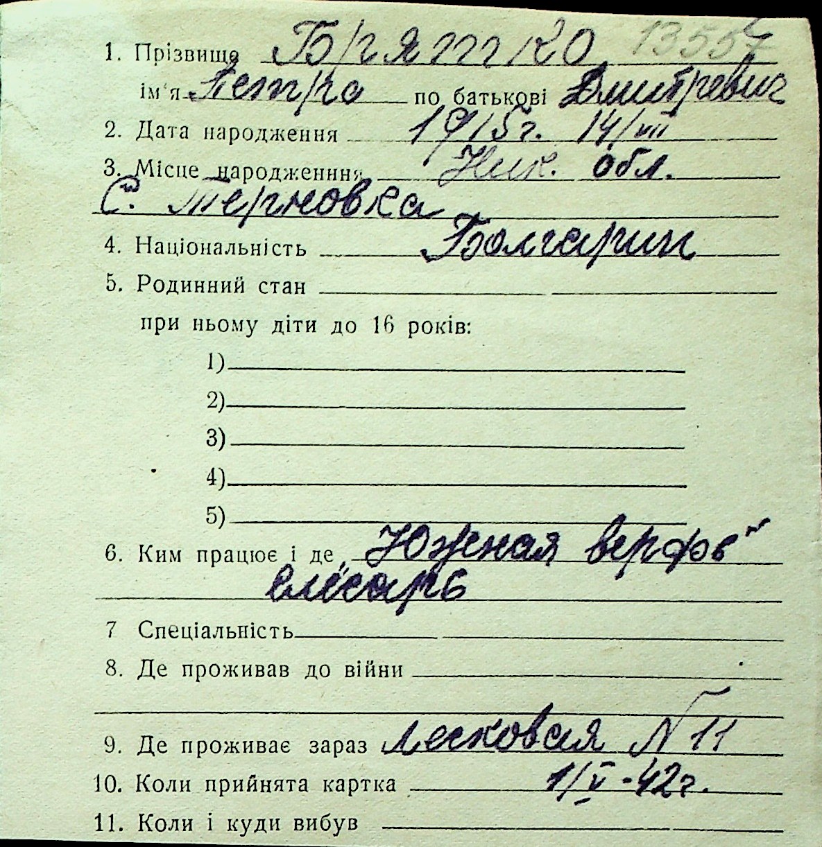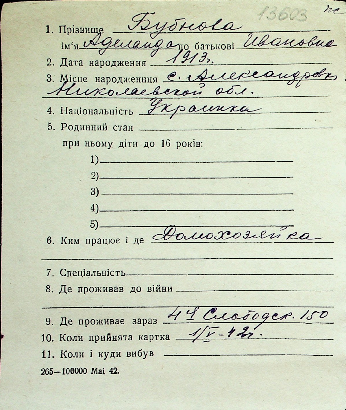 ◦ ◦ Перелік карток на осіб, які мешкали у м. Миколаїв у період окупації 1941–1944 років