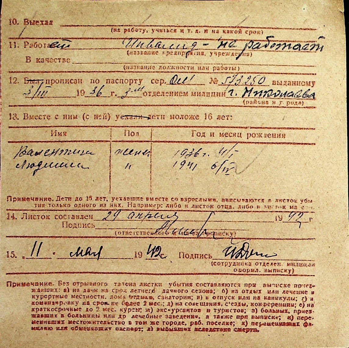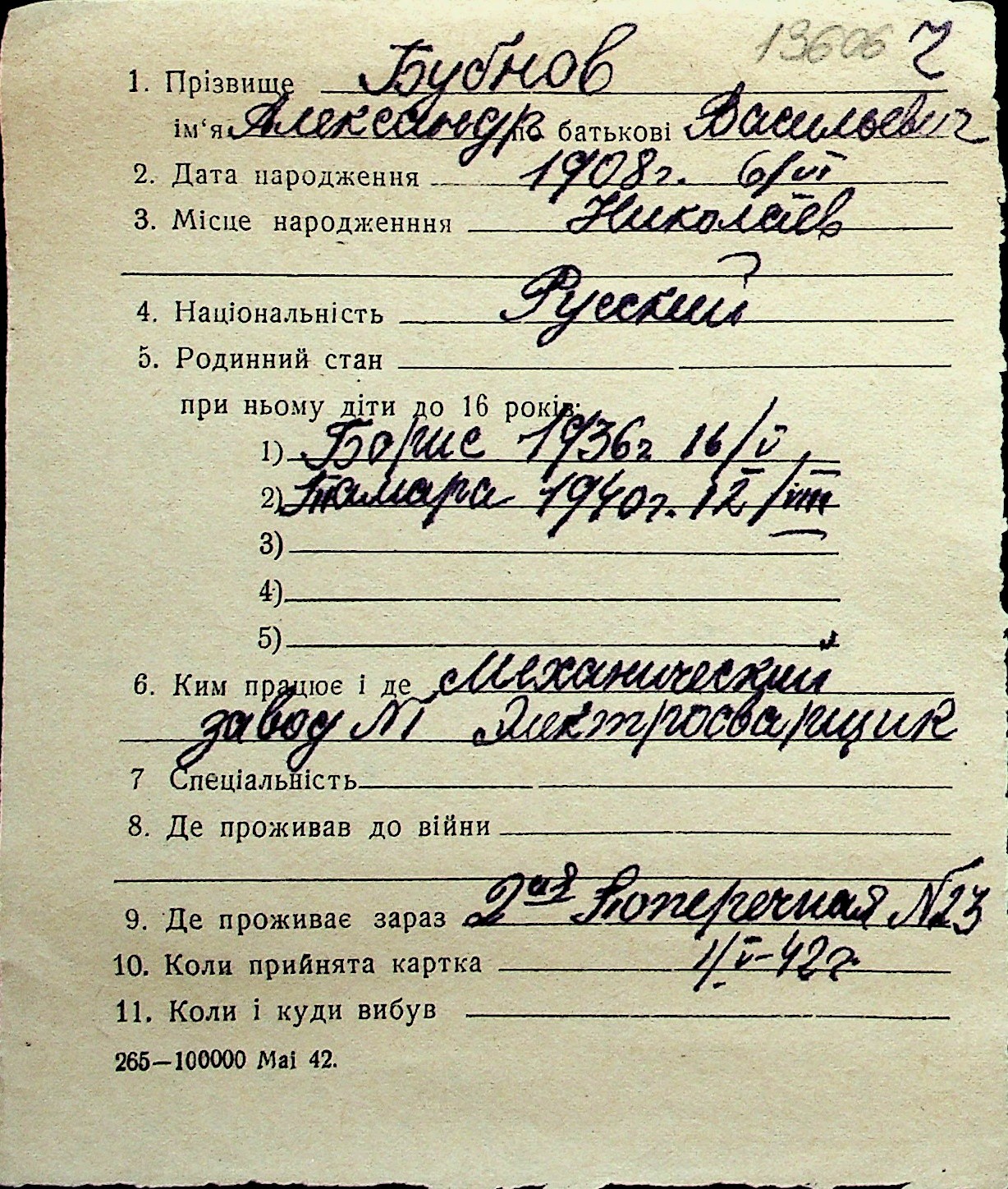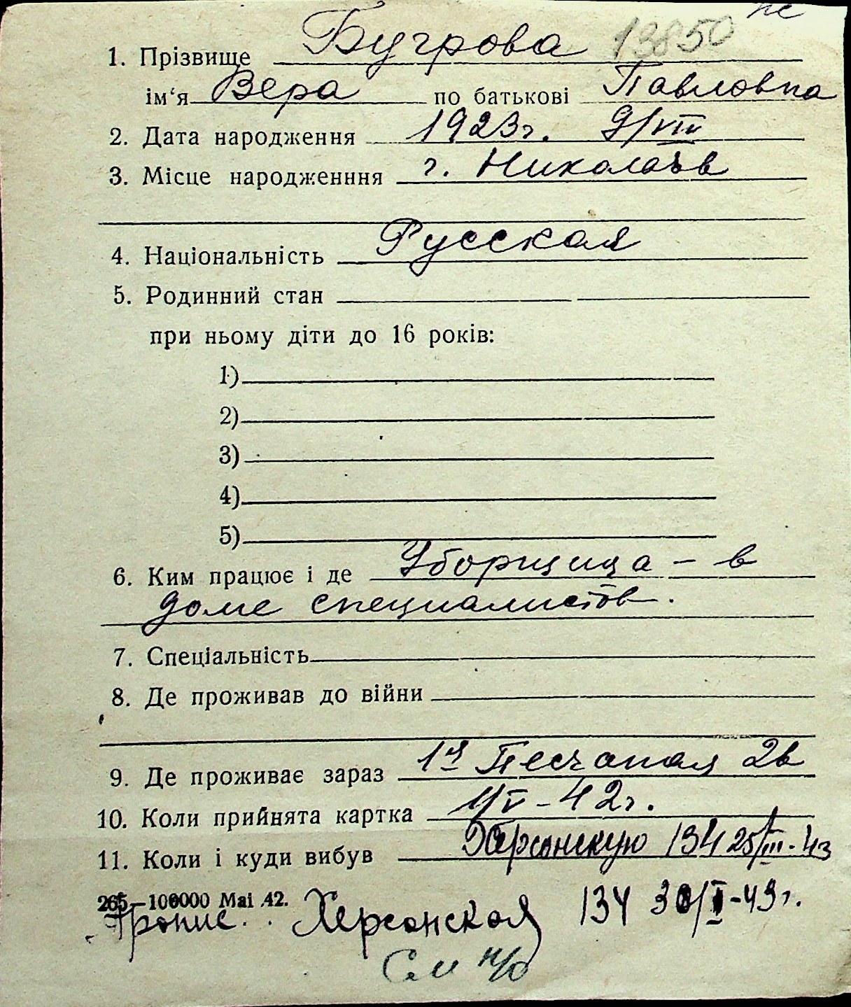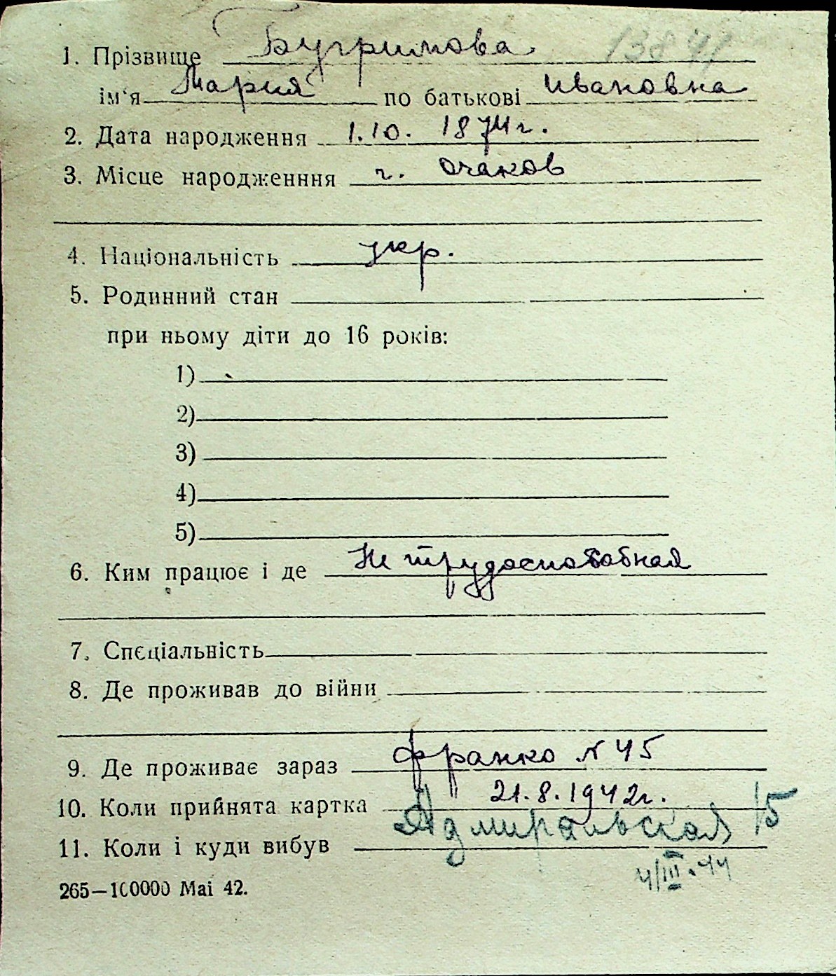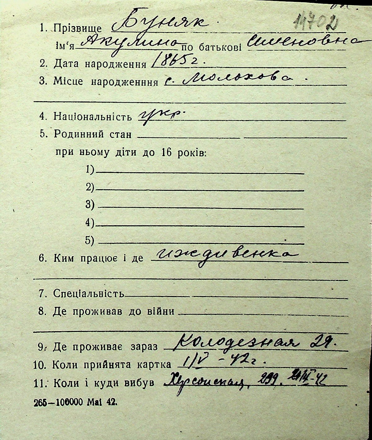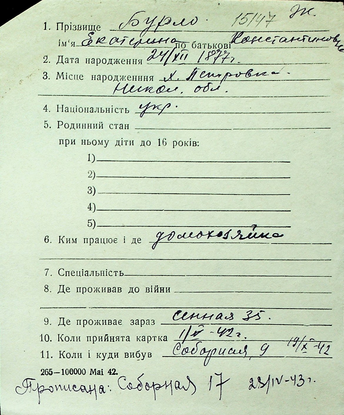 ◦ ◦ Перелік карток на осіб, які мешкали у м. Миколаїв у період окупації 1941–1944 років
