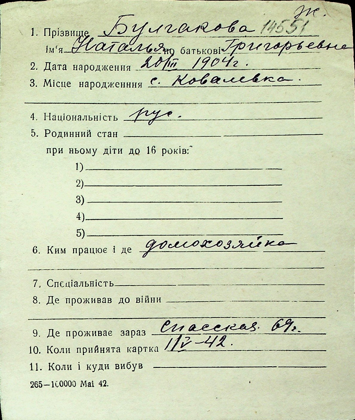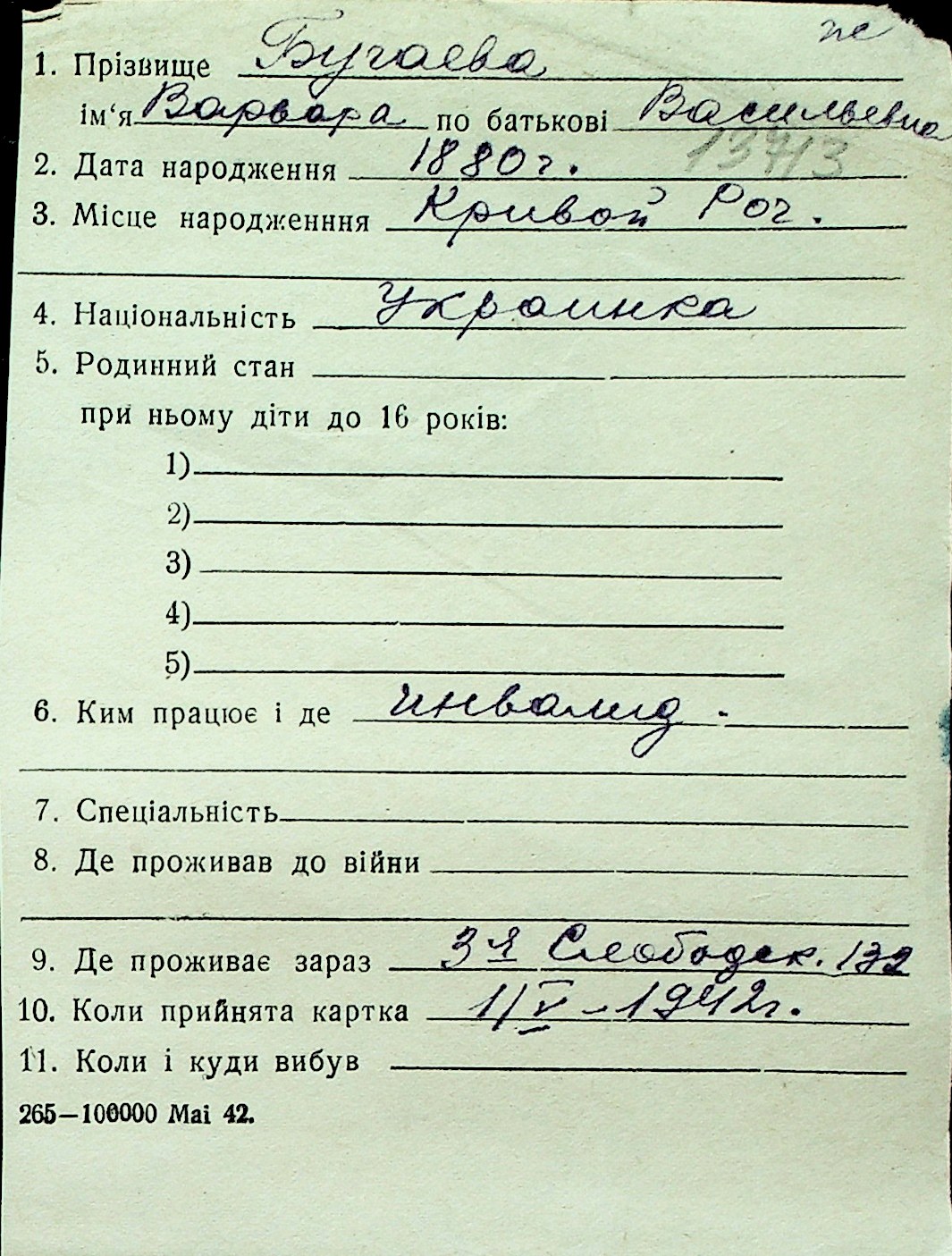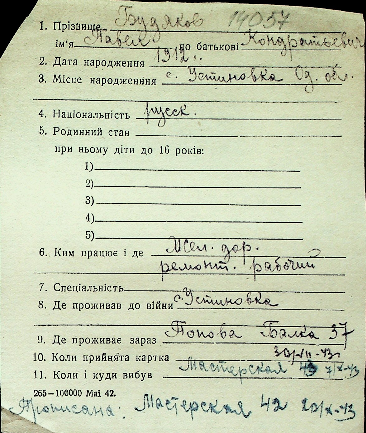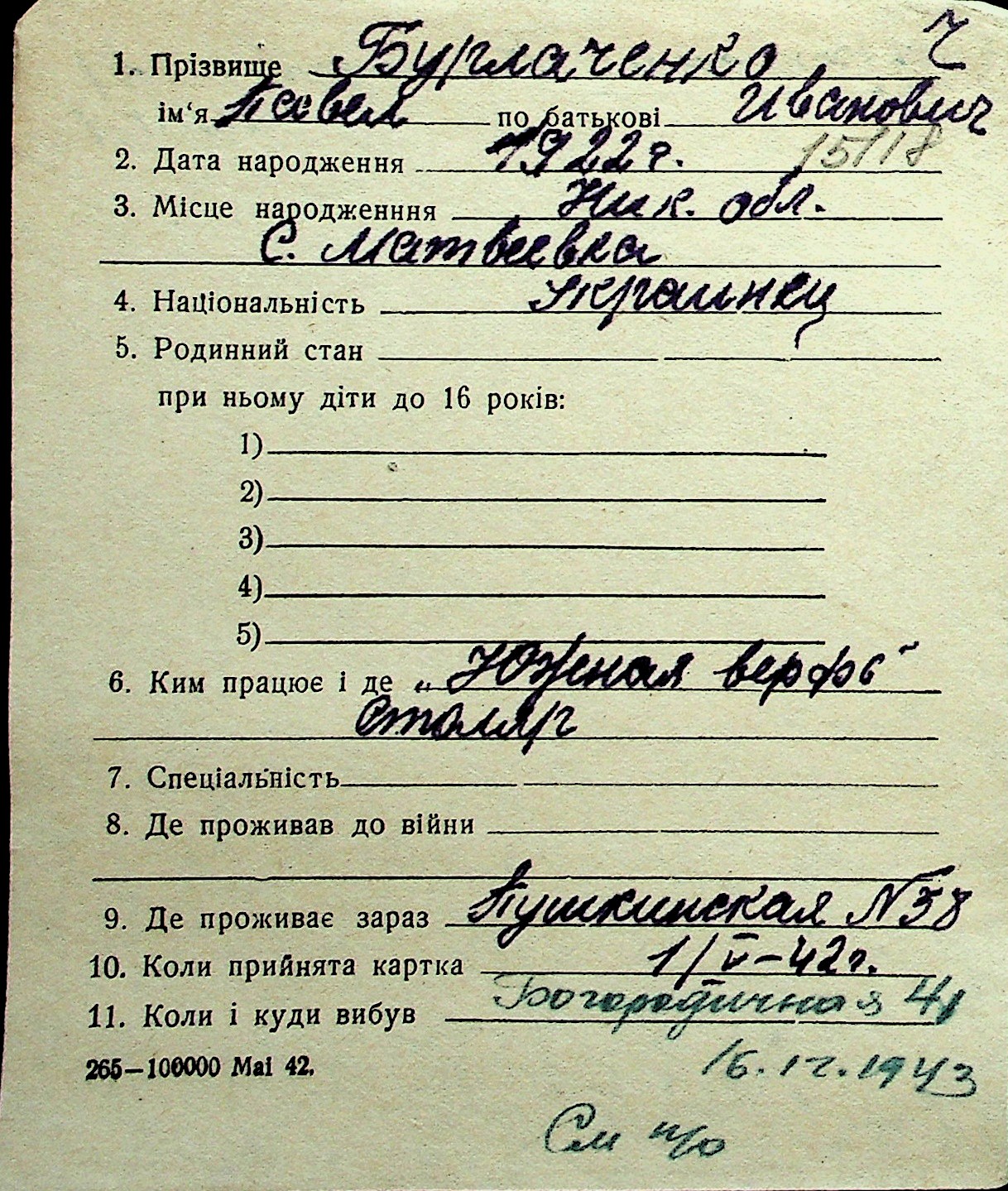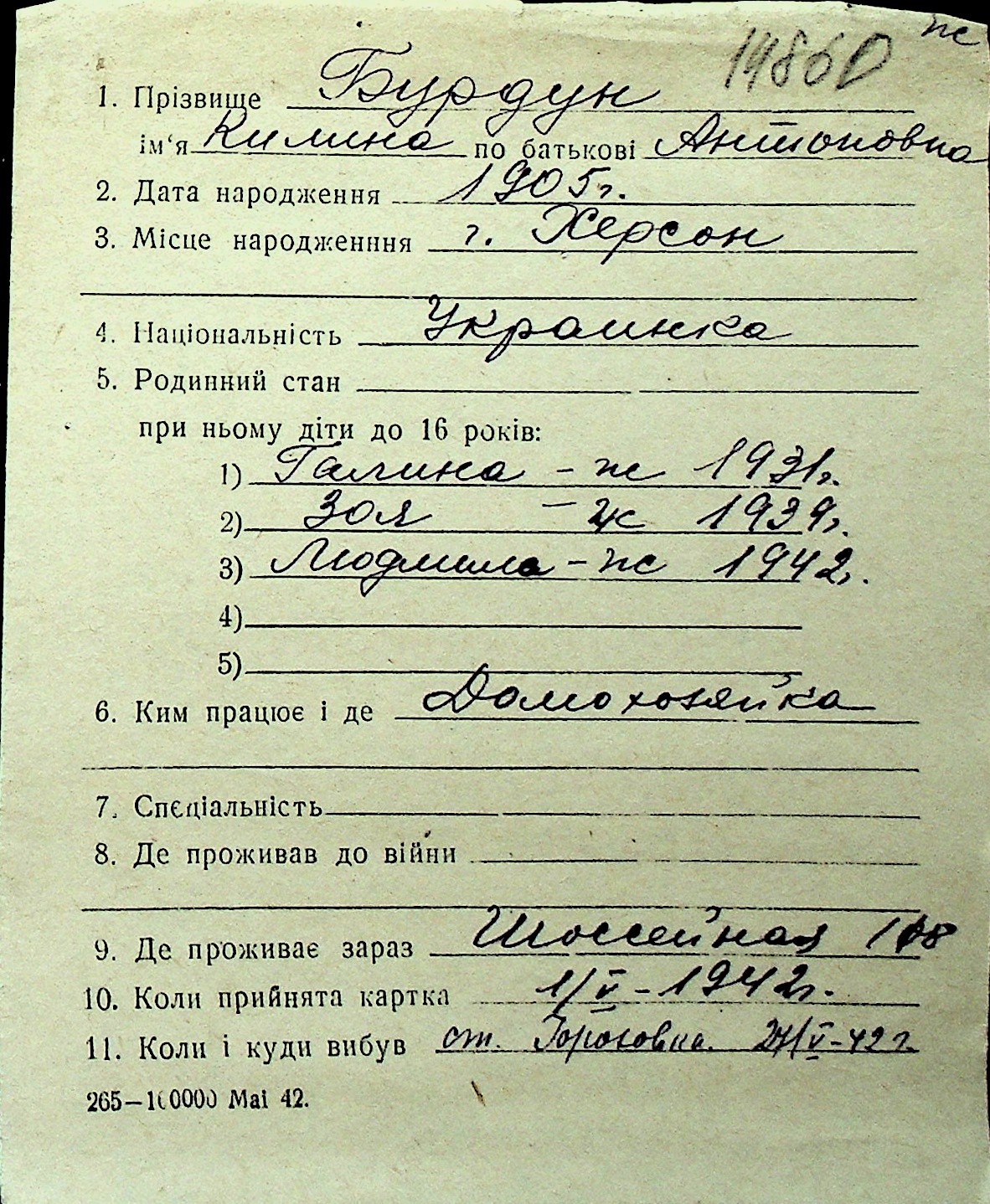 ◦ ◦ Перелік карток на осіб, які мешкали у м. Миколаїв у період окупації 1941–1944 років