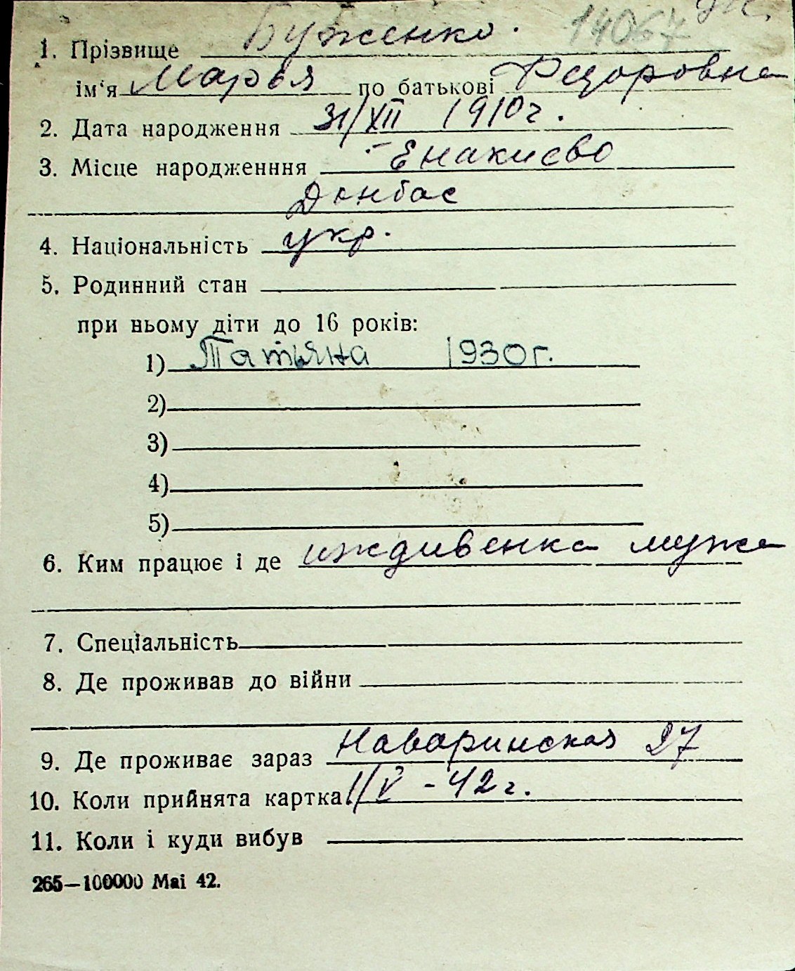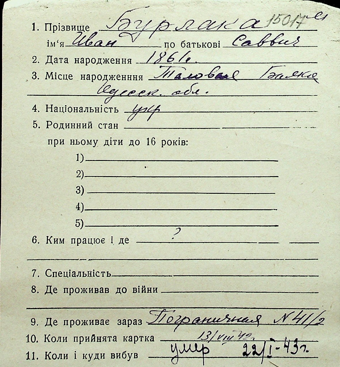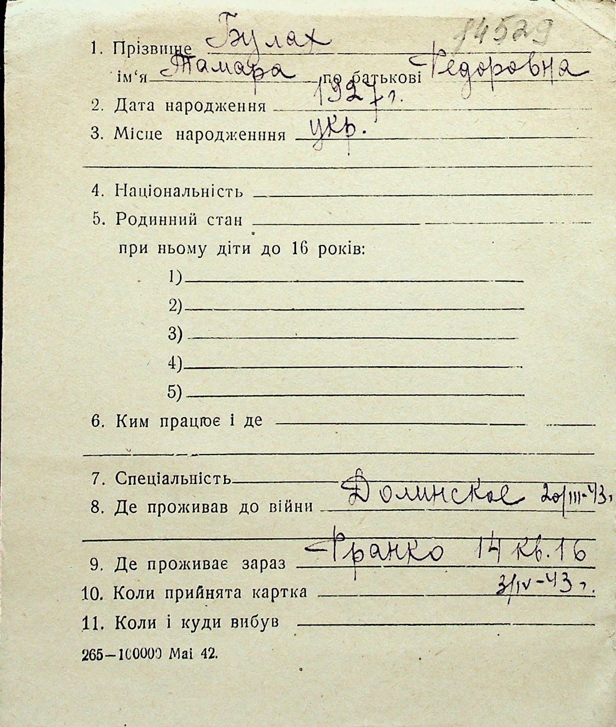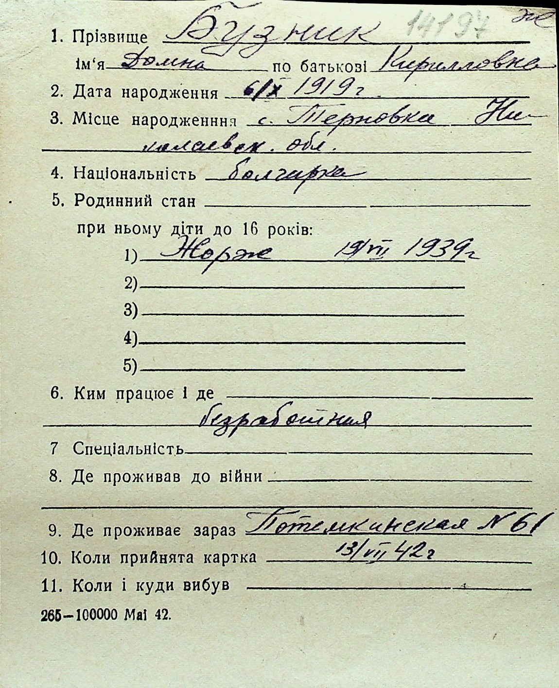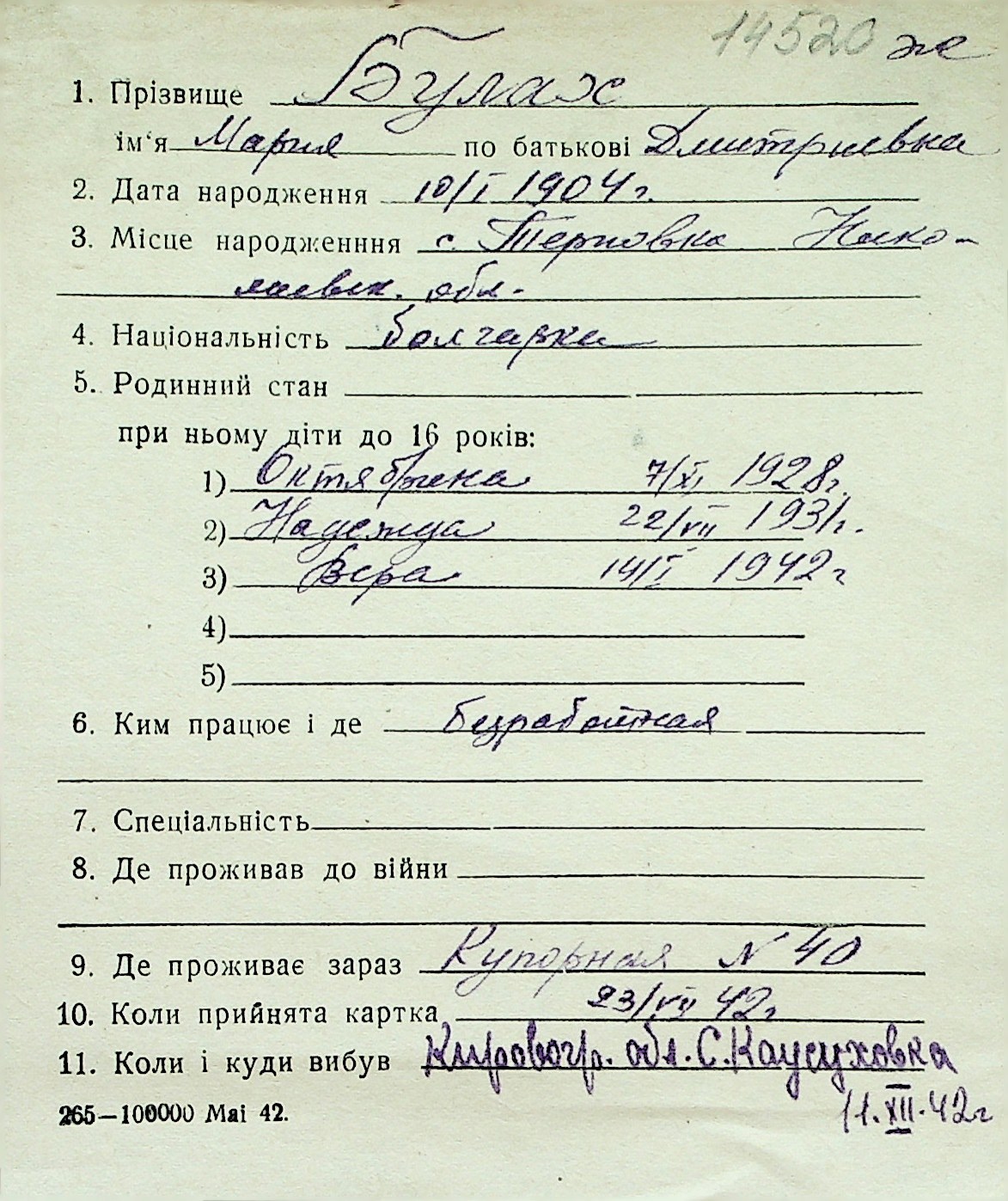 ◦ ◦ Перелік карток на осіб, які мешкали у м. Миколаїв у період окупації 1941–1944 років