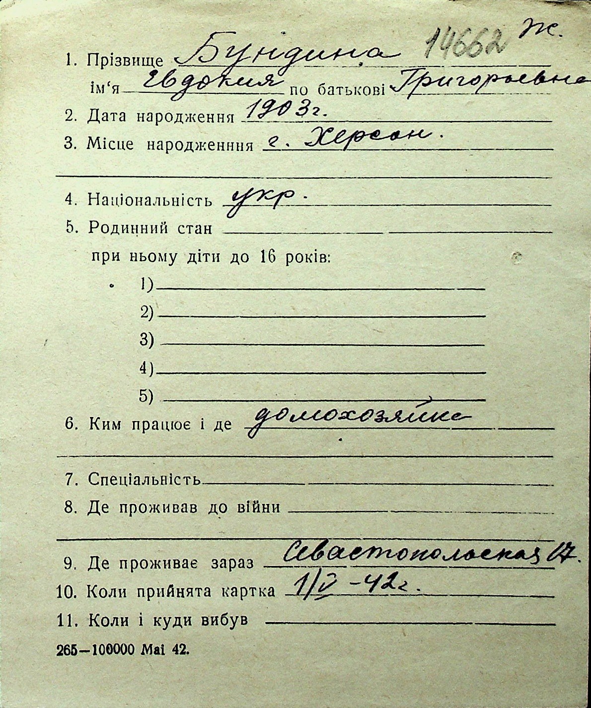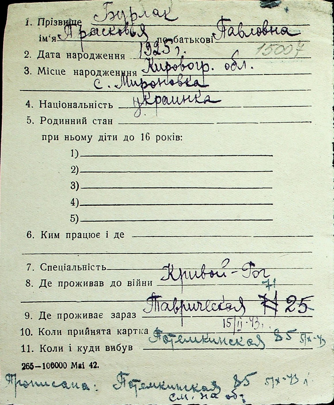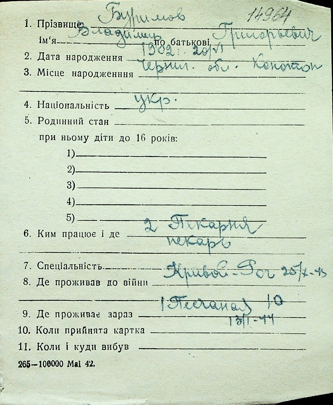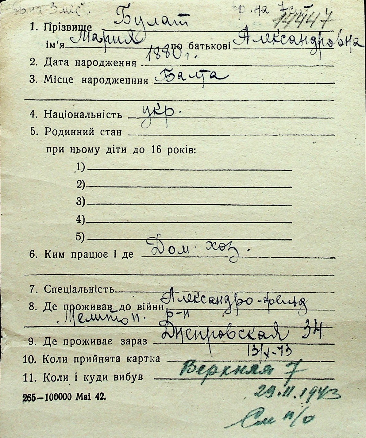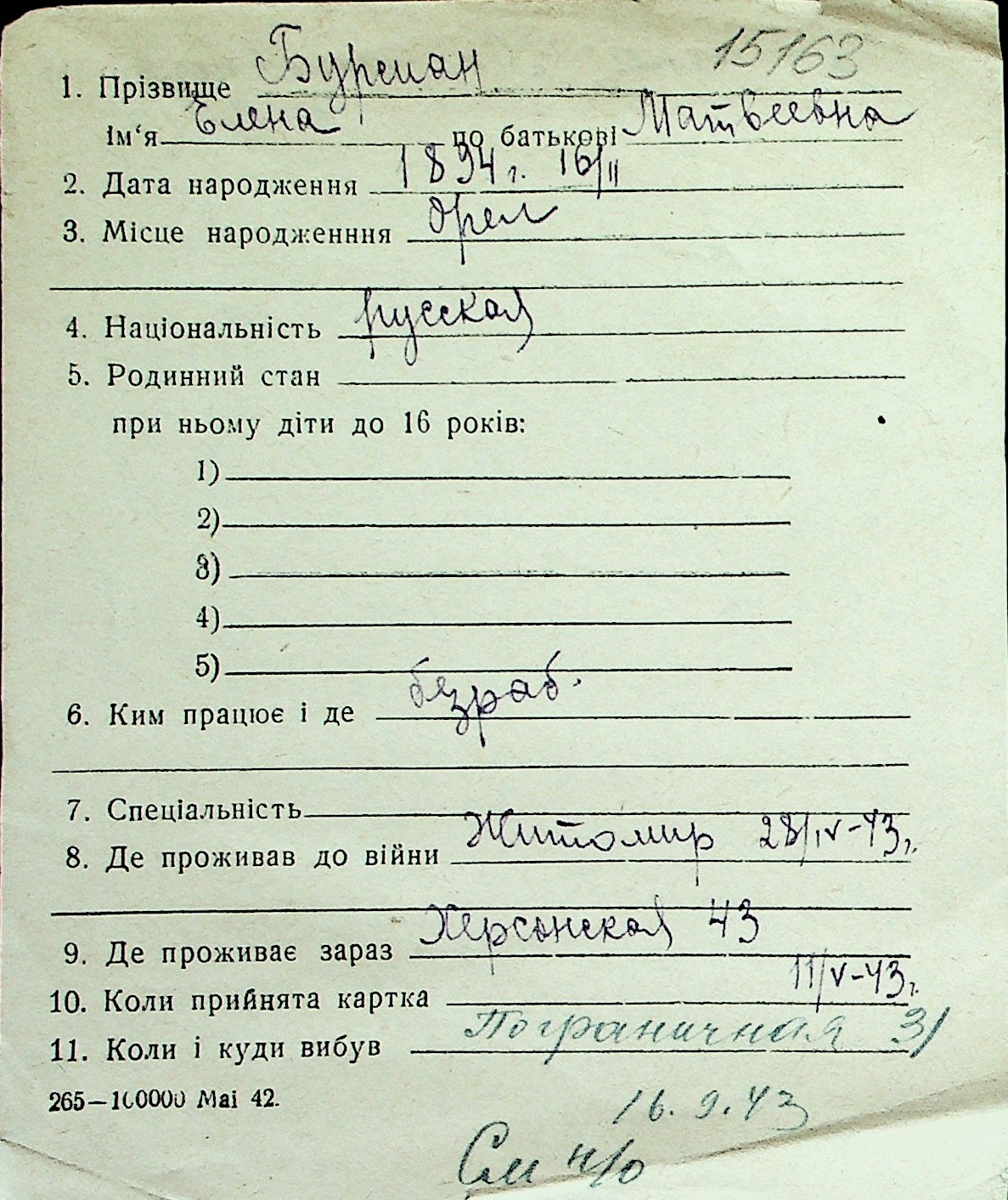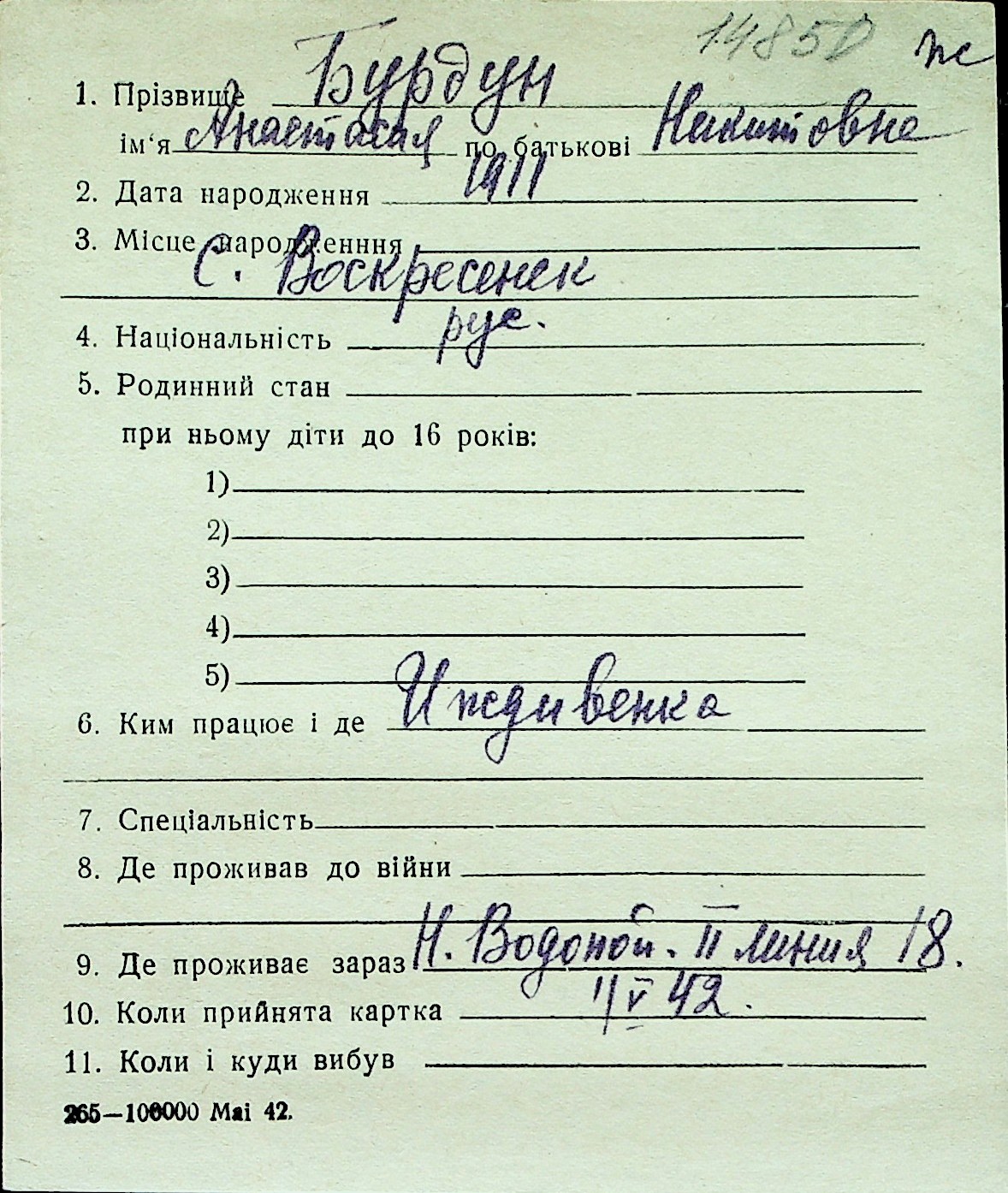 ◦ ◦ Перелік карток на осіб, які мешкали у м. Миколаїв у період окупації 1941–1944 років