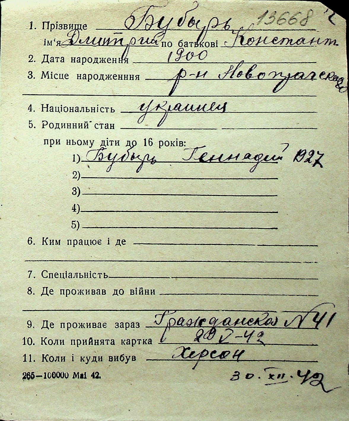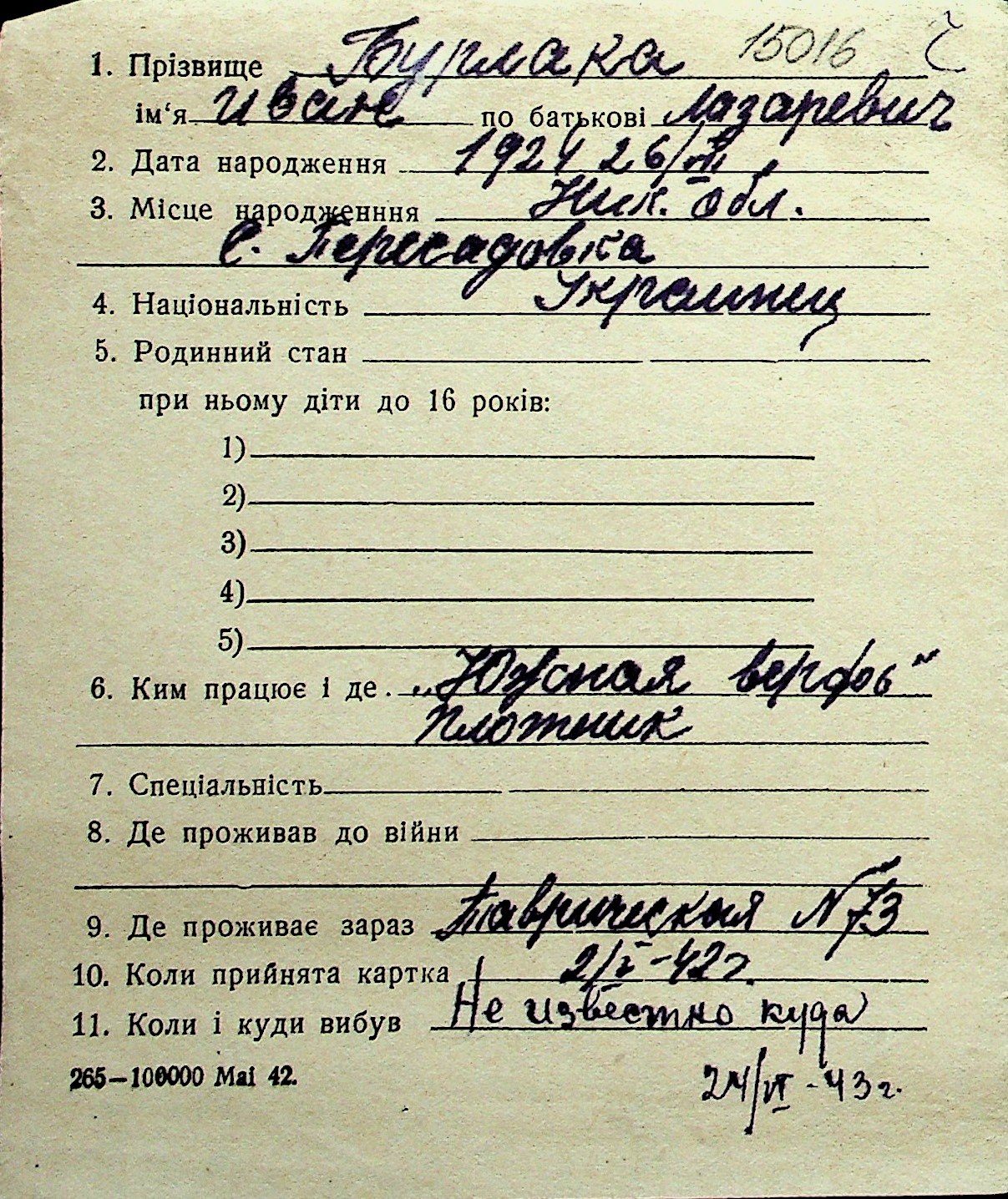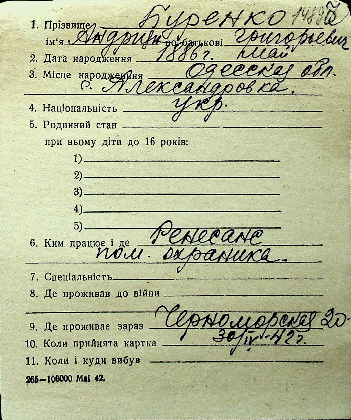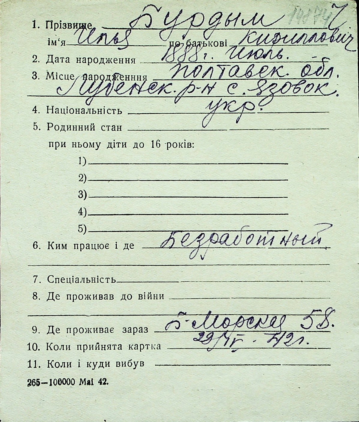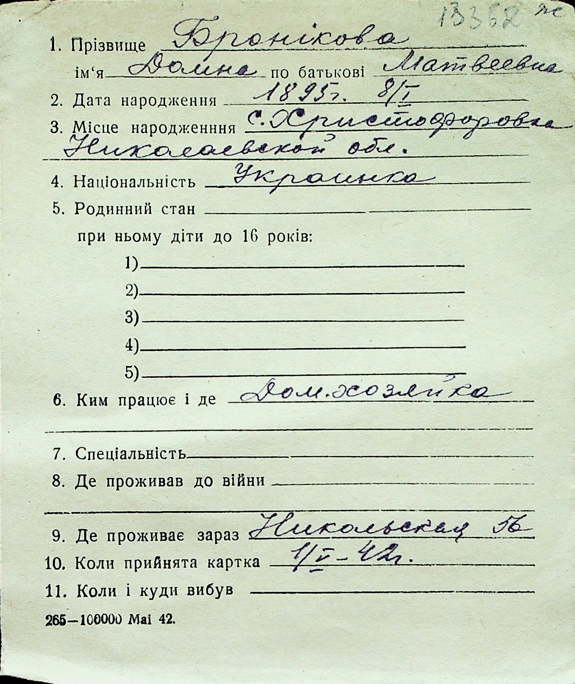 ◦ ◦ Перелік карток на осіб, які мешкали у м. Миколаїв у період окупації 1941–1944 років