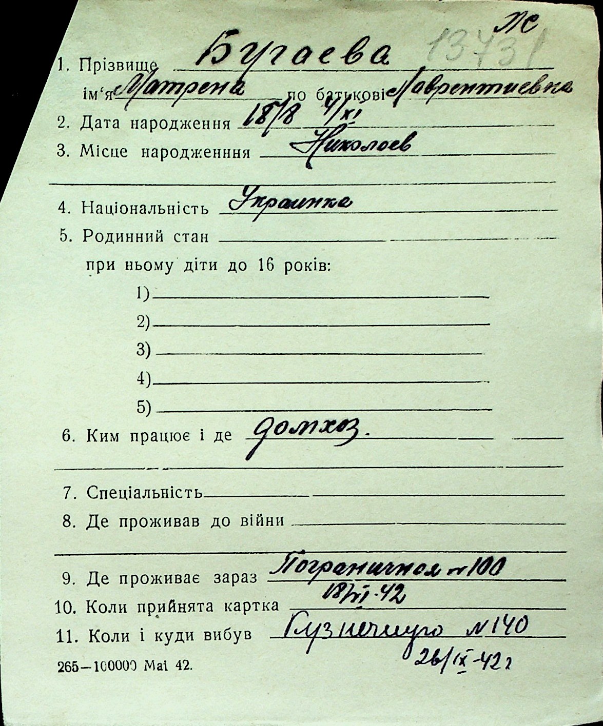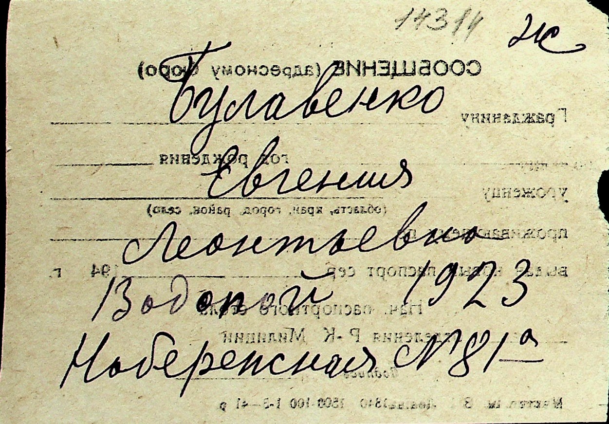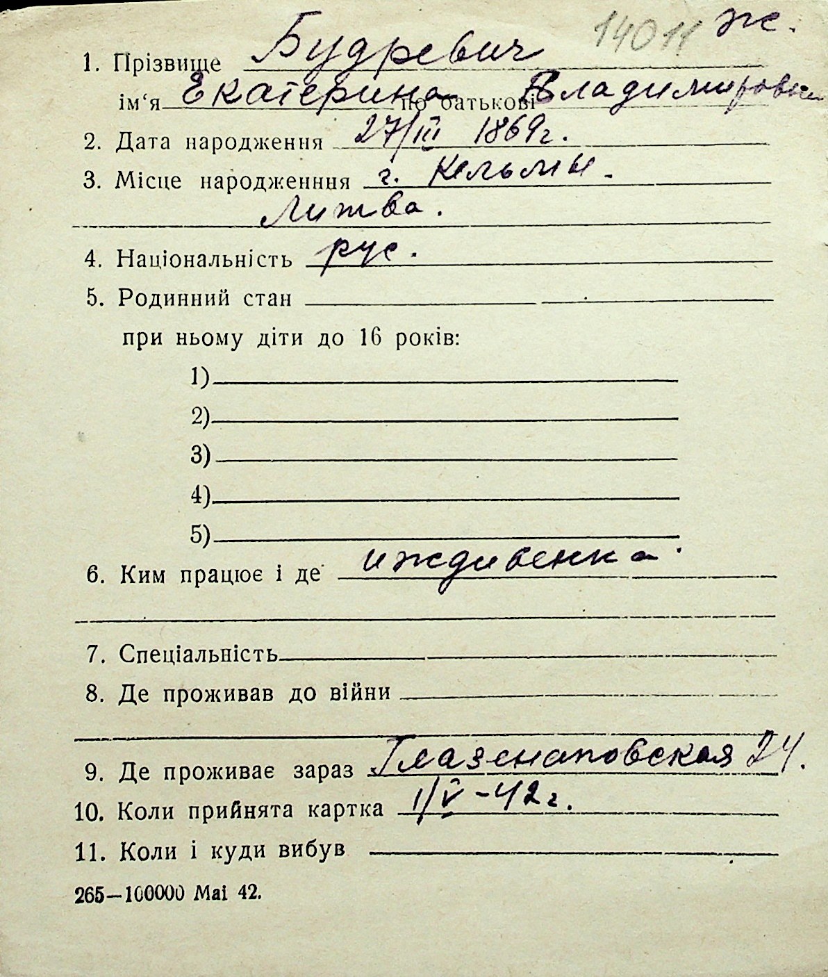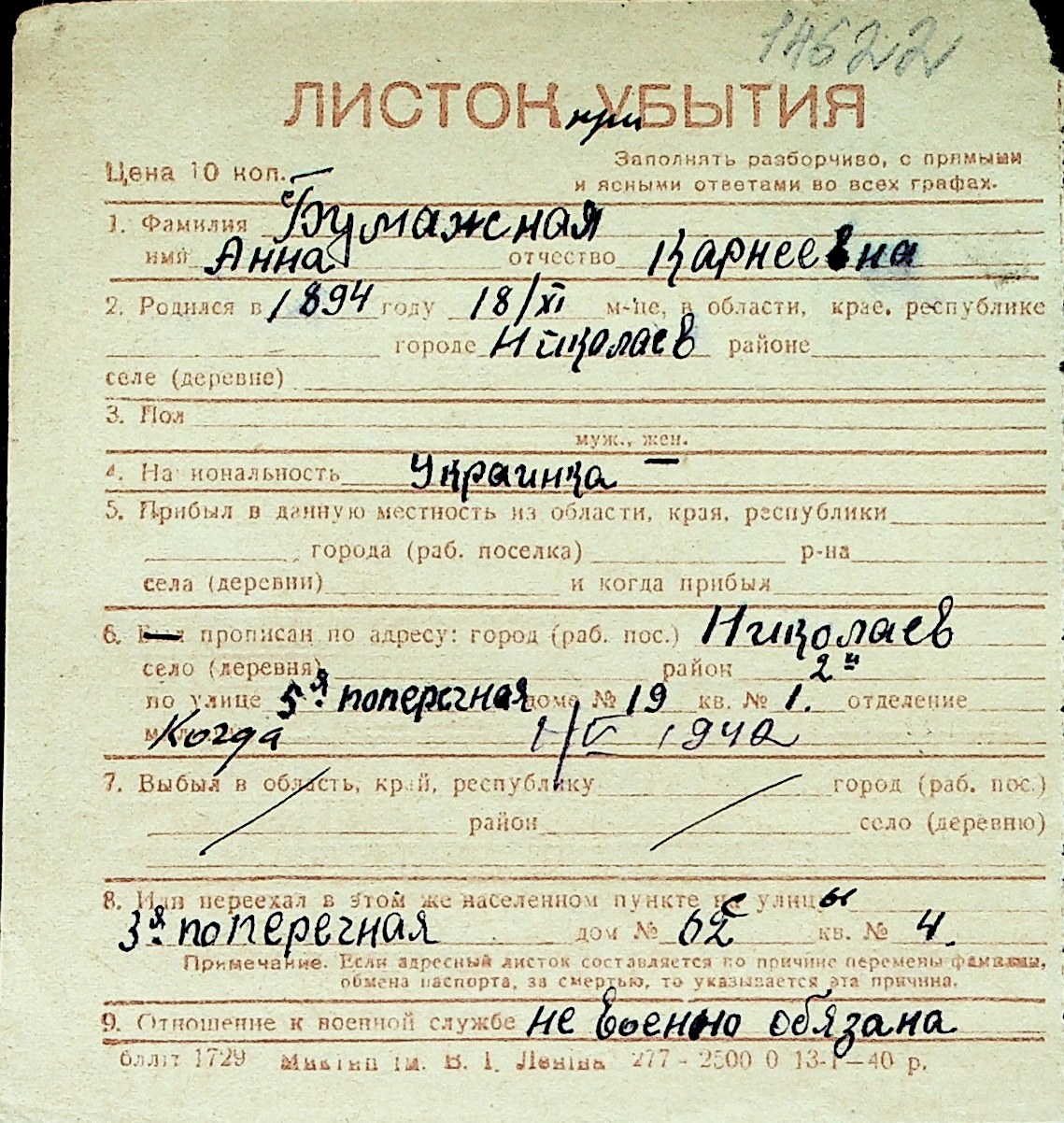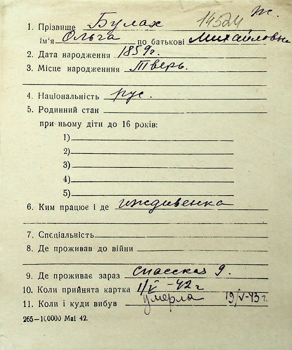 ◦ ◦ Перелік карток на осіб, які мешкали у м. Миколаїв у період окупації 1941–1944 років