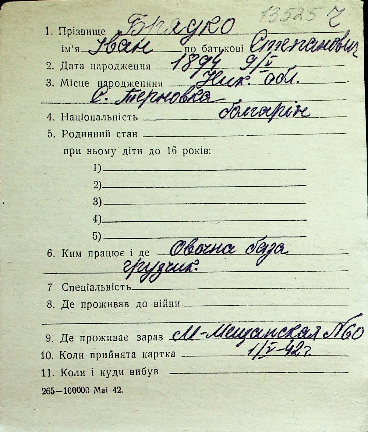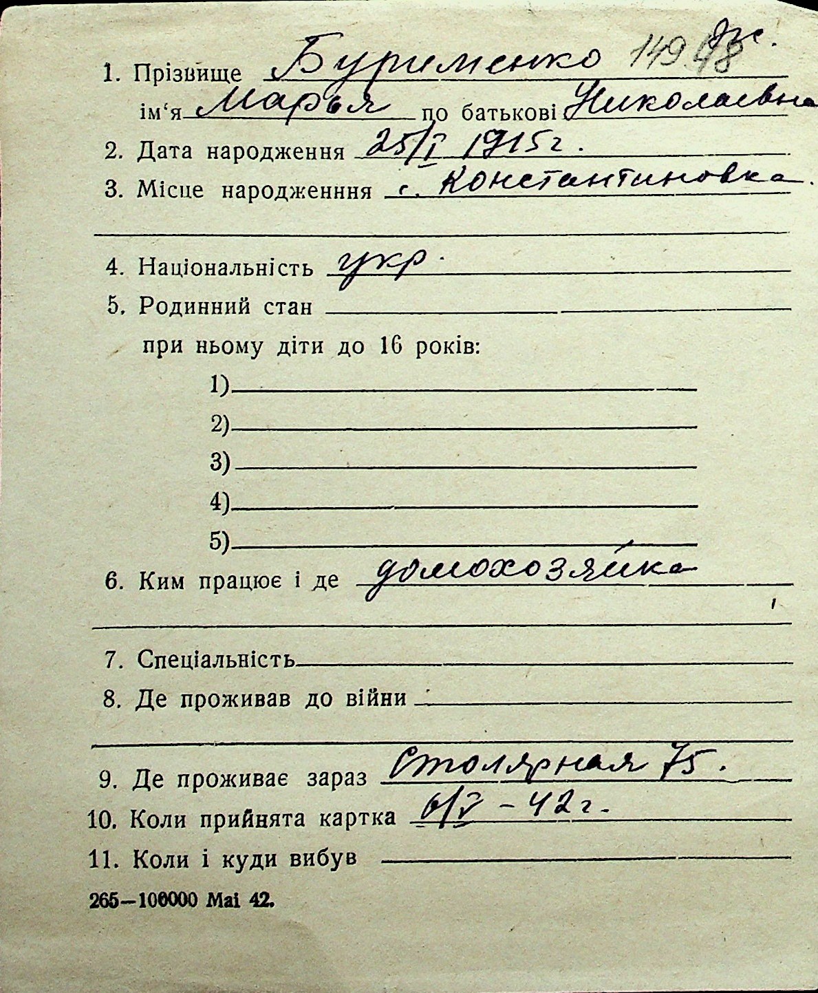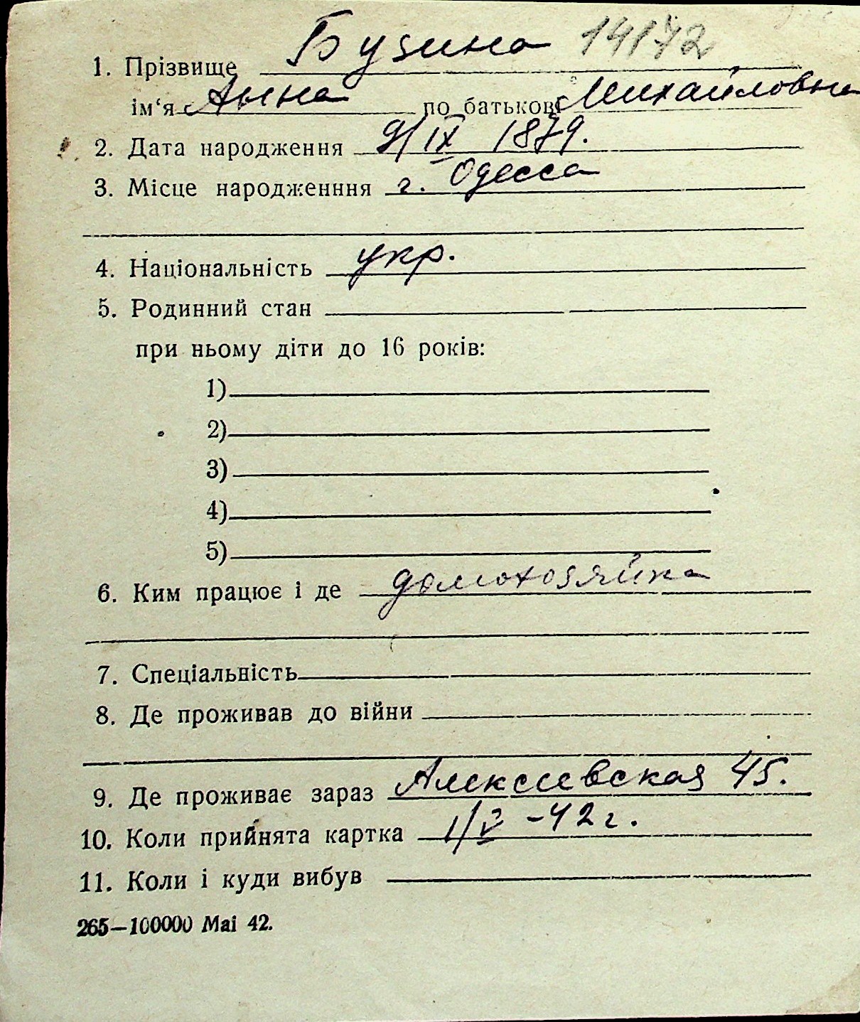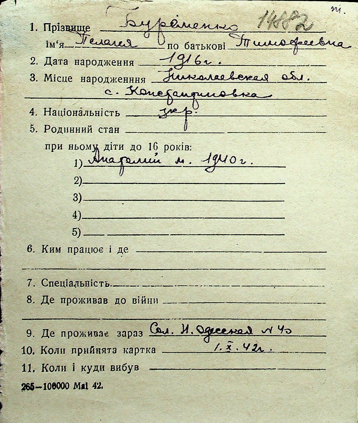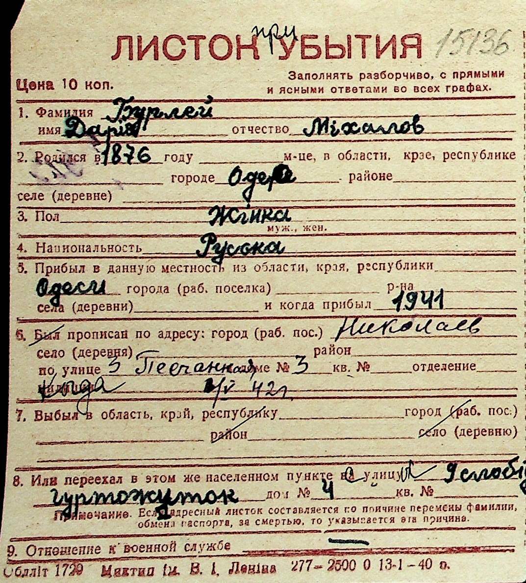 ◦ ◦ Перелік карток на осіб, які мешкали у м. Миколаїв у період окупації 1941–1944 років