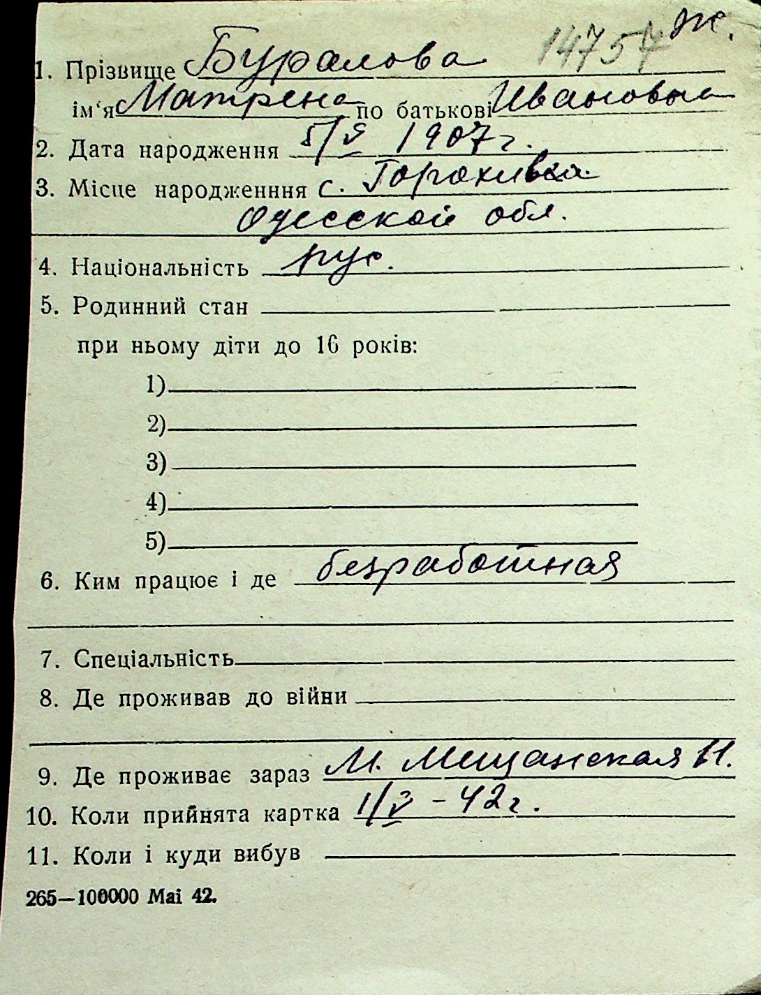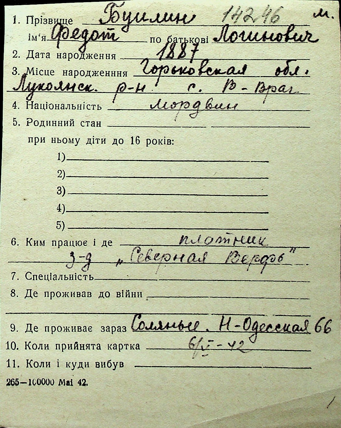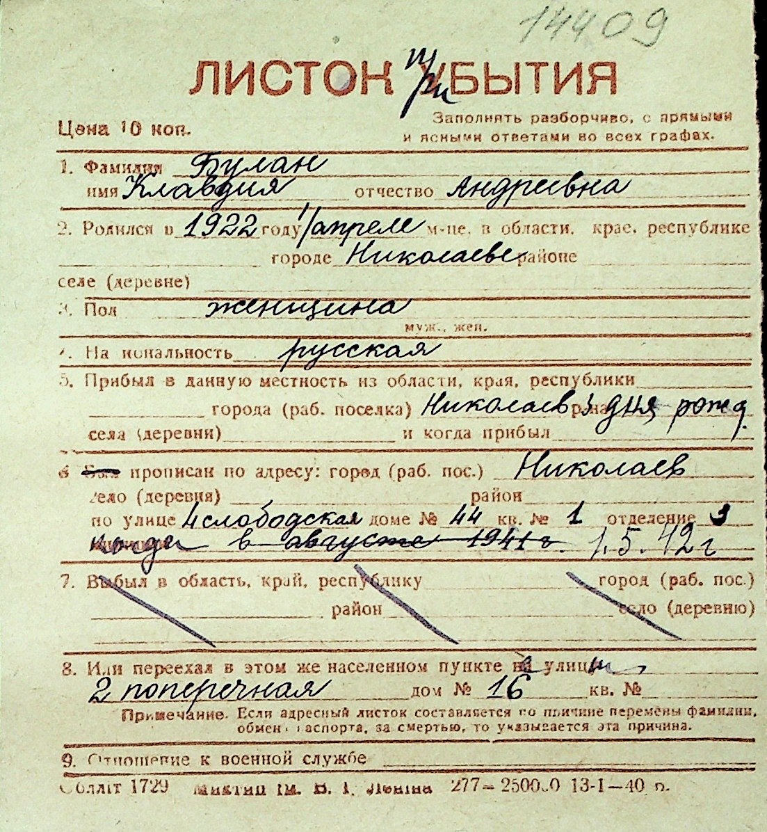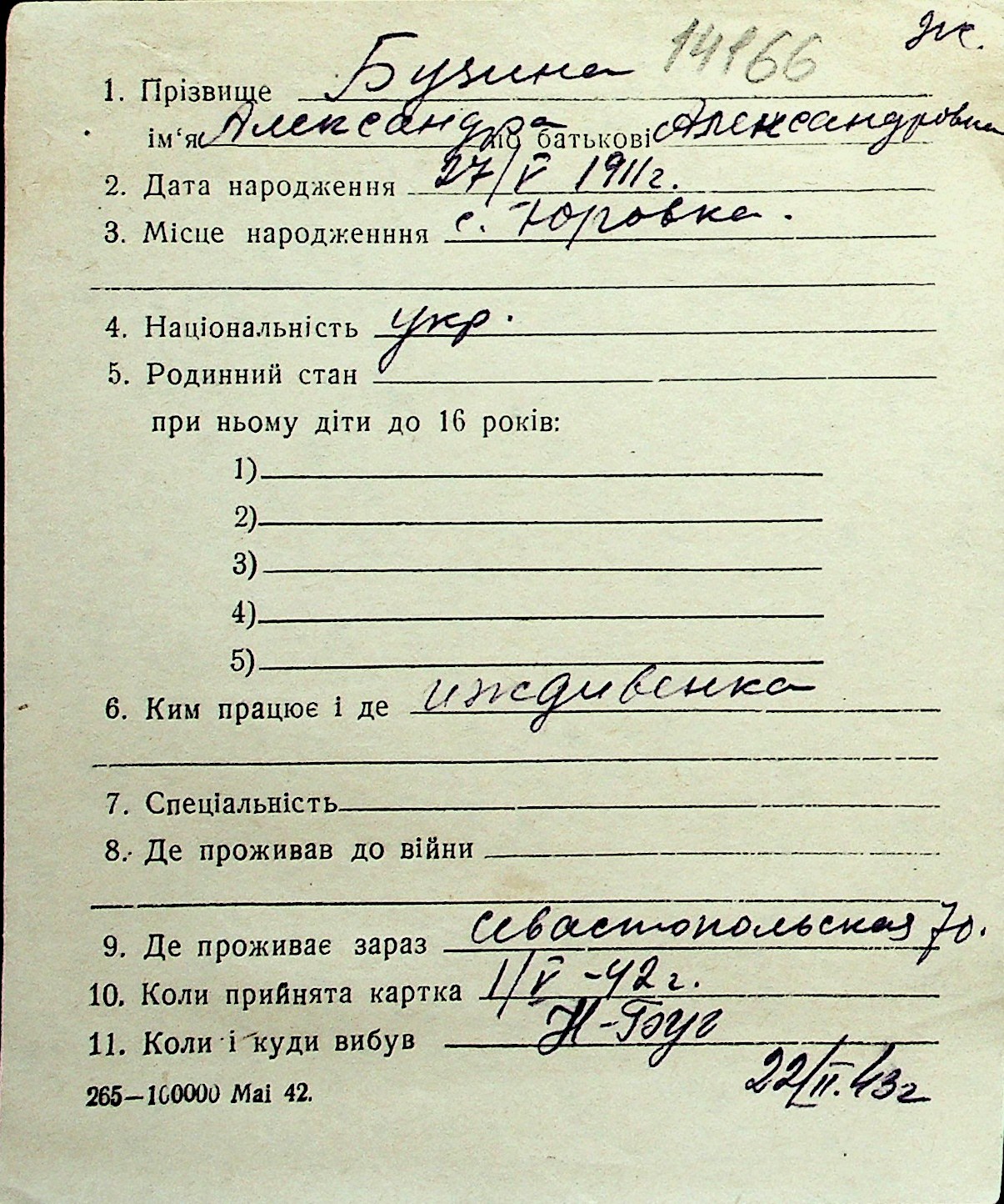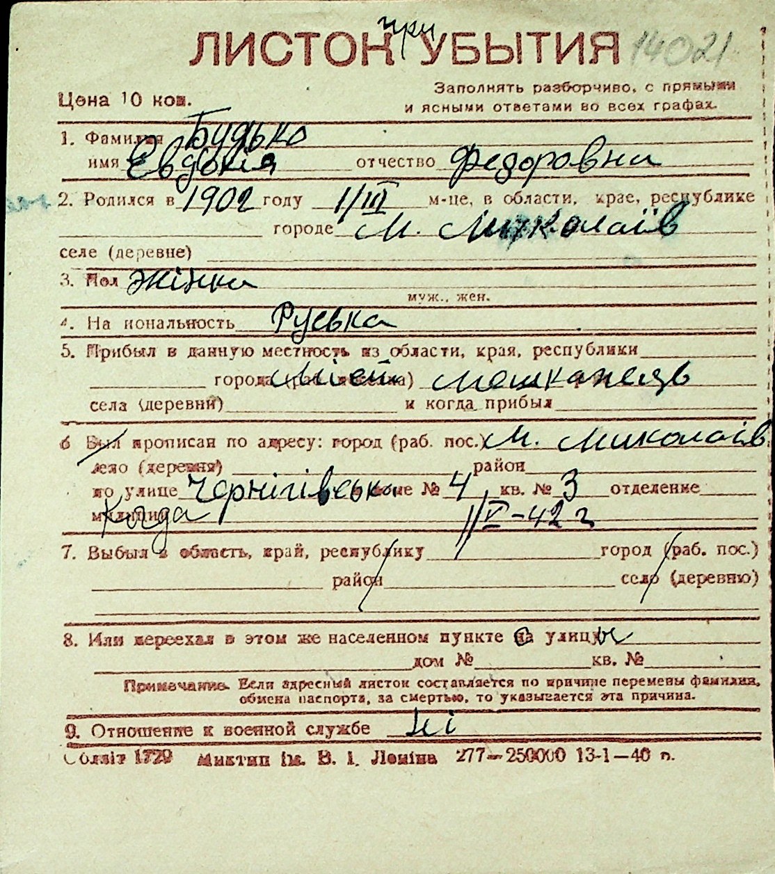 ◦ ◦ Перелік карток на осіб, які мешкали у м. Миколаїв у період окупації 1941–1944 років