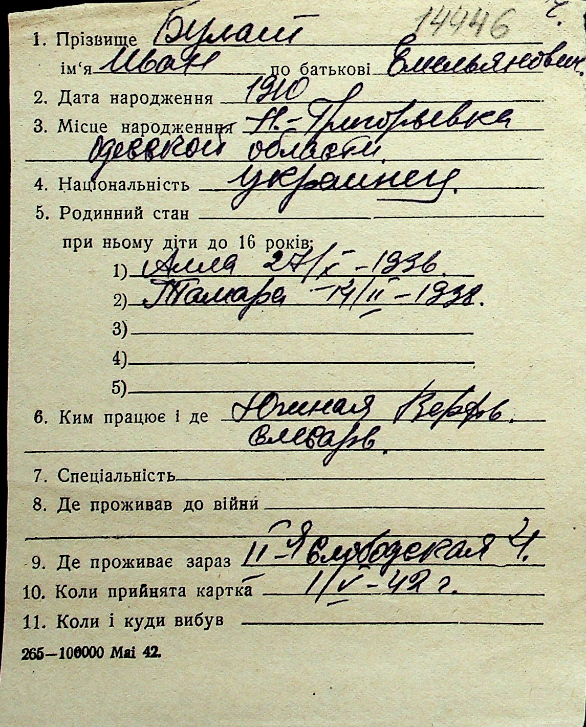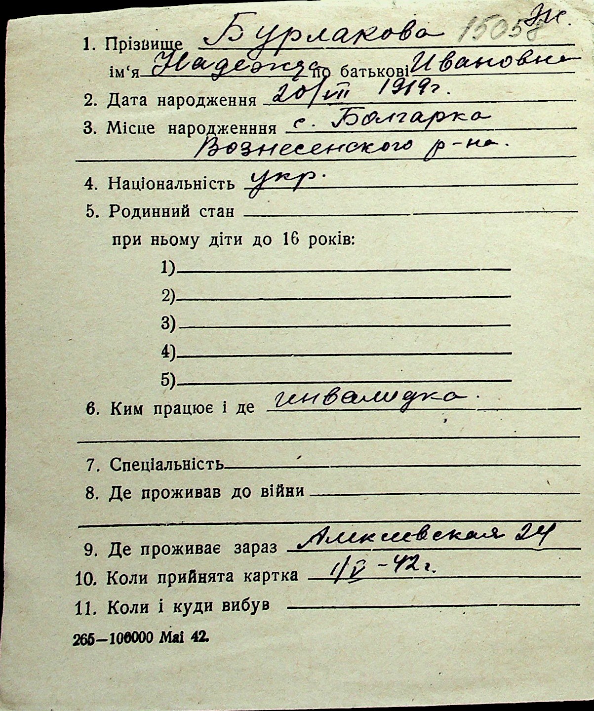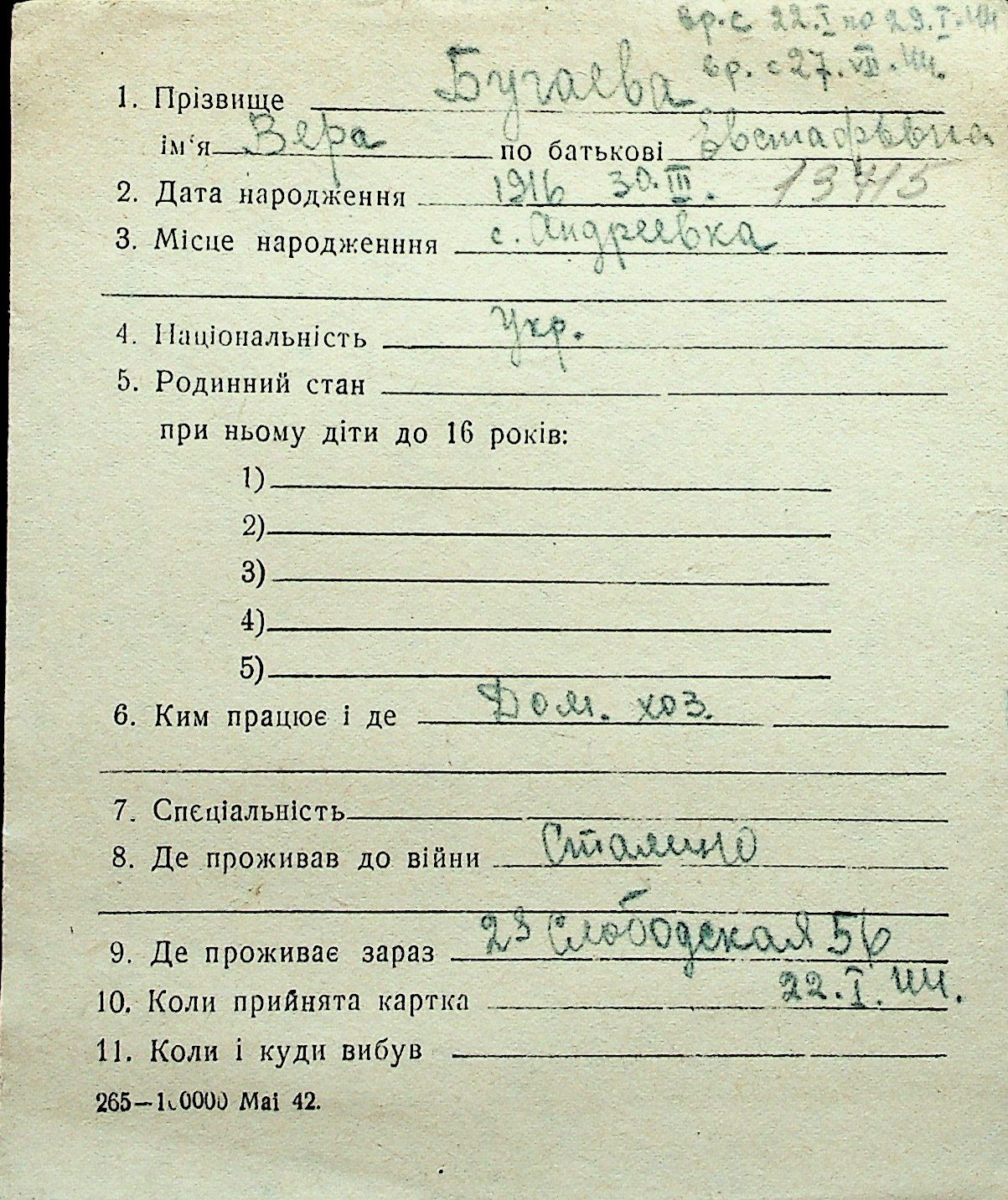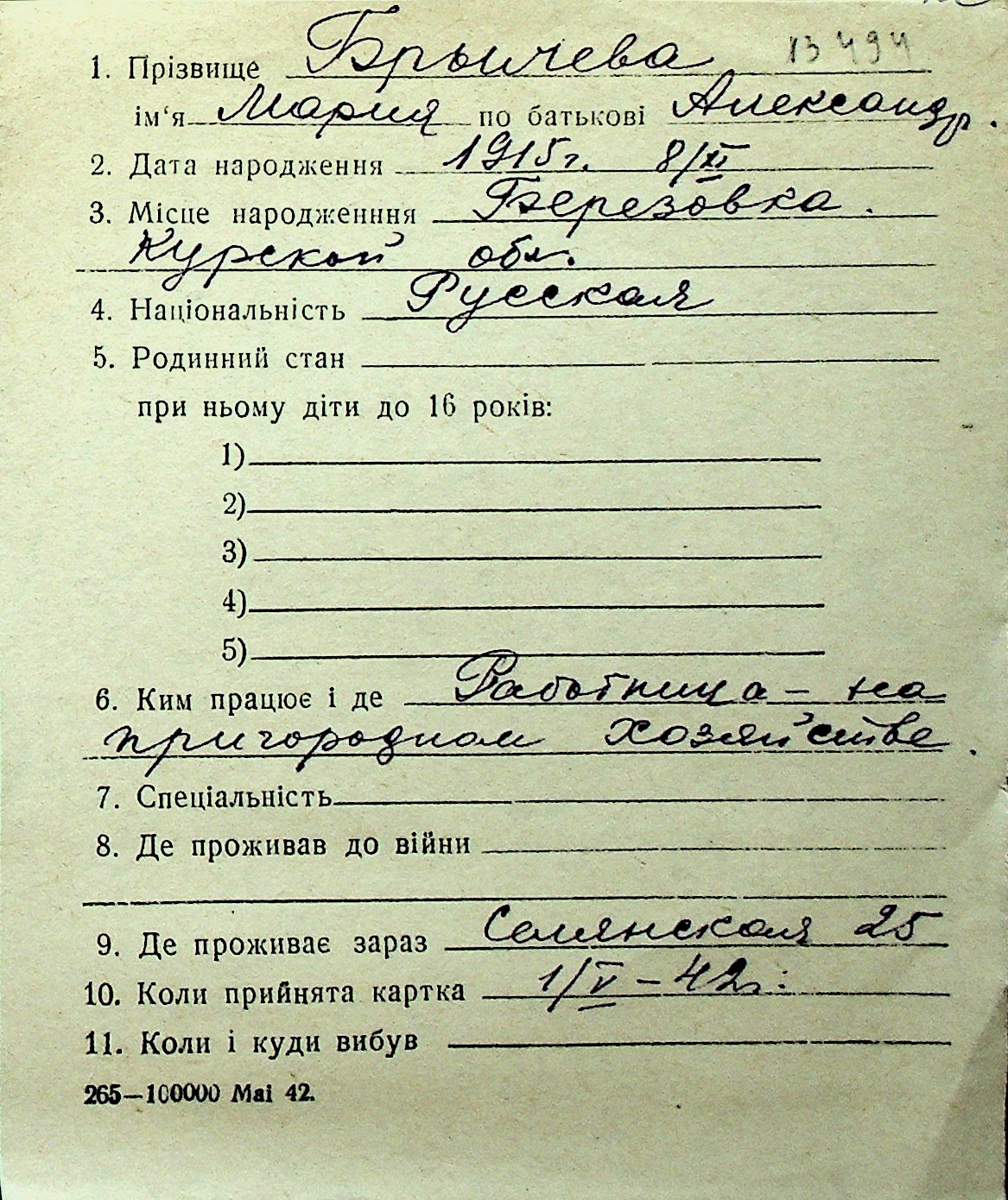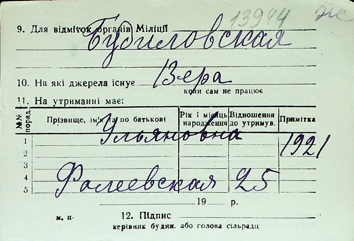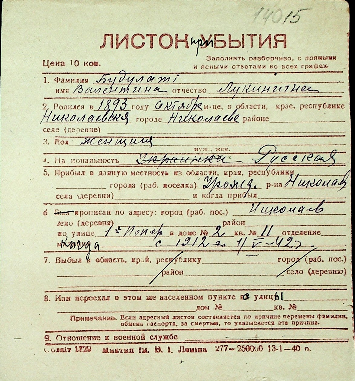 ◦ ◦ Перелік карток на осіб, які мешкали у м. Миколаїв у період окупації 1941–1944 років