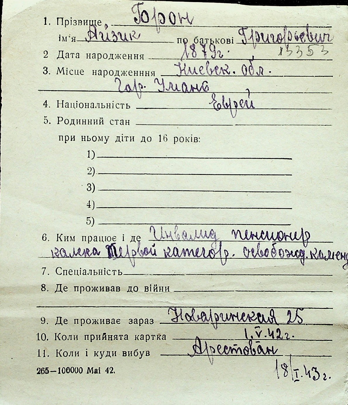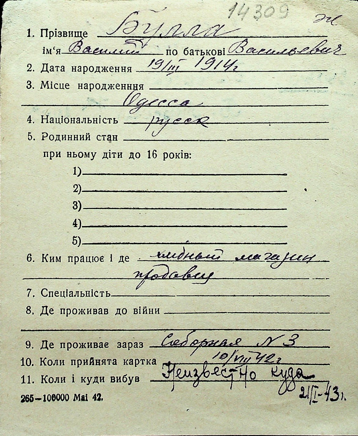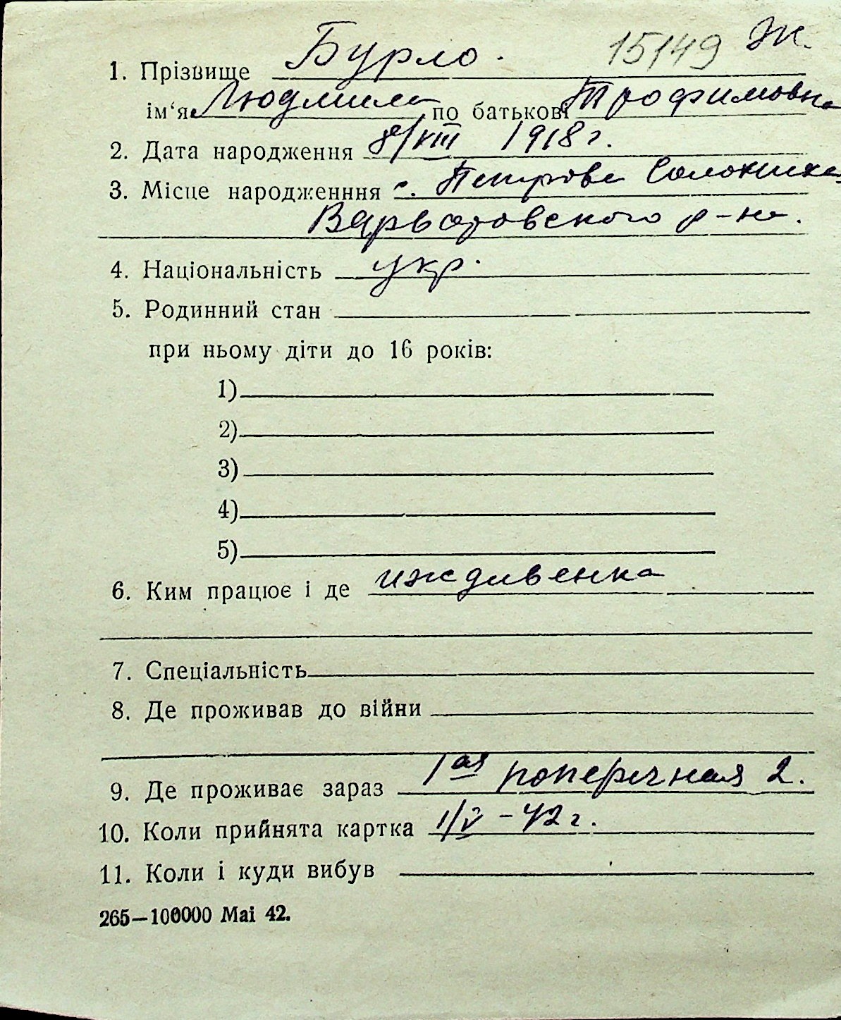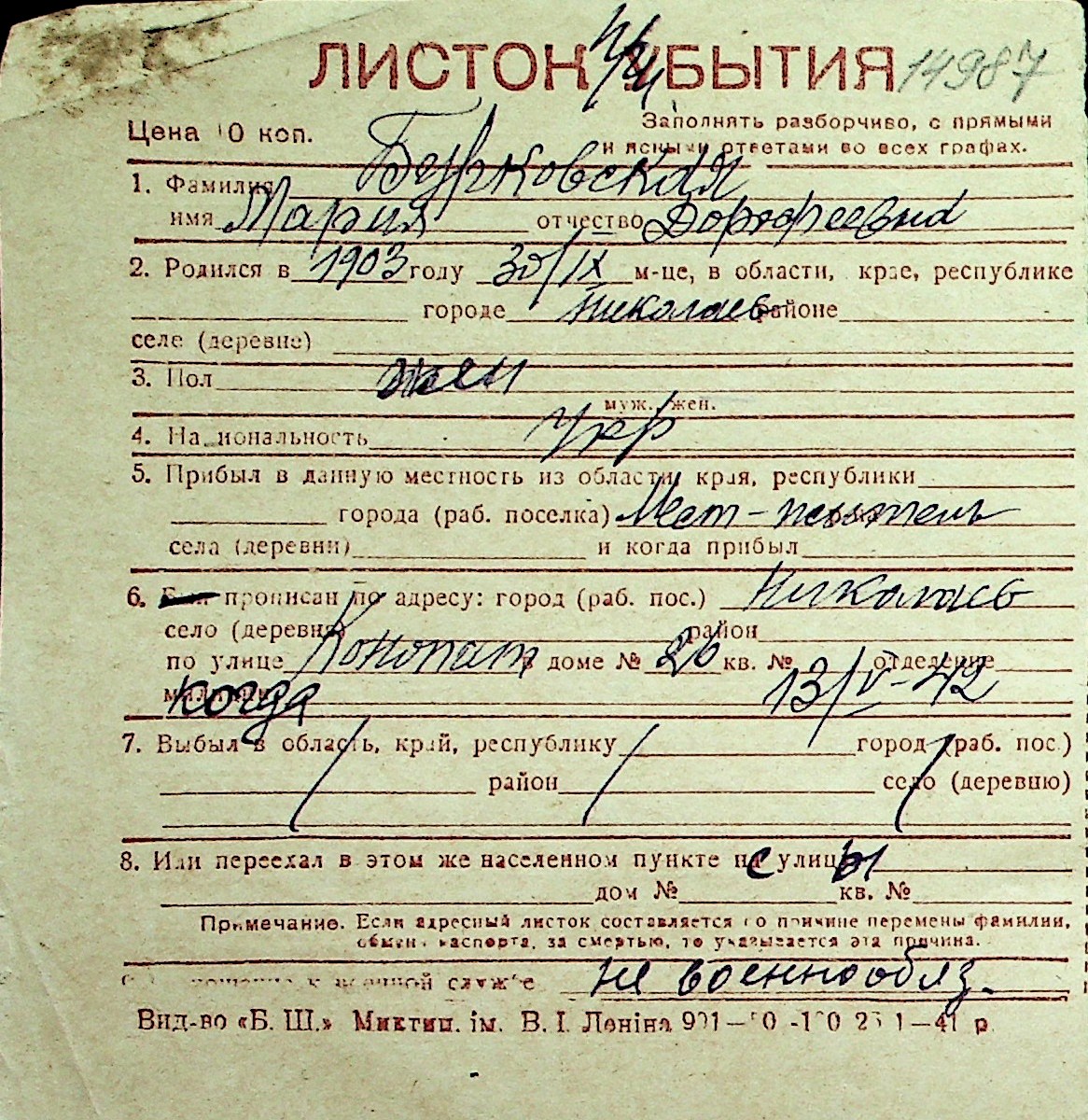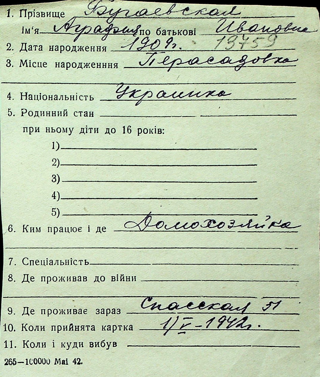 ◦ ◦ Перелік карток на осіб, які мешкали у м. Миколаїв у період окупації 1941–1944 років