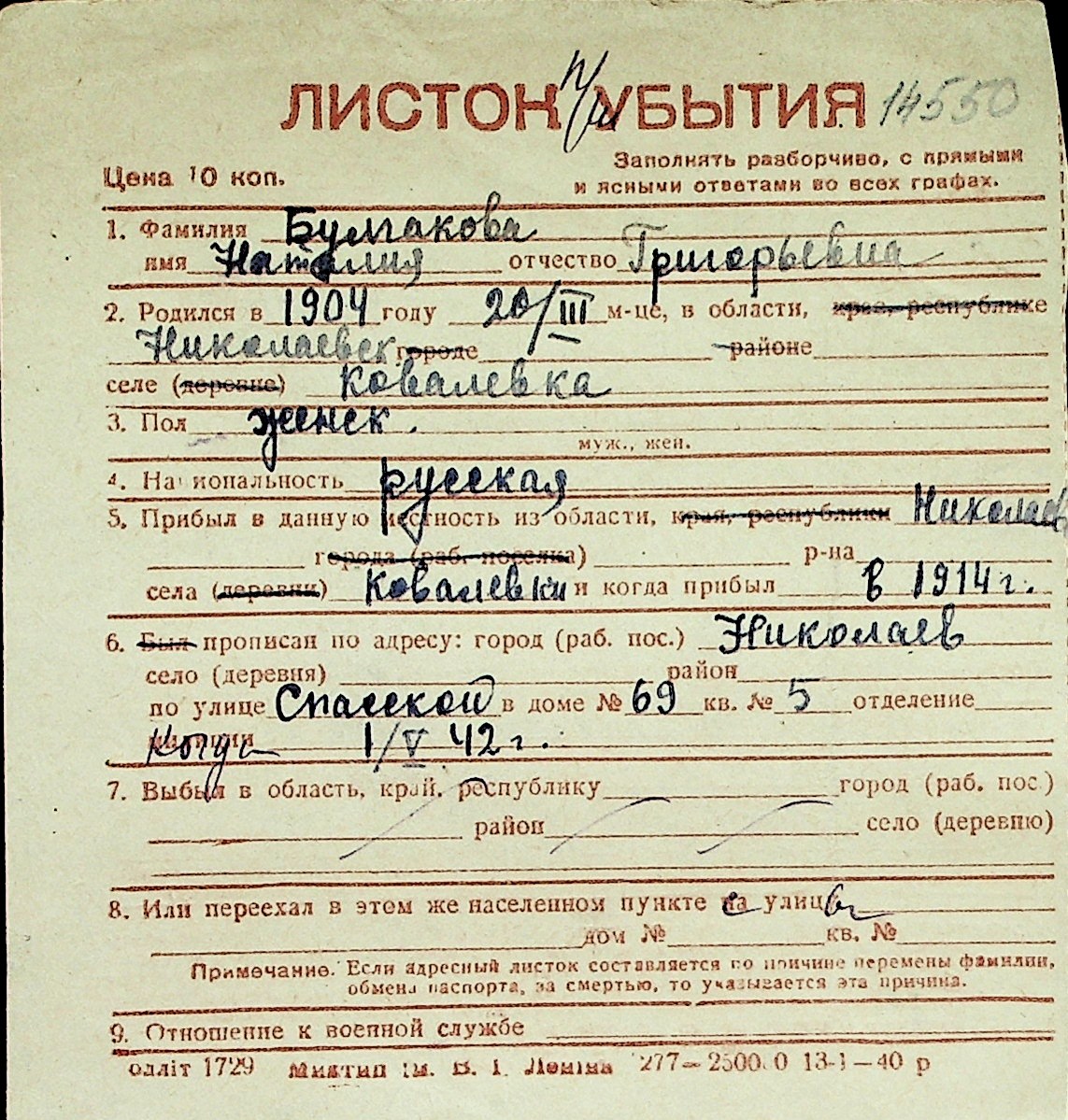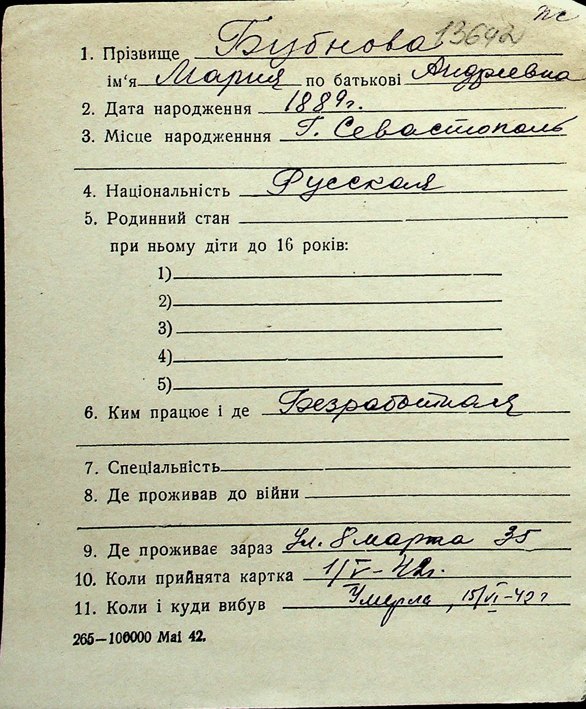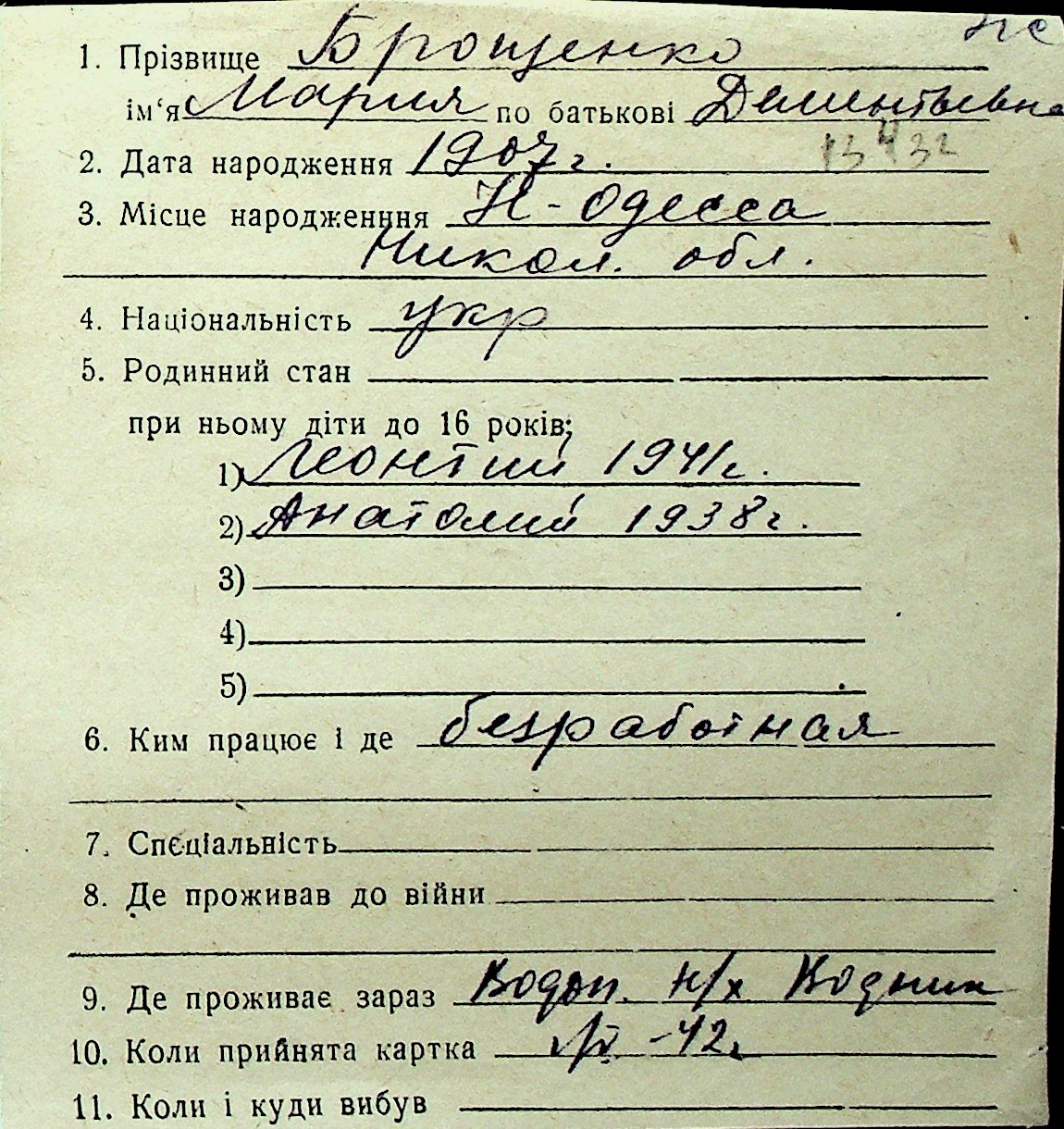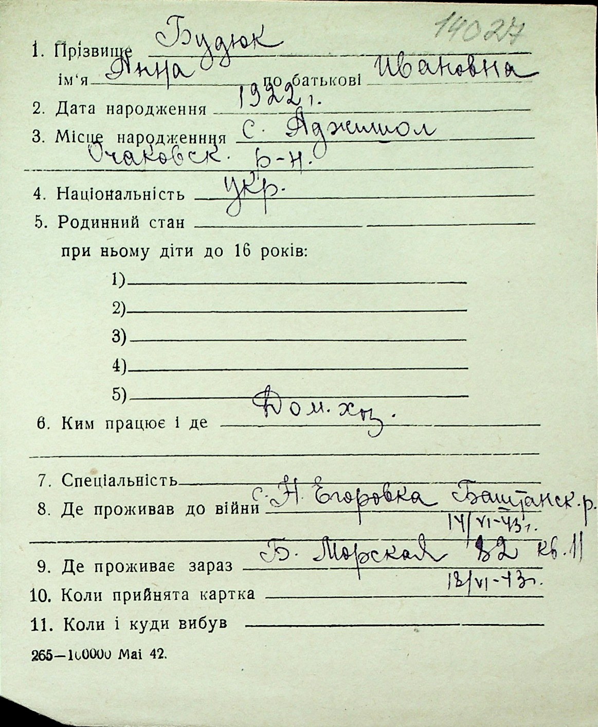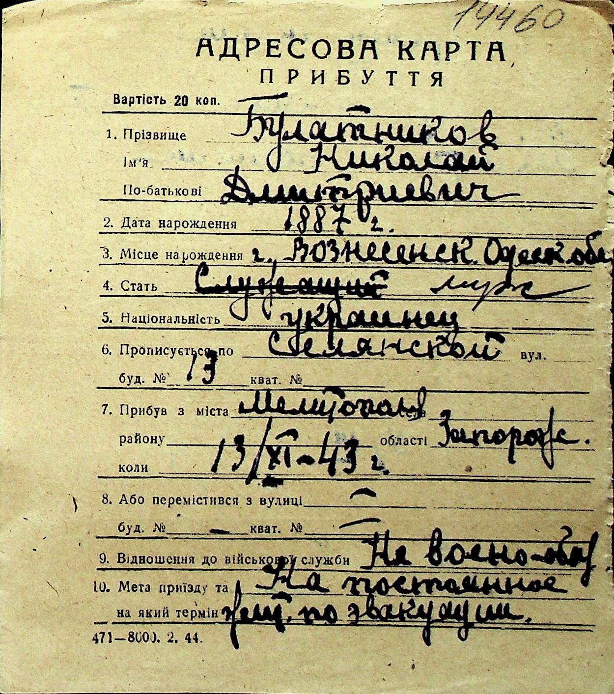 ◦ ◦ Перелік карток на осіб, які мешкали у м. Миколаїв у період окупації 1941–1944 років